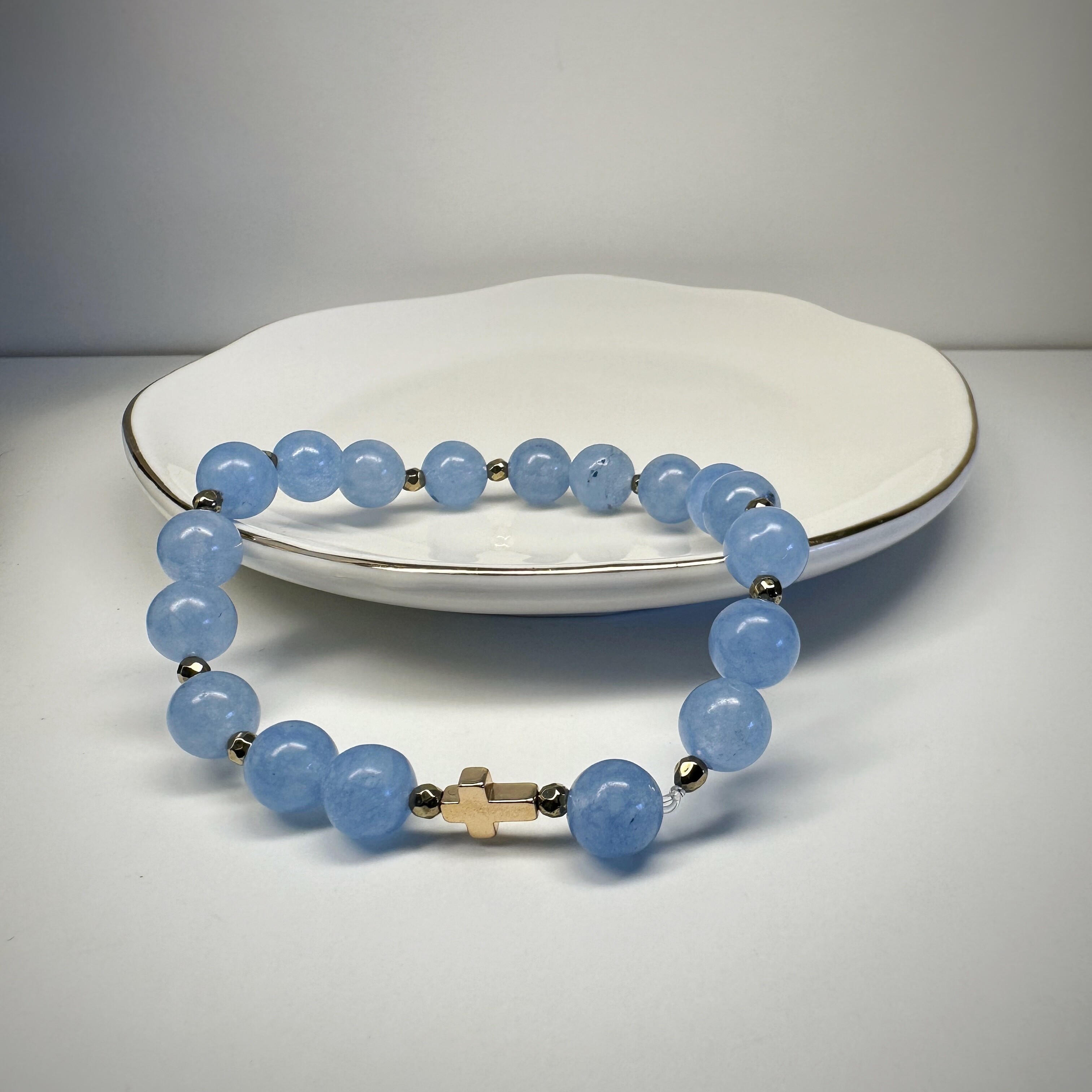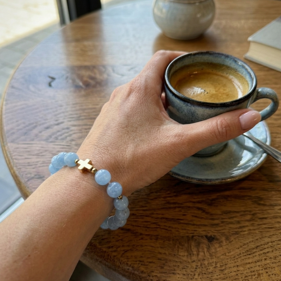"Blue Dream Cross" to bransoletka, która uspokaja delikatnym dotykiem. Błękitny jadeit koi rozbiegane myśli, przywraca balans emocjonalny i pomaga zaufać sobie – i światu. Symboliczny krzyżyk w złotej oprawie dodaje siły duchowej i przypomina o wartościach, które są naszym kompasem. Złoty hematyt wzmacnia poczucie bezpieczeństwa i chroni przed chaosem z zewnątrz.