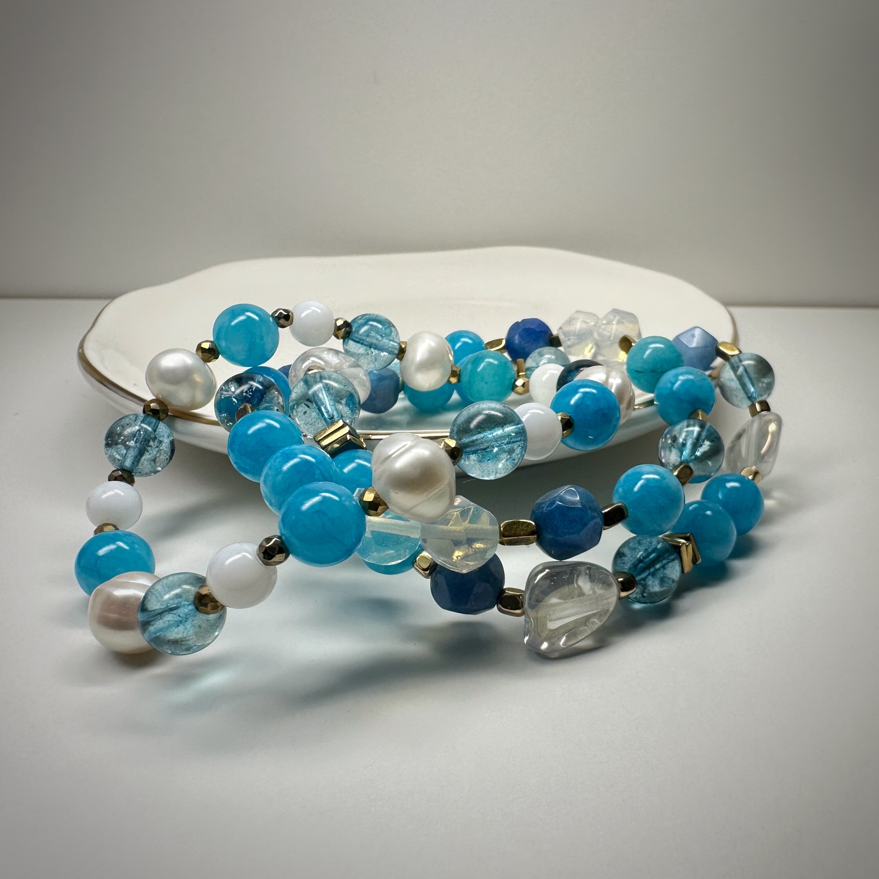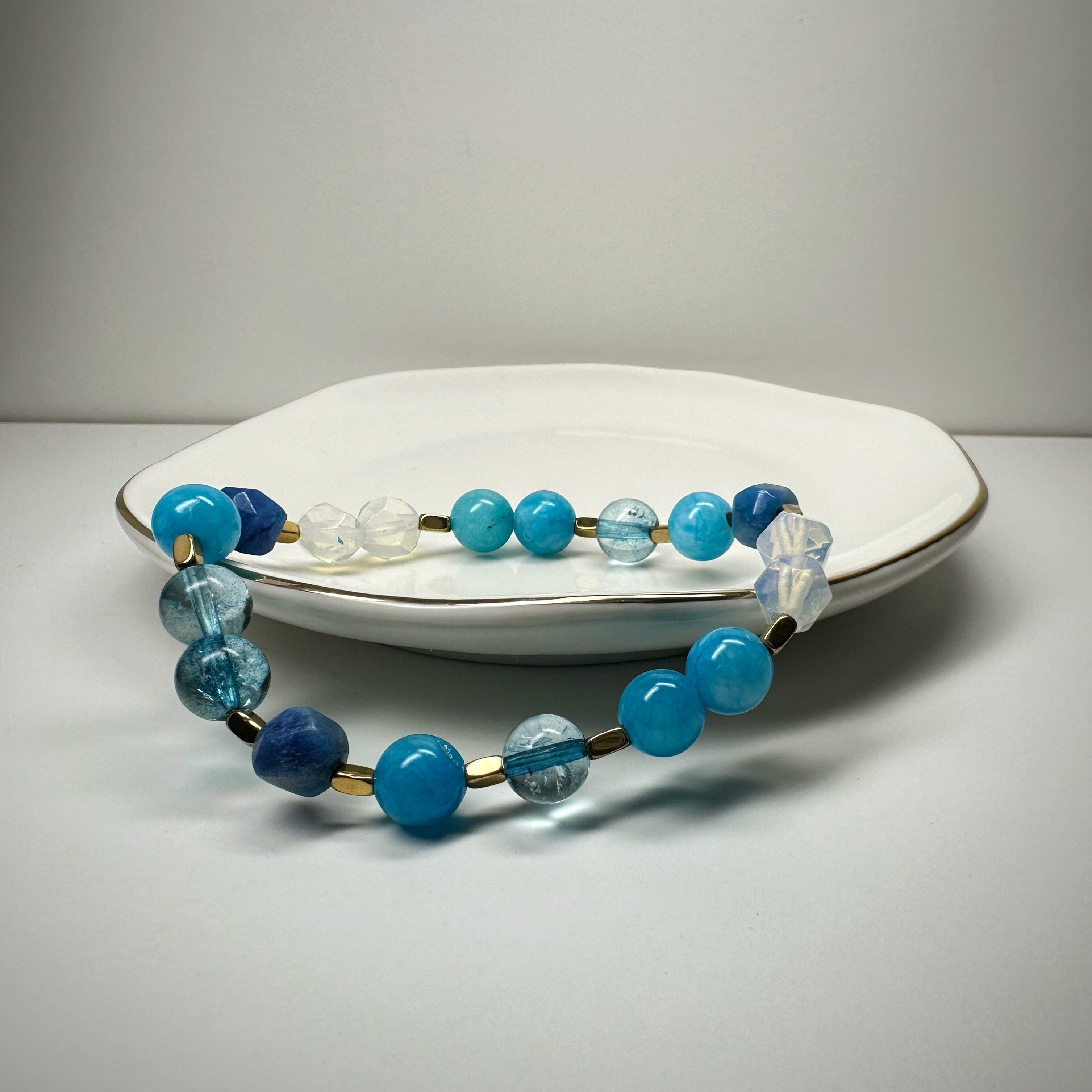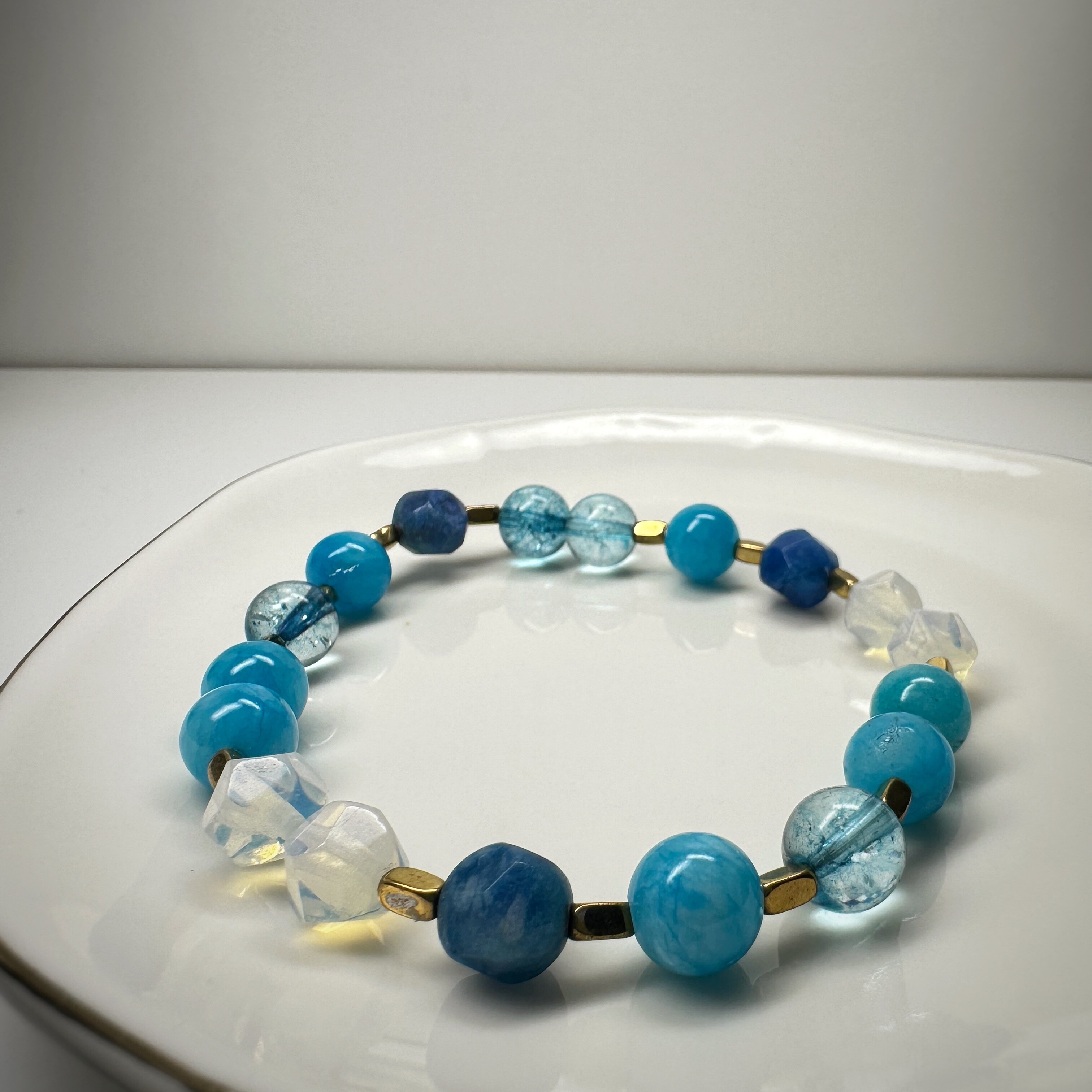 Blueberry Sky to bransoletka jak chłodne niebo nad porannym lasem – świeża, lekka, dająca poczucie spokoju. Błękitny jadeit przynosi harmonię i równowagę emocjonalną, a opalit wspiera intuicję i komunikację. Transparentne elementy dodają lekkości, a złote hematyty równoważą energię.