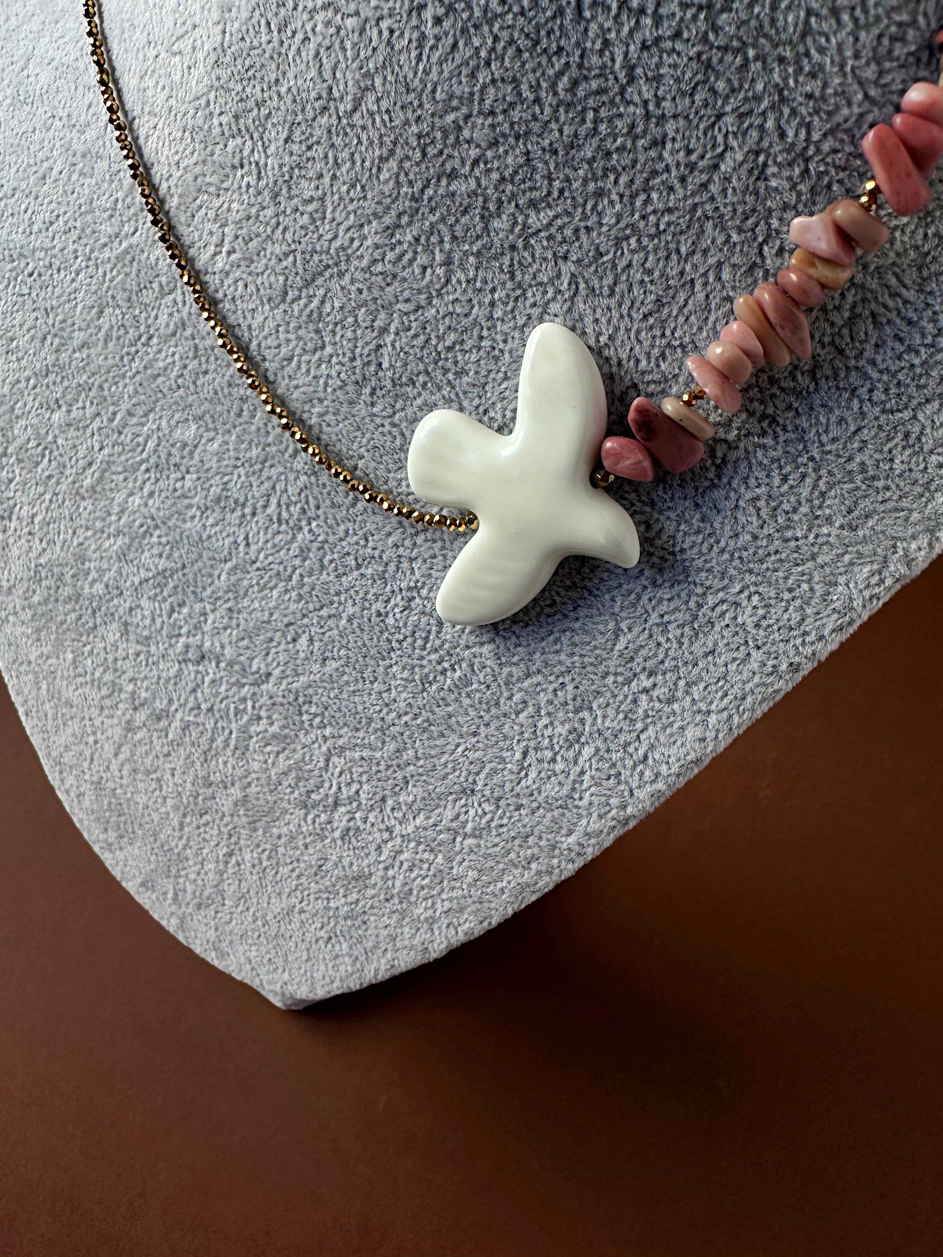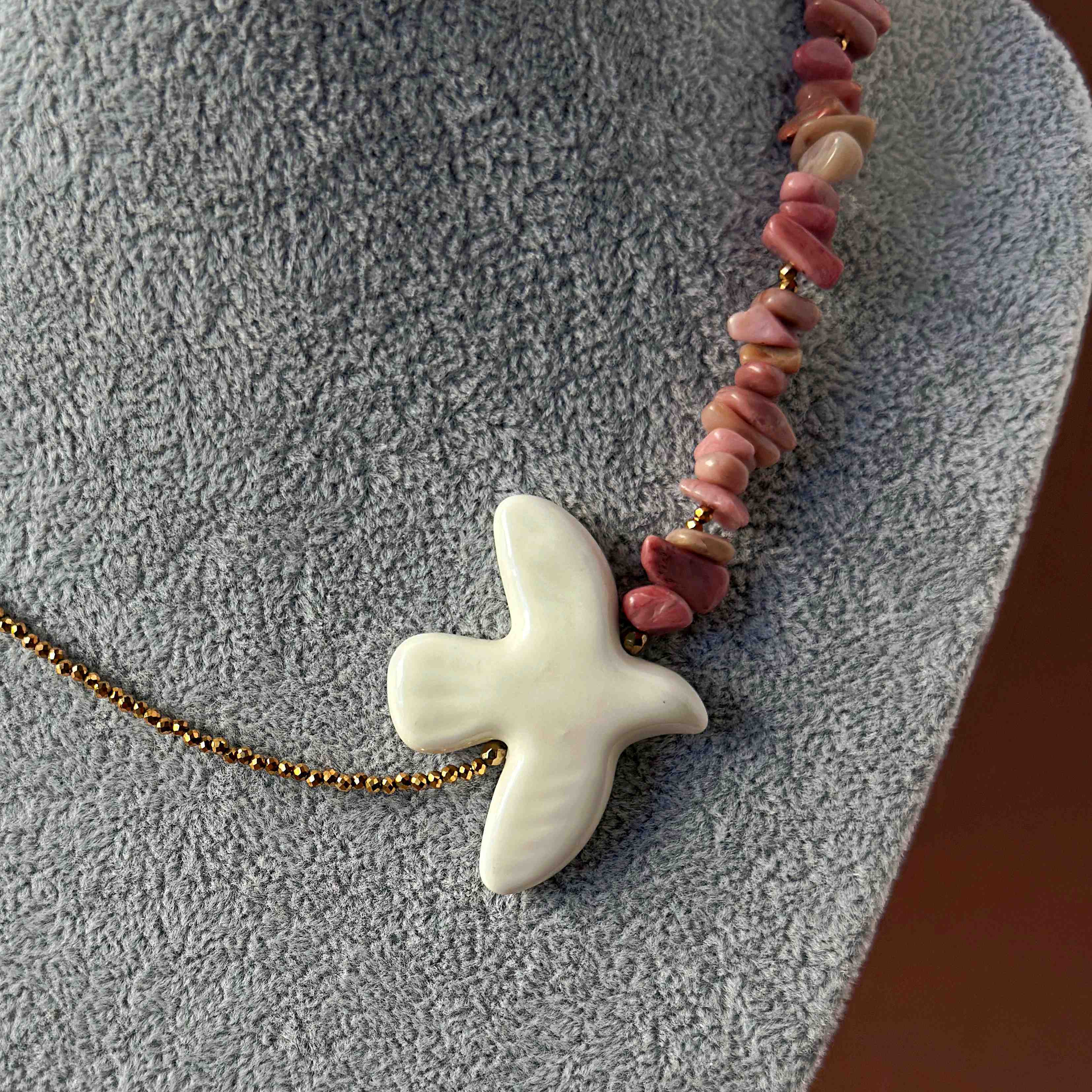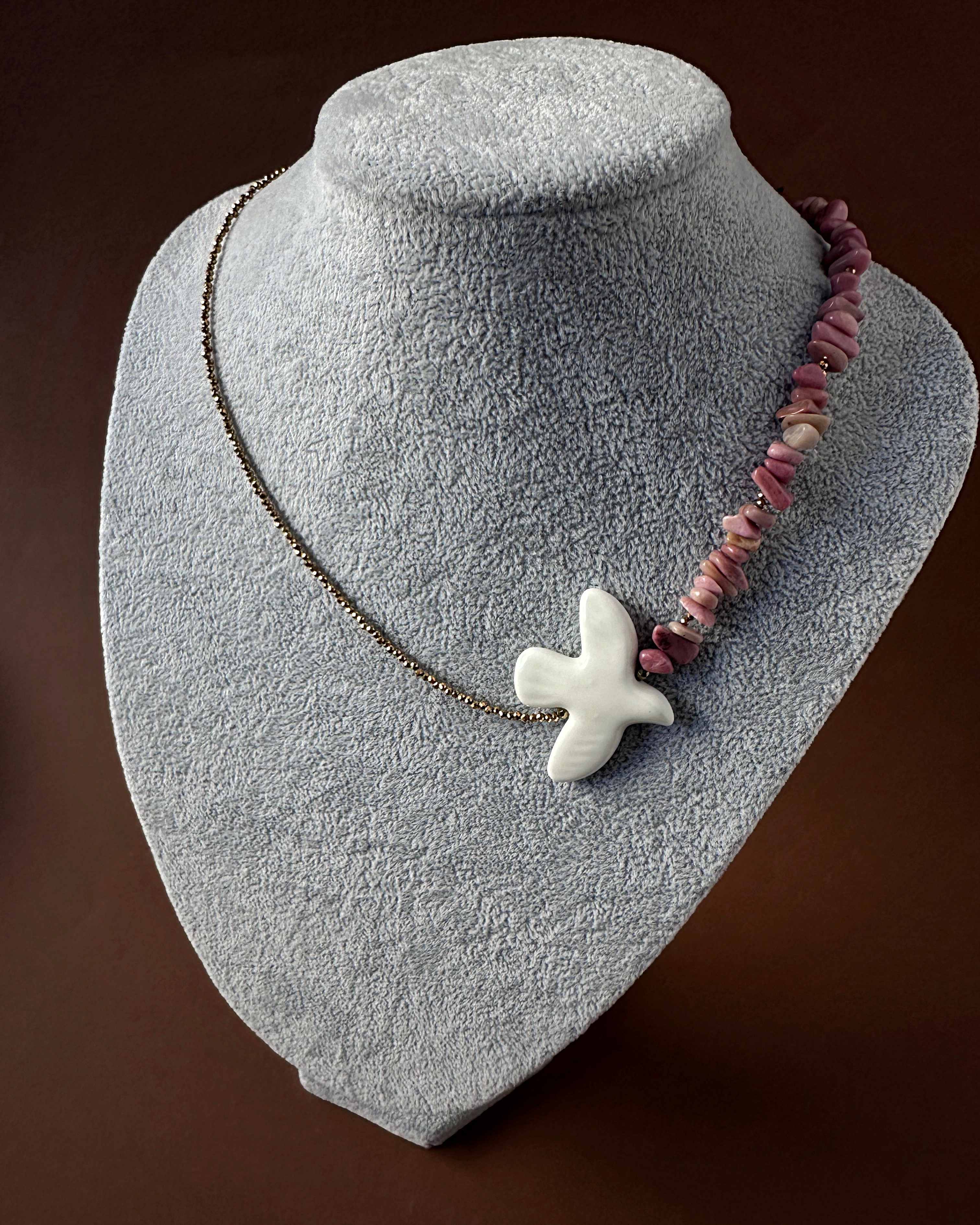 Kompozycja „pół na pół” symbolizuje harmonię pomiędzy emocjami a spokojem wewnętrznym. Ceramiczny biały ptak to detal, który przyciąga wzrok i niesie znaczenie wolności, lekkości i zaufania do własnej drogi. Dzięki przedłużce naszyjnik możesz dopasować do dekoltu i stylizacji, nosząc go blisko szyi lub niżej, w bardziej swobodnej formie.