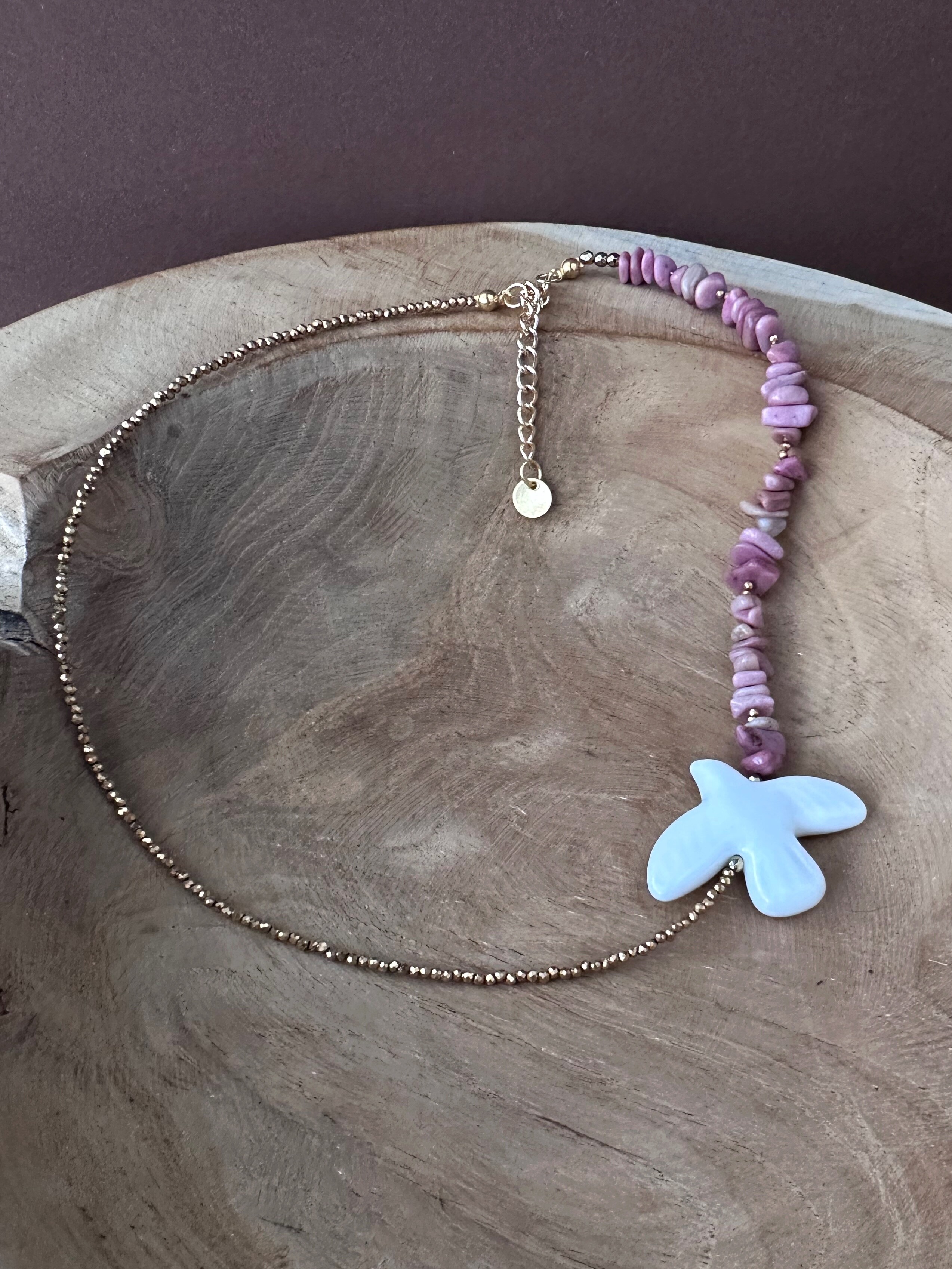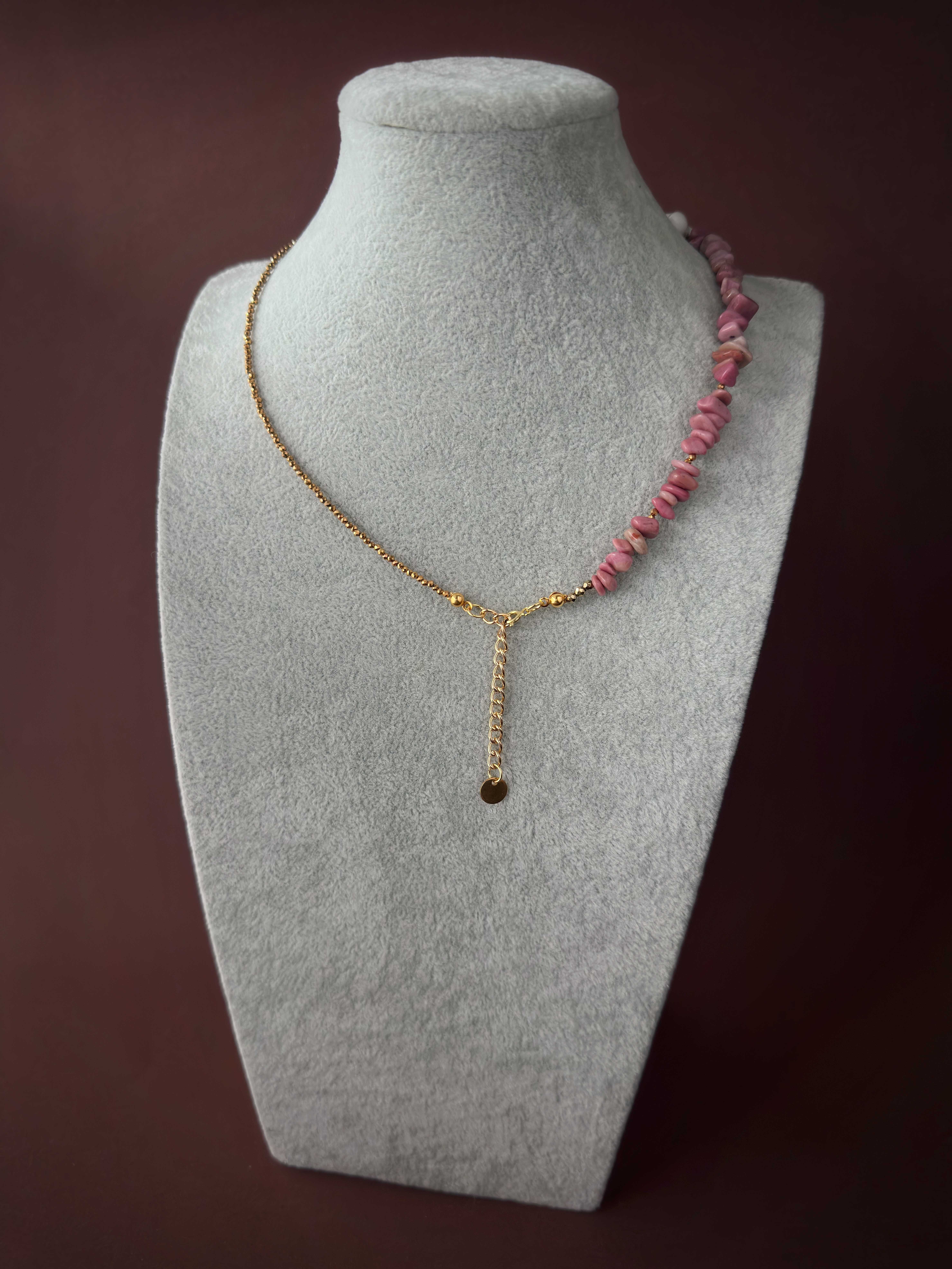 Ten naszyjnik powstał z myślą o chwilach, w których potrzebujesz więcej łagodności wobec siebie i świata. Po jednej stronie znajdują się nieregularne kamienie rodonitu w odcieniach pudrowego różu, po drugiej drobne, złote bryłki hematytu, które stabilizują i równoważą całość.