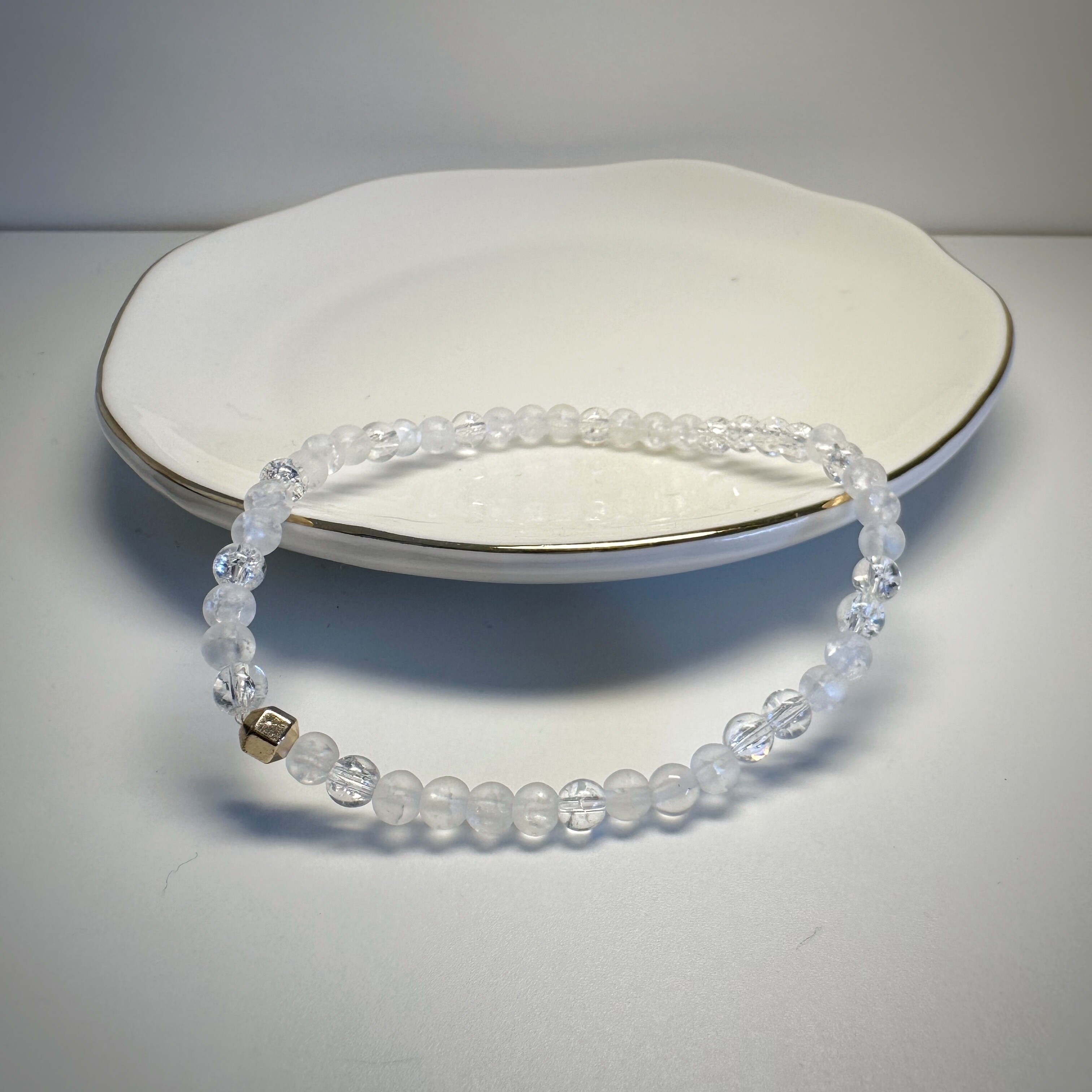 Zamknij oczy i wyobraź sobie spacer wśród mlecznej mgły, gdzie wszystko staje się szeptem. Biała Mgła II to kompozycja kamienia księżycowego, który koi emocje i otula intuicją, kwarcu górskiego, wzmacniającego energię i klarowność myśli, oraz hematytu w srebrzystym wykończeniu, który przywraca równowagę i dodaje siły.Dominująca kolorystyka – biel, przejrzystość i połysk księżyca – czyni tę bransoletkę idealną do noszenia zarówno na co dzień, jak i w wyjątkowe chwile pełne refleksji.