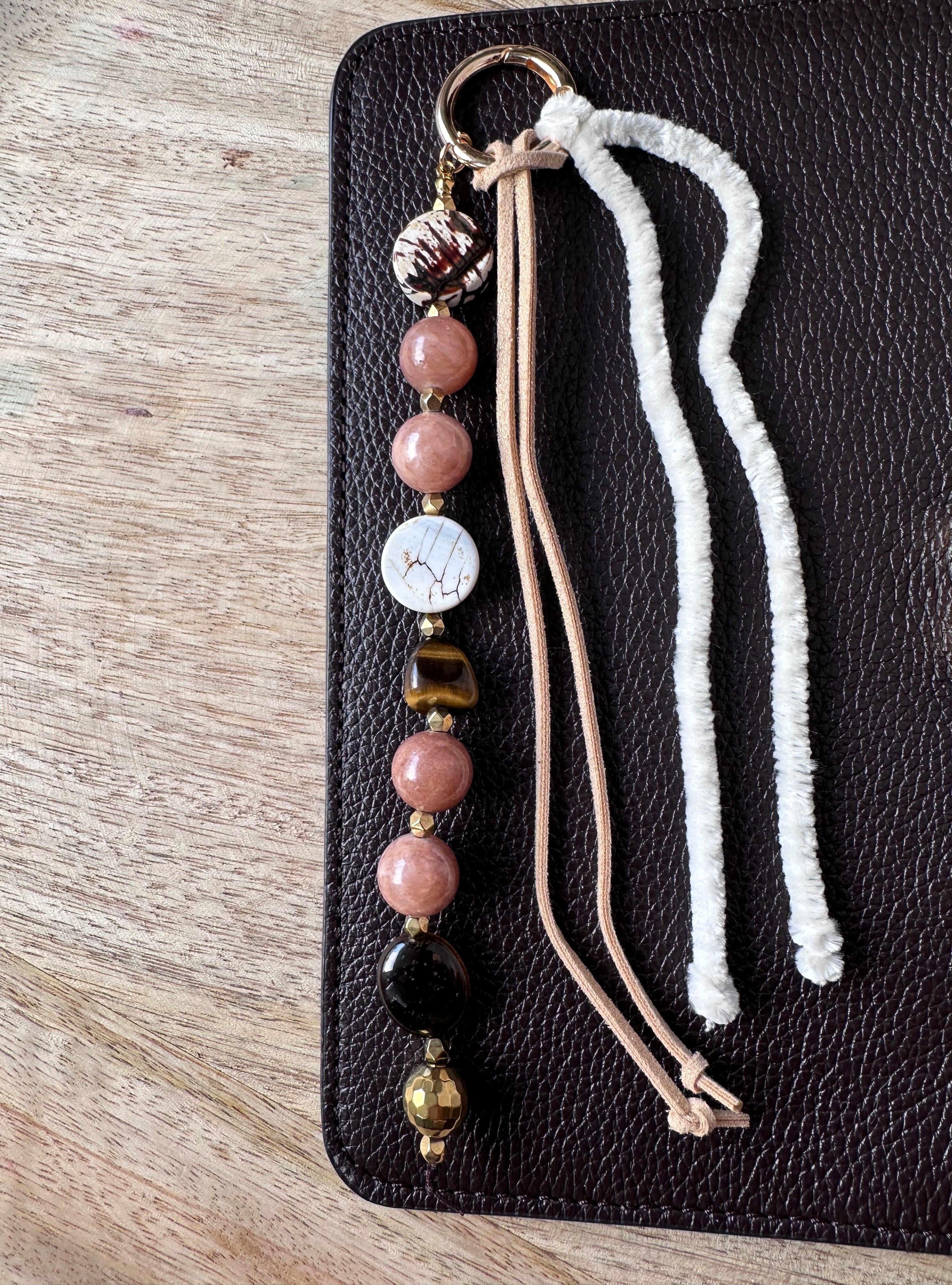 Rzemień oraz miękki beżowy sznurek nadają mu lekkości i naturalnego charakteru, a zapięcie w odcieniach złota i miedzi podkreśla elegancki detal.