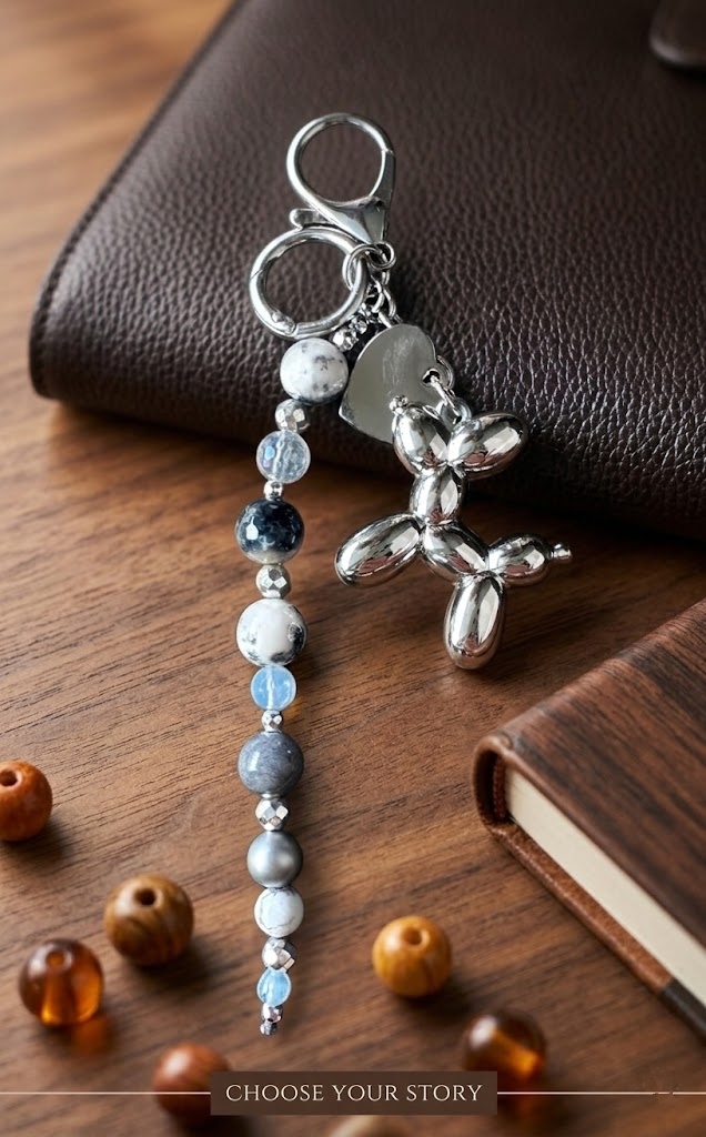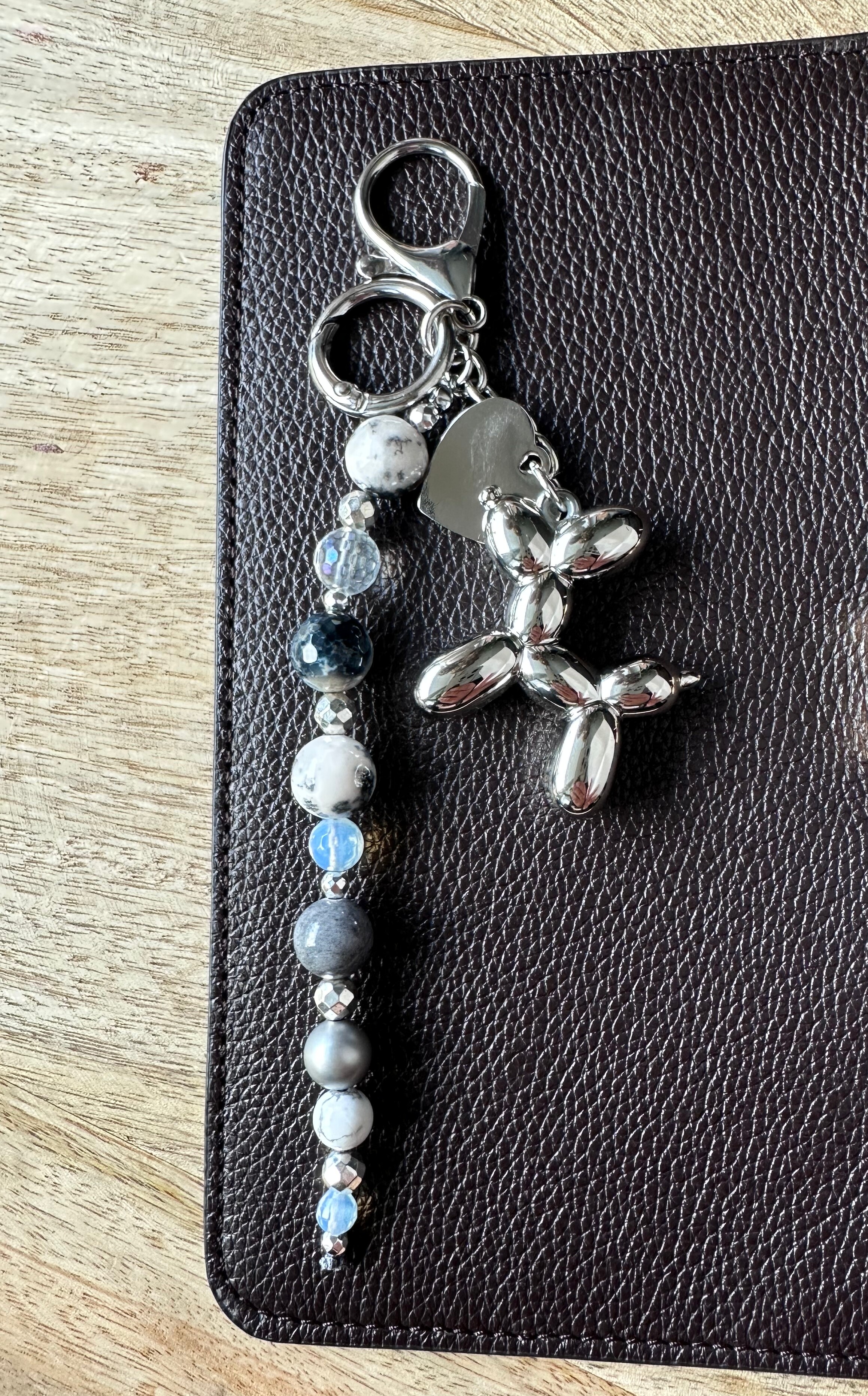 Ten charms łączy kamienie jadeitu, agatu i hematytu z wyjątkowym detalem: srebrnym pieskiem w formie balonika oraz metalowym sercem. To drobny element, który nadaje charakteru kluczom lub torbie i przyciąga spojrzenia.
