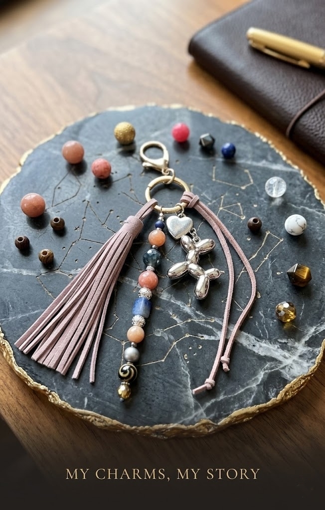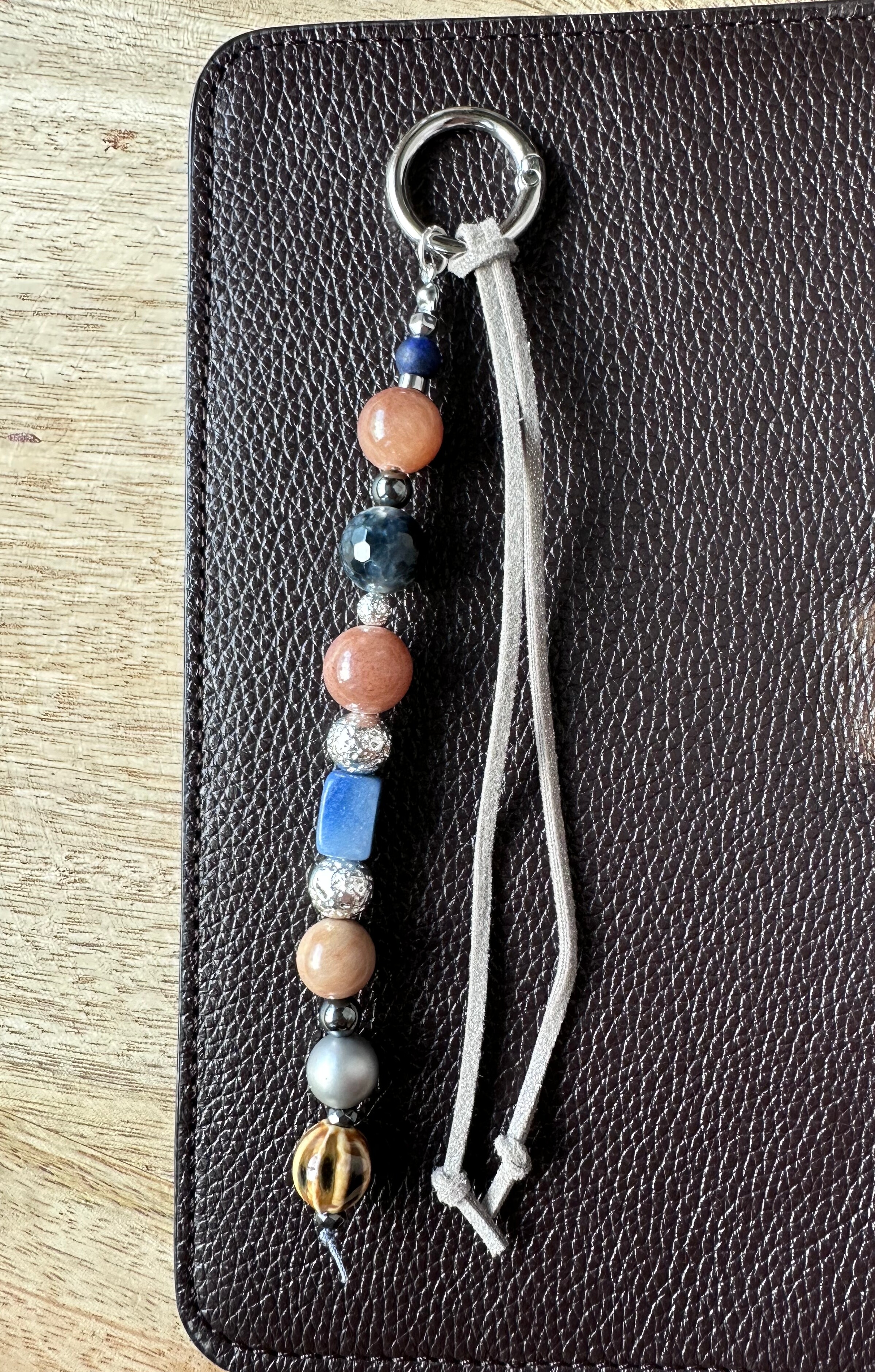 Ten charms powstał z jadeitu i agatu w granatowych oraz srebrnych tonach. Centralnym elementem jest prostokątny turkus – mocny kolorystyczny akcent, który ożywia całą kompozycję.