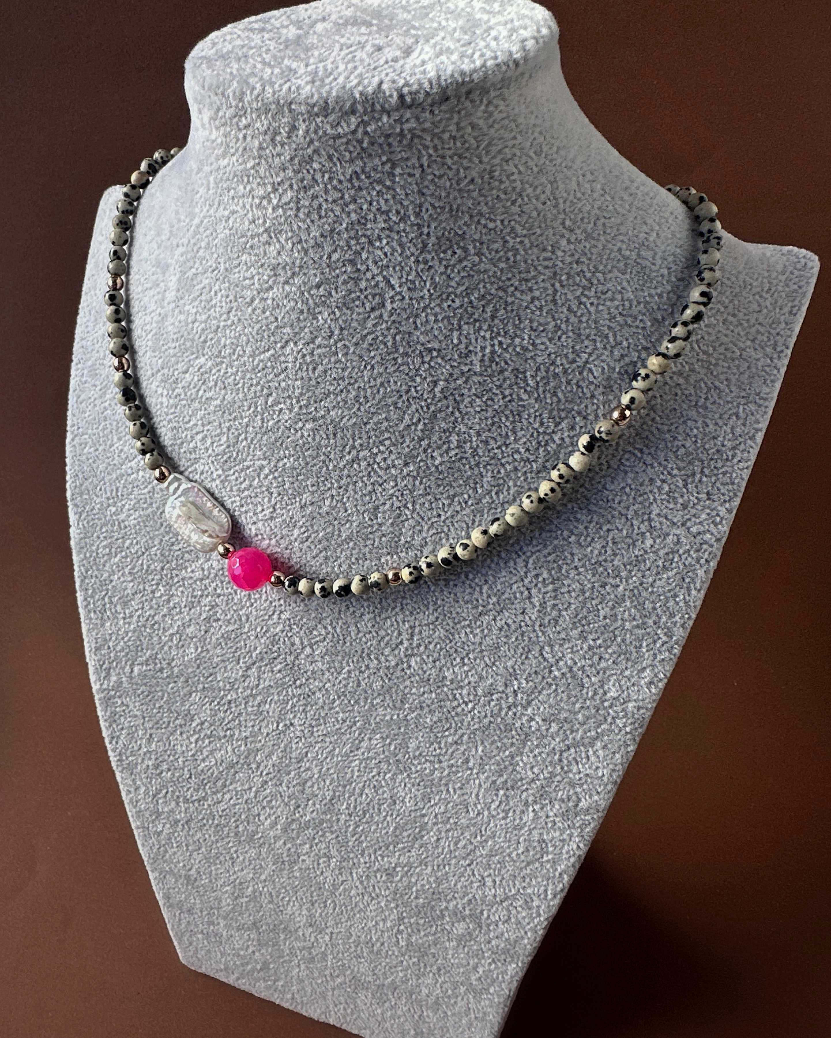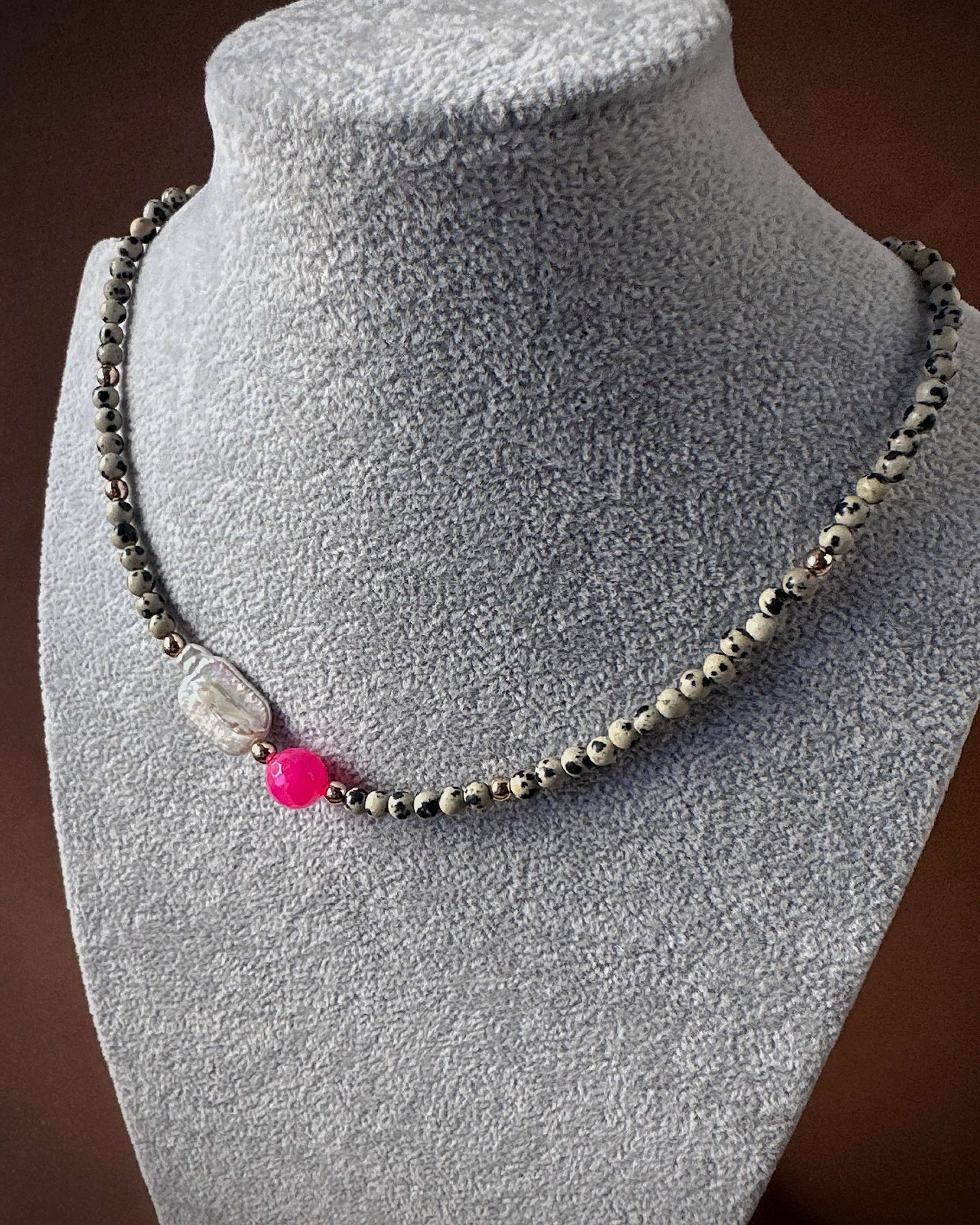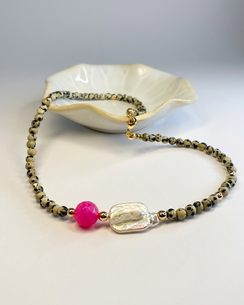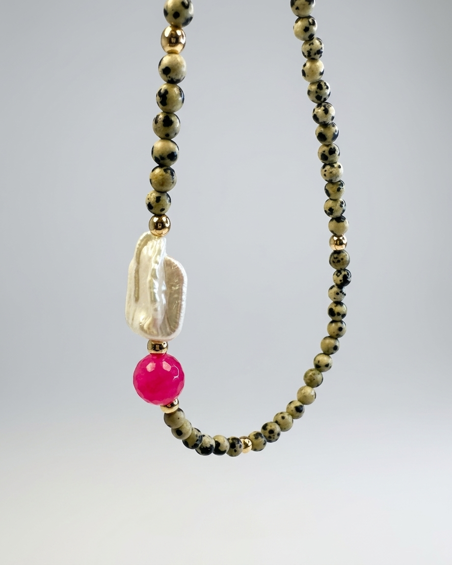 Bazę naszyjnika tworzy jaspis dalmatyński o średnicy 6 mm. Jasny kamień z nieregularnymi, czarnymi plamkami przyciąga uwagę i nadaje całości wyrazistości. W centralnym punkcie znajduje się fasetowana kula różowego agatu (10 mm), która odbija światło i dodaje kompozycji energii oraz koloru. Całości dodaje blasku szeroki detal z masy perłowej.