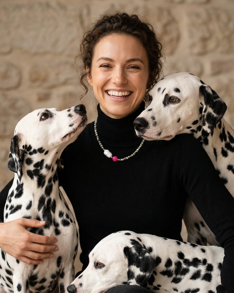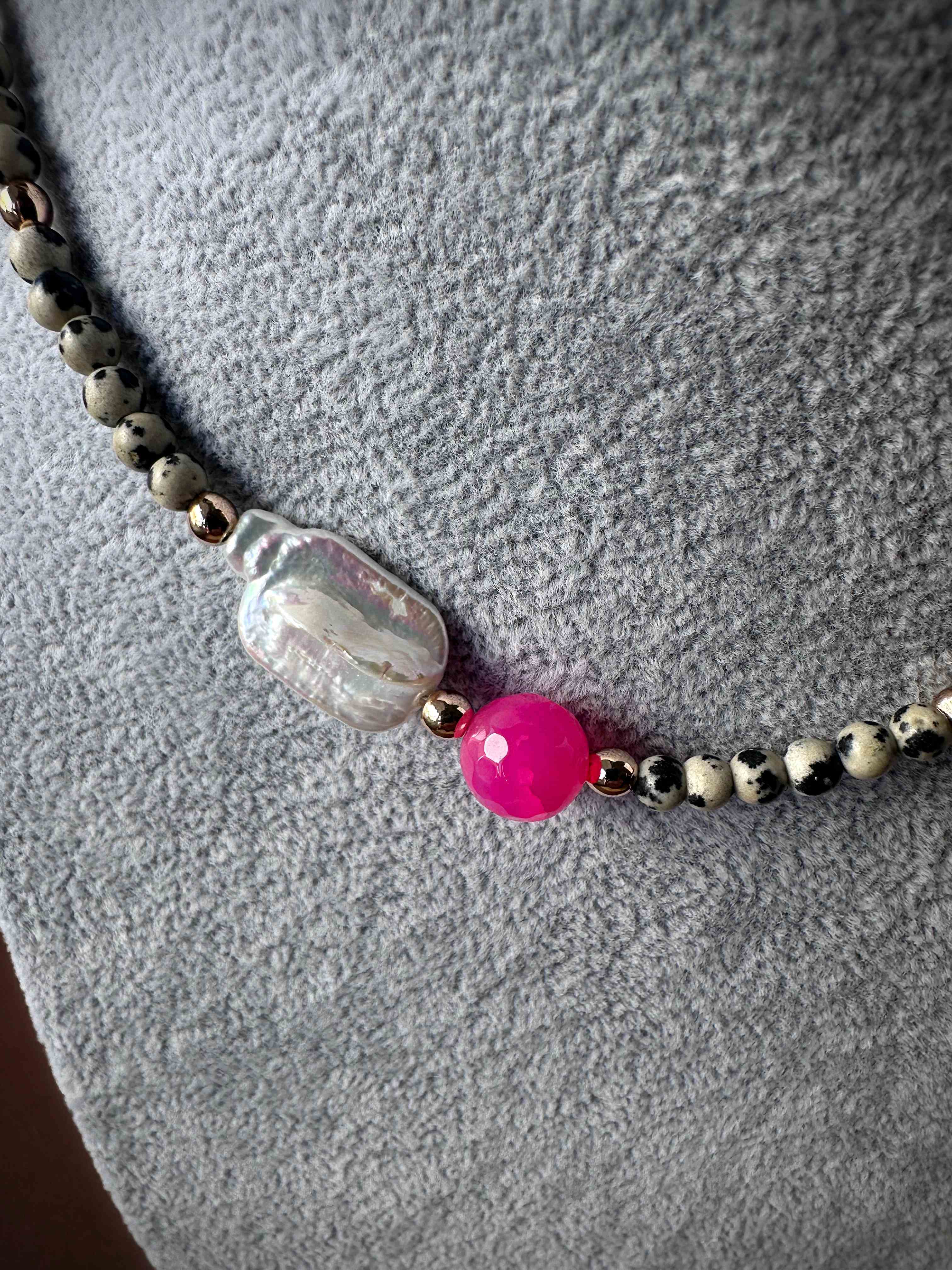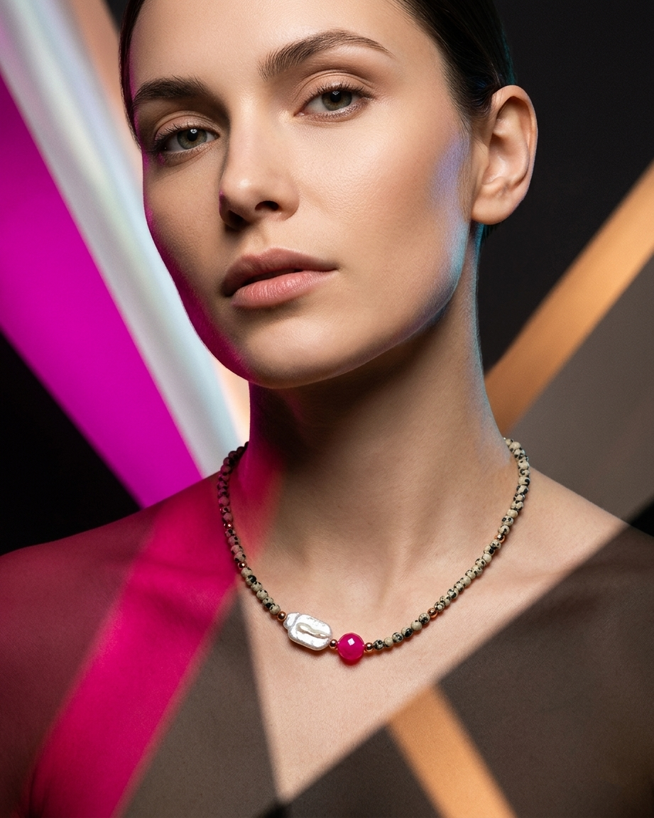 Bazę naszyjnika tworzy jaspis dalmatyński o średnicy 6 mm. Jasny kamień z nieregularnymi, czarnymi plamkami przyciąga uwagę i nadaje całości wyrazistości. W centralnym punkcie znajduje się fasetowana kula różowego agatu (10 mm), która odbija światło i dodaje kompozycji energii oraz koloru. Całości dodaje blasku szeroki detal z masy perłowej.