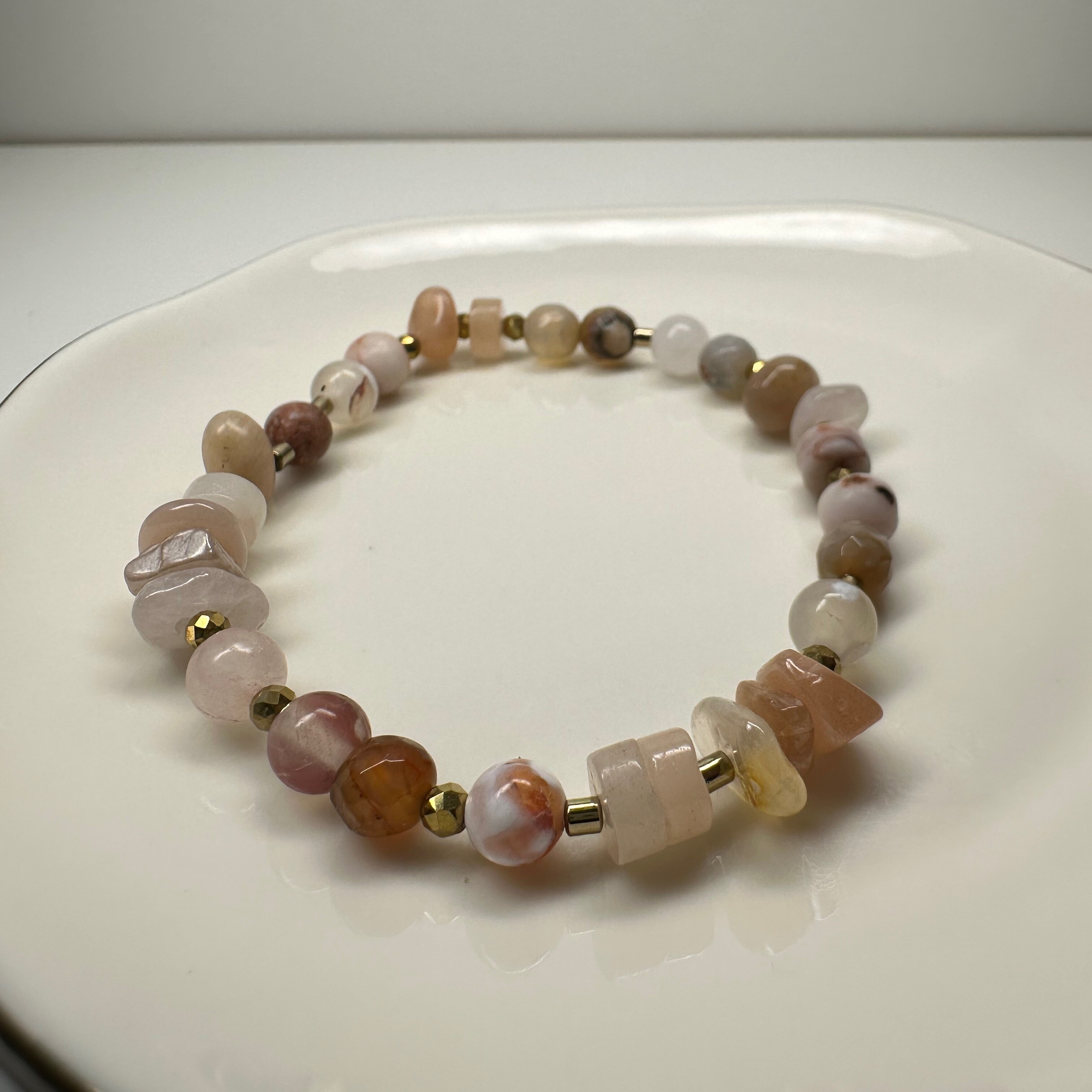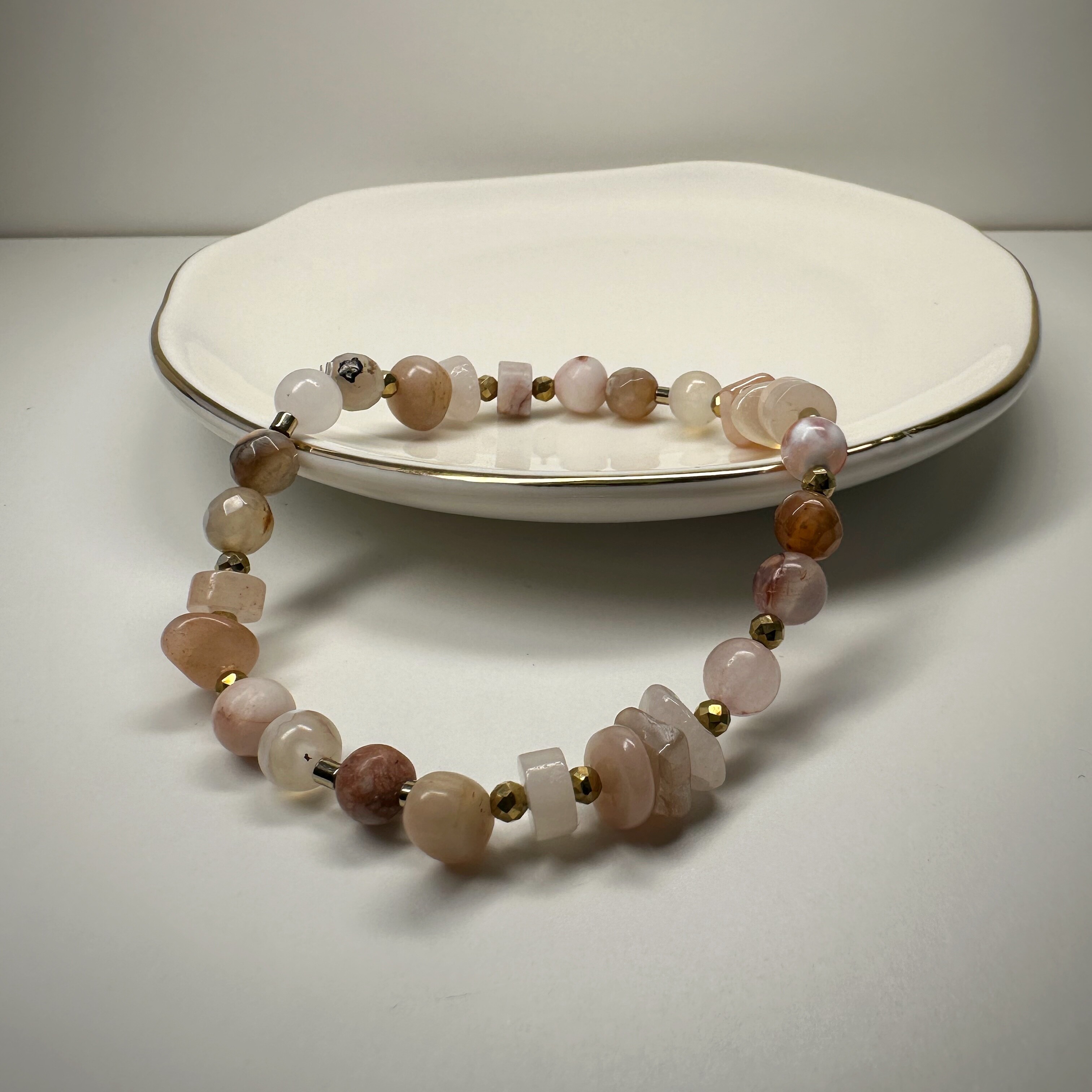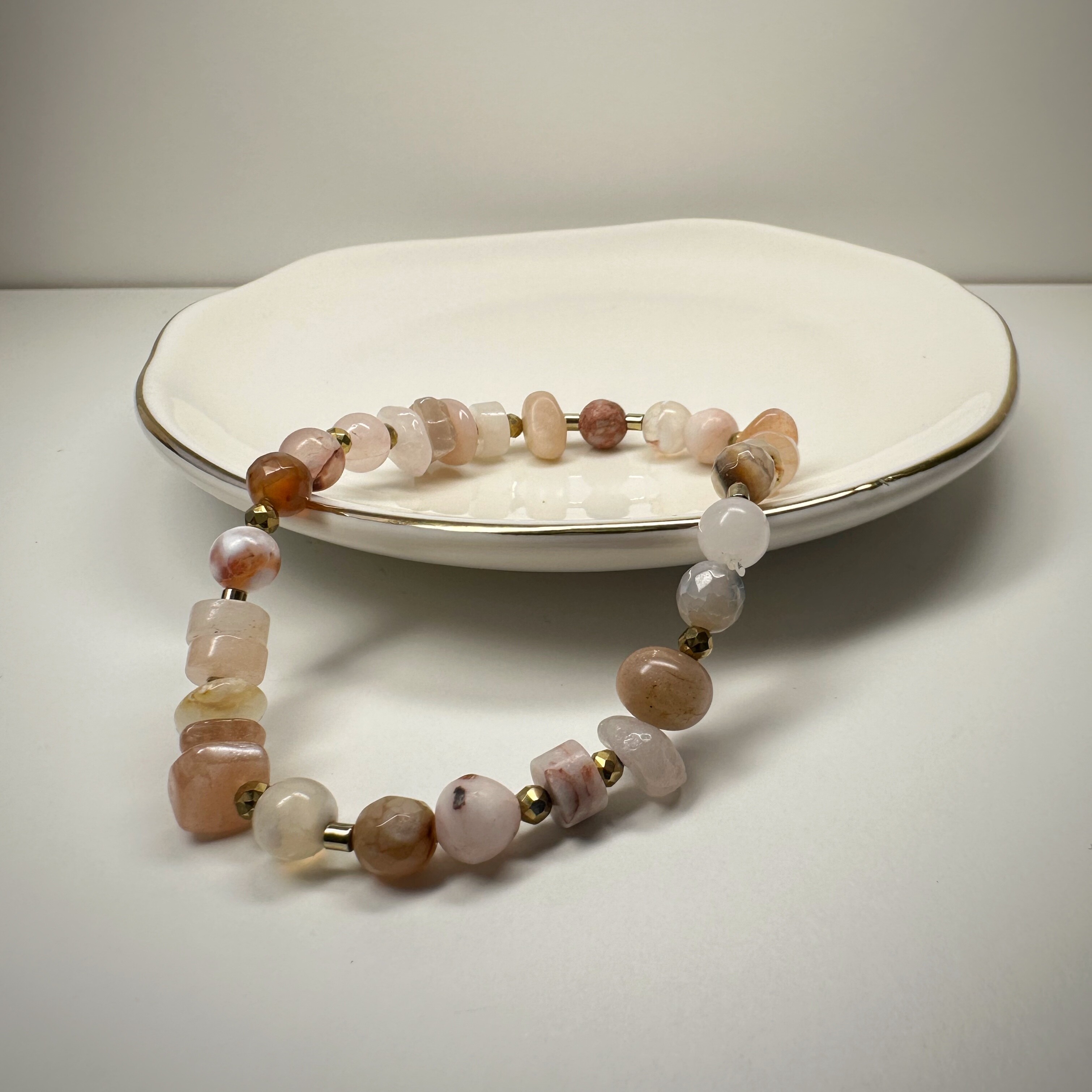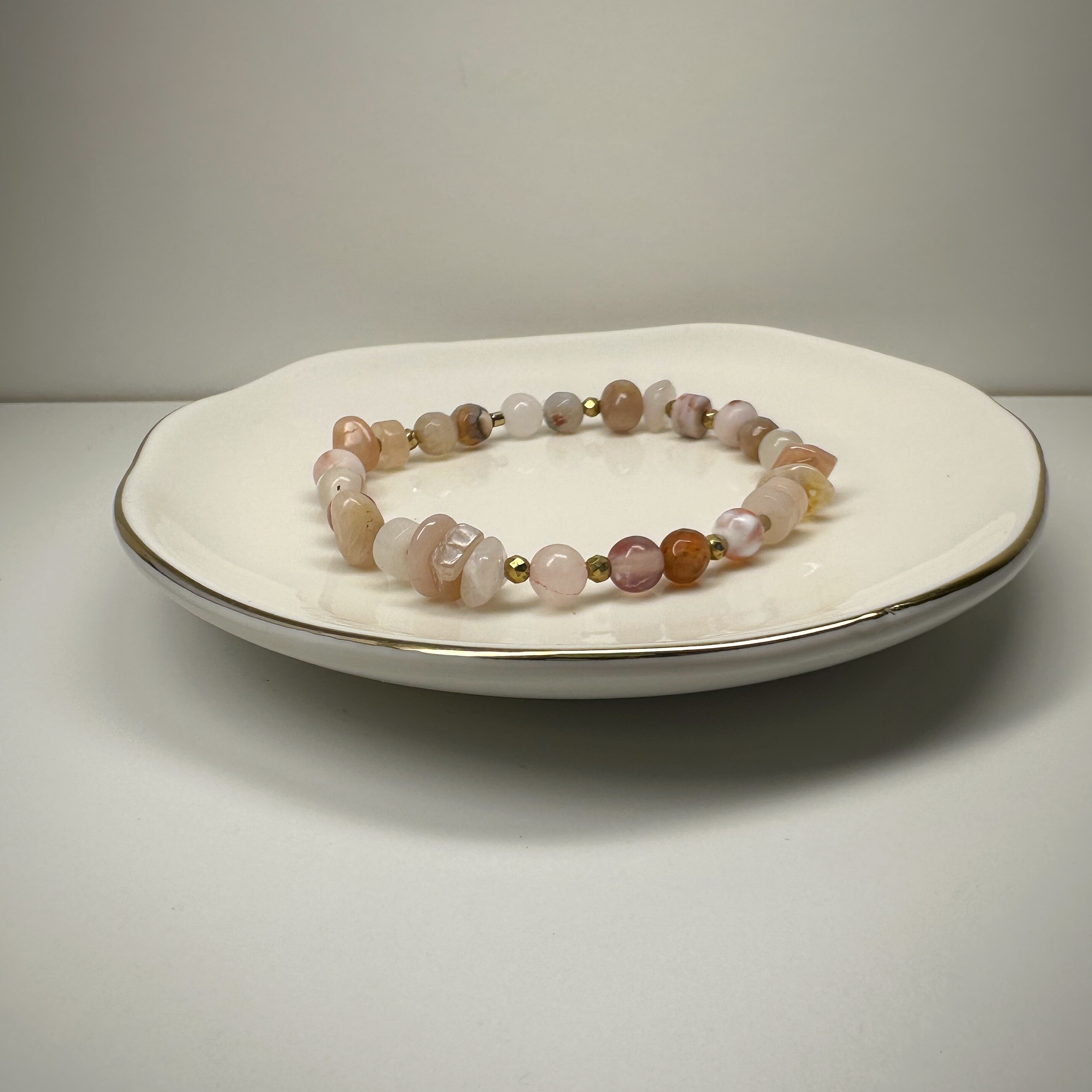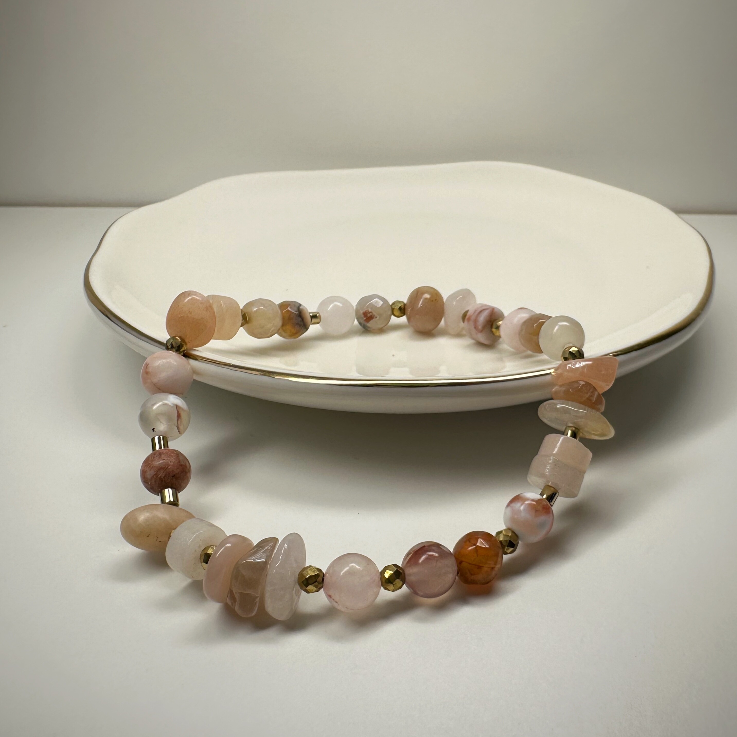 To jak spacer po ziemi o zachodzie słońca – ciepłe światło, nagrzane kamienie, miękki powiew powietrza. Bransoletka z nieregularnych agatów w odcieniach brzoskwini działa uziemiająco, ale też otula ciepłem. Drobne złote detale wprowadzają elegancki balans. Świetna na prezent – albo jako symbol kontaktu z własną naturą.
