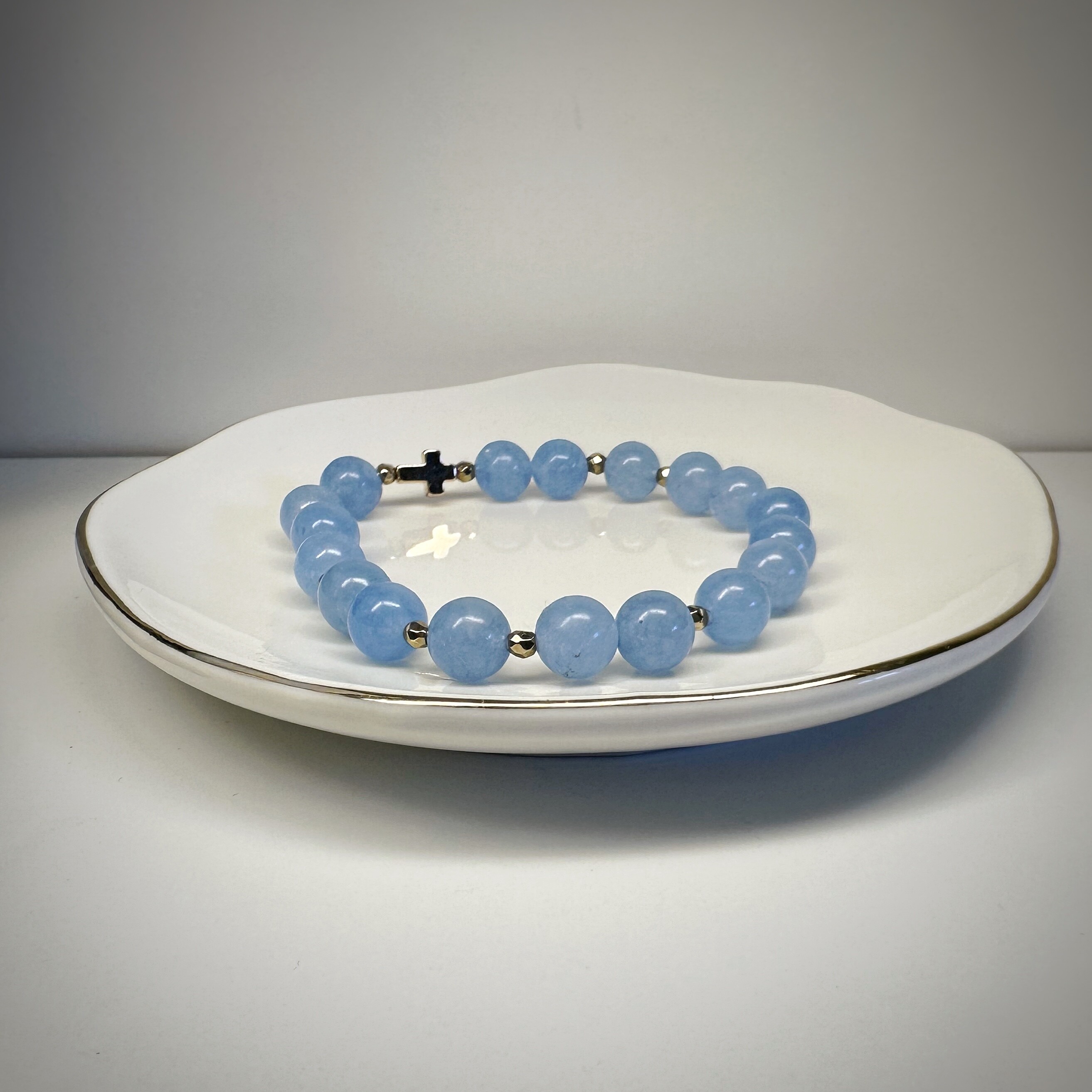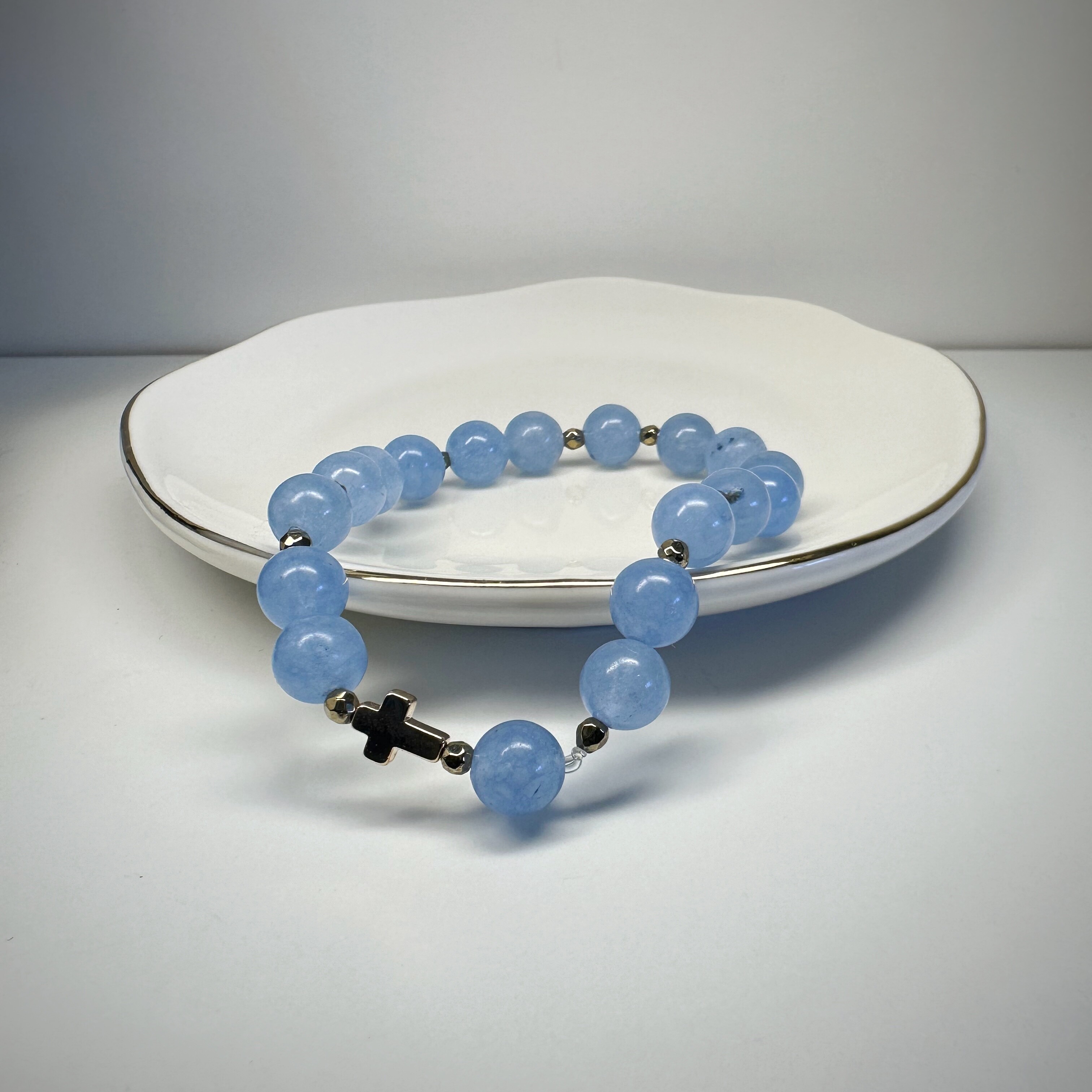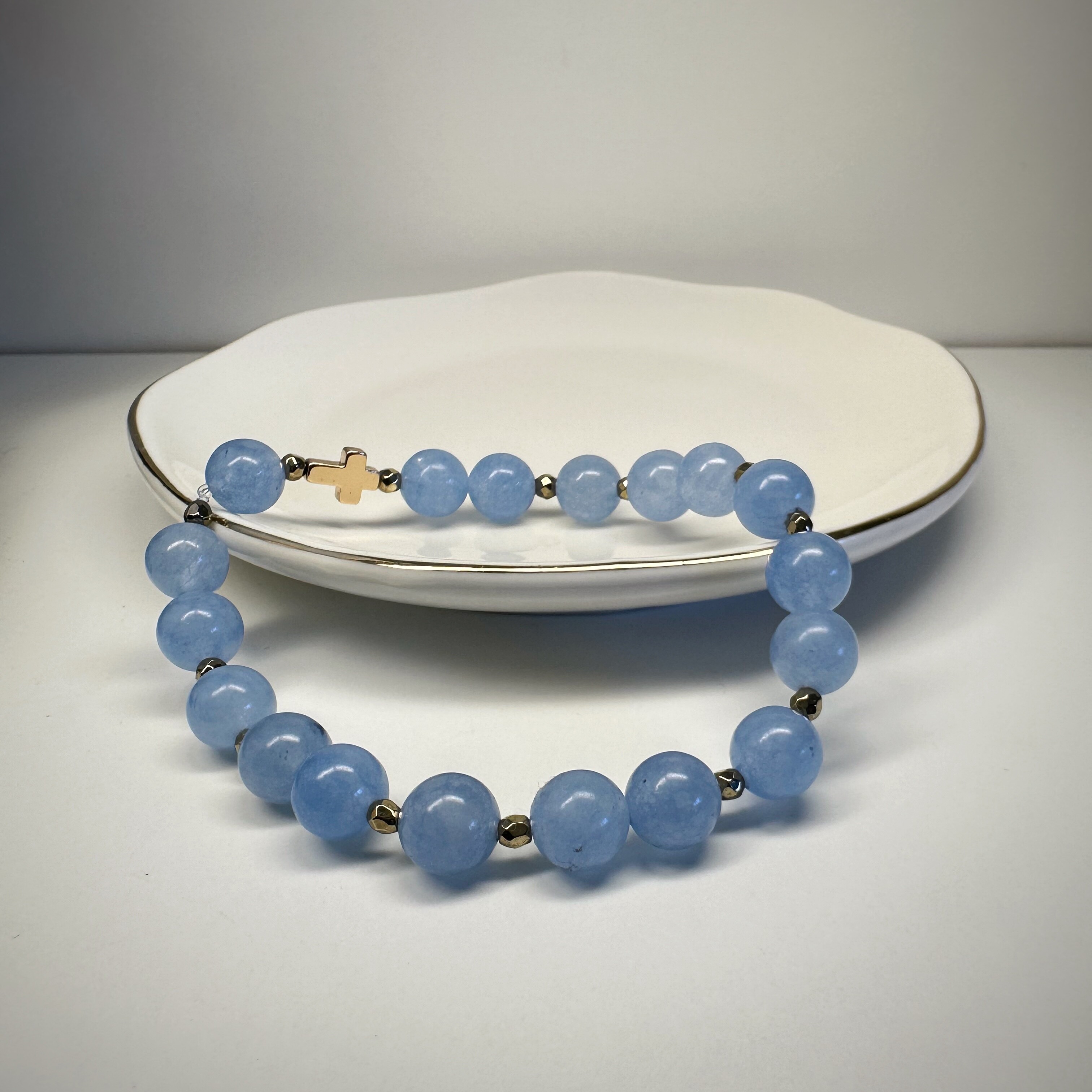 „Dotyk Nieba” to bransoletka, która uspokaja delikatnym dotykiem. Błękitny jadeit koi rozbiegane myśli, przywraca balans emocjonalny i pomaga zaufać sobie – i światu. Symboliczny krzyżyk w złotej oprawie dodaje siły duchowej i przypomina o wartościach, które są naszym kompasem. Złoty hematyt wzmacnia poczucie bezpieczeństwa i chroni przed chaosem z zewnątrz.