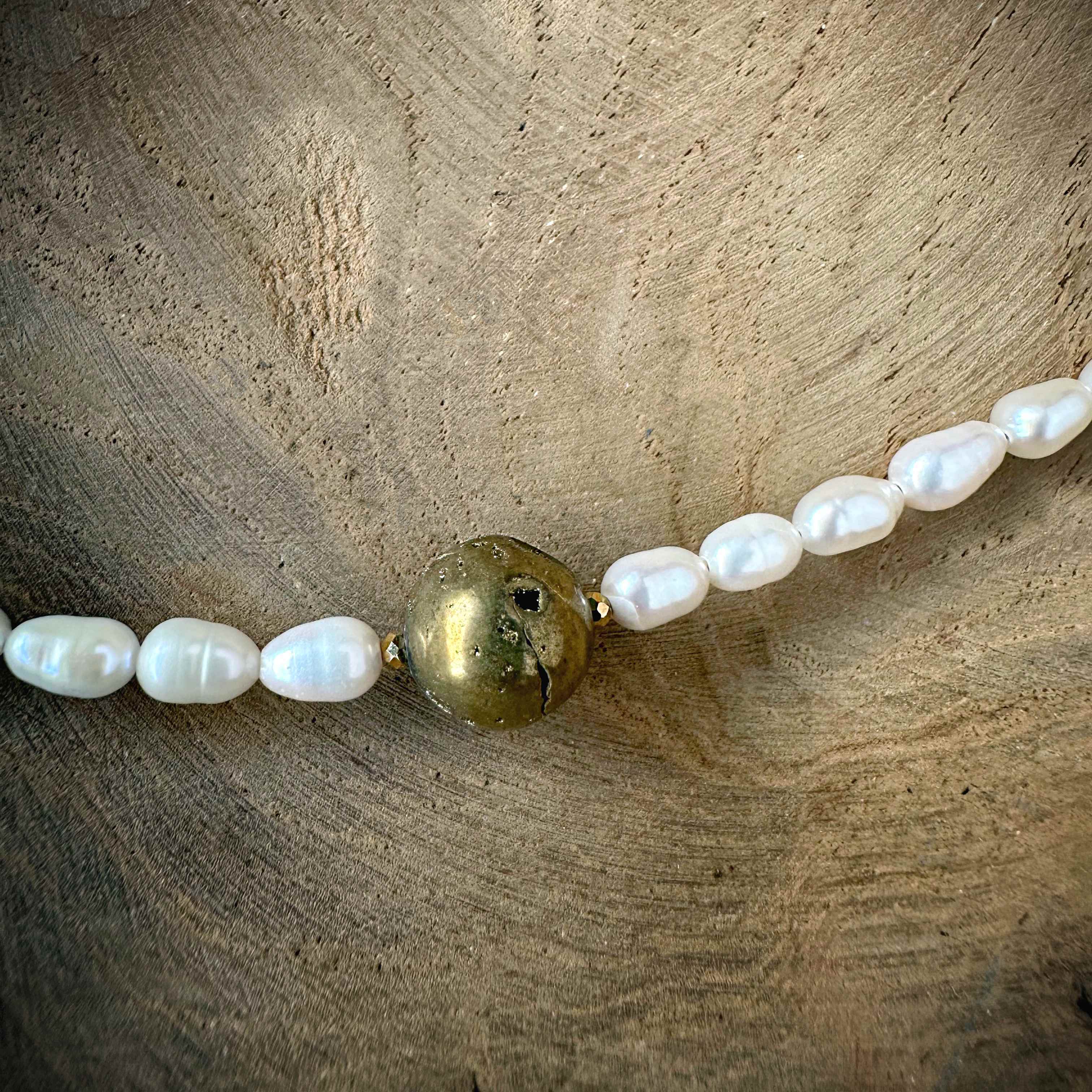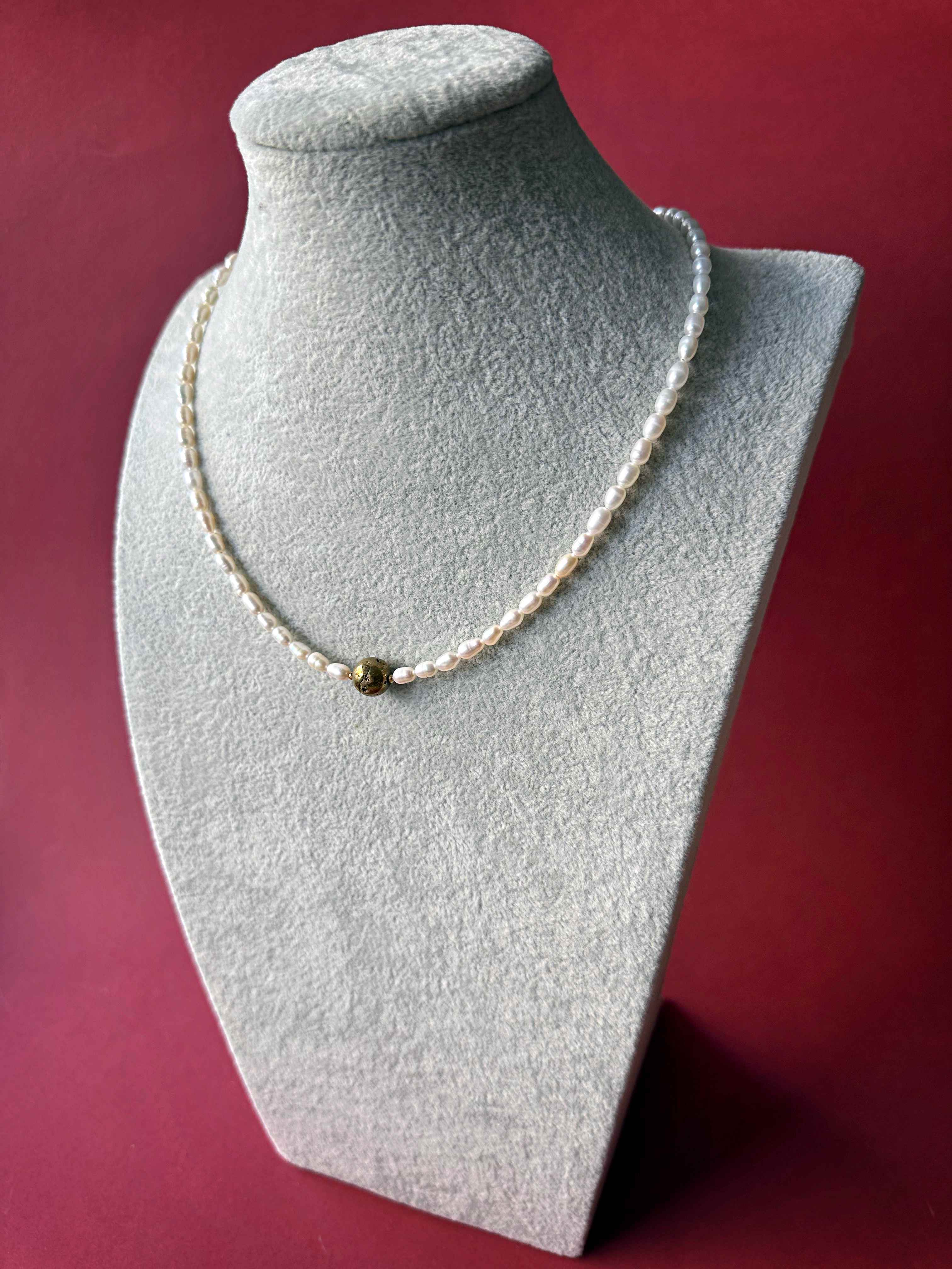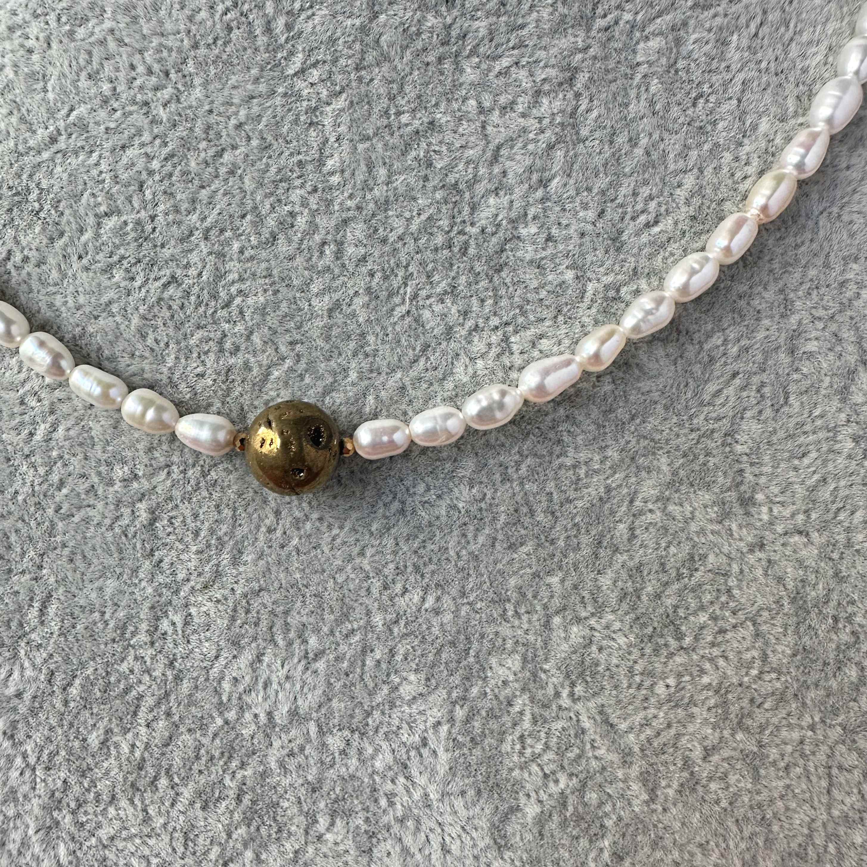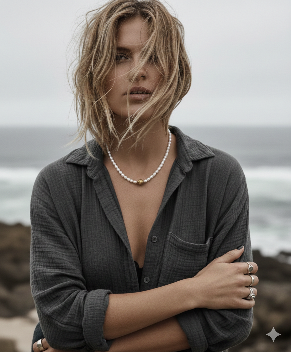 Ten model opiera się na harmonii kontrastów. Subtelne perły tworzą spokojne tło dla złotej kuli agatu o wyraźnej, naturalnej strukturze. To detal, który przyciąga spojrzenia - elegancki, ale z charakterem.