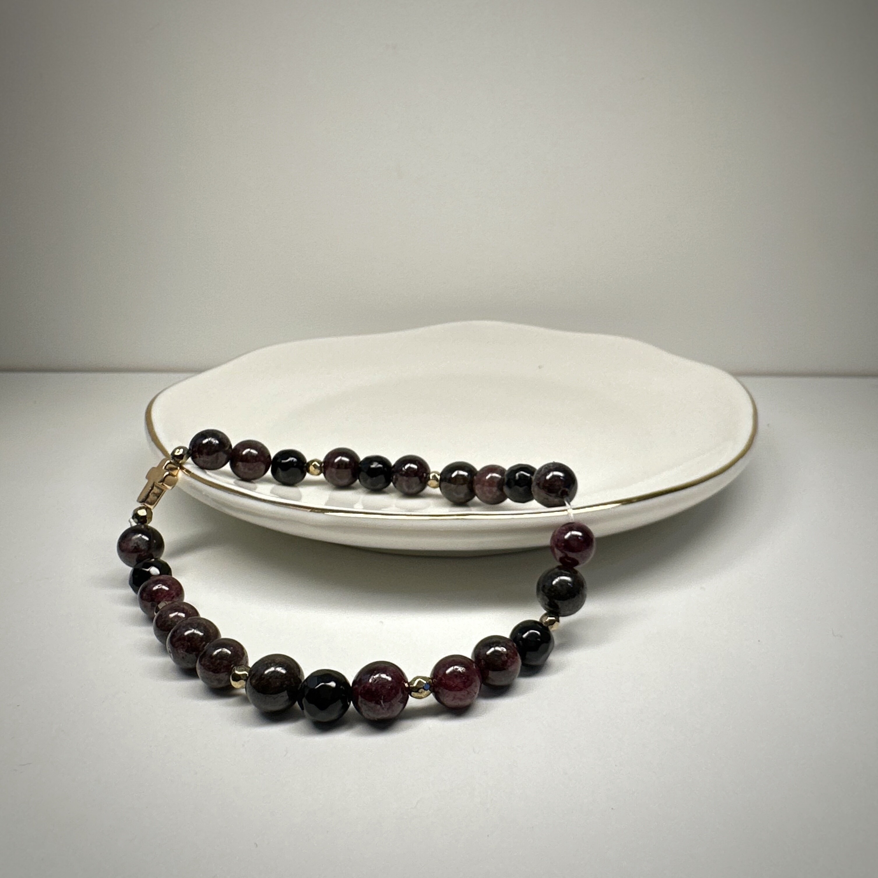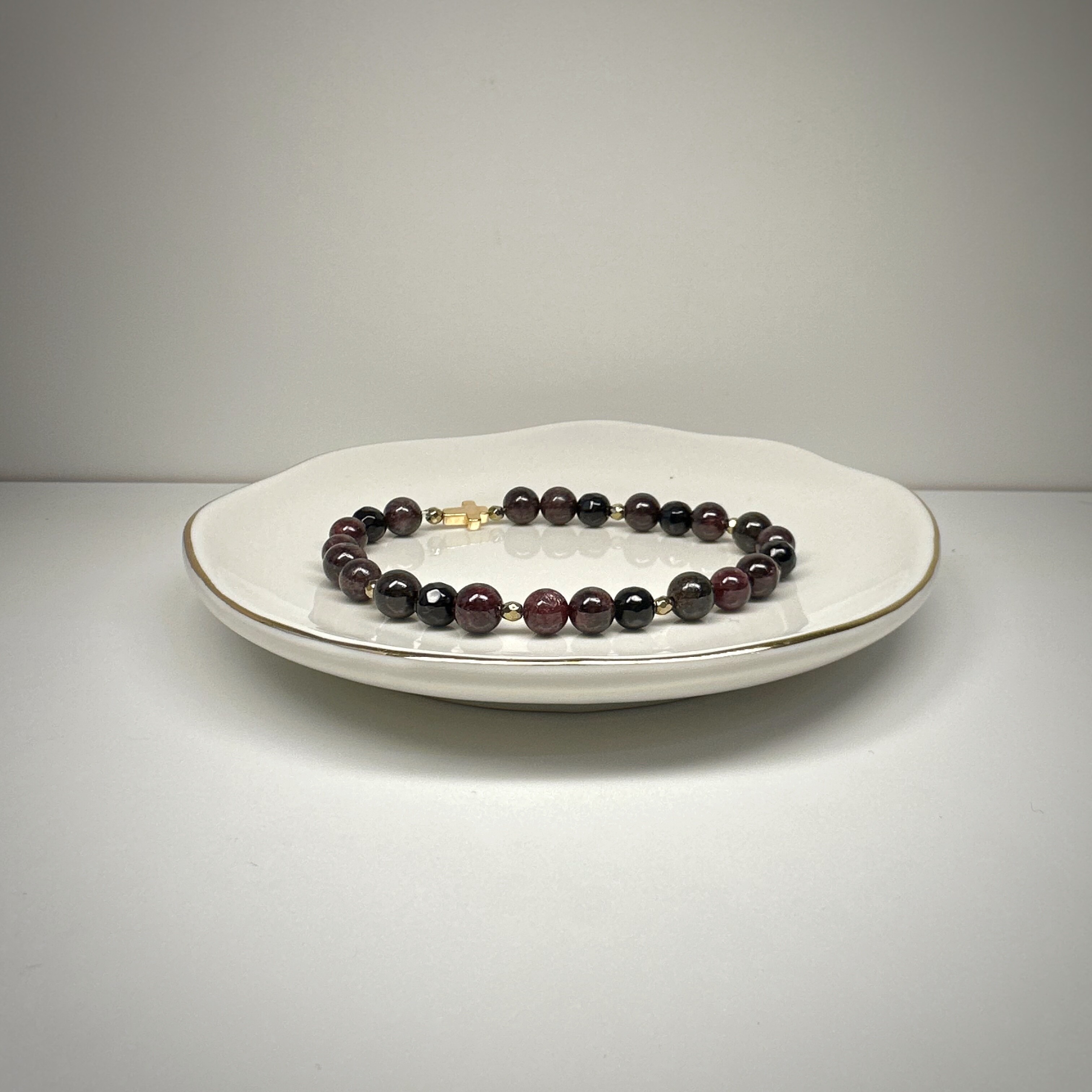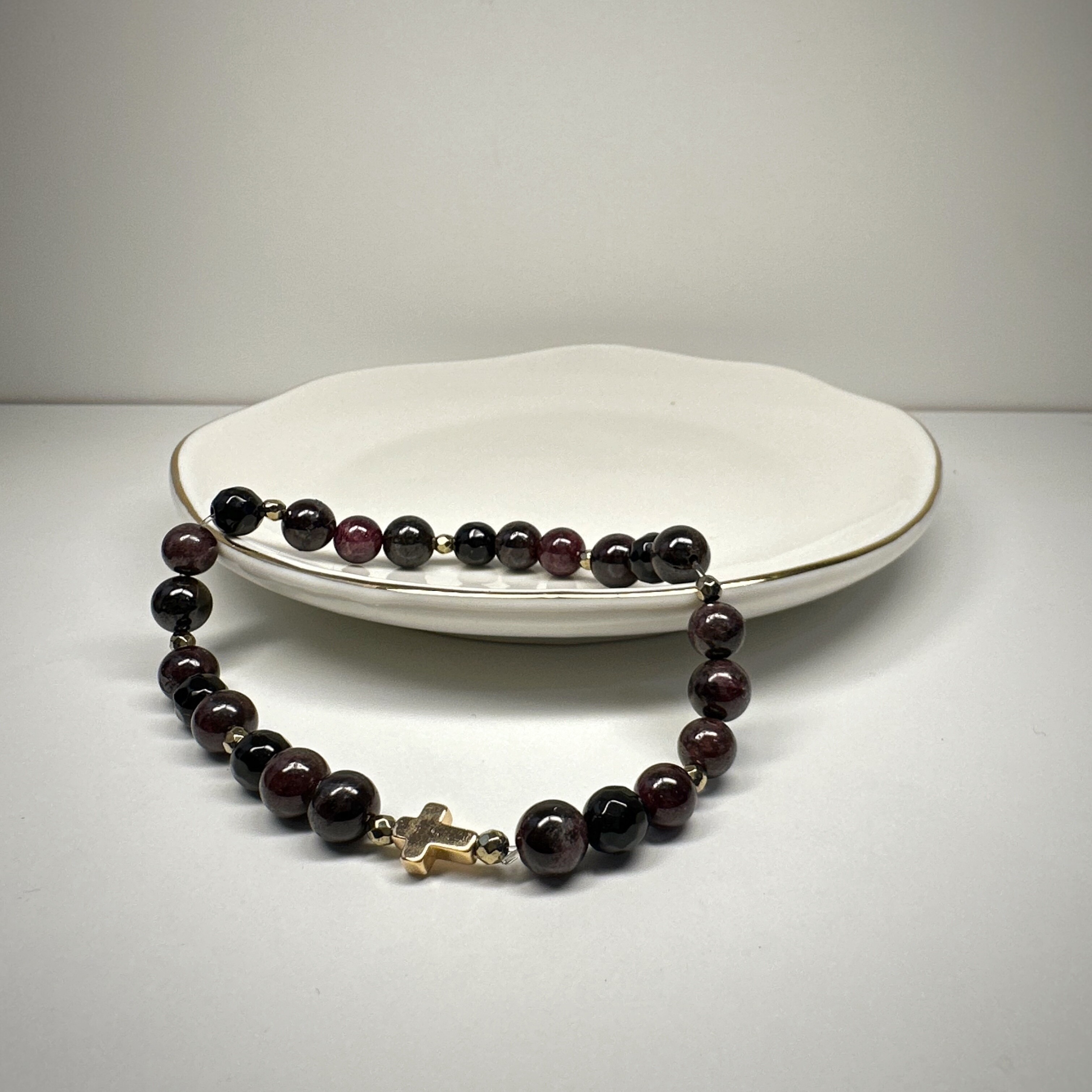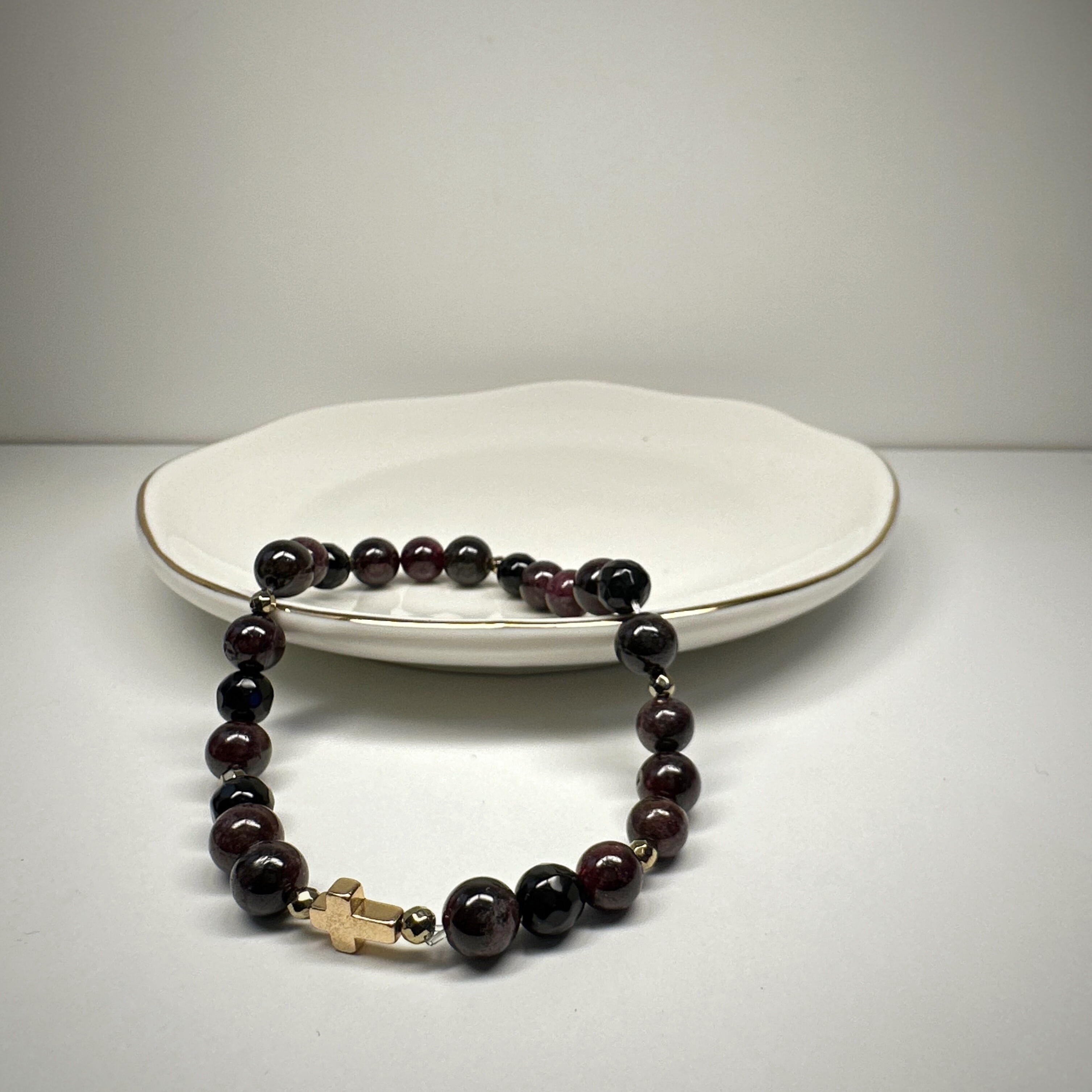 „Granatowy Krzyż” to biżuteria, która mówi o wartościach. Granat wspiera lojalność i pasję, pomaga trwać w relacjach i przy swoich zasadach. Krzyżyk symbolizuje duchowe zakorzenienie, a złoty hematyt dodaje energii i odwagi.