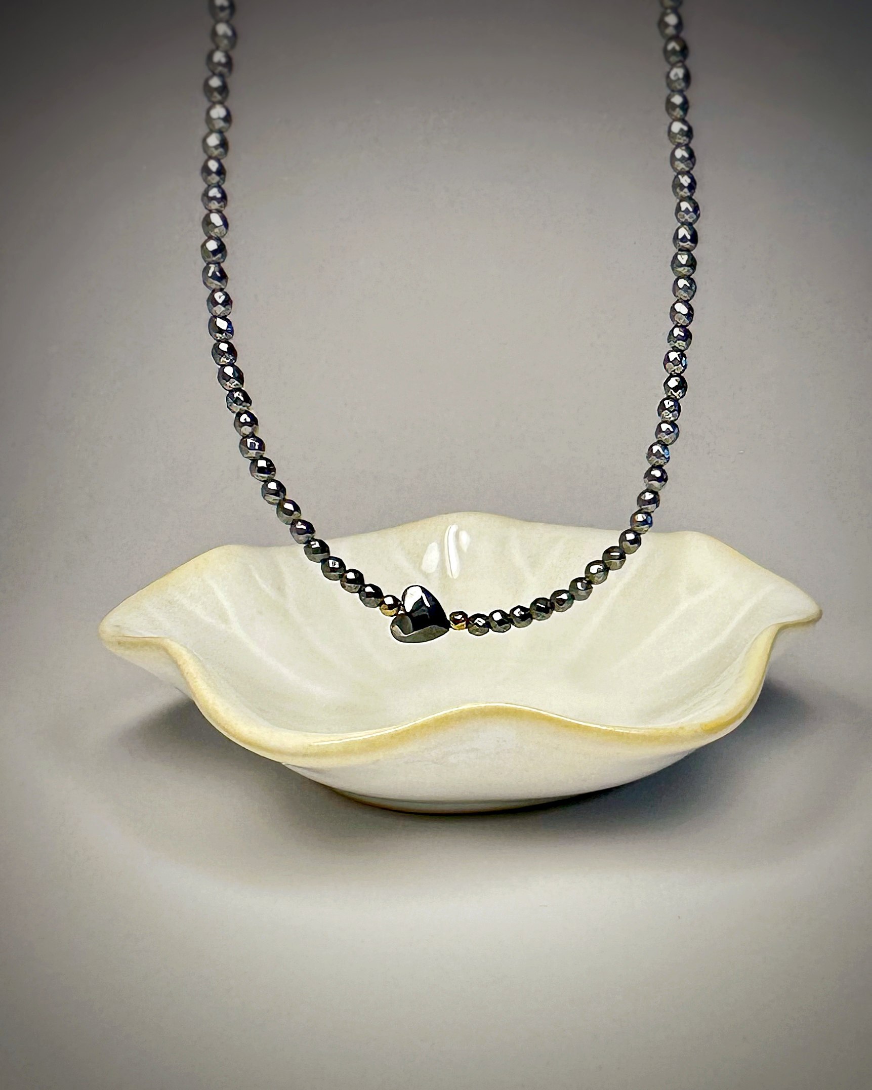 Fasetowane bryłki hematytu (4 mm) tworzą delikatniejszą i subtelną linię naszyjnika. Grafitowy połysk pozostaje wyrazisty, ale całość zyskuje lekkość. Złote akcenty hematytu dodają elegancji, a hematytowe serce pozostaje centralnym, symbolicznym detalem.