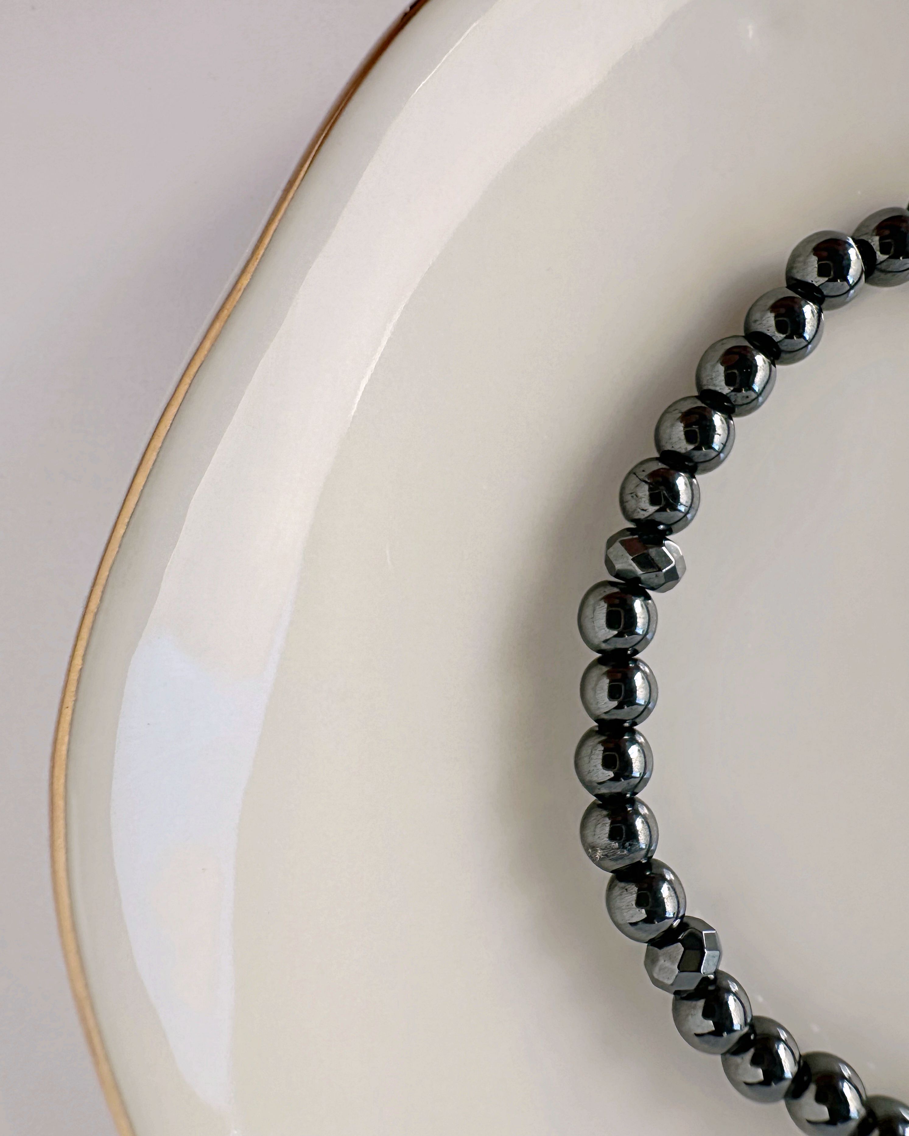 Kuliste kształty hematytu połączone z fasetowanymi bryłkami w spójną, zmysłową całość. Ozdobne, błyszczące kółko dodaje jej wyjątkowego charakteru, jak perła w muszli.