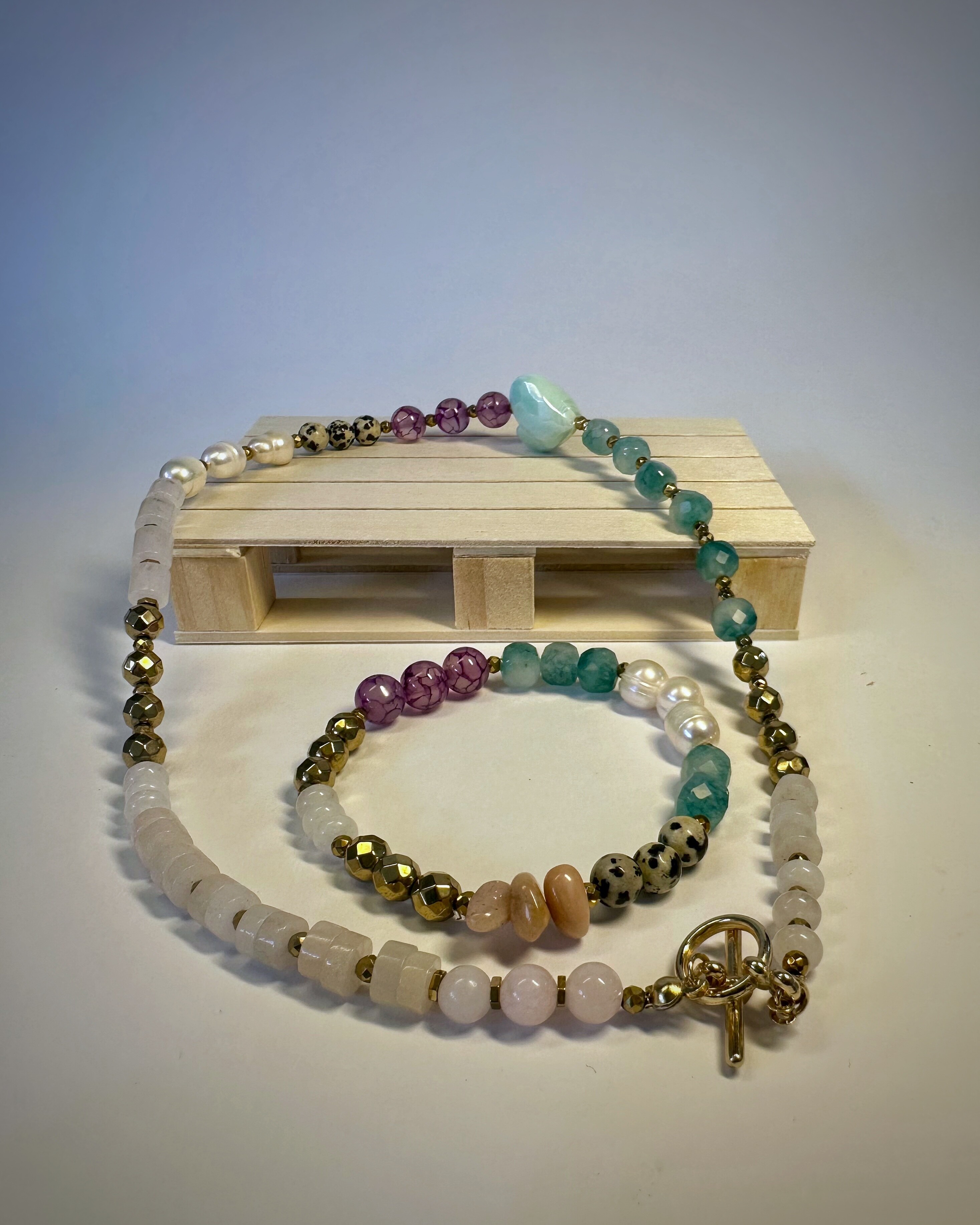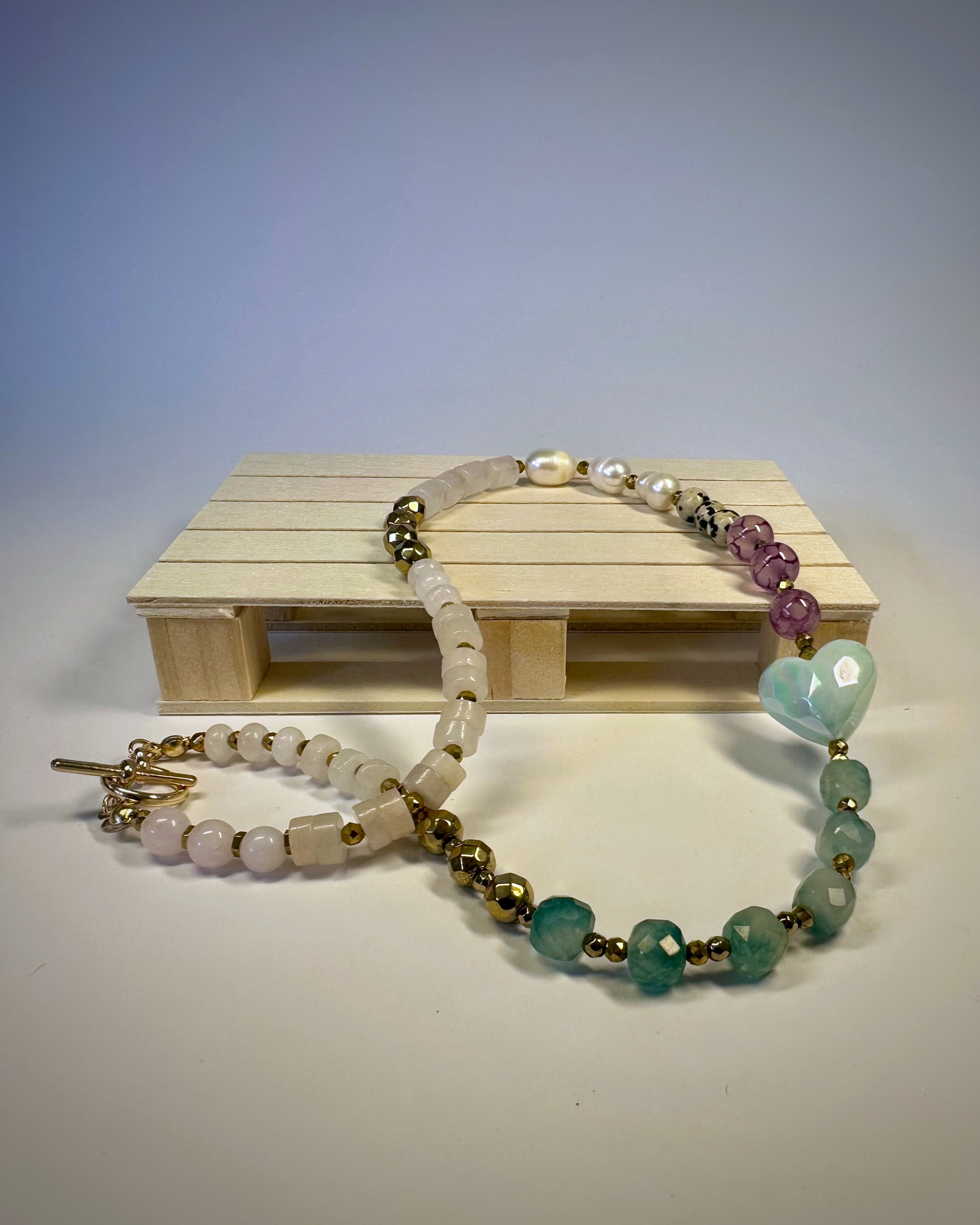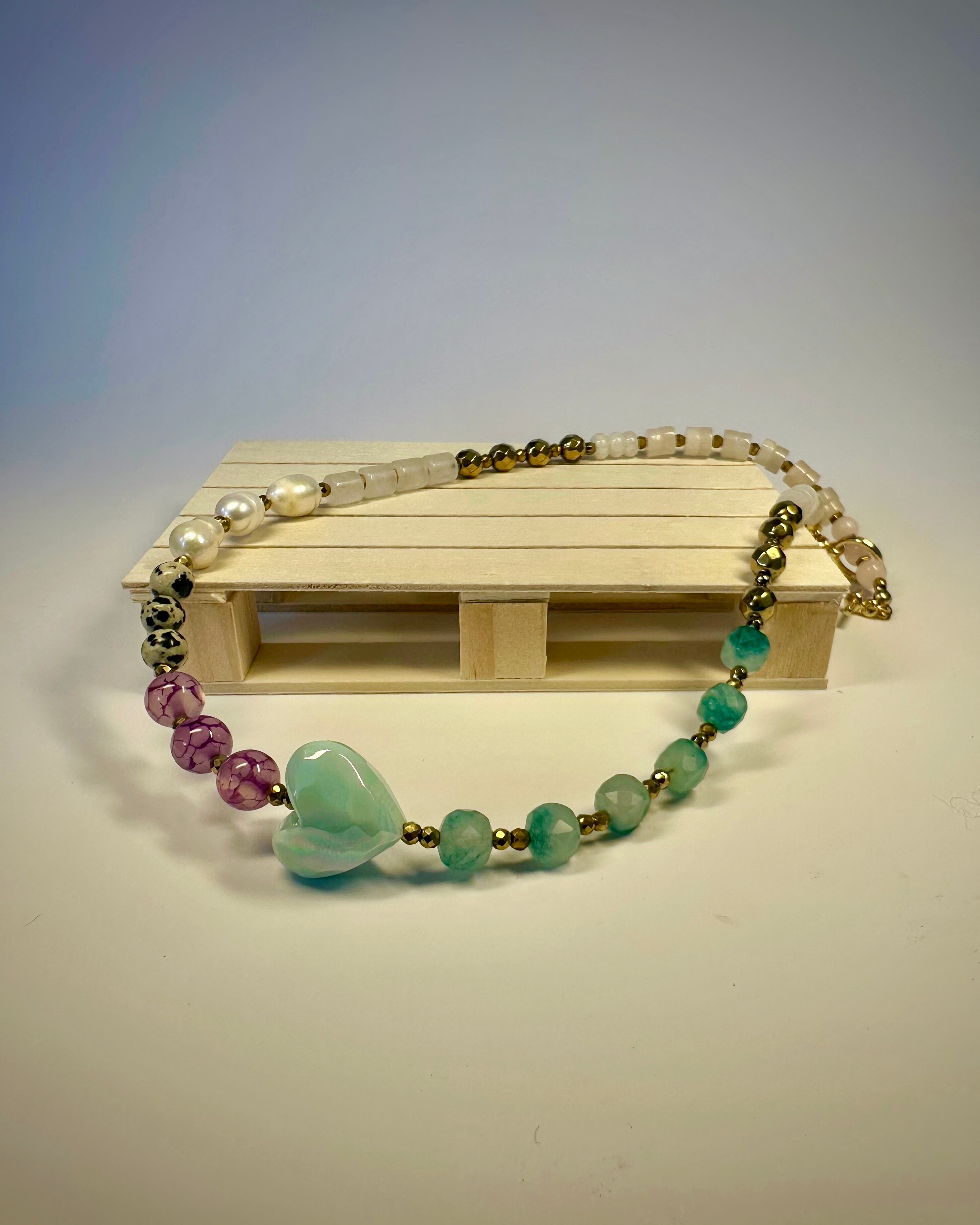 Lake Dream, to naszyjnik, w którym spotykają się kolory muralu z Chicago, kobieta, kwiaty, motyle i kolibry uchwycone na tle czarnej cegły. Przejrzysty fiolet agatu z zielonymi akcentami symbolizuje kontrast życia w mieście, a złocisty hematyt dodaje energii i blasku. Kwarc różowy i biały w formie krążków i tulejek wprowadzają subtelność, a jaspis dalmatyński i perła słodkowodna symbolizuje harmonię i miękkość. Pistacjowe serce ceramiczne o nieregularnej, fasetowanej powierzchni staje się centralnym akcentem i właśnie taki detal potrafi odmienić całą stylizację. Naszyjnik z kolekcji „23” to biżuteria pełna emocji, w której miejska energia spotyka się z nostalgią natury.