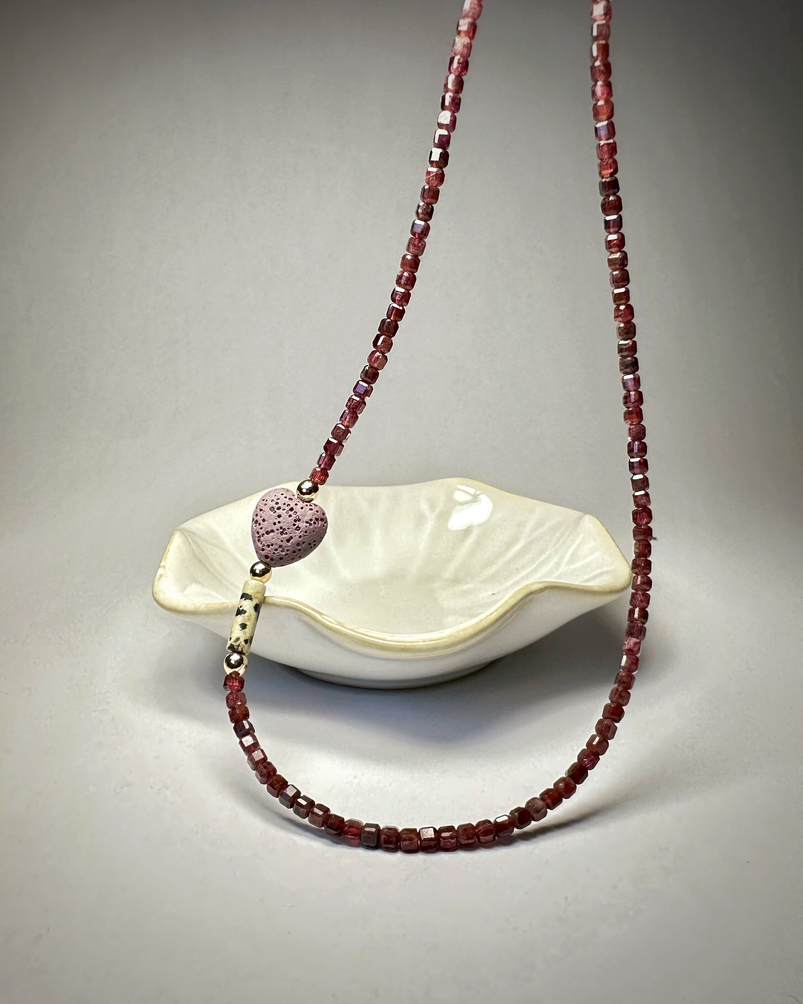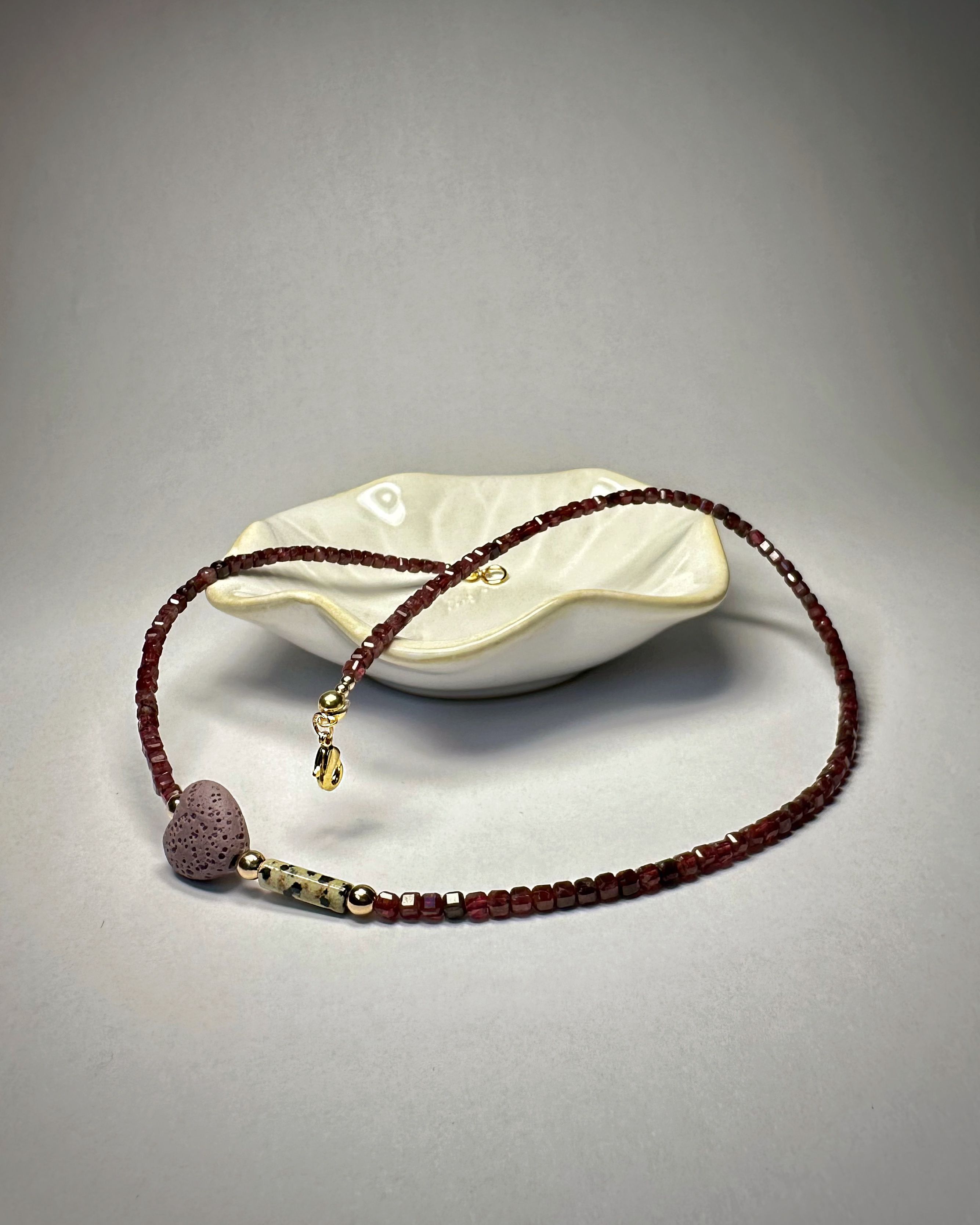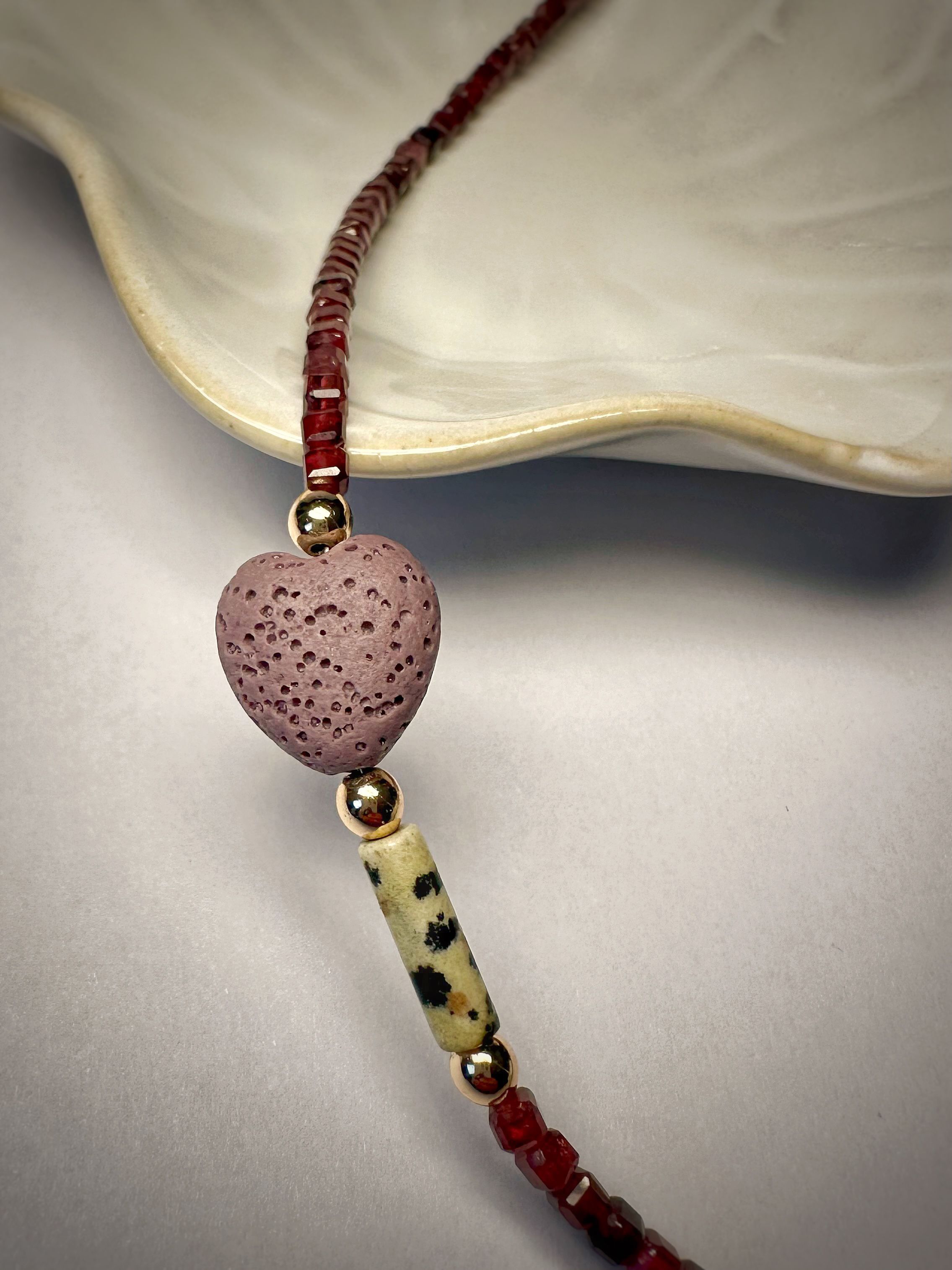 Lava Glow to interpretacja linii Lava w bardziej zmysłowym wydaniu. Kostki granatu w głębokim, bordowo - fioletowym kolorze wprowadzają intensywną energię, a serce z fioletowej lawy dodaje niepowtarzalnego charakteru. Wstawka z jaspisu dalmatyńskiego przełamuje całość subtelnym kontrastem i nadaje naszyjnikowi indywidualny rys. Granat to kamień pasji i odwagi, lawa mocy i transformacji, a jaspis, ochrony i spokoju. Razem tworzą biżuterię, która przyciąga uwagę i dodaje pewności siebie.
