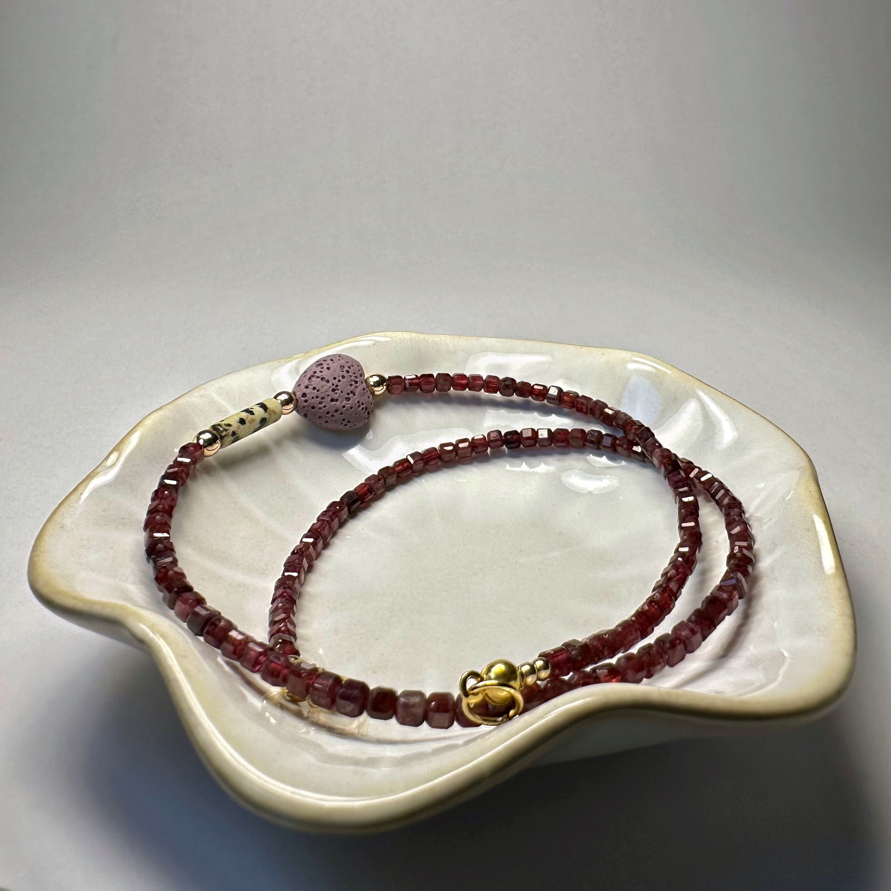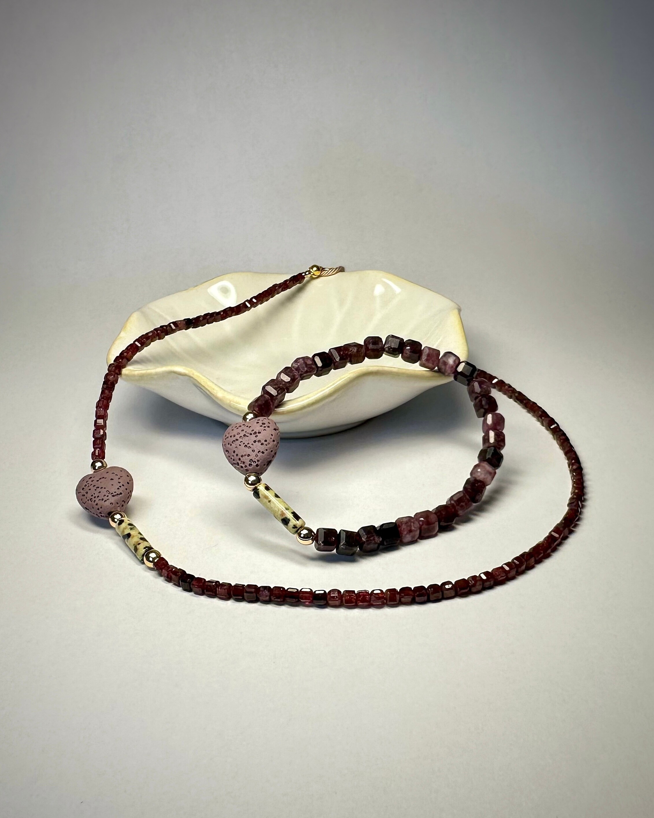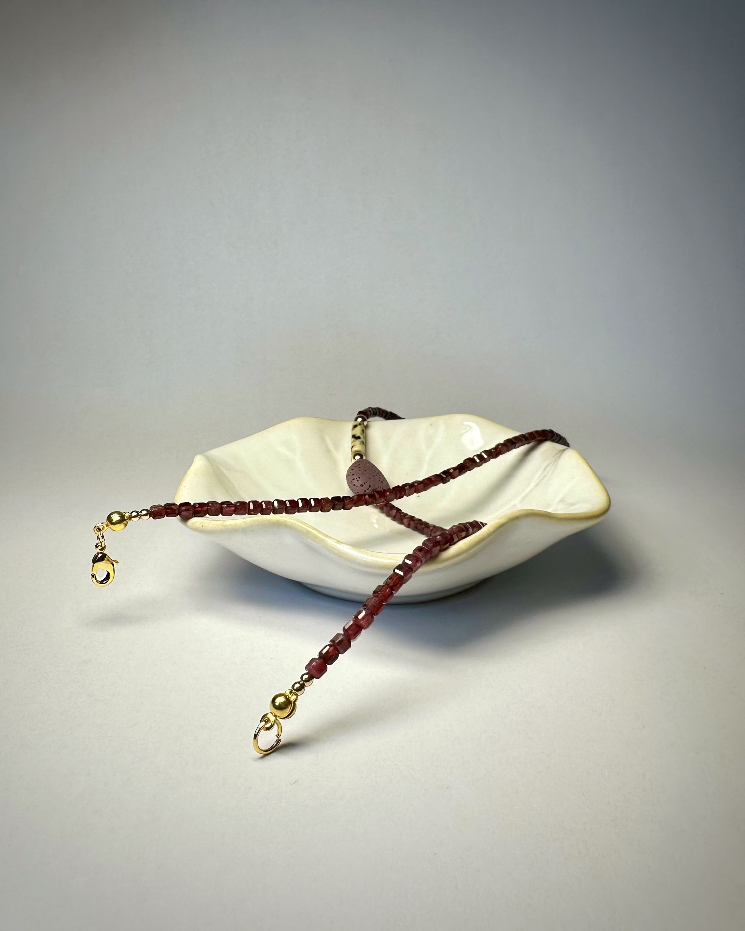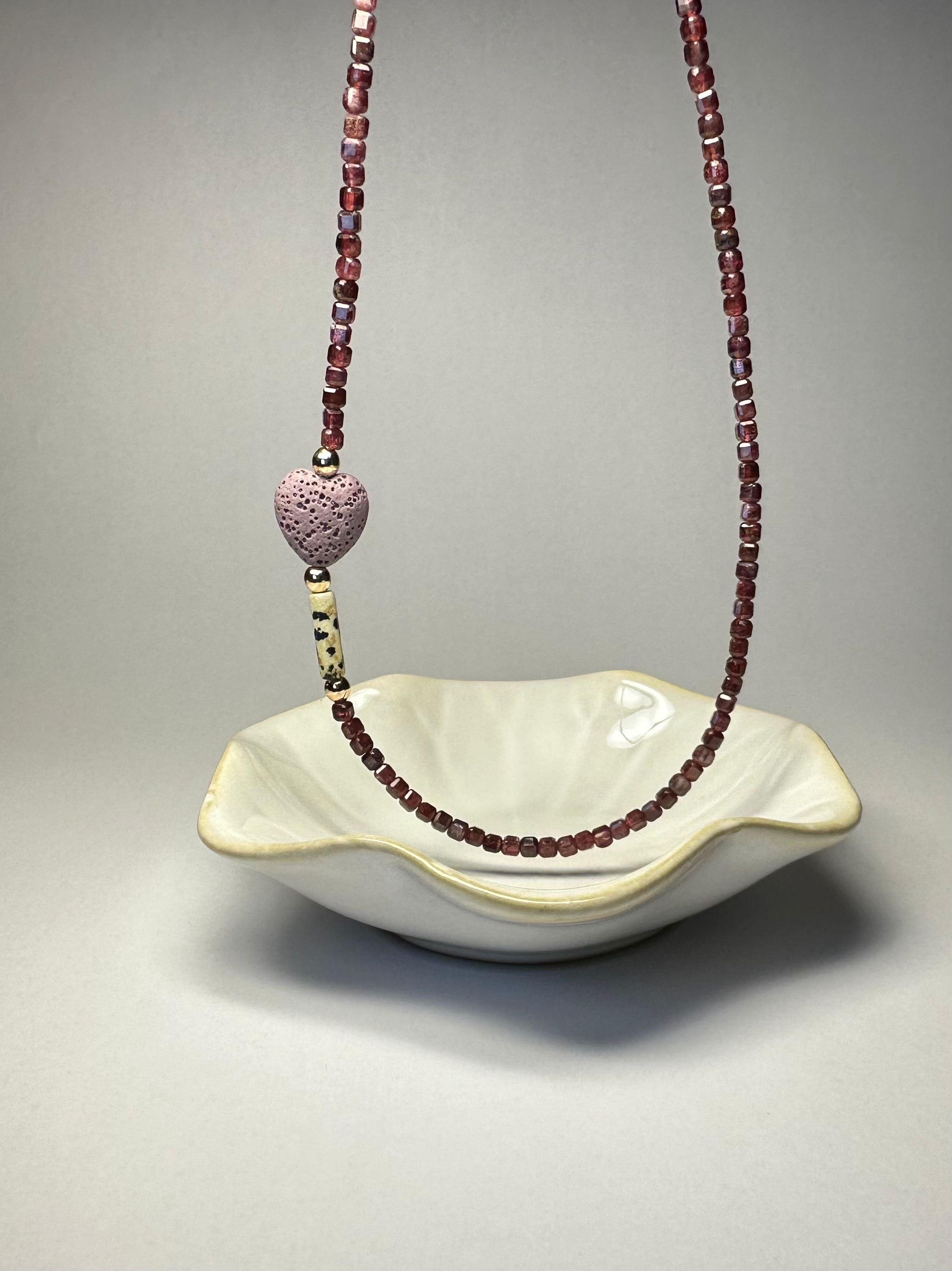 Lava Glow to interpretacja linii Lava w bardziej zmysłowym wydaniu. Kostki granatu w głębokim, bordowo - fioletowym kolorze wprowadzają intensywną energię, a serce z fioletowej lawy dodaje niepowtarzalnego charakteru. Wstawka z jaspisu dalmatyńskiego przełamuje całość subtelnym kontrastem i nadaje naszyjnikowi indywidualny rys. Granat to kamień pasji i odwagi, lawa mocy i transformacji, a jaspis, ochrony i spokoju. Razem tworzą biżuterię, która przyciąga uwagę i dodaje pewności siebie.