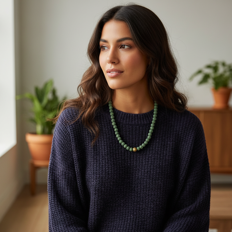 Lawa wulkaniczna w odcieniu głębokiej zieleni przypomina, że siła zawsze rodzi się w ciszy. Złoty agat rozświetla tę energię niczym promień słońca przebijający się przez mgłę delikatny, ale potężny w działaniu. To naszyjnik, który pasuje do naturalnych tkanin, bieli i ciepłych beży, ale też przełamie chłód minimalistycznych stylizacji. Idealny, gdy chcesz dodać sobie pewności i stabilności.