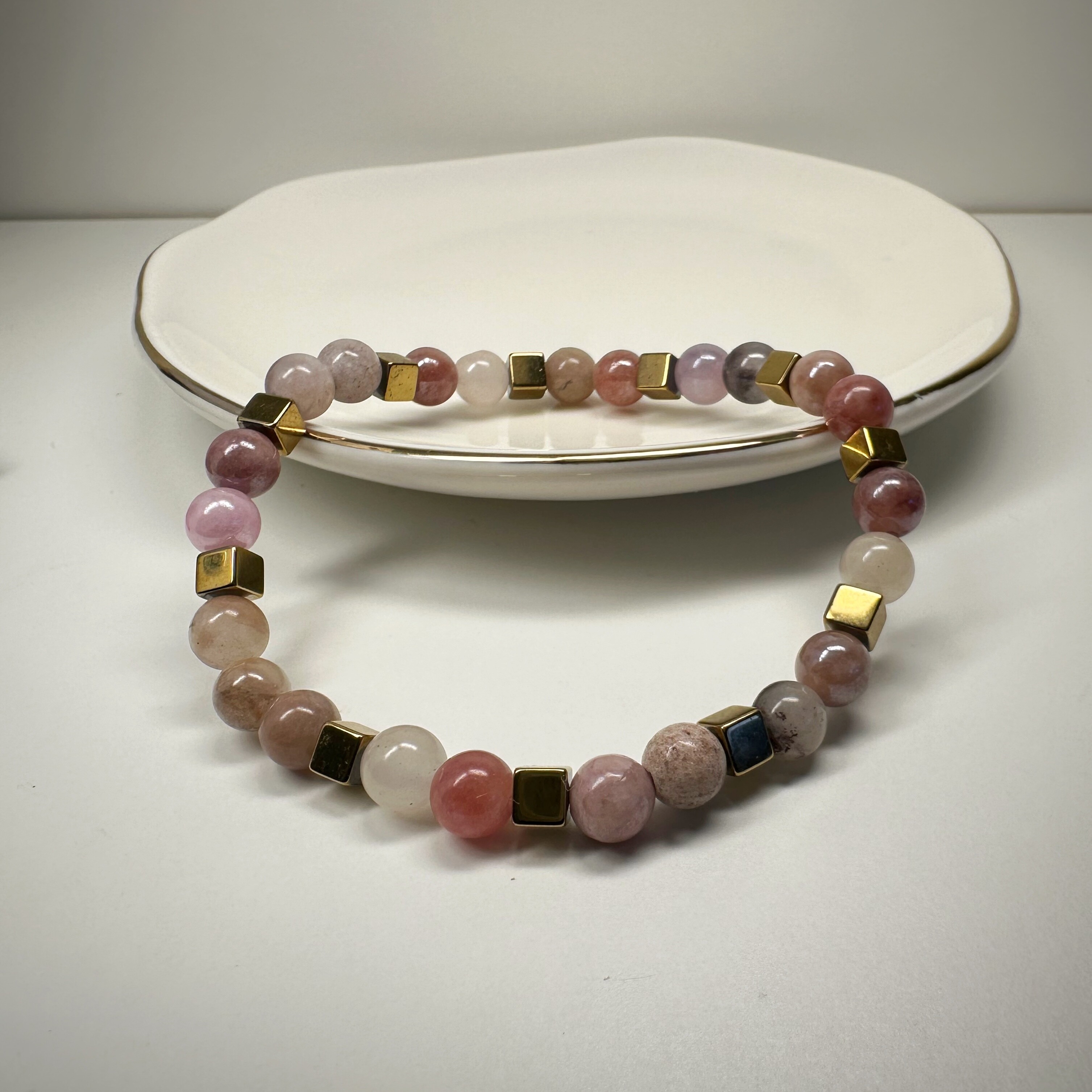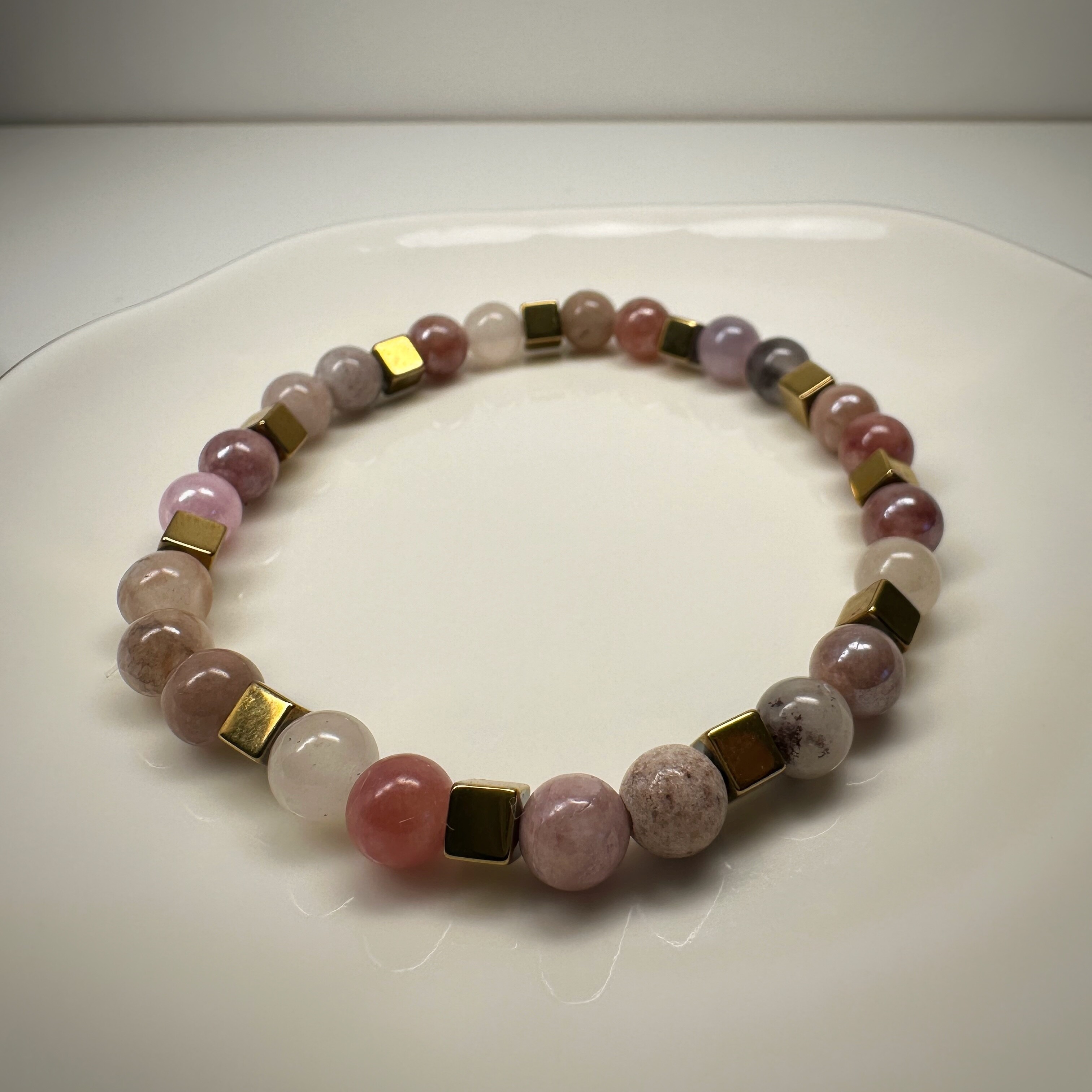 „Mgliste Pragnienie” to jak westchnienie serca – subtelne, ale głębokie. Rodonit pomaga goić rany emocjonalne, przywraca poczucie własnej wartości i dodaje wewnętrznej siły. Kwarc różowy otula jak miękki koc miłości, a hematyt wzmacnia wiarę w siebie i uziemia. Całość tworzy aurę delikatnej, ale świadomej kobiecości.✨ Synergia: Rodonit z kwarcem różowym działa jak emocjonalny balsam, a hematyt wzmacnia efekt poprzez osadzenie i ochronę.