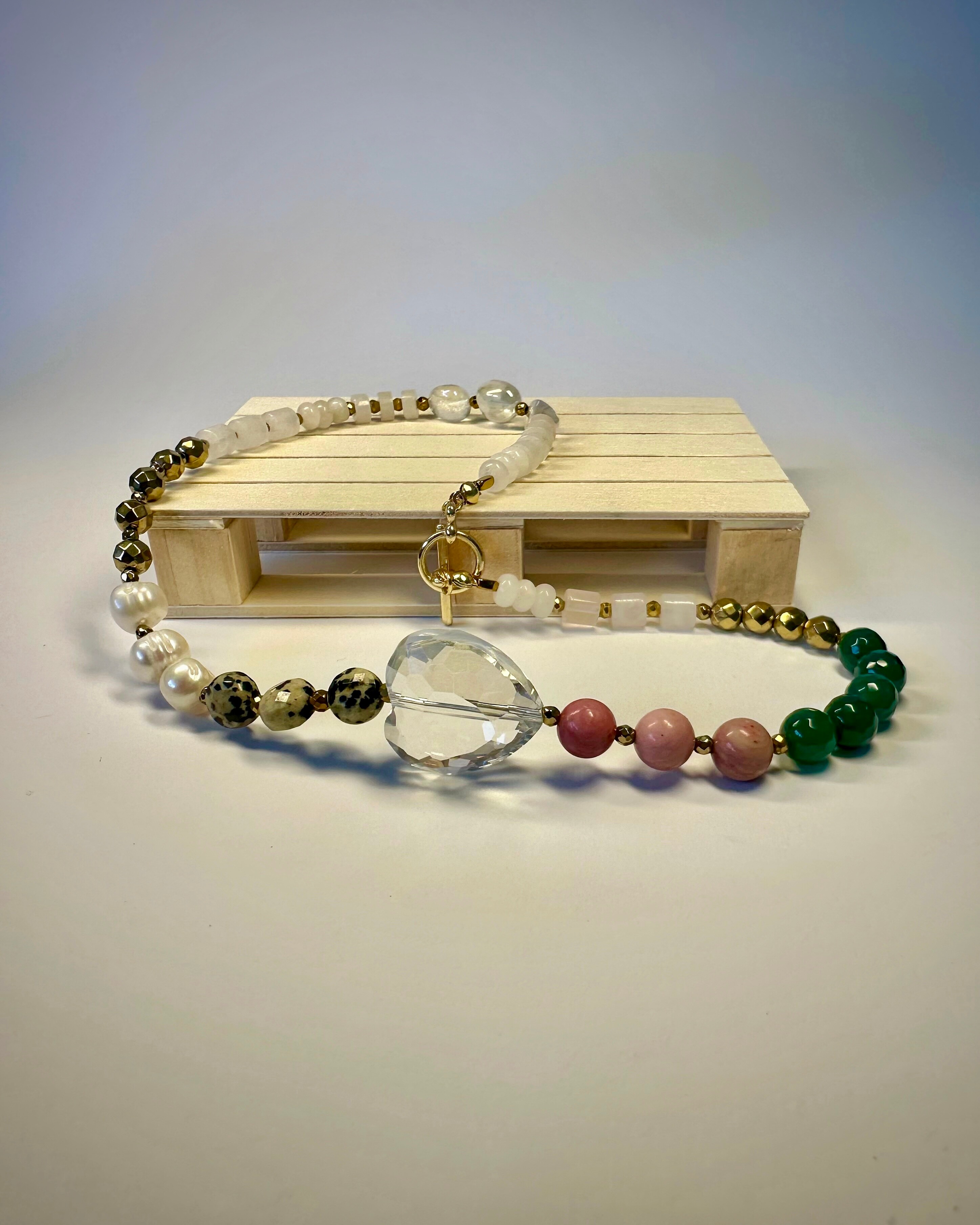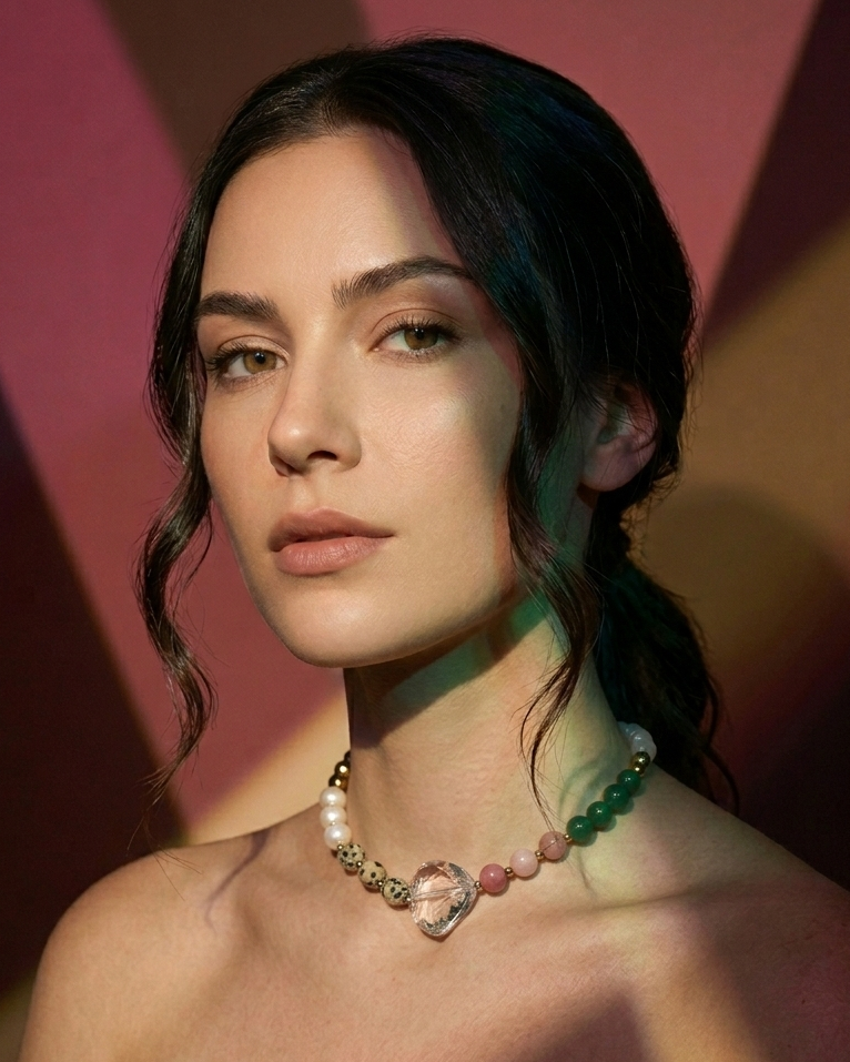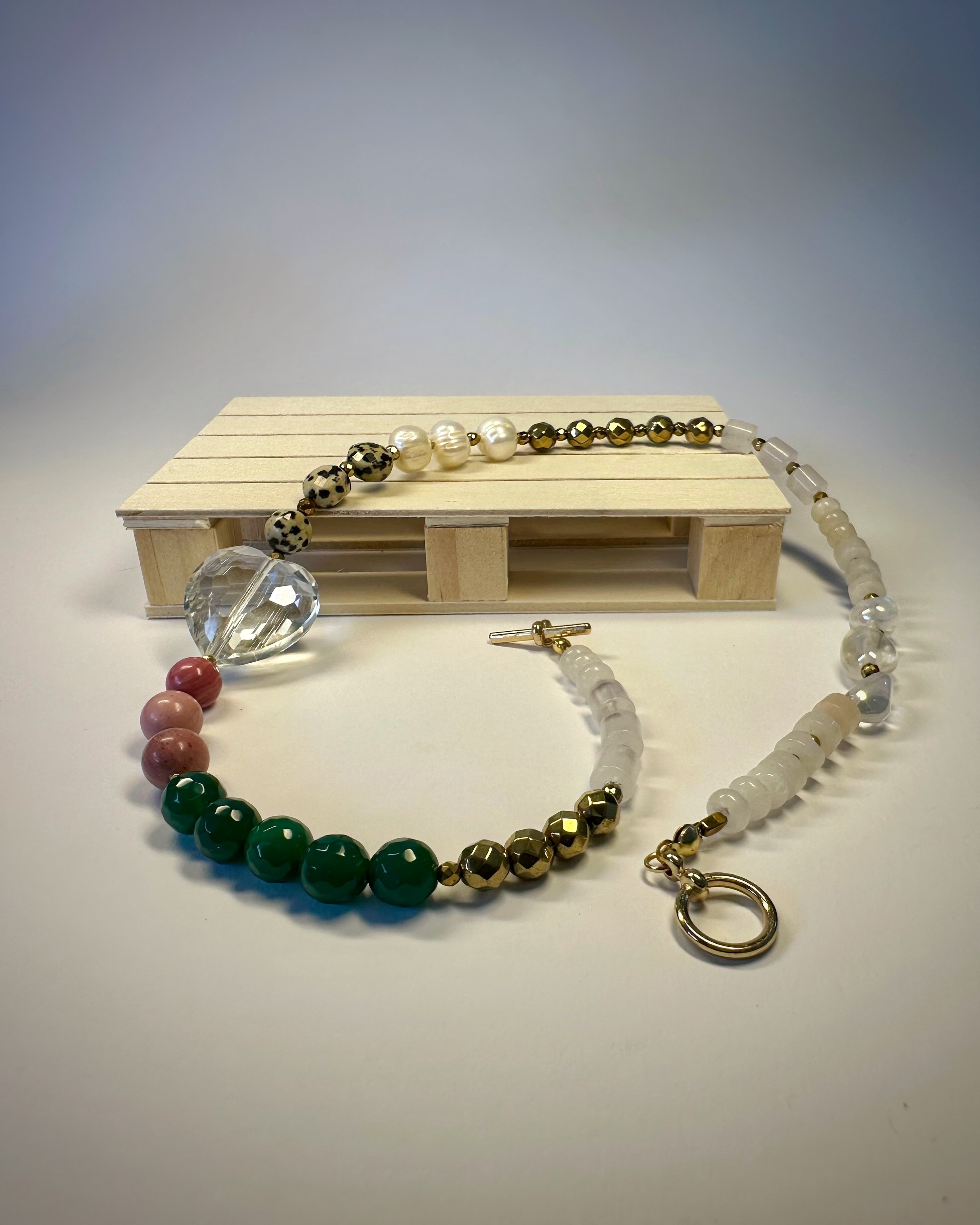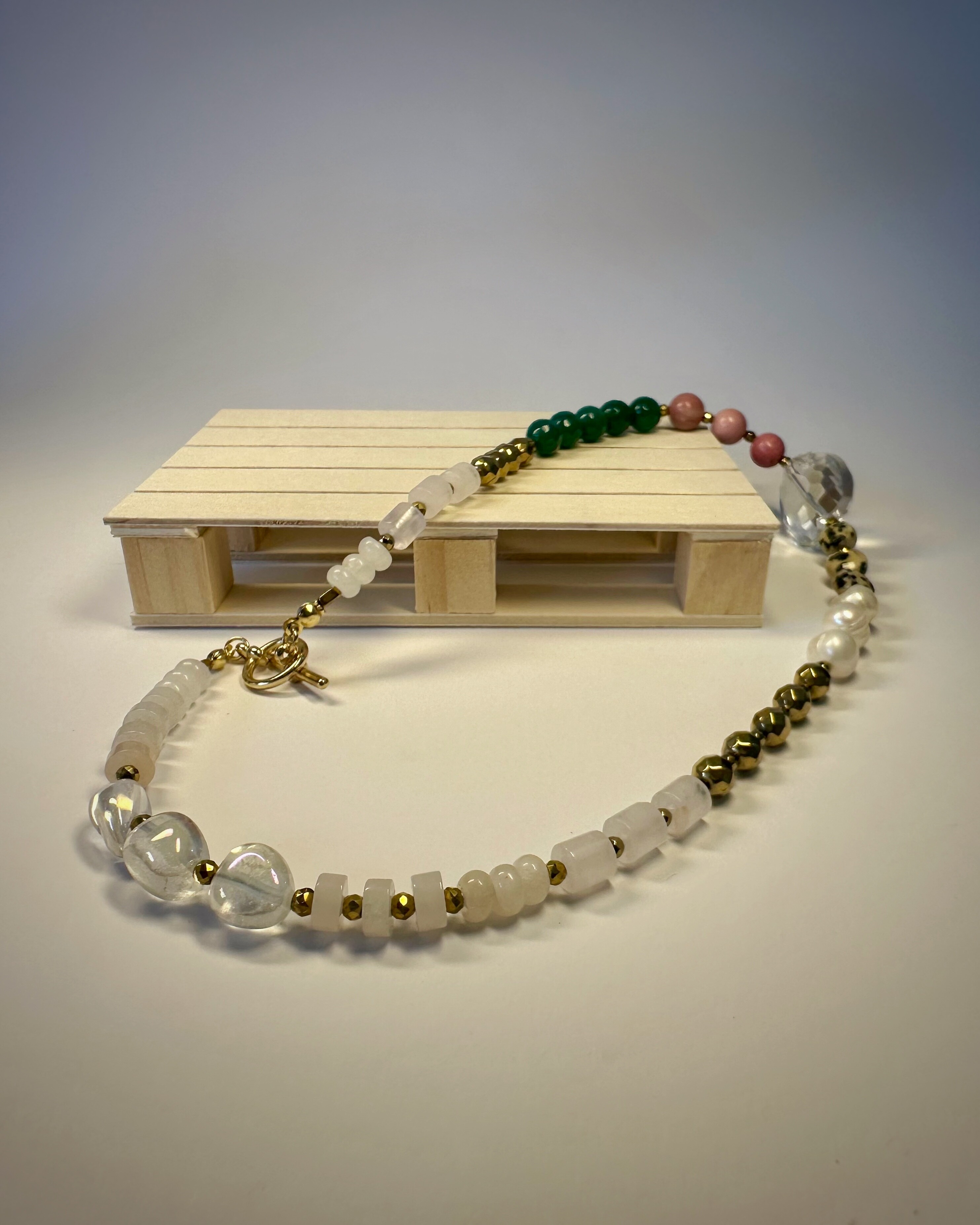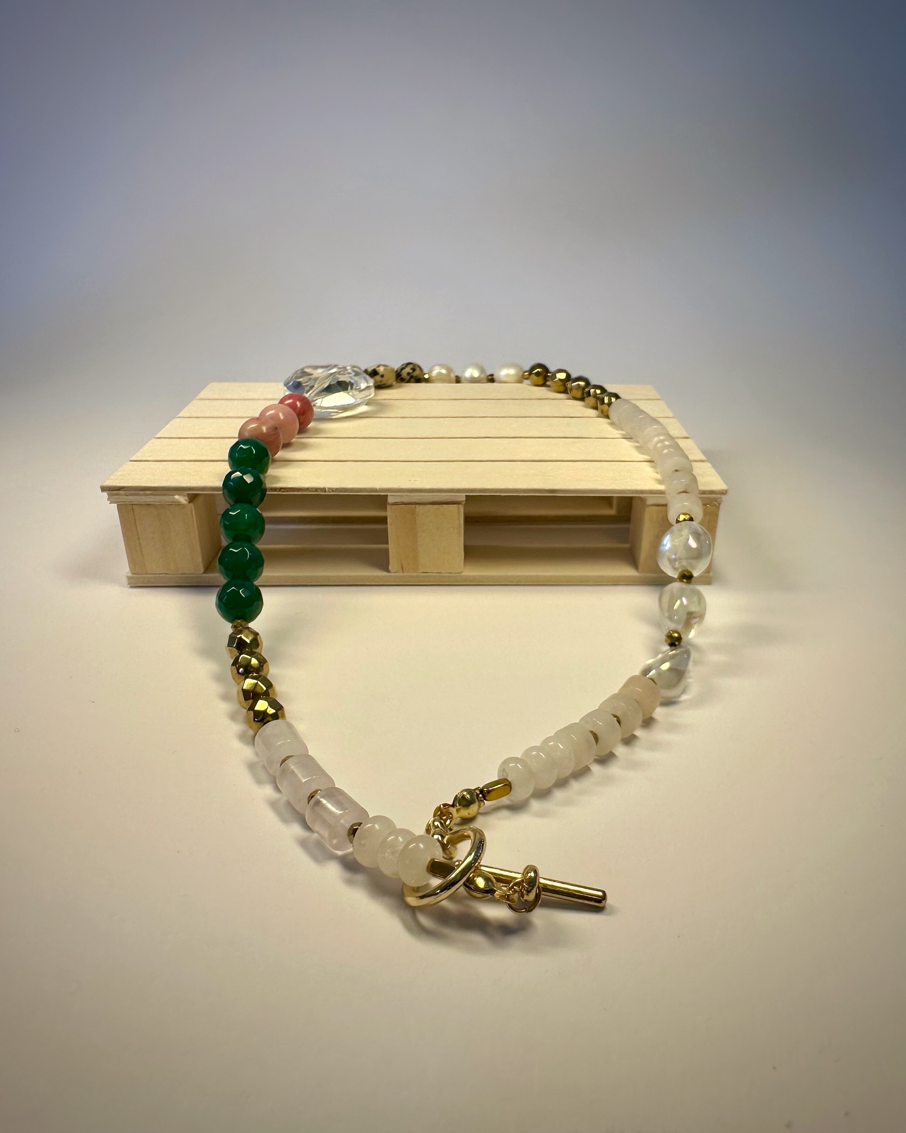 "MICHIGAN GLOW" to naszyjnik, który przenosi klimat muralu z Chicago w formę biżuterii. Połączenie bieli kwarcu i ciemnego różu jadeitu oddaje kontrast emocji – od spokoju po pasję. Agat i złoty hematyt nadają mu głębię i energię, a jaspis dalmatyński oraz perła słodkowodna dodają subtelności i wyjątkowej faktury. Całość zwieńcza duże, szklane serce – symbol szczerości i lekkości. Nietypowe zapięcie typu toggle wprowadza nowoczesny akcent, dzięki któremu naszyjnik wygląda równie pięknie z przodu, jak i z tyłu. Kolekcja „23” to biżuteria, w której miasto i natura, barwa i kontrast tworzą pełen emocji obraz.