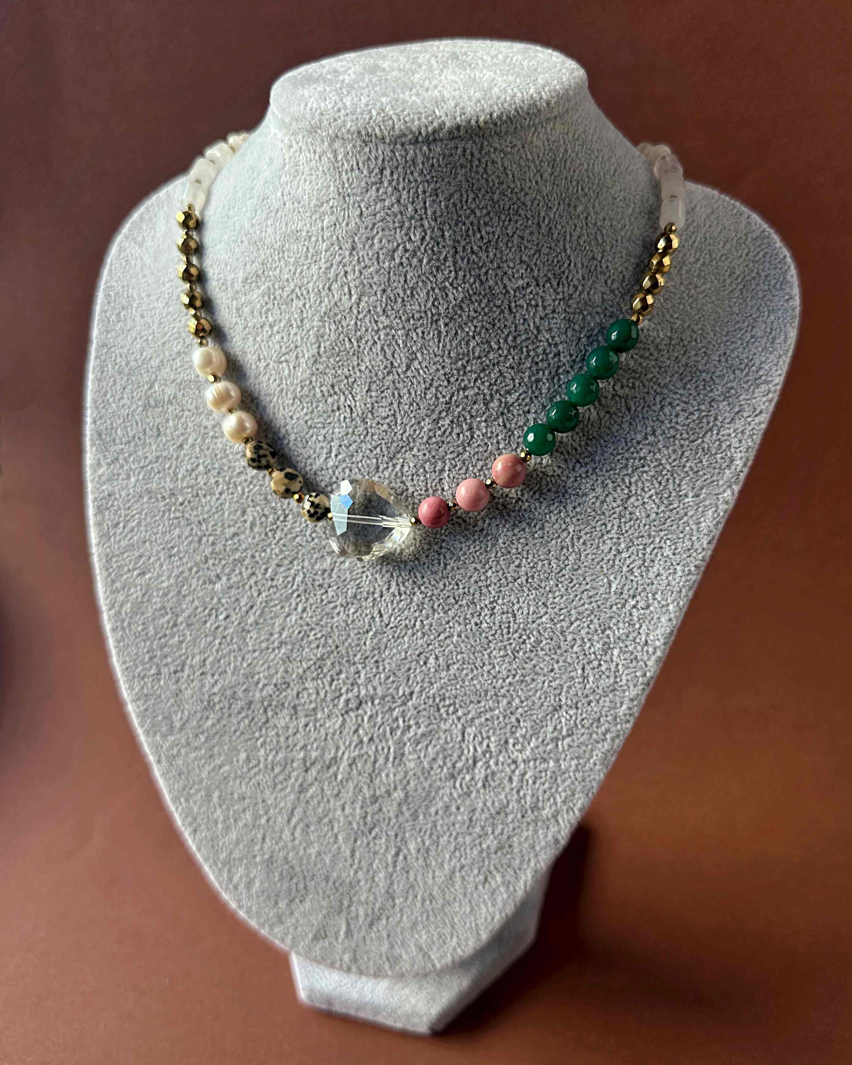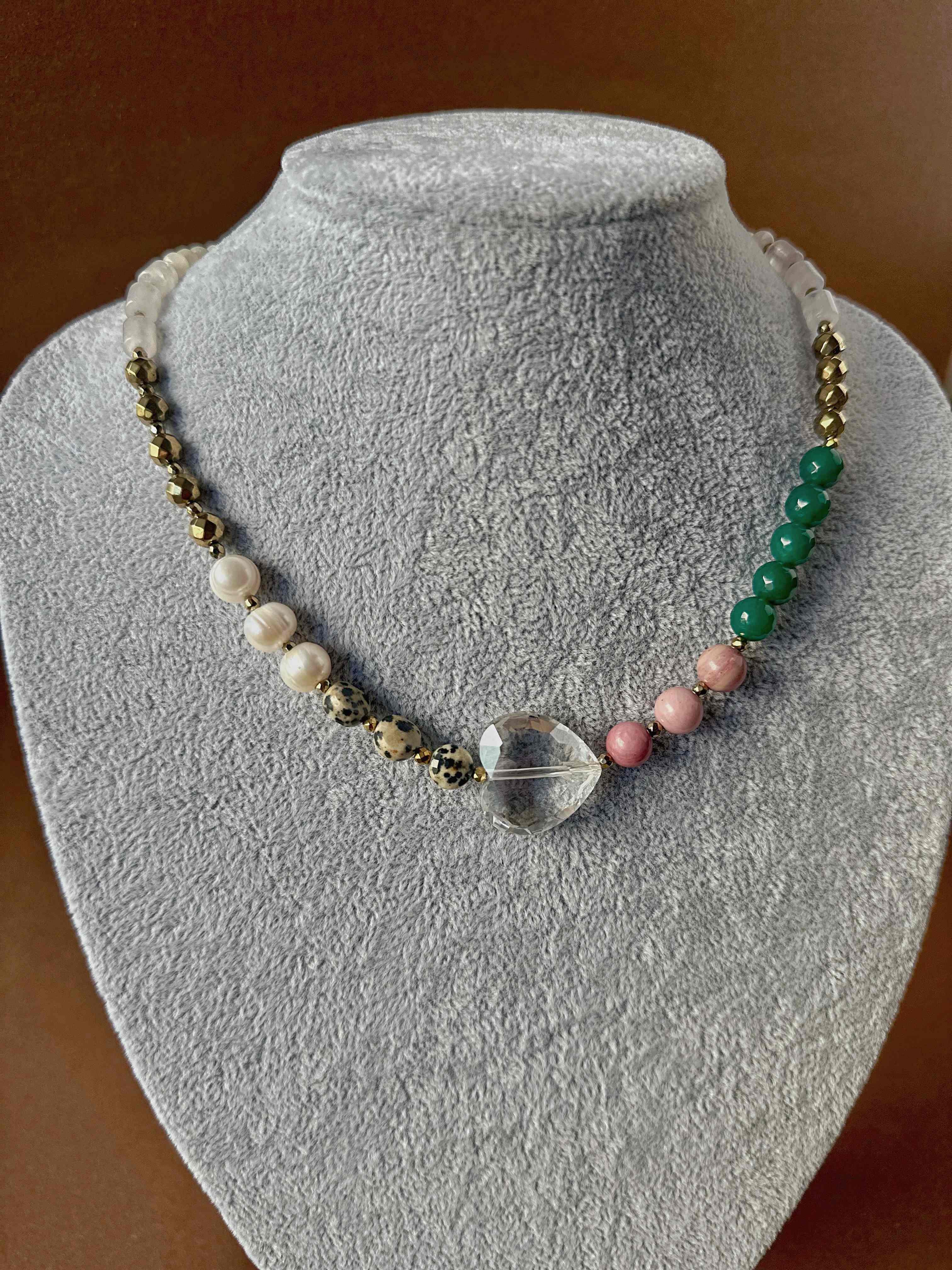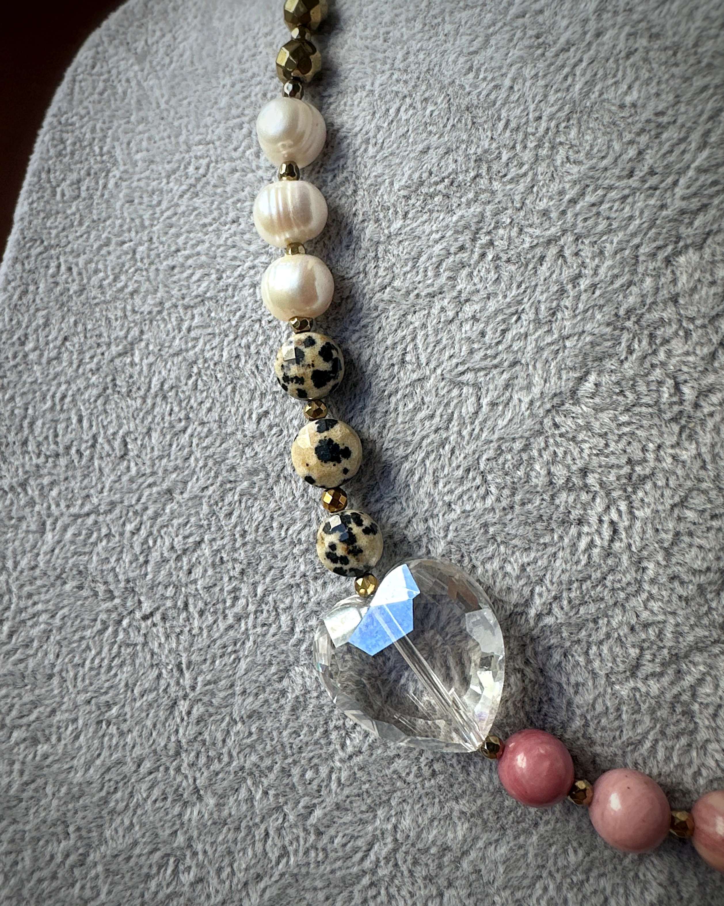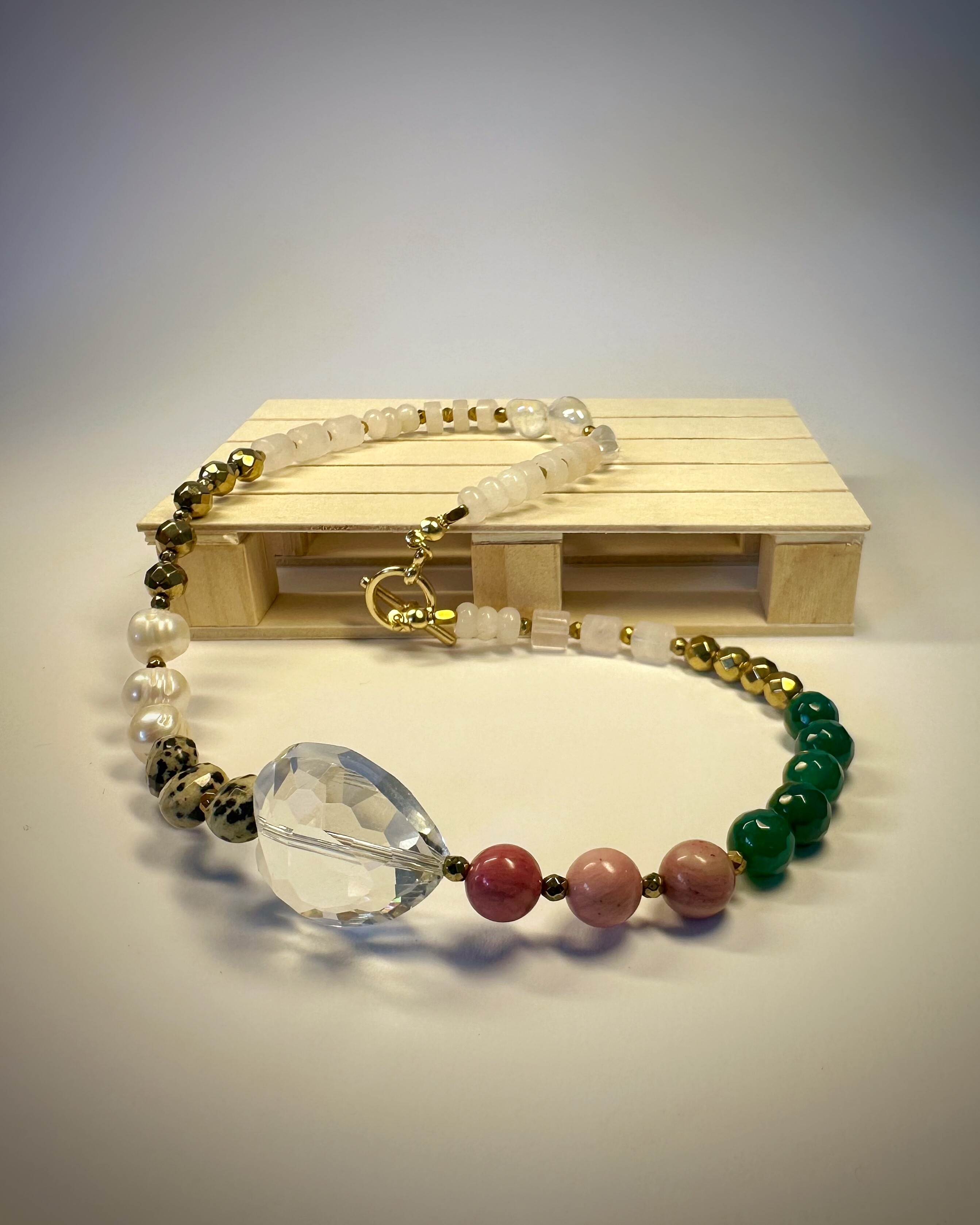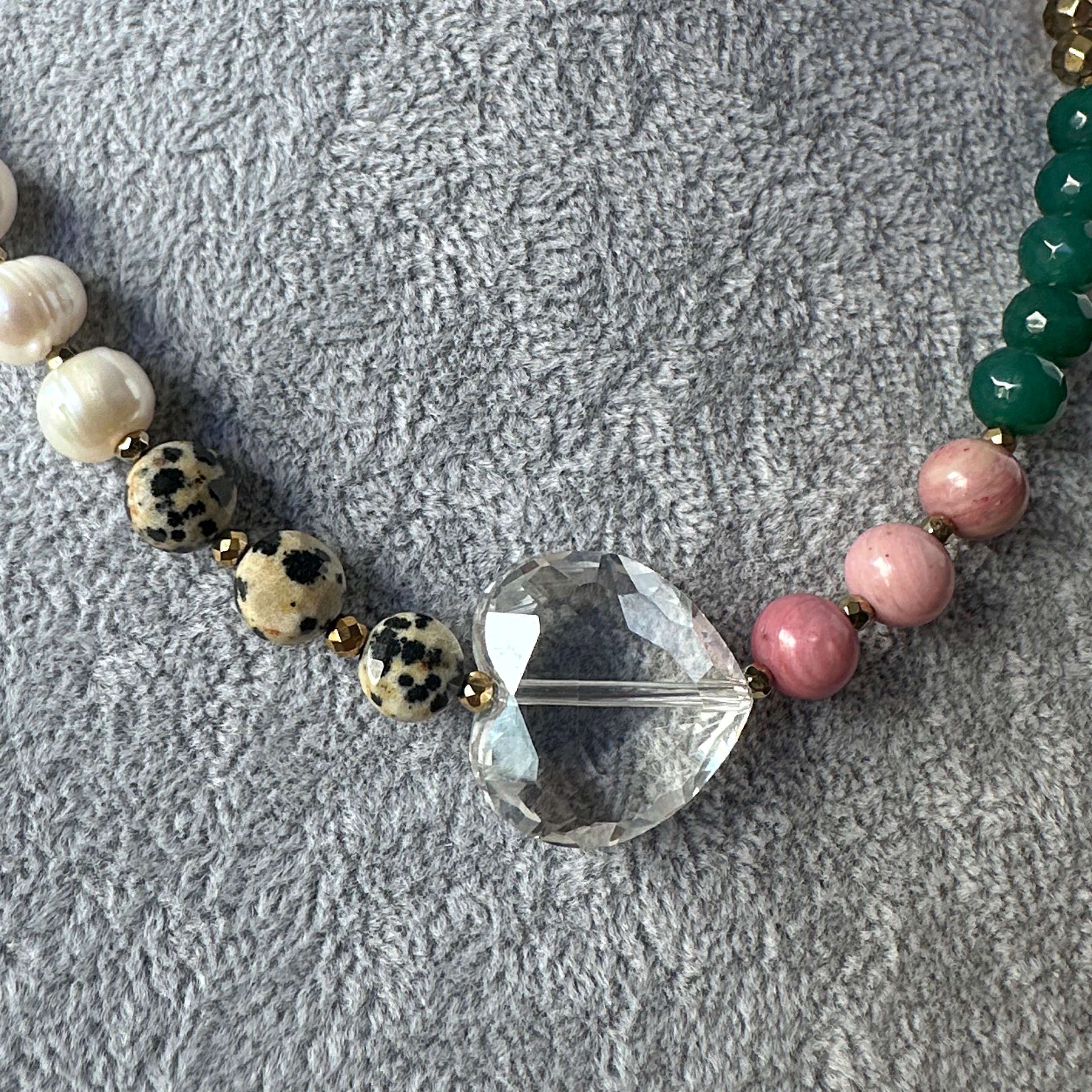 "MICHIGAN GLOW" to naszyjnik, który przenosi klimat muralu z Chicago w formę biżuterii. Połączenie bieli kwarcu i ciemnego różu jadeitu oddaje kontrast emocji – od spokoju po pasję. Agat i złoty hematyt nadają mu głębię i energię, a jaspis dalmatyński oraz perła słodkowodna dodają subtelności i wyjątkowej faktury. Całość zwieńcza duże, szklane serce – symbol szczerości i lekkości. Nietypowe zapięcie typu toggle wprowadza nowoczesny akcent, dzięki któremu naszyjnik wygląda równie pięknie z przodu, jak i z tyłu. Kolekcja „23” to biżuteria, w której miasto i natura, barwa i kontrast tworzą pełen emocji obraz.