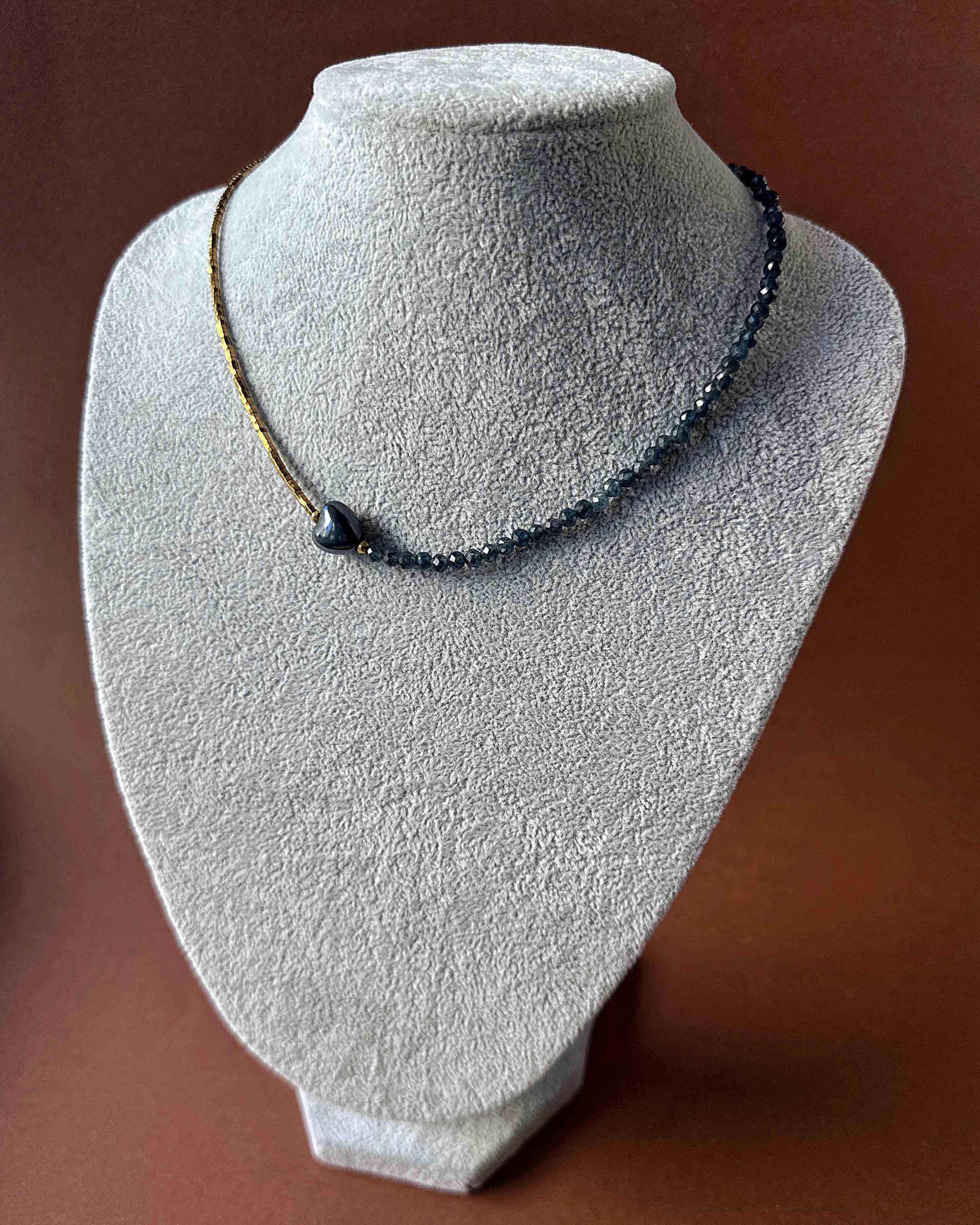 Akcentem jest ceramiczne serce w kolorze granatowym, które po założeniu układa się asymetrycznie, delikatnie przesuwając się na bok, co sprawia, żę całość nabiera nietuzinkowego wyrazu.