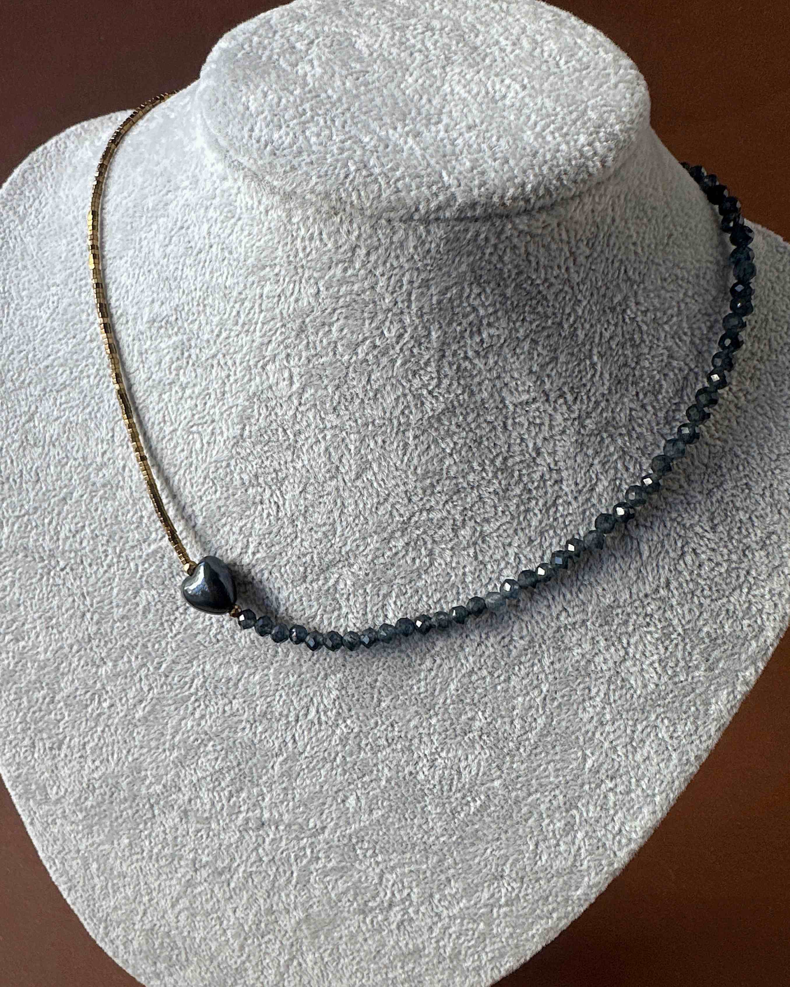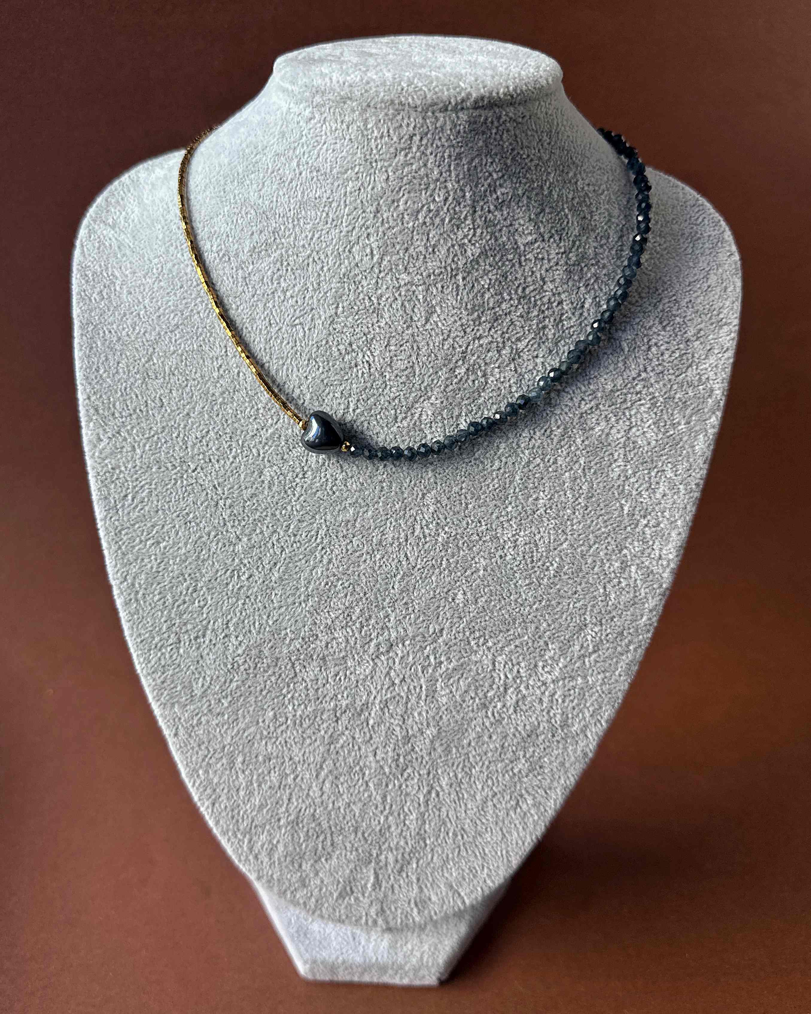 Naszyjnik zbudowany jest w formie „pół na pół”, czyli jedna część to szklisty granat w nieregularnych bryłkach (ok. 4 mm), mieniący się odcieniami głębokiego granatu i niebieskiego. Druga część to chłodny, metaliczny kontrastowy hematyt.