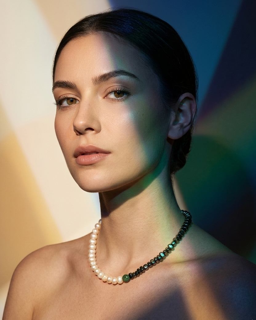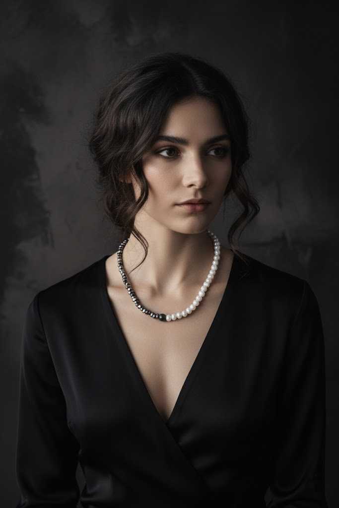 2. Kontrast miękkiej perły i chłodnego hematytu tworzy nowoczesną elegancję.