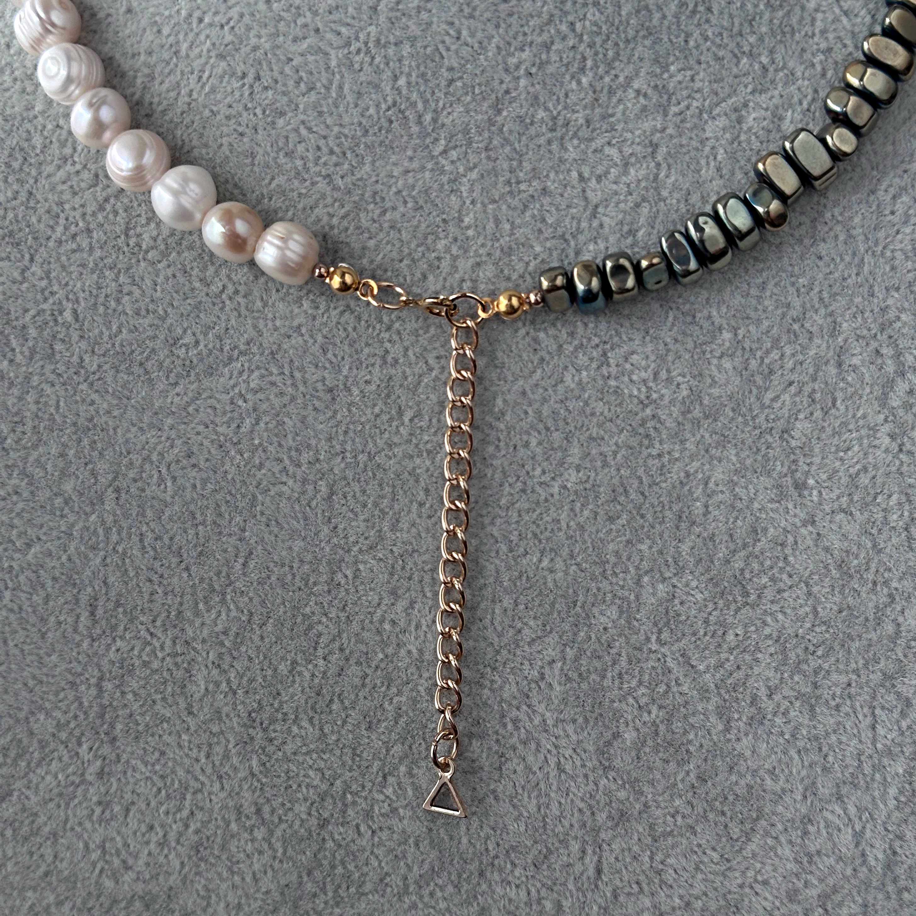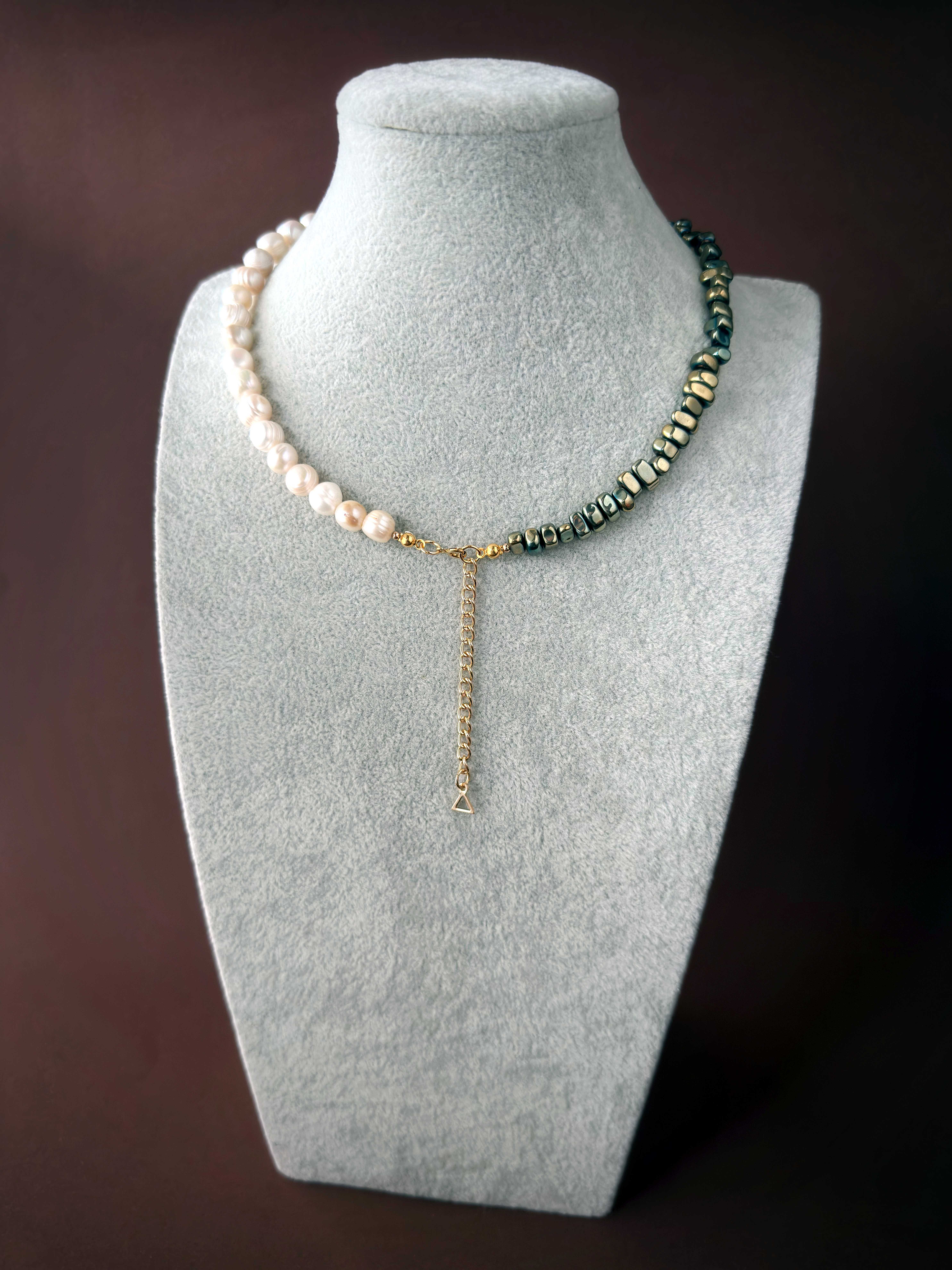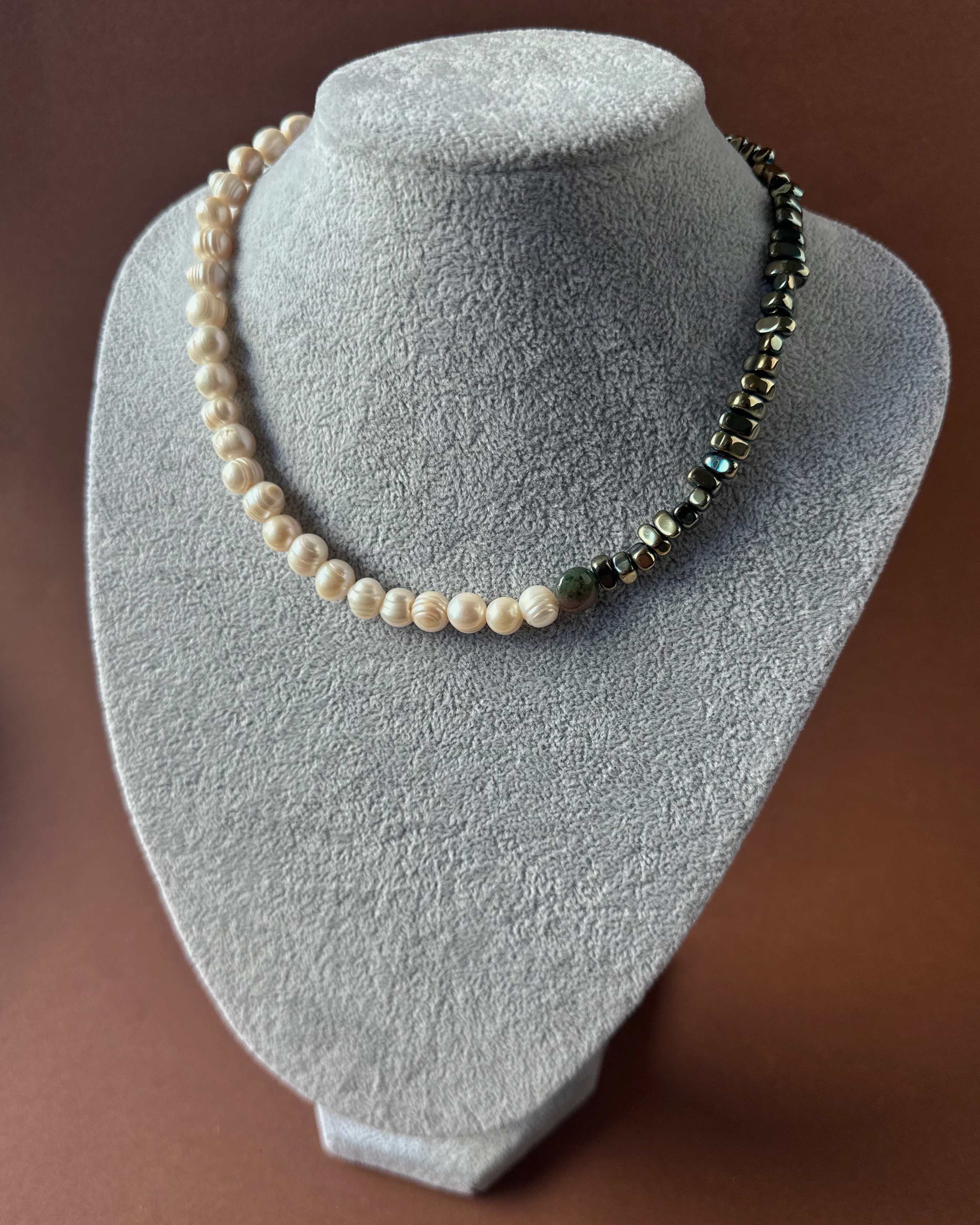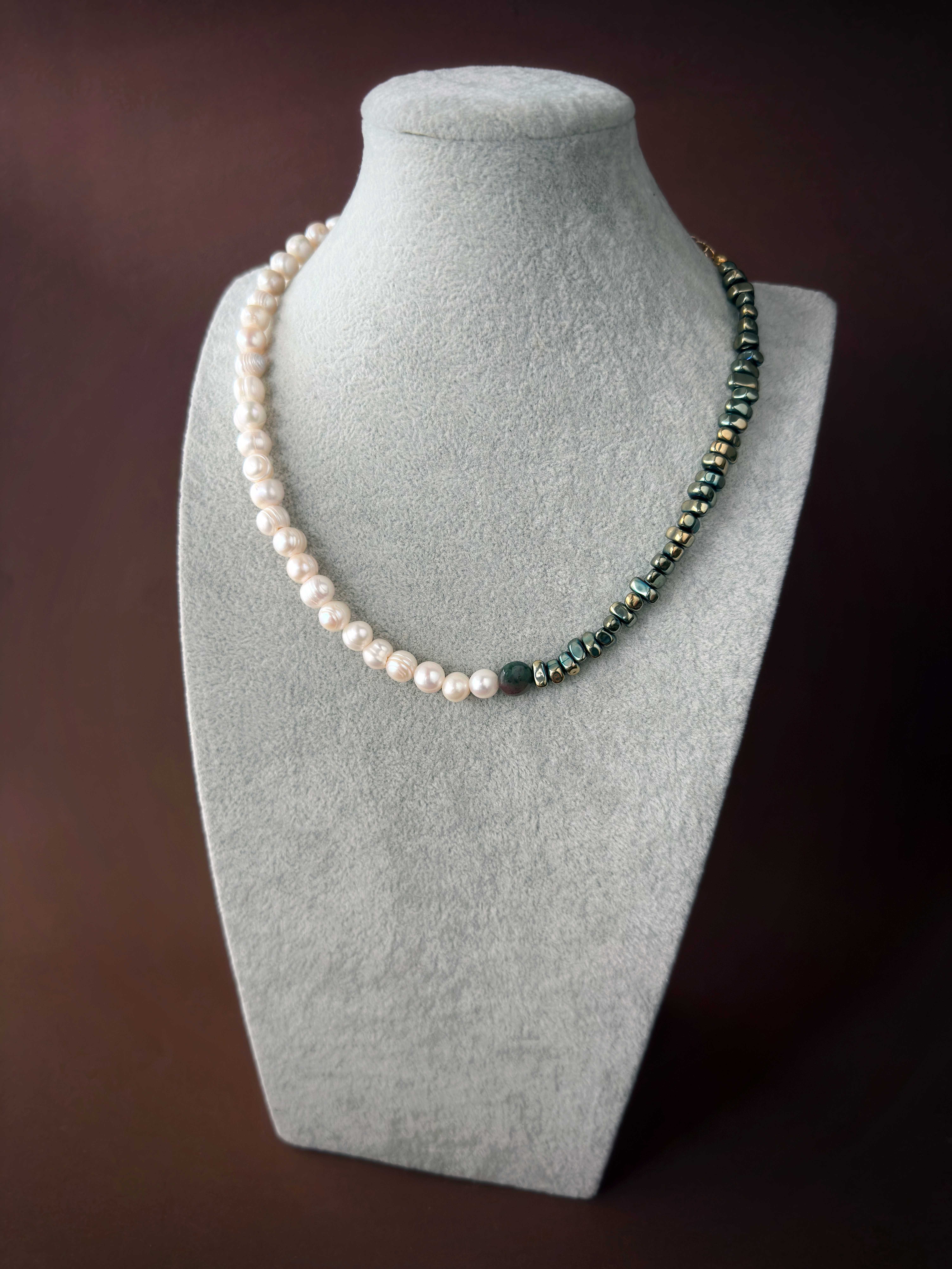 Ten model łączy klasyczną perłę słodkowodną z nowoczesną formą i ziemistą kolorystyką. Po jednej stronie znajdują się perły w kształcie ryżu, po drugiej gładkie bryłki hematytu o subtelnych, zielono - brązowych refleksach, które pięknie reagują na światło.