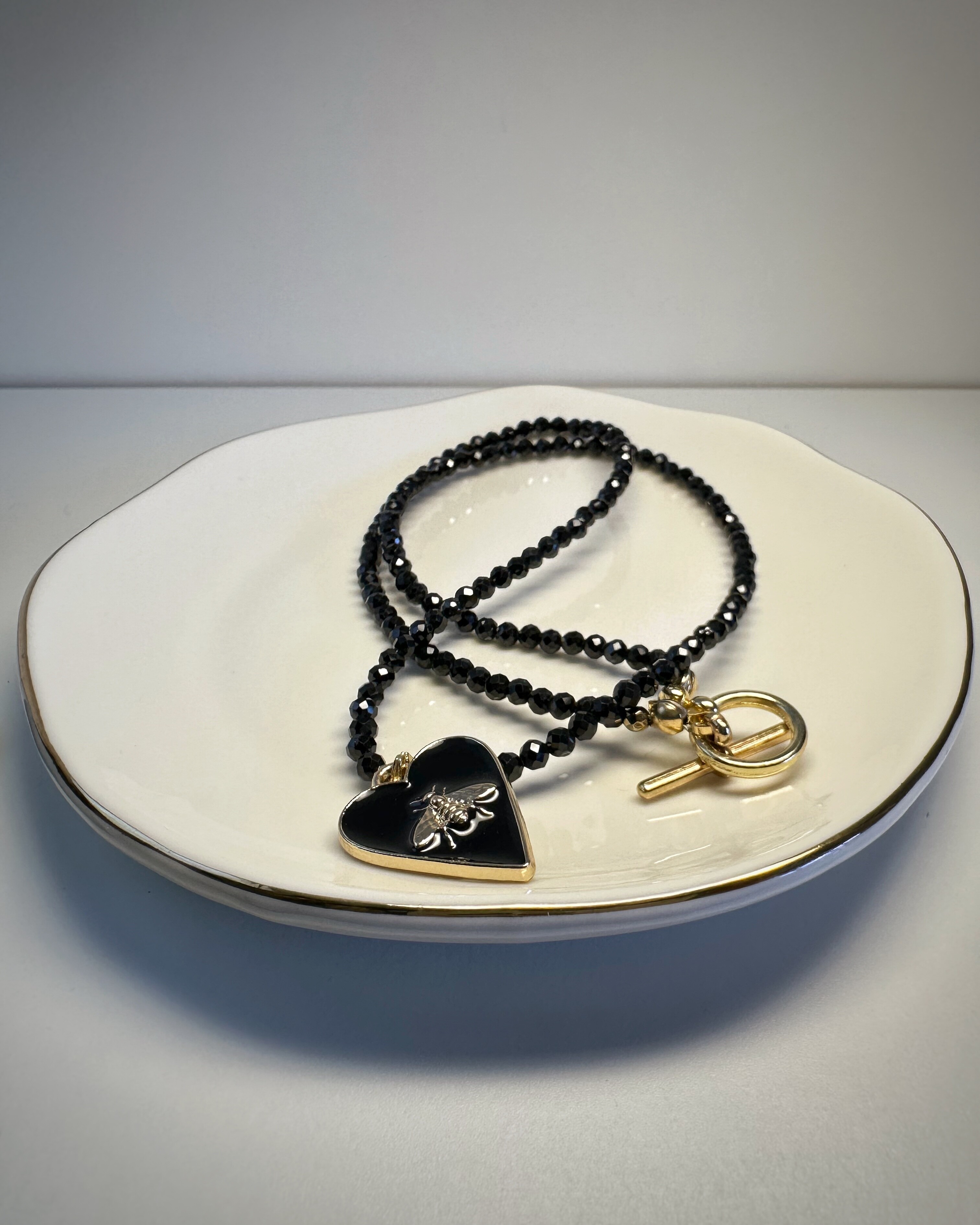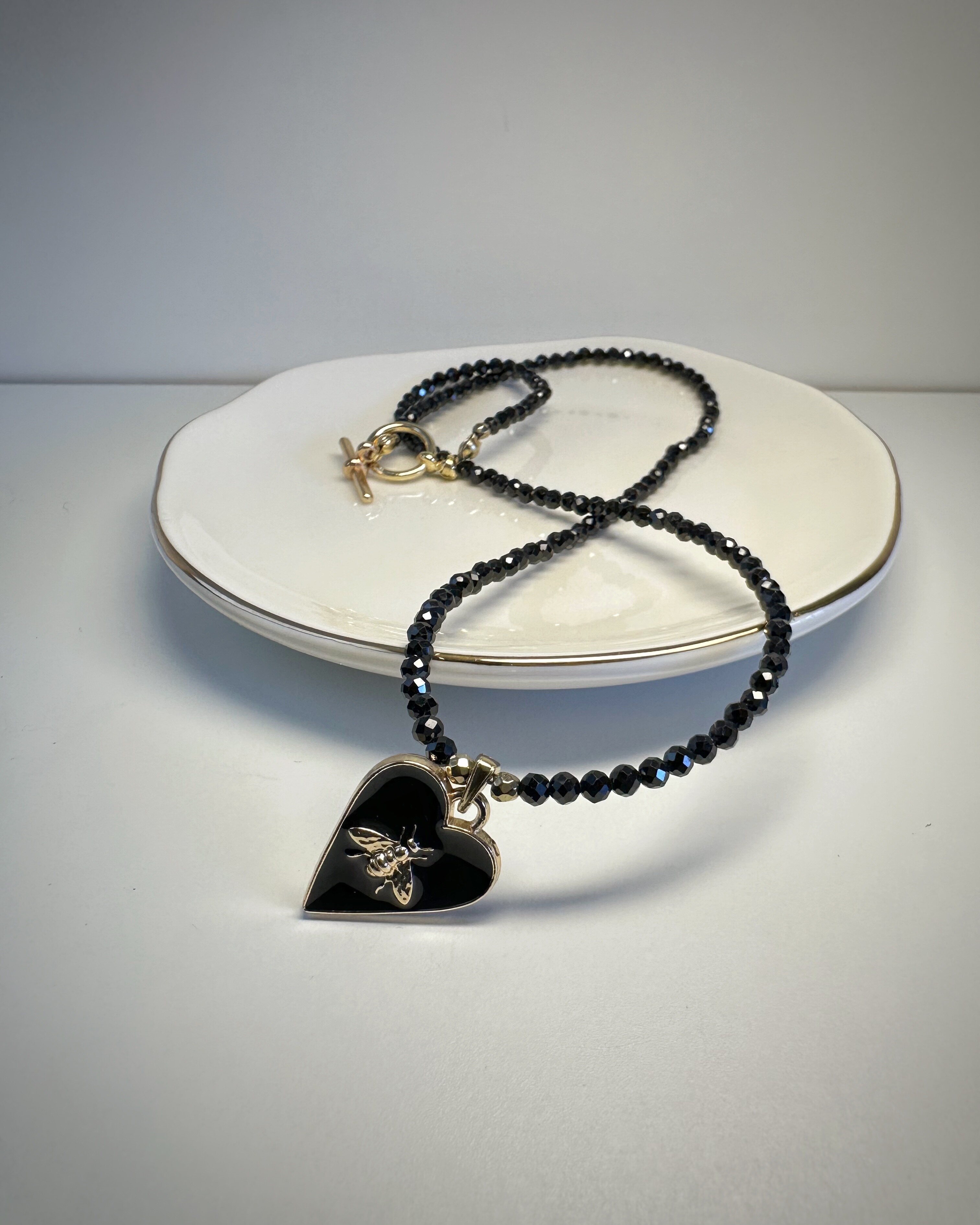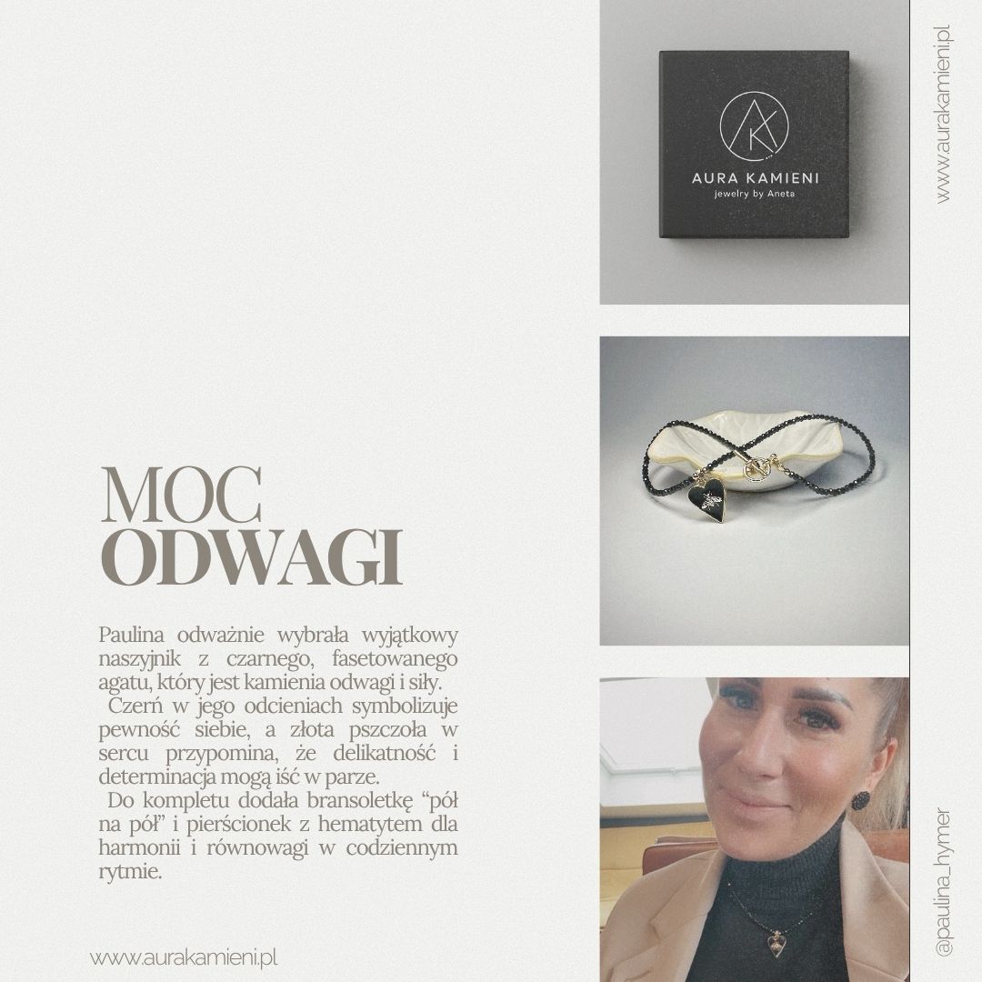 Ten naszyjnik to nowoczesna interpretacja klasyki. Czerń i złoto to połączenie, które nigdy nie wychodzi z mody. Lekko błyszczące kamienie pięknie układają się wokół szyi, a pszczoła – symbol pracowitości i odwagi – w sercu naszyjnika przypomina o wewnętrznej sile. Idealny do wieczorowych stylizacji, marynarki lub czarnej sukienki.