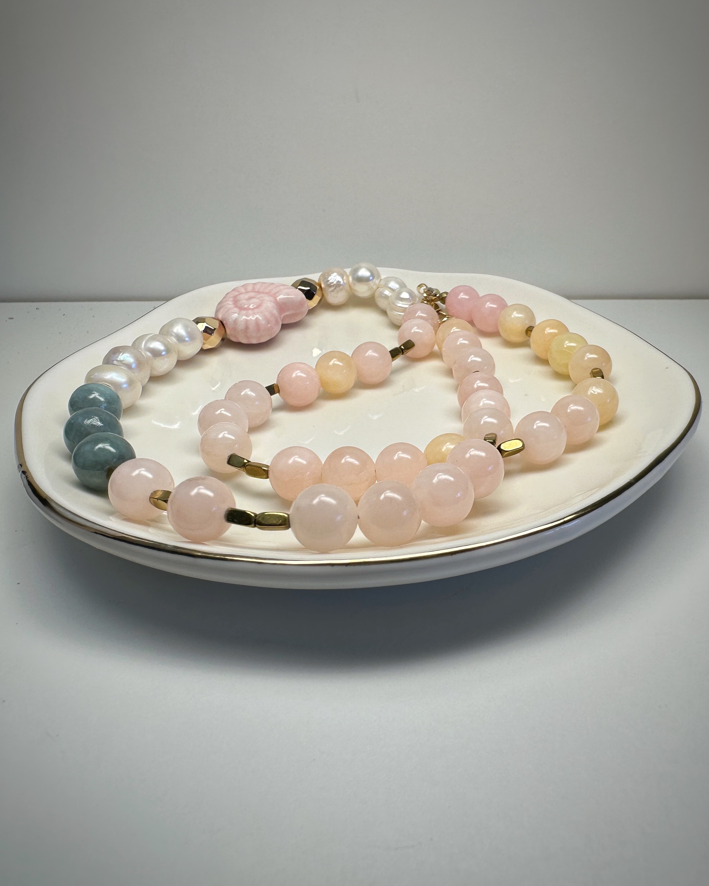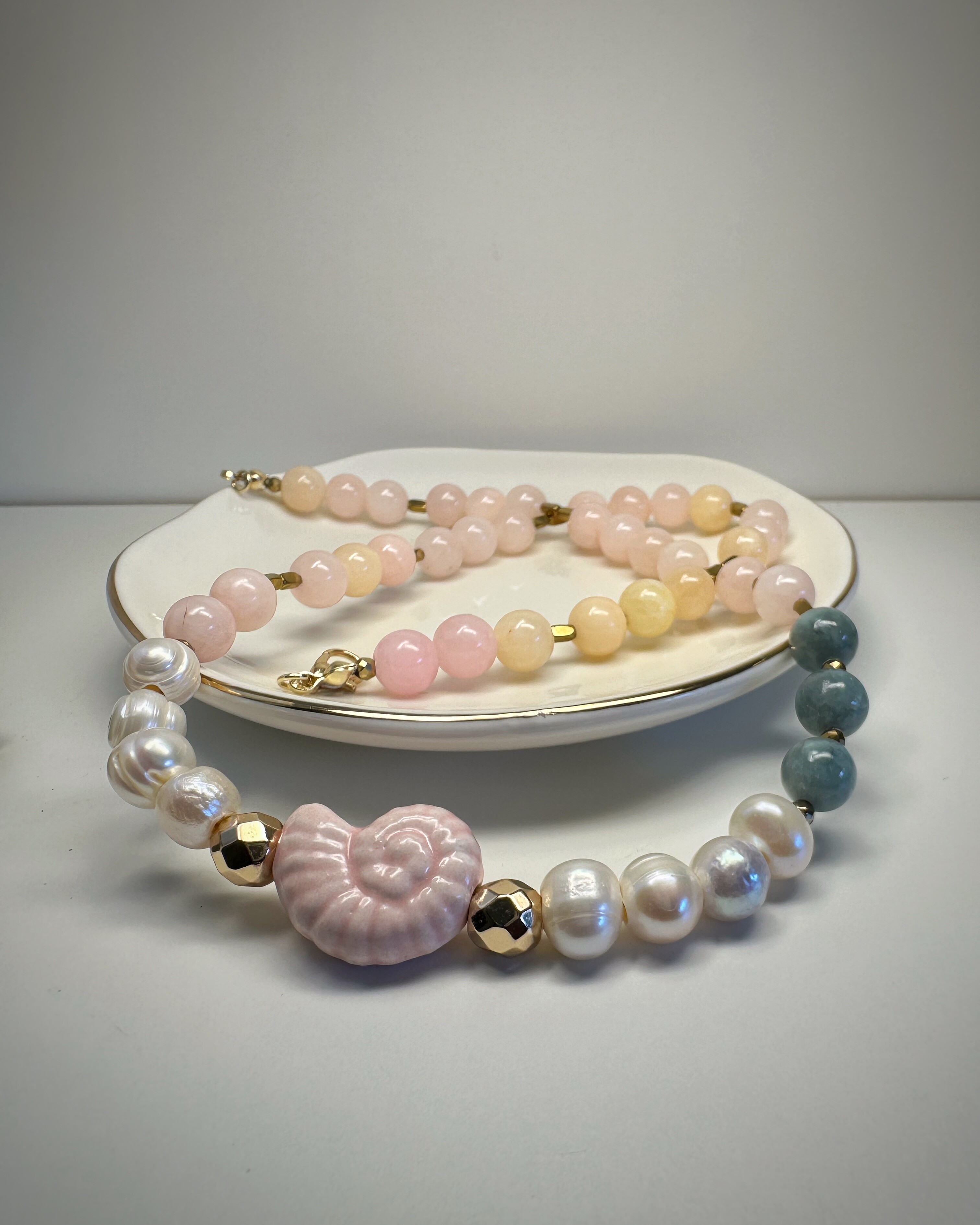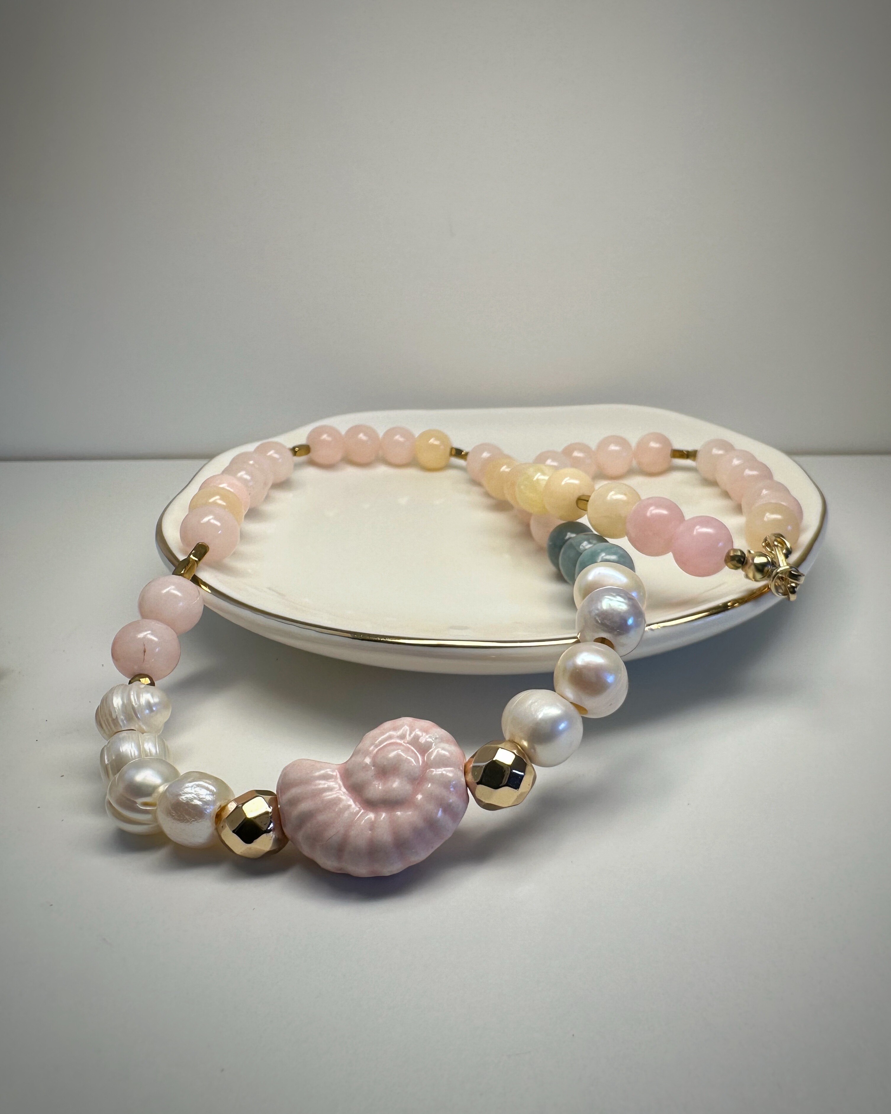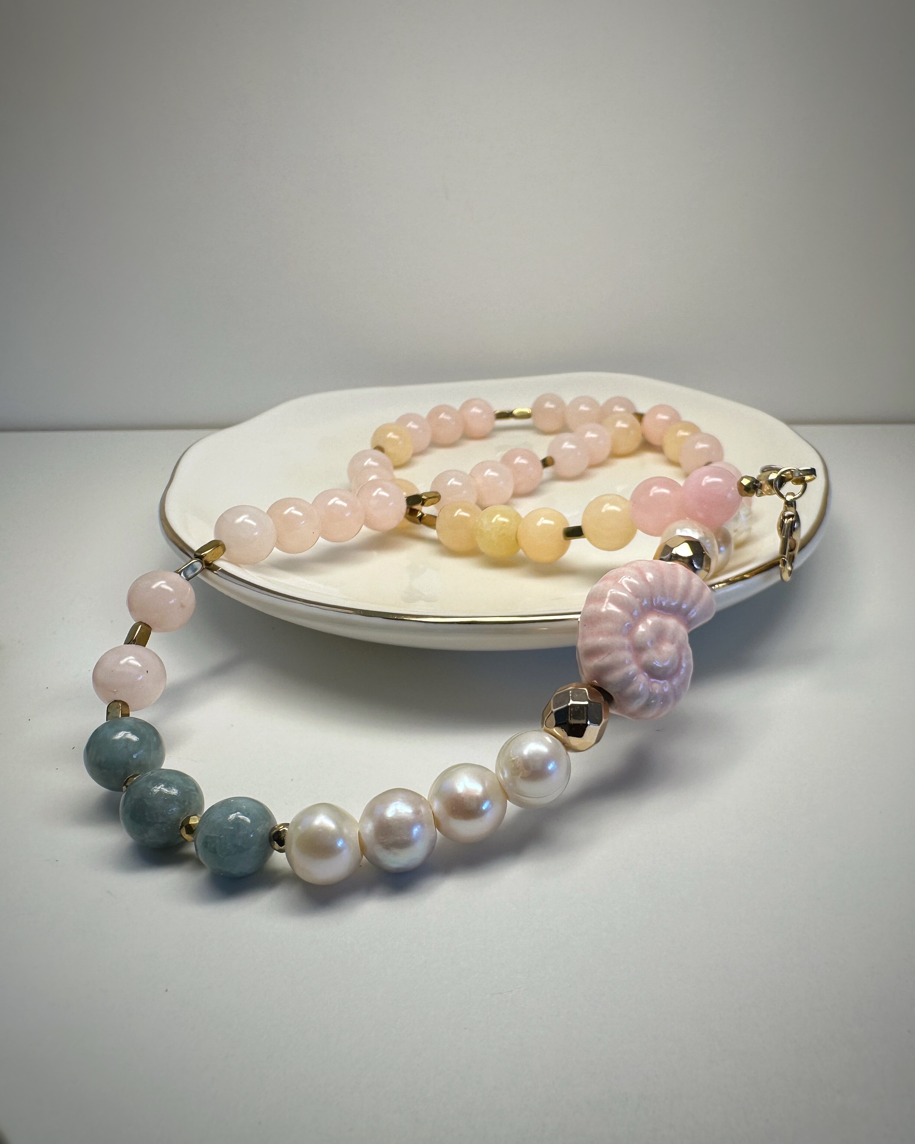 Zielony jadeit, pudrowy róż, złoty hematyt i subtelna perła spotykają się tutaj w harmonijnej kompozycji pełnej ciepła. Centralnym punktem naszyjnika jest wyjątkowy akcent – ceramiczna muszla w kolorze ślimaczej skorupki. Nie zwisa jak zawieszka, lecz naturalnie wtapia się w rytm koralików, stanowiąc jego biżuteryjne serce. To naszyjnik dla osób, które cenią sobie symbolikę natury i kobiecą subtelność.