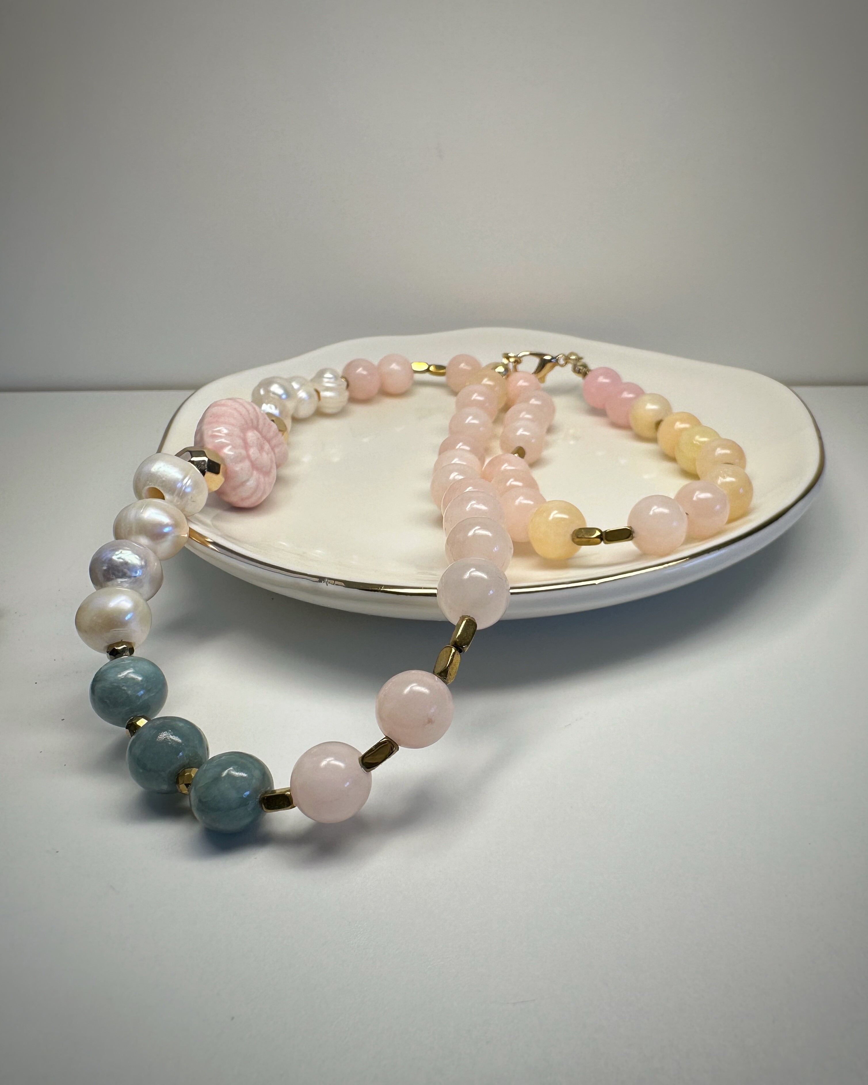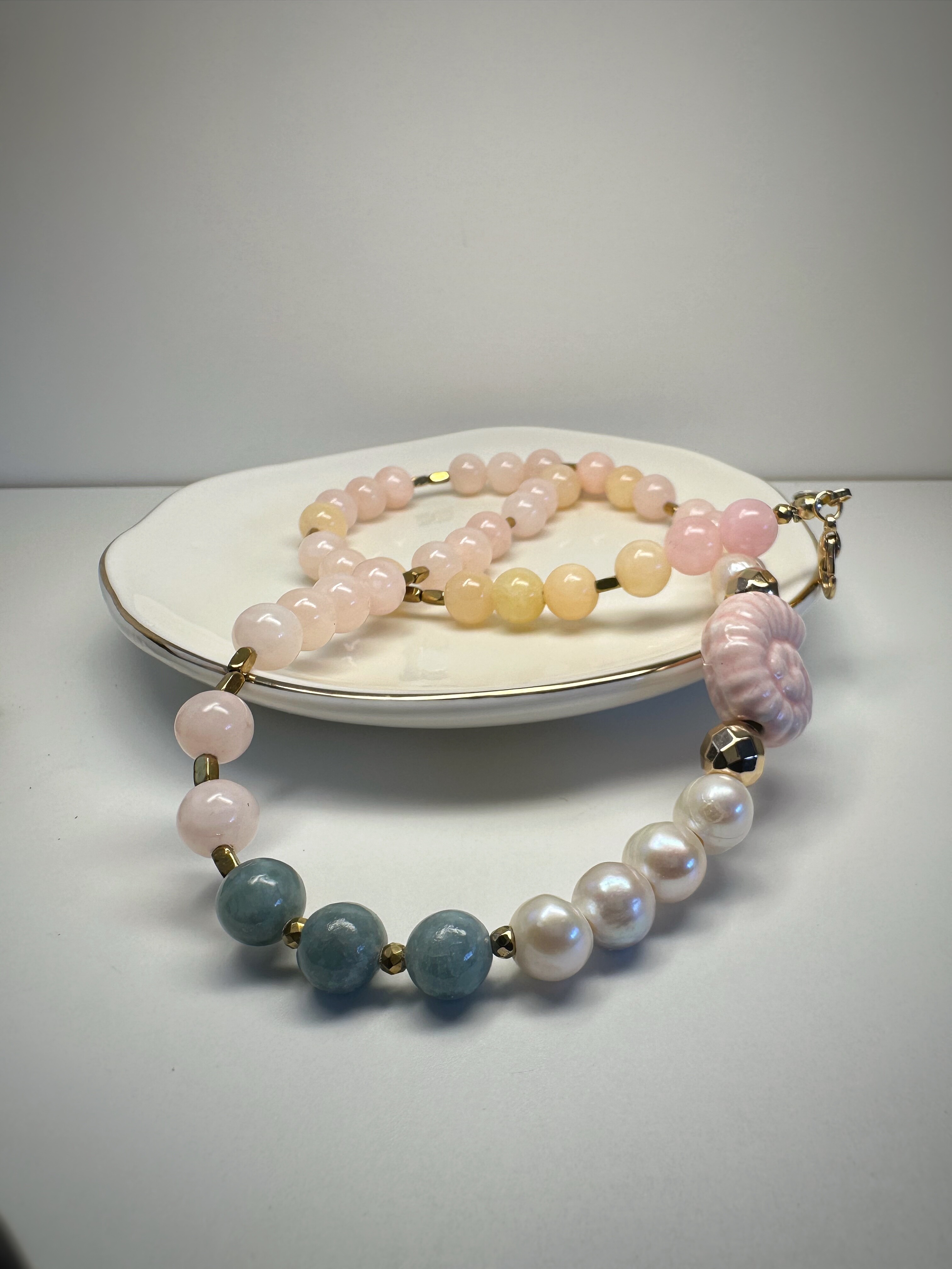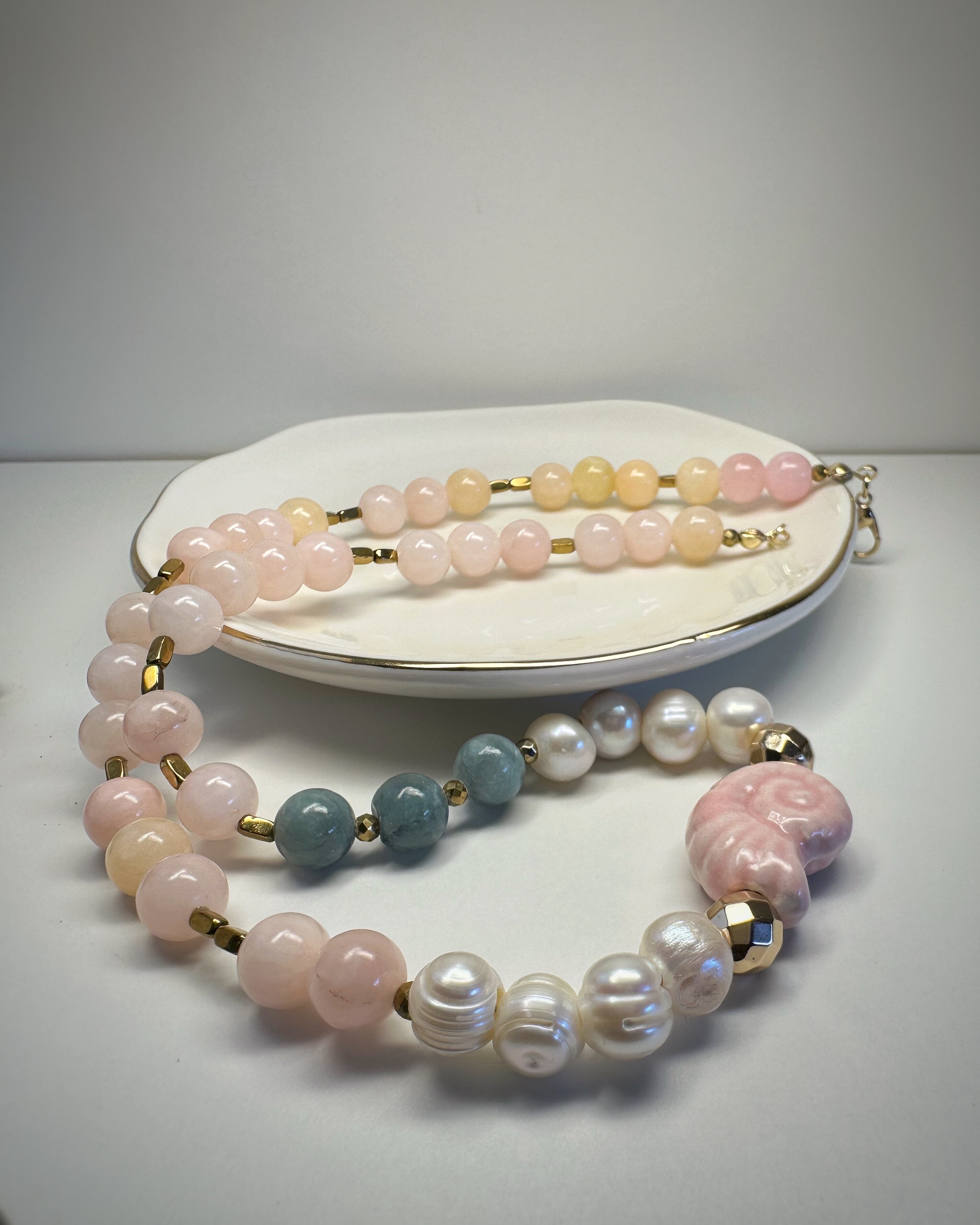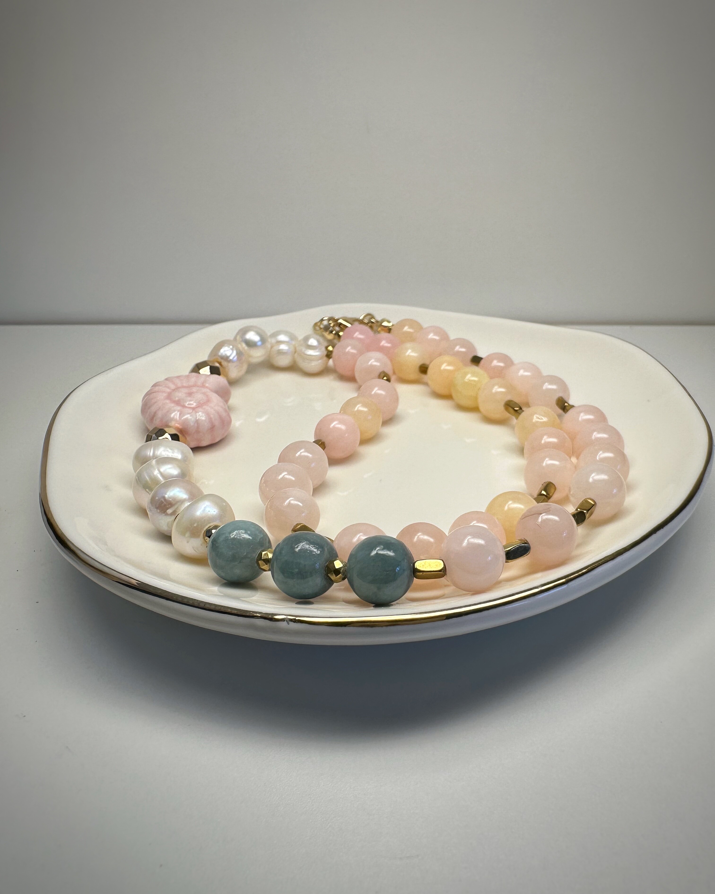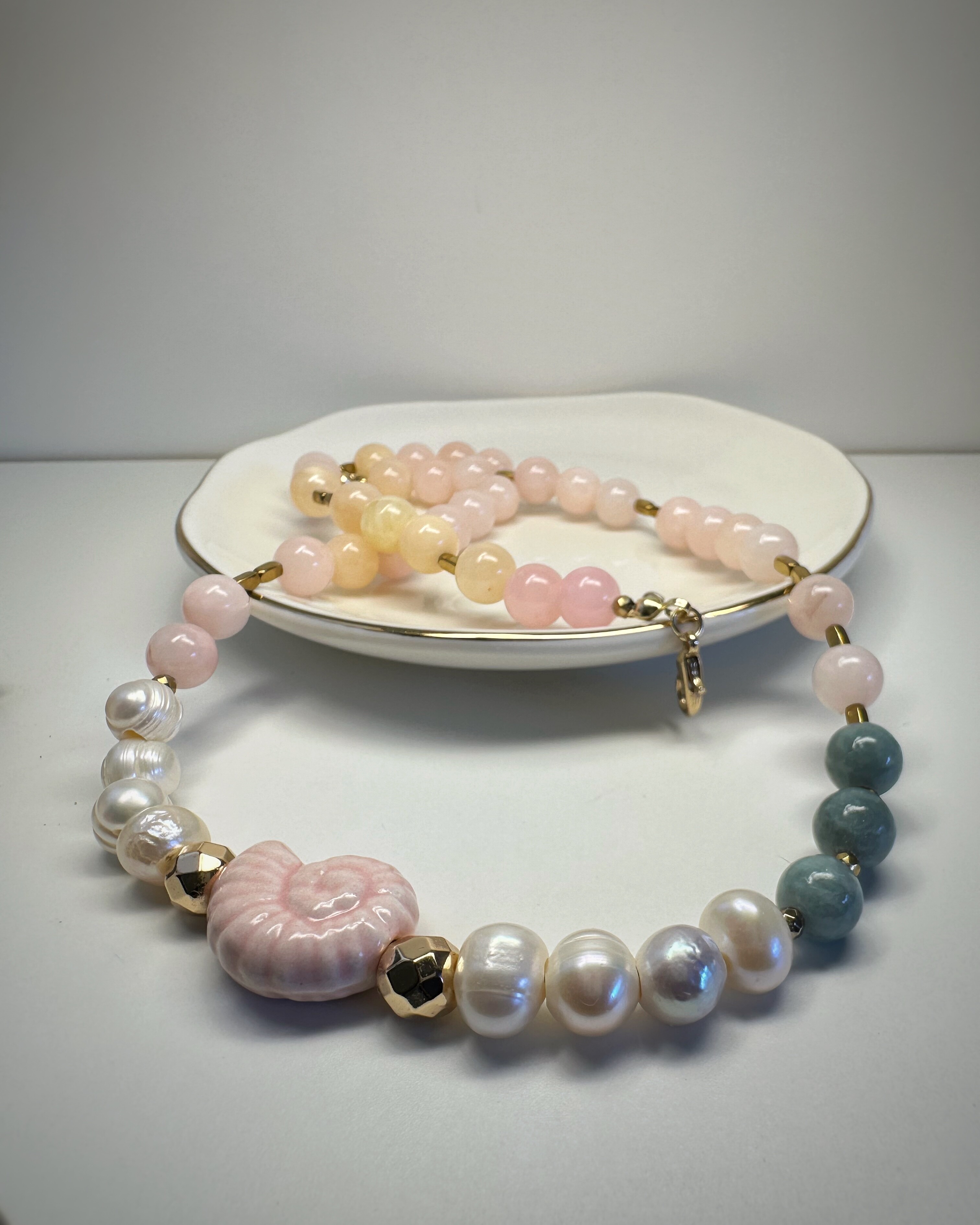 Zielony jadeit, pudrowy róż, złoty hematyt i subtelna perła spotykają się tutaj w harmonijnej kompozycji pełnej ciepła. Centralnym punktem naszyjnika jest wyjątkowy akcent – ceramiczna muszla w kolorze ślimaczej skorupki. Nie zwisa jak zawieszka, lecz naturalnie wtapia się w rytm koralików, stanowiąc jego biżuteryjne serce. To naszyjnik dla osób, które cenią sobie symbolikę natury i kobiecą subtelność.