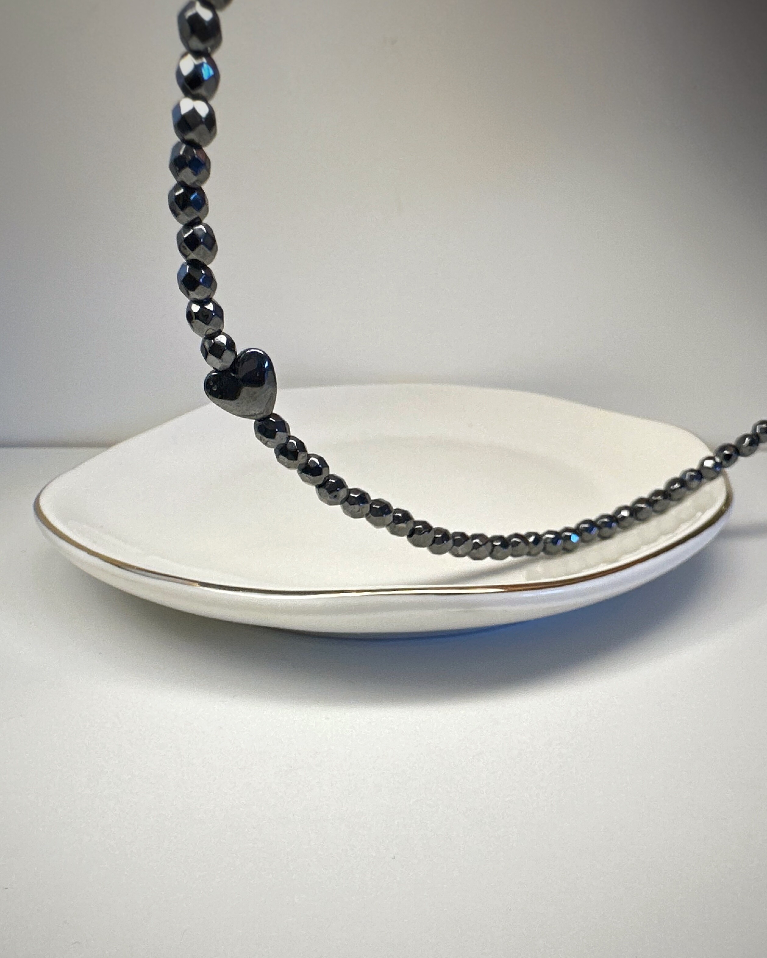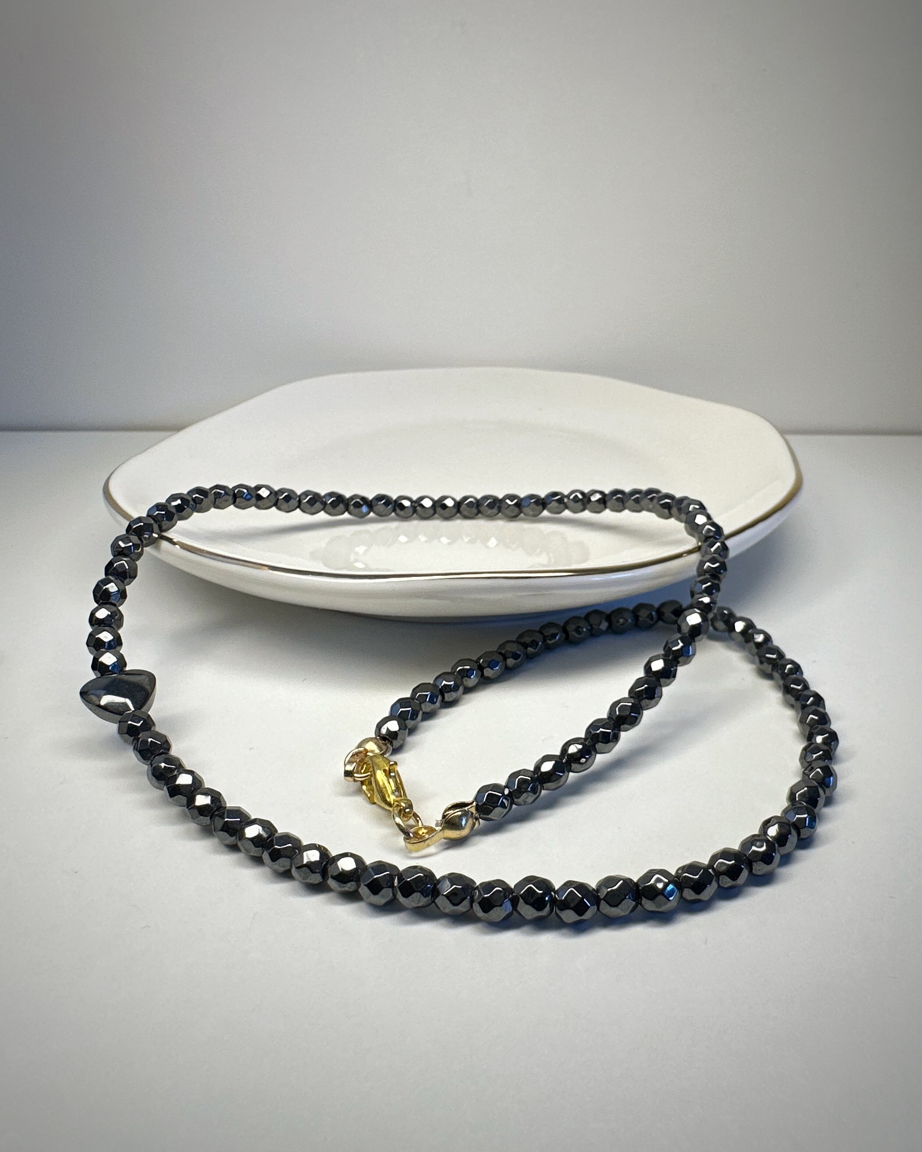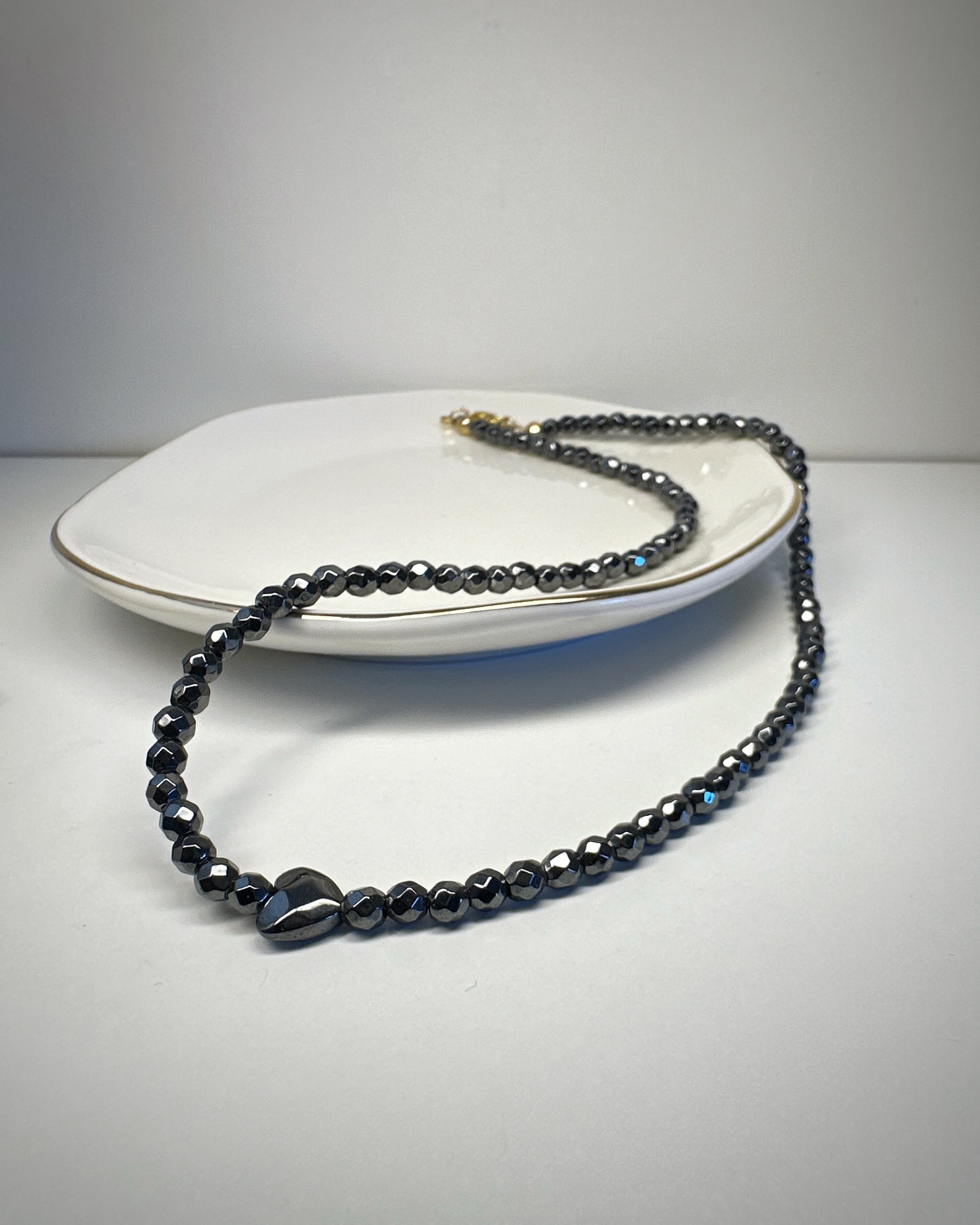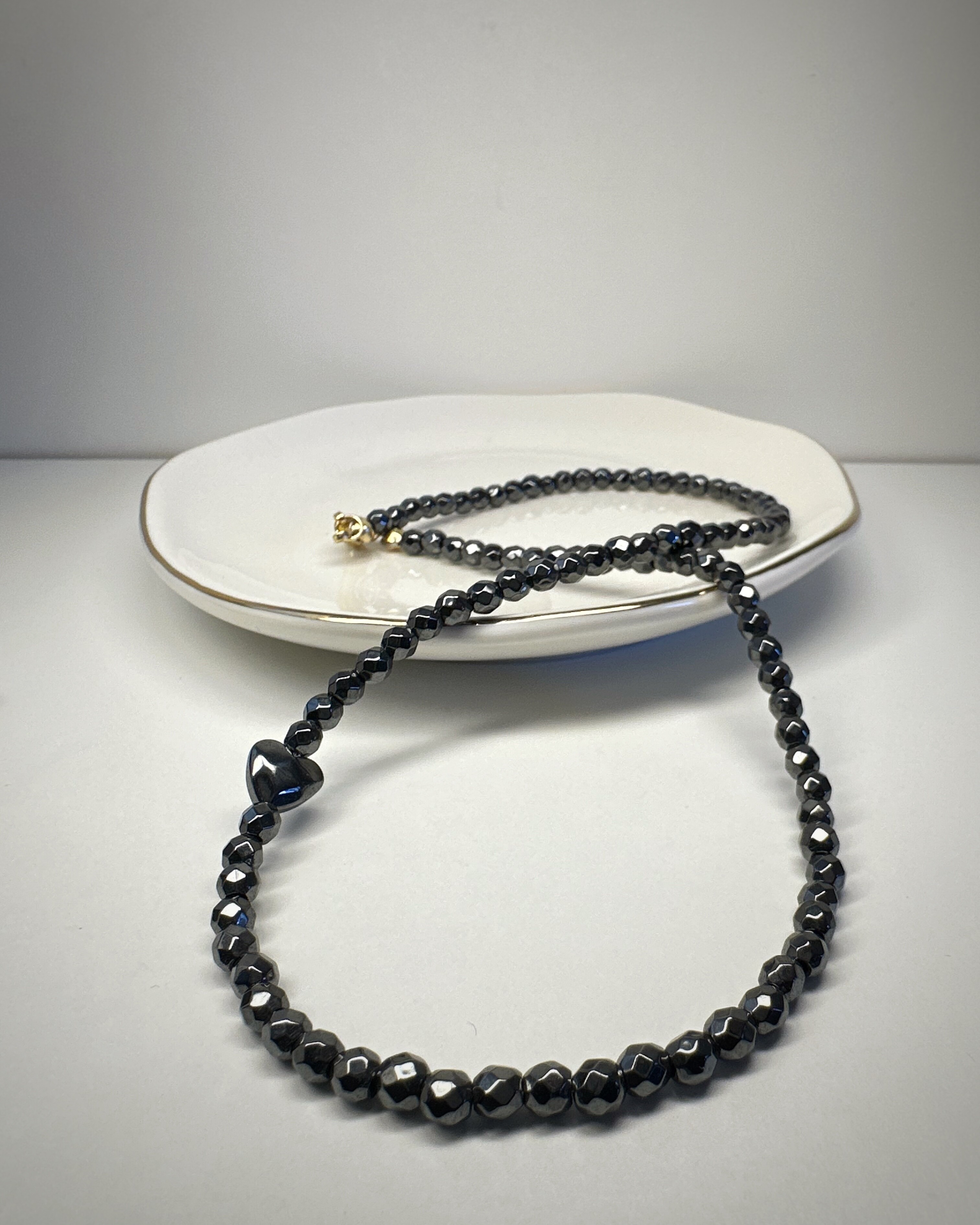 Hematytka Kochana, to naszyjnik stworzony z fasetowanych bryłek hematytu, które subtelnie lśnią przy każdym ruchu. Ich chłodny połysk tworzy aurę spokoju, elegancji i wewnętrznej mocy.W centrum: niewielkie serduszko z tego samego kamienia – symboliczne, ale nienachalne. To biżuteria dla kobiet, które znają swoją wartość, ale nie muszą jej krzyczeć. Dla tych, które rządzą... ale robią to z uśmiechem. Idealny do noszenia solo lub jako część wielowarstwowych stylizacji – „Hematytka Kochana” zawsze dopowie to, czego nie trzeba mówić głośno.