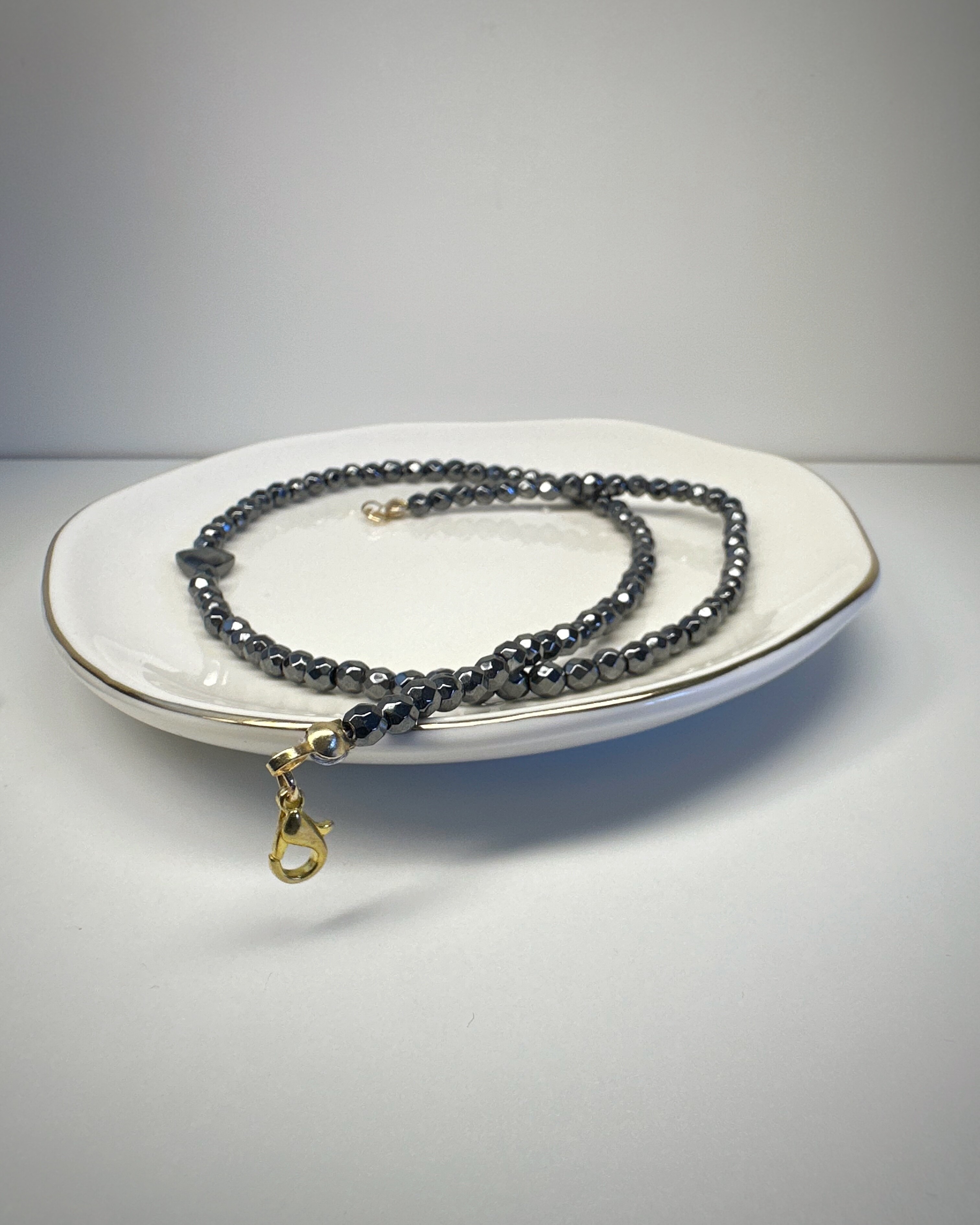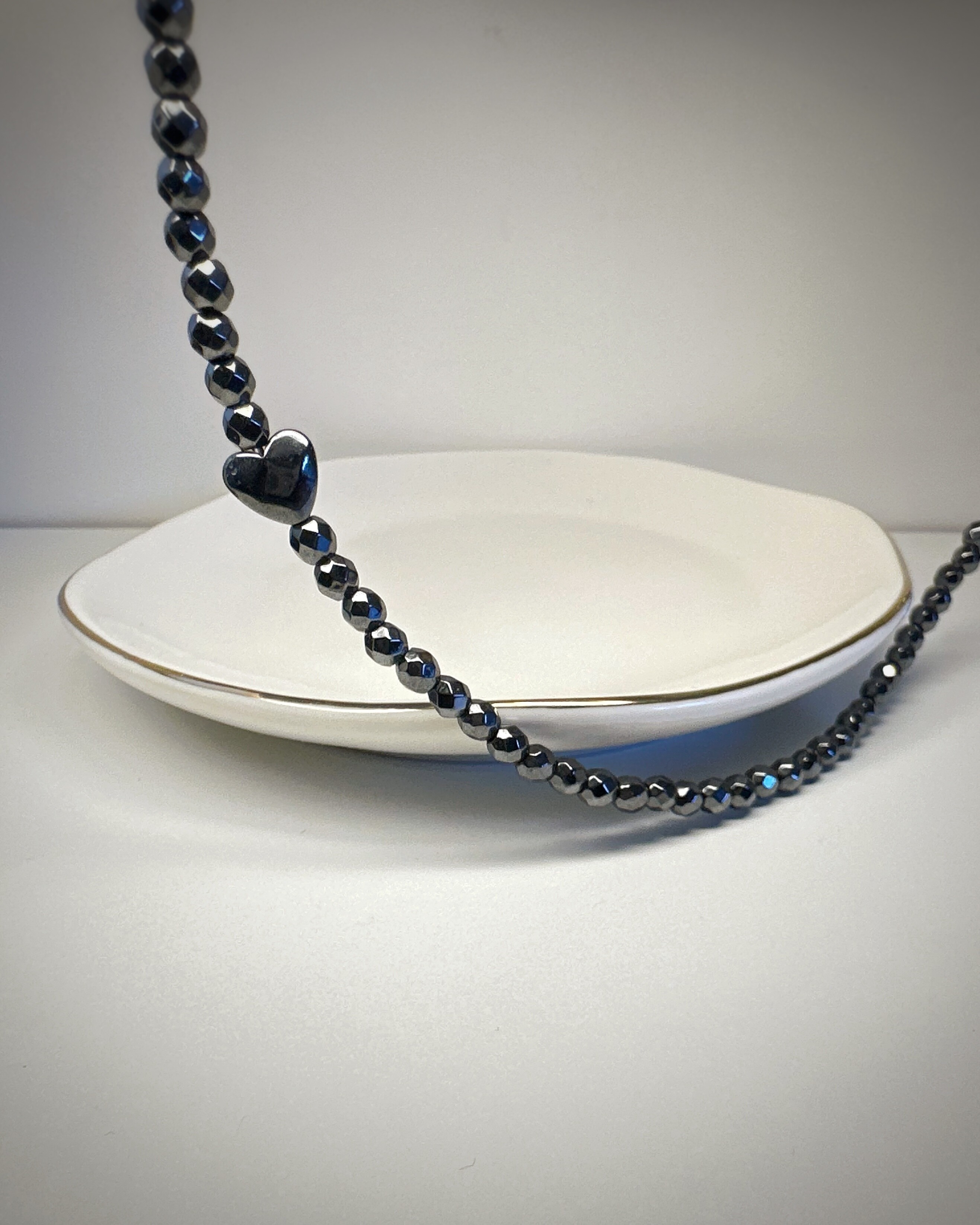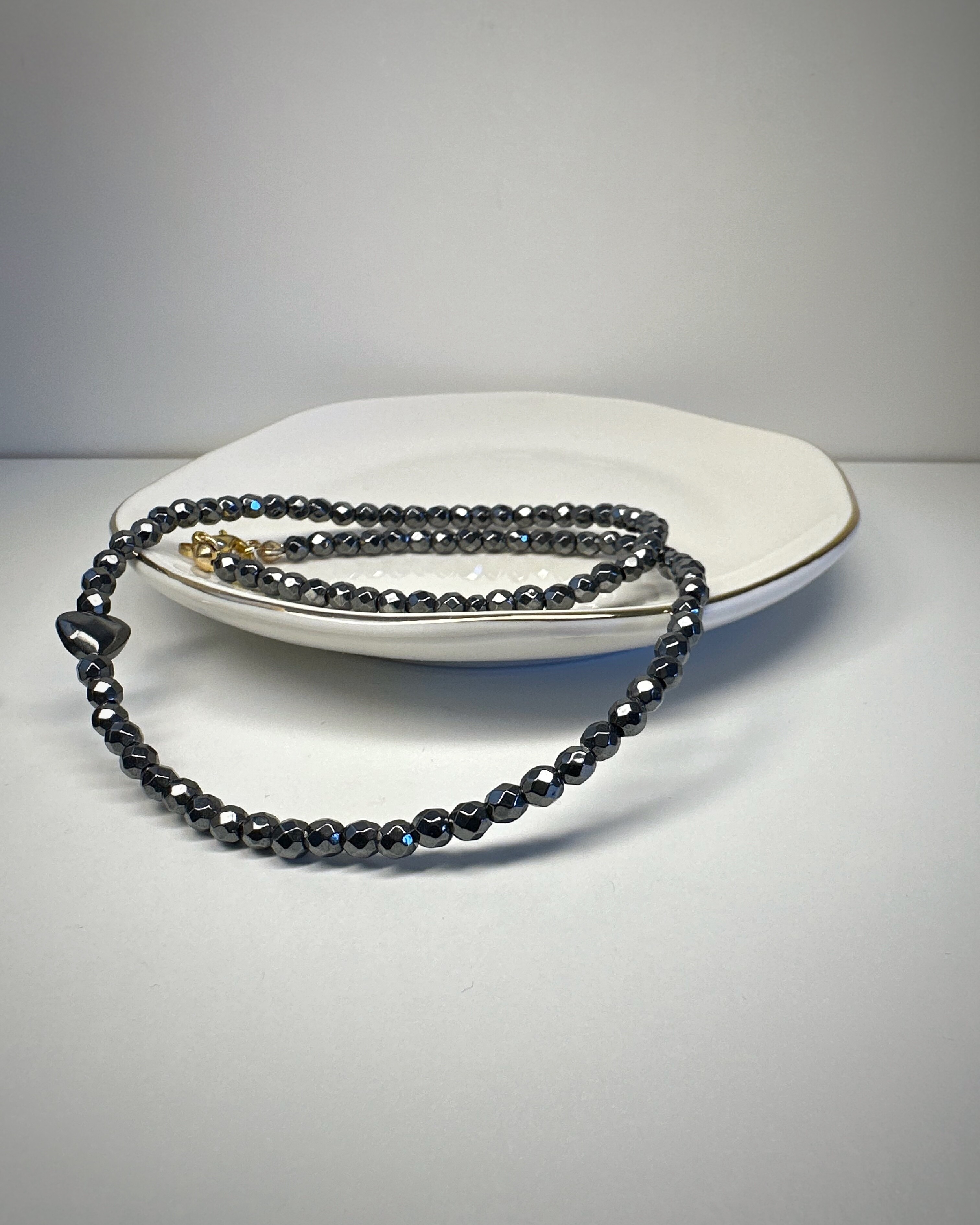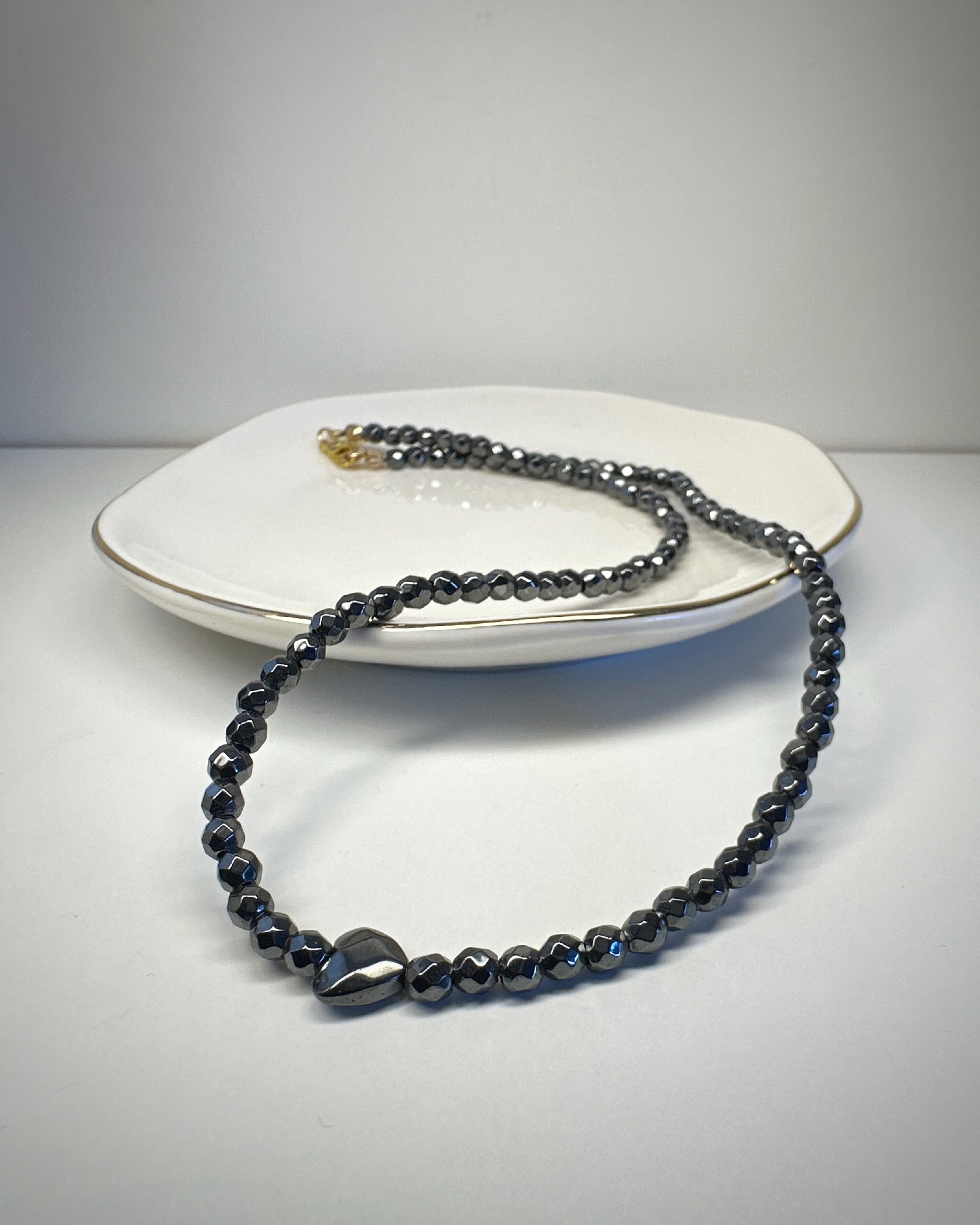 Hematytka Kochana, to naszyjnik stworzony z fasetowanych bryłek hematytu, które subtelnie lśnią przy każdym ruchu. Ich chłodny połysk tworzy aurę spokoju, elegancji i wewnętrznej mocy.W centrum: niewielkie serduszko z tego samego kamienia – symboliczne, ale nienachalne. To biżuteria dla kobiet, które znają swoją wartość, ale nie muszą jej krzyczeć. Dla tych, które rządzą... ale robią to z uśmiechem. Idealny do noszenia solo lub jako część wielowarstwowych stylizacji – „Hematytka Kochana” zawsze dopowie to, czego nie trzeba mówić głośno.