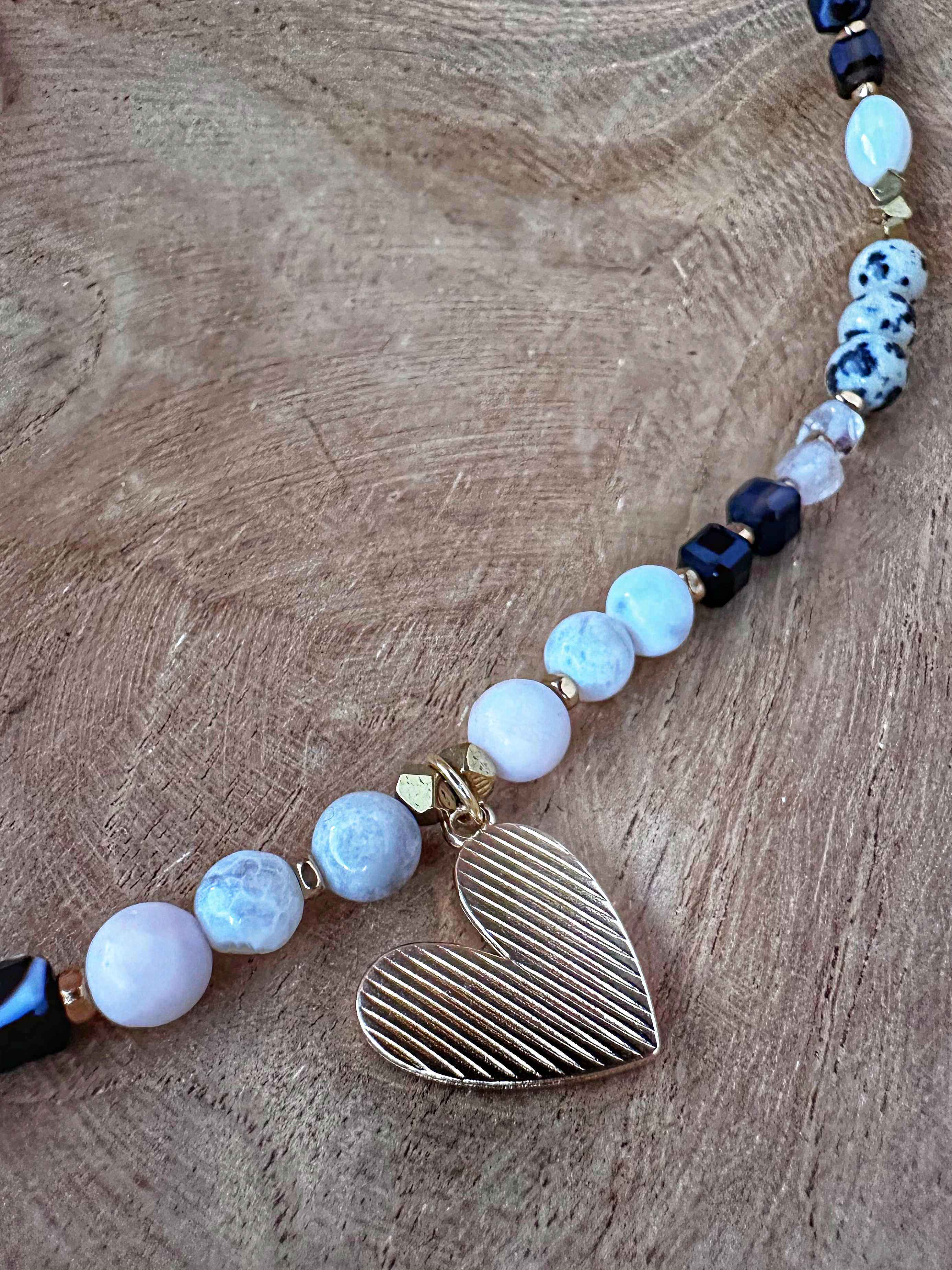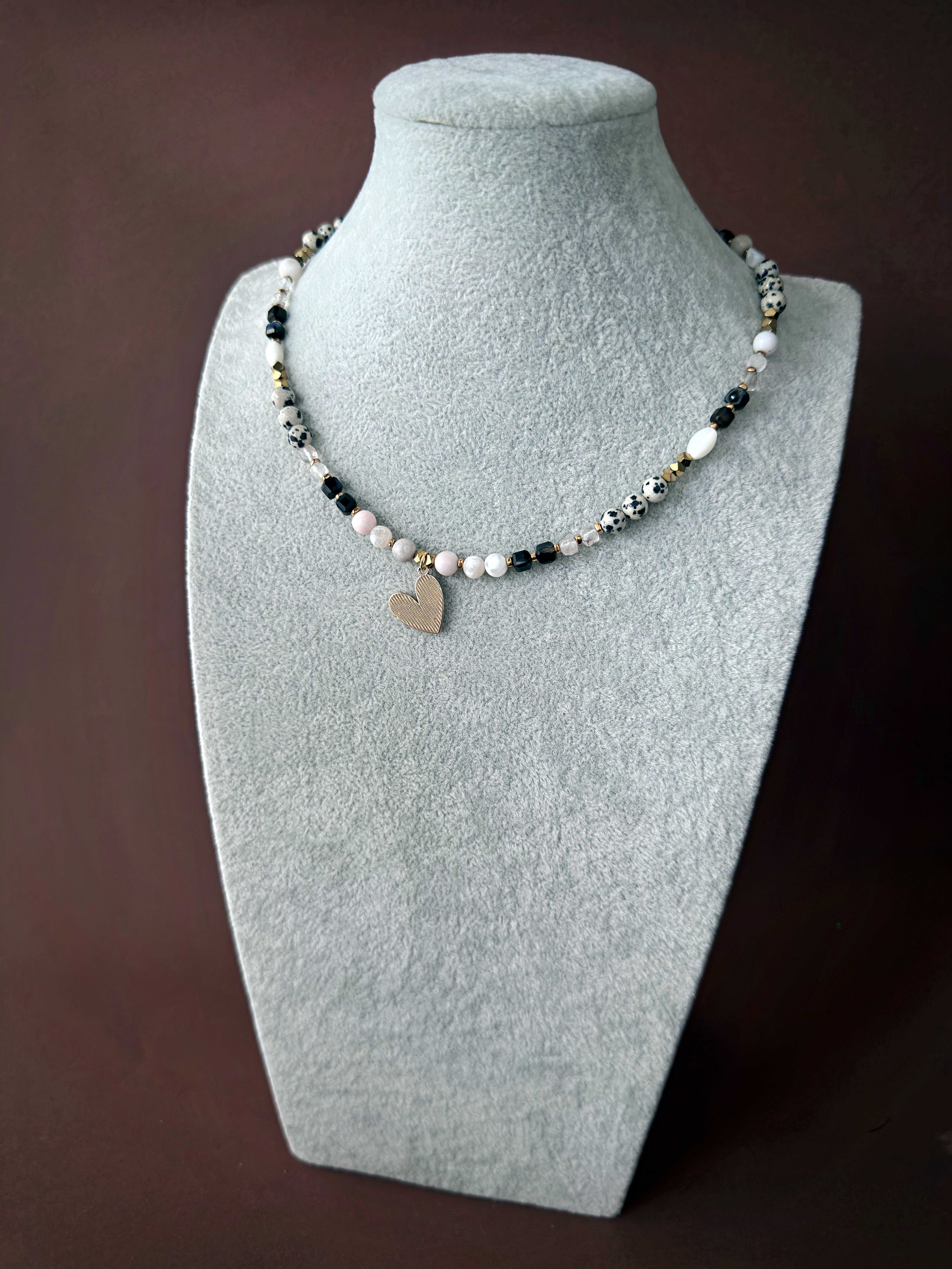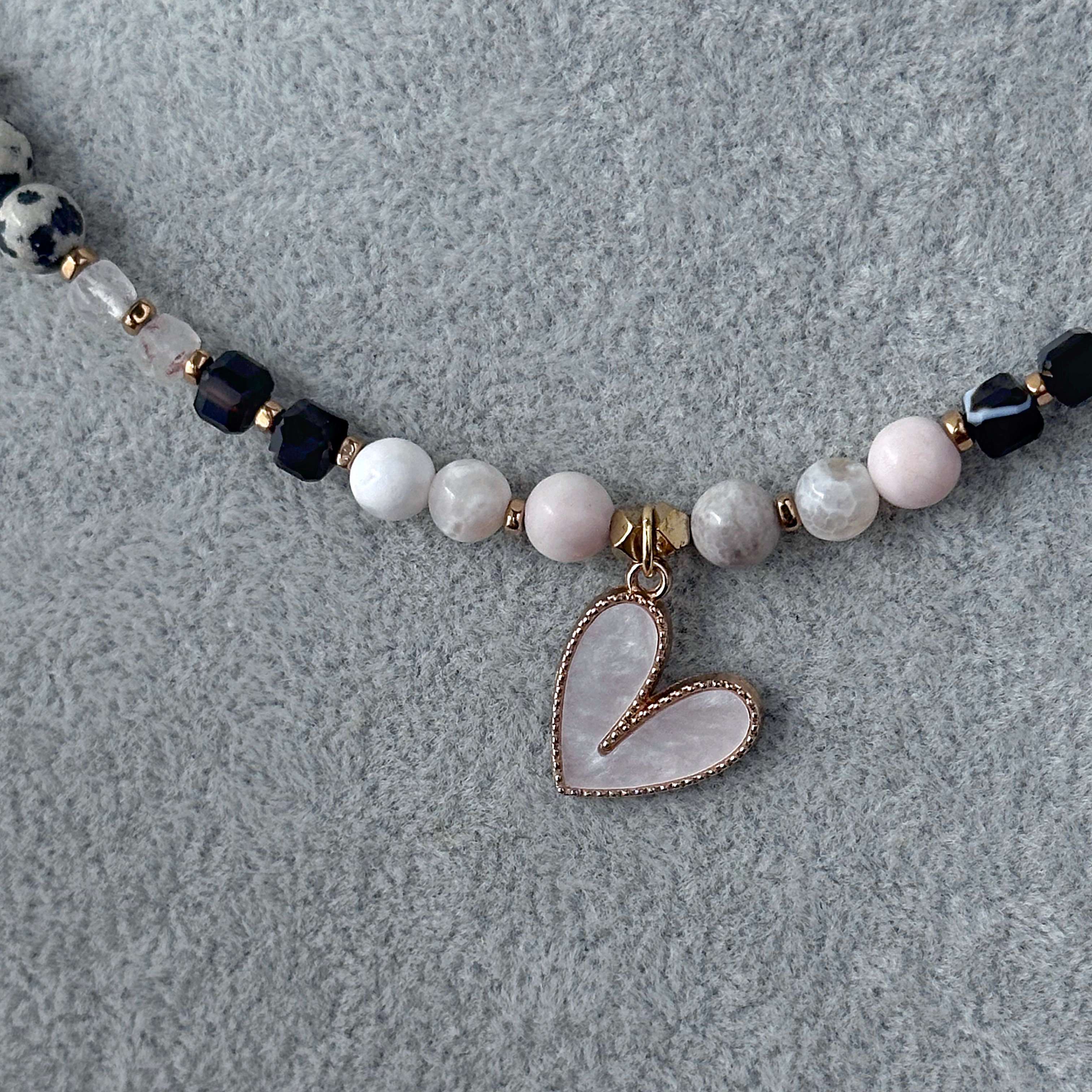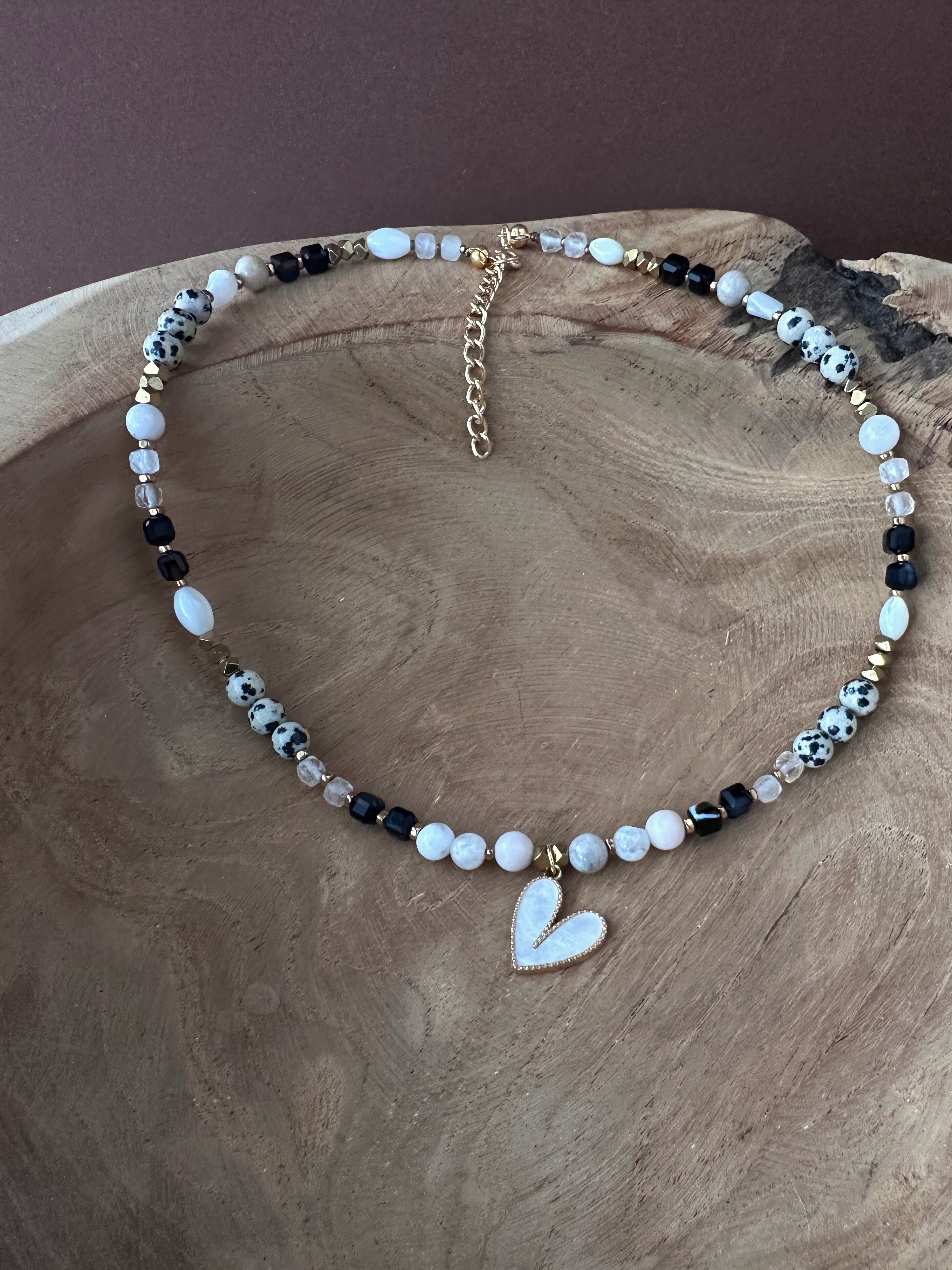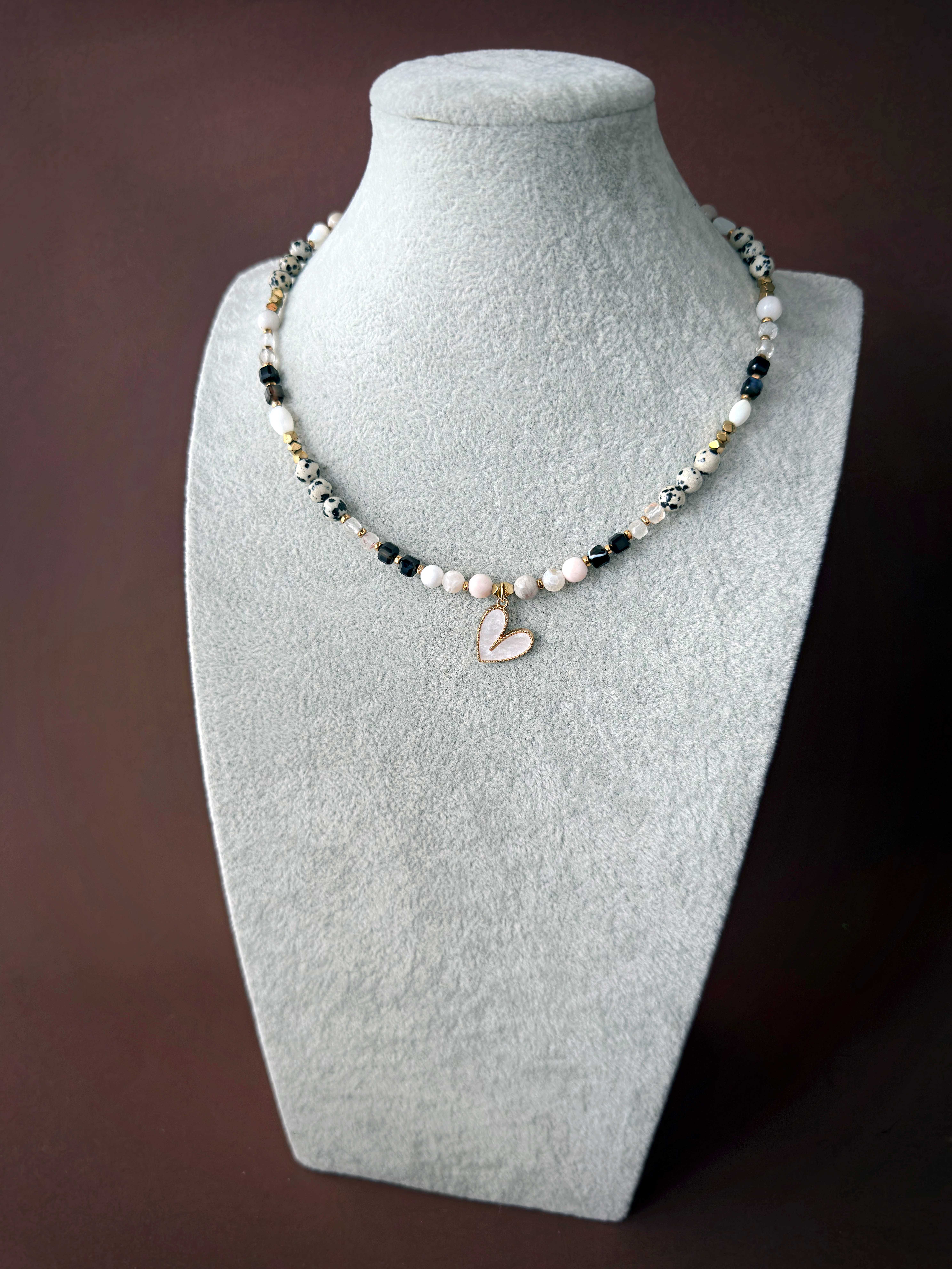 Centralnym elementem jest serce pokryte masą perłową w złotej oprawie. Zawieszka jest dwustronna - z jednej strony perłowa biel, z drugiej złota powierzchnia z prążkowaną fakturą. Naszyjnik można stylizować na wiele sposobów, dopasowując go do nastroju i stylu.