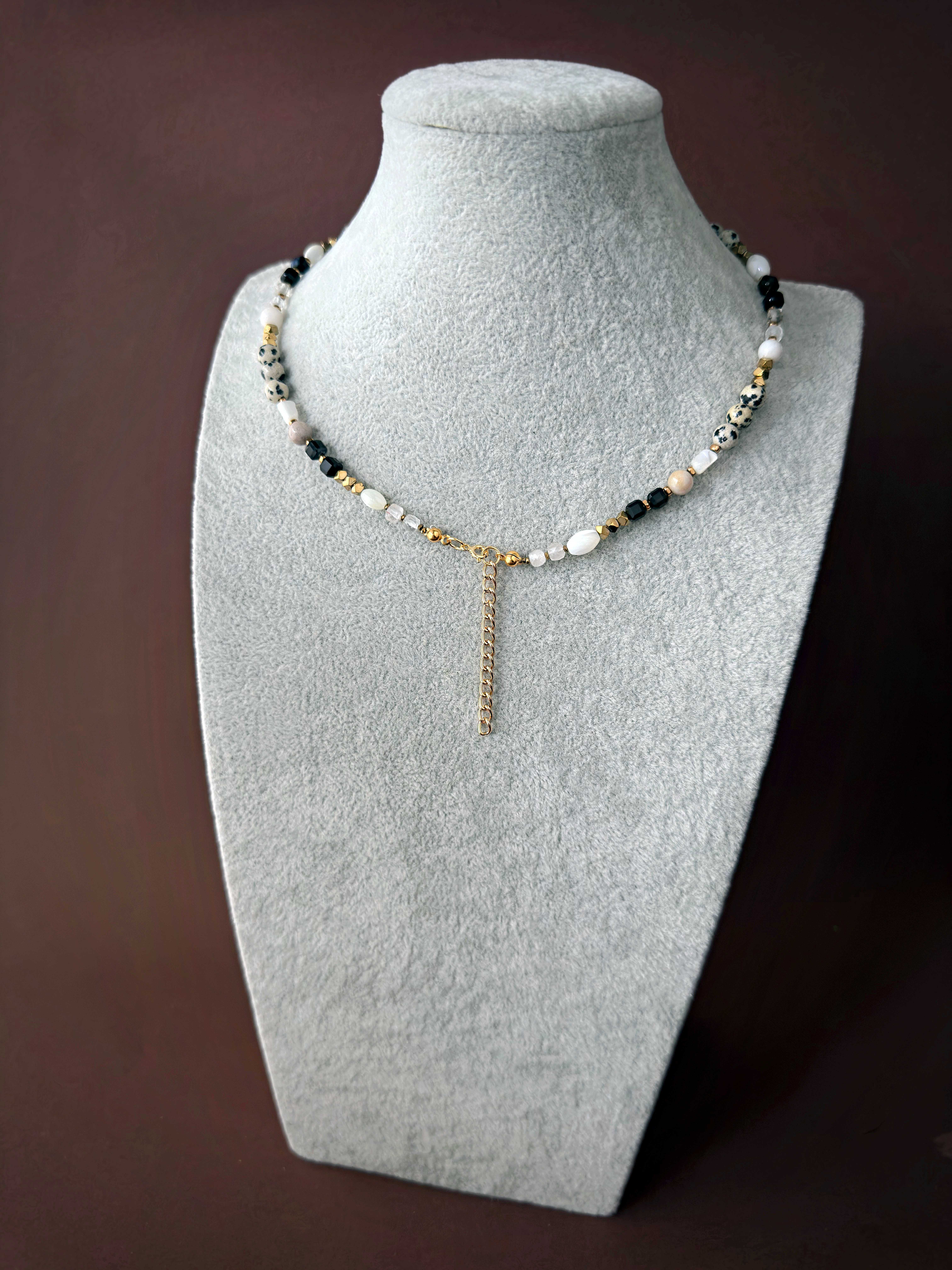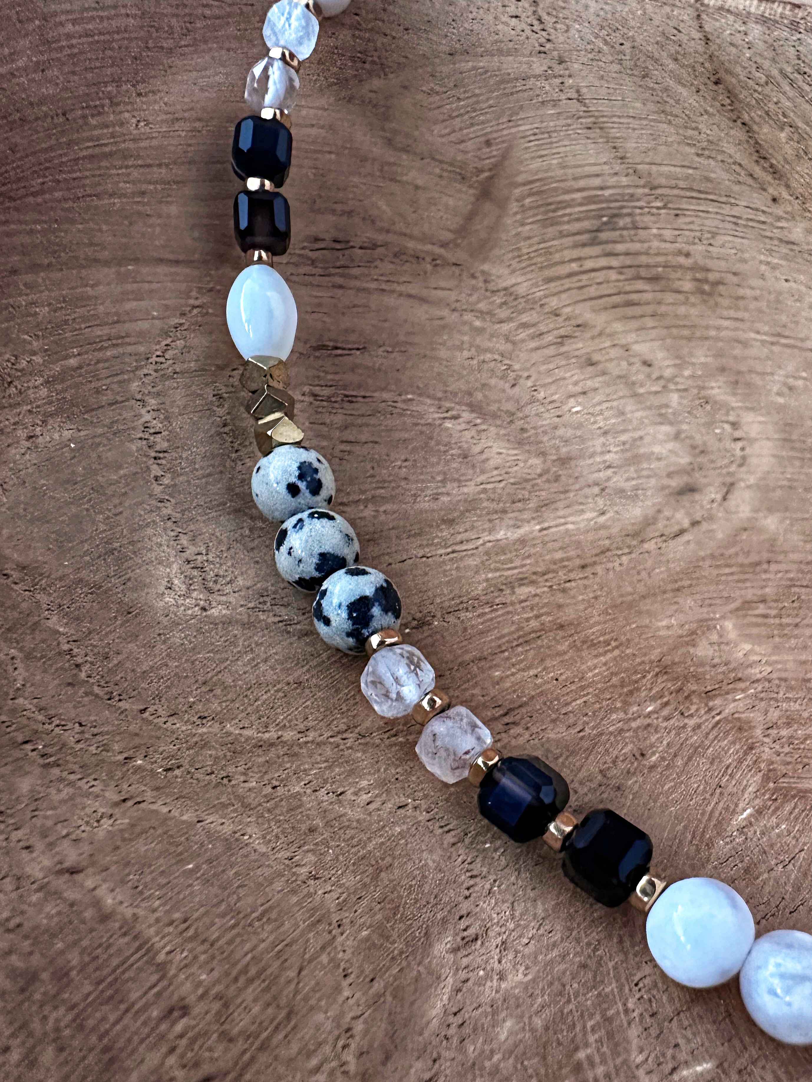 Ten naszyjnik to esencja kolekcji Spotlight ze względu na różnorodność, faktury i kolory natury połączone w harmonijną całość. Czarne, fasetowane agaty, mleczne białe kule agatu, kwarce i złote bryłki hematytu przeplatają się z wyrazistością jaspisu dalmatyńskiego.