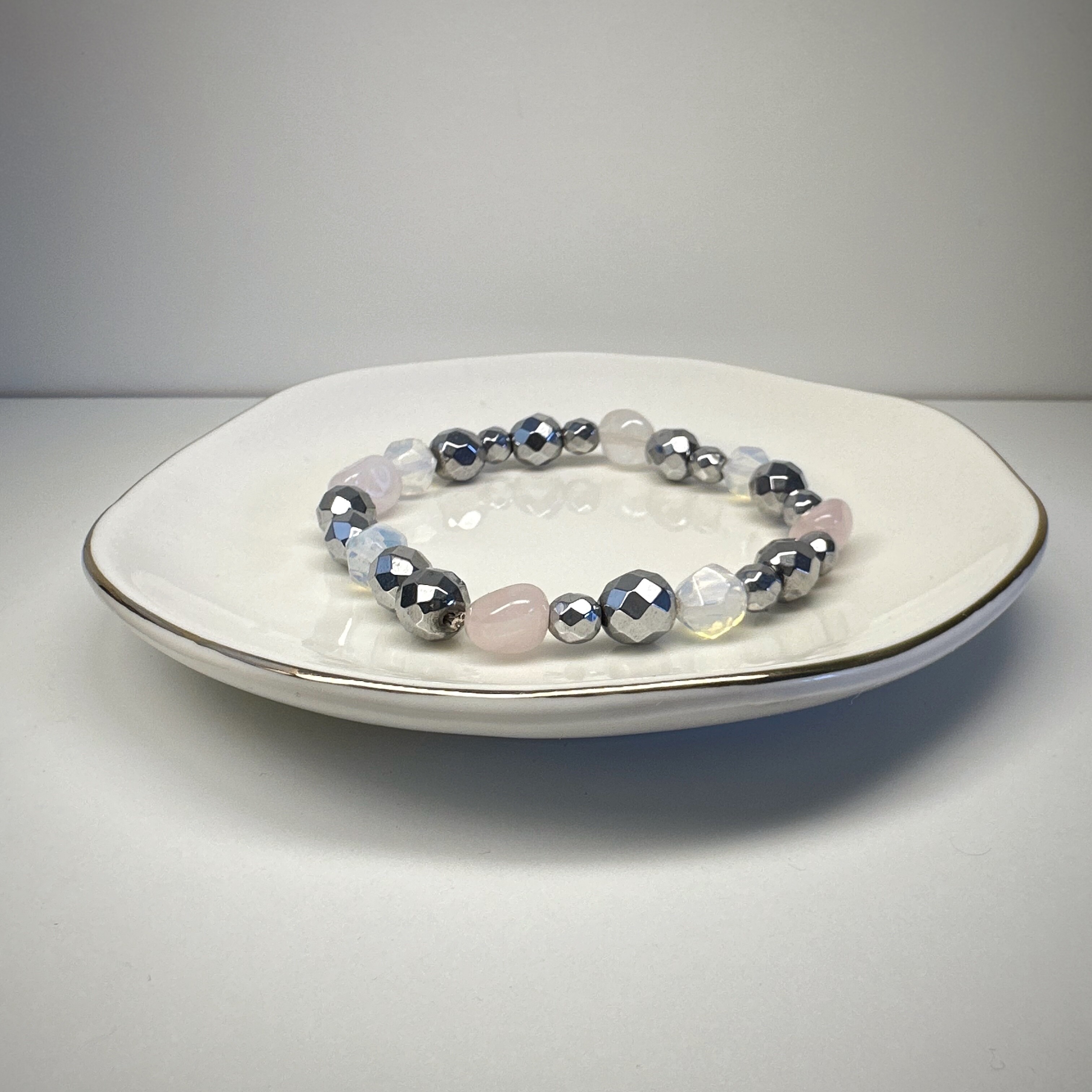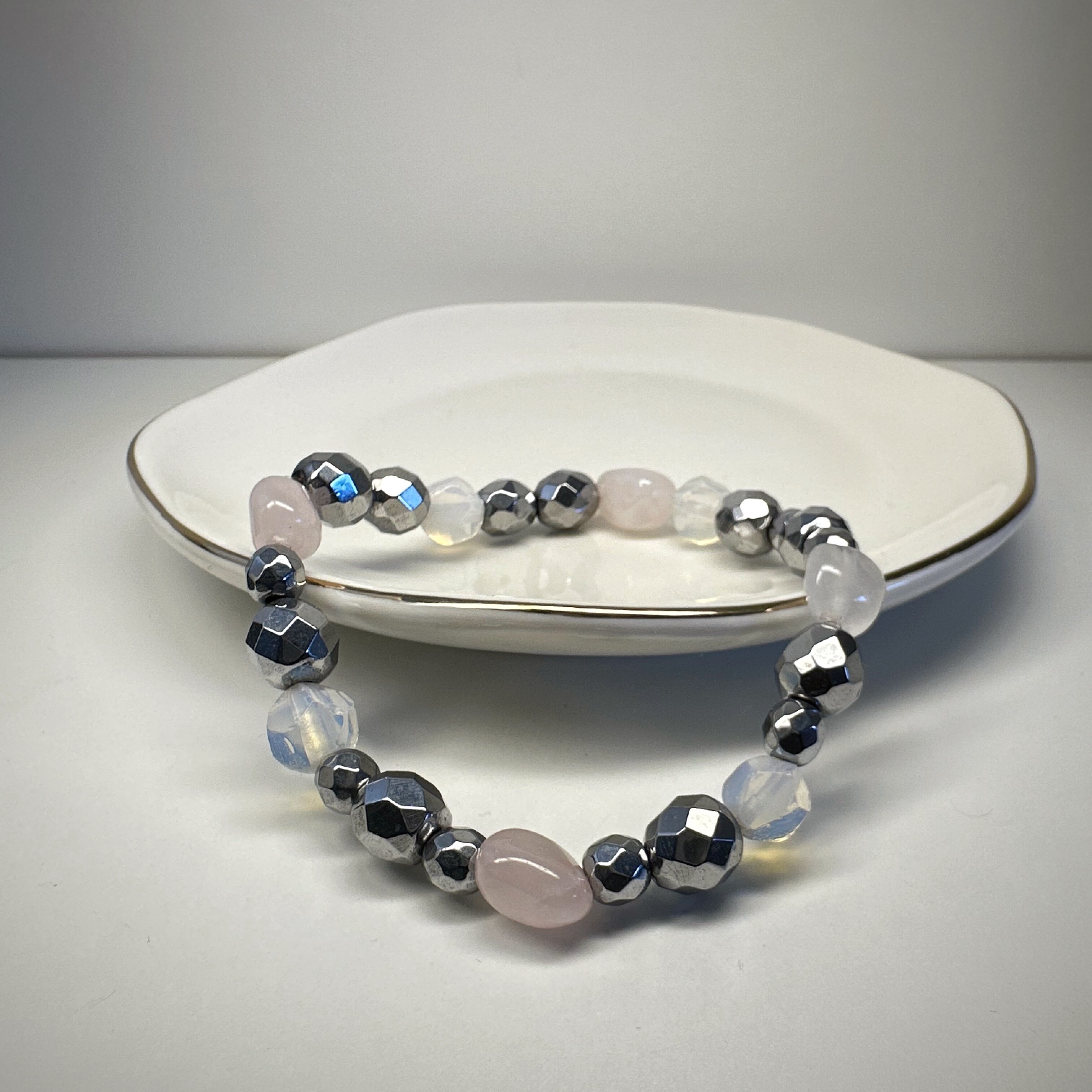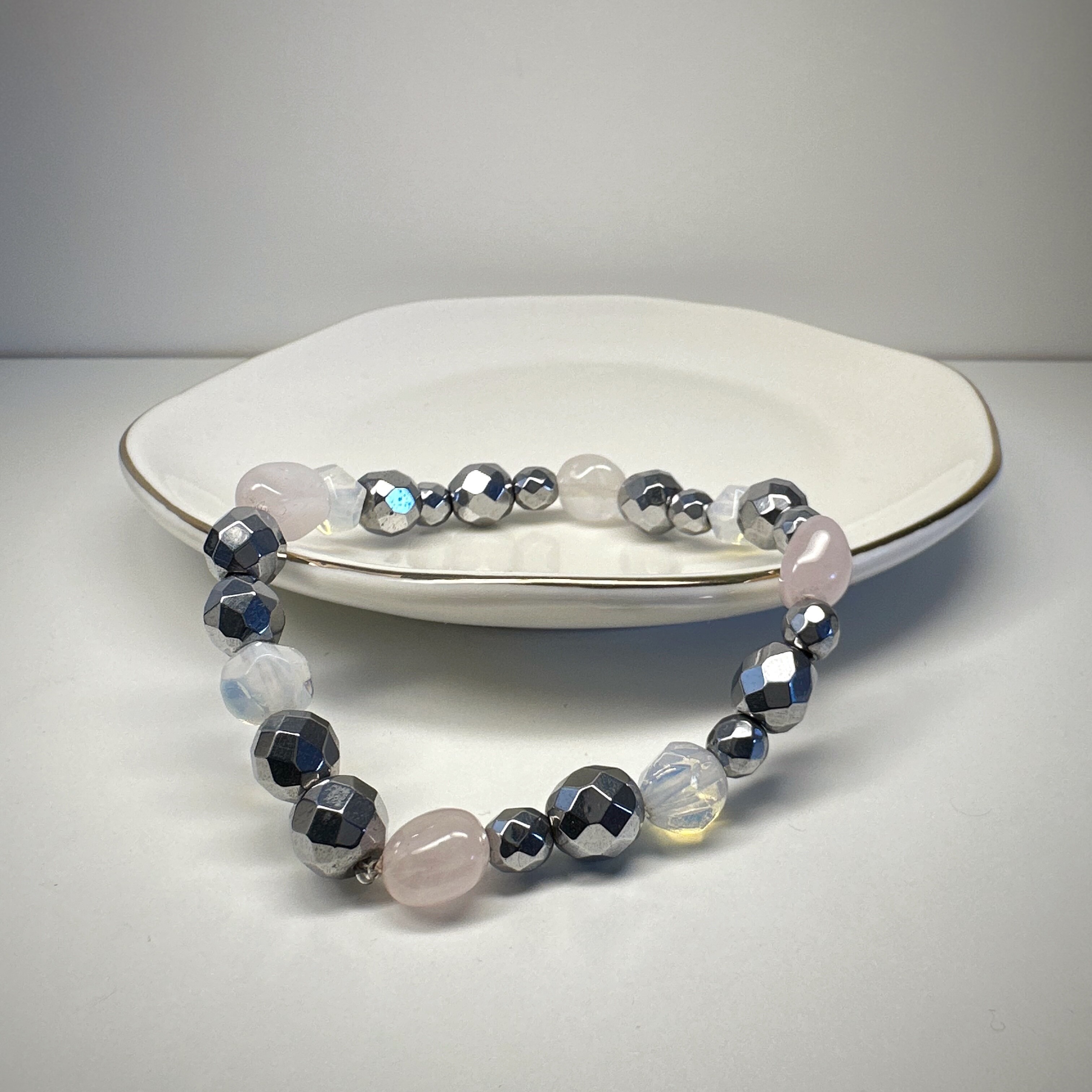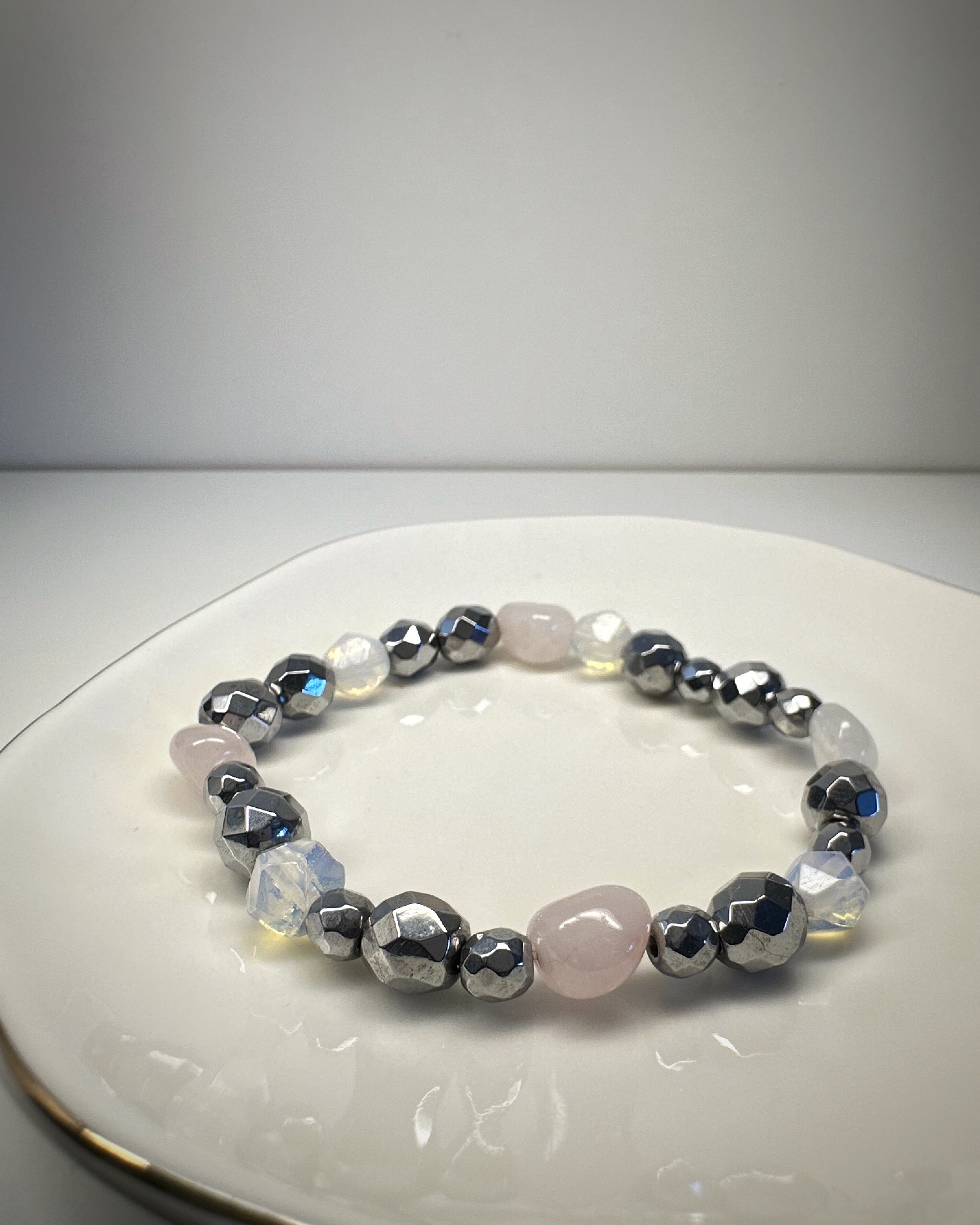 Opis długi:Bransoletka stworzona, by wzmacniać serce. Kwarc różowy – kamień bezwarunkowej miłości – dodaje czułości wobec siebie i innych. Hematyt w szlachetnym fasetowanym wykończeniu daje siłę, a kryształ górski – czystość intencji. To nie tylko ozdoba – to talizman kobiecości z klasą. Ich synergia przynosi ukojenie, ugruntowanie i otwartość na nowe relacje.