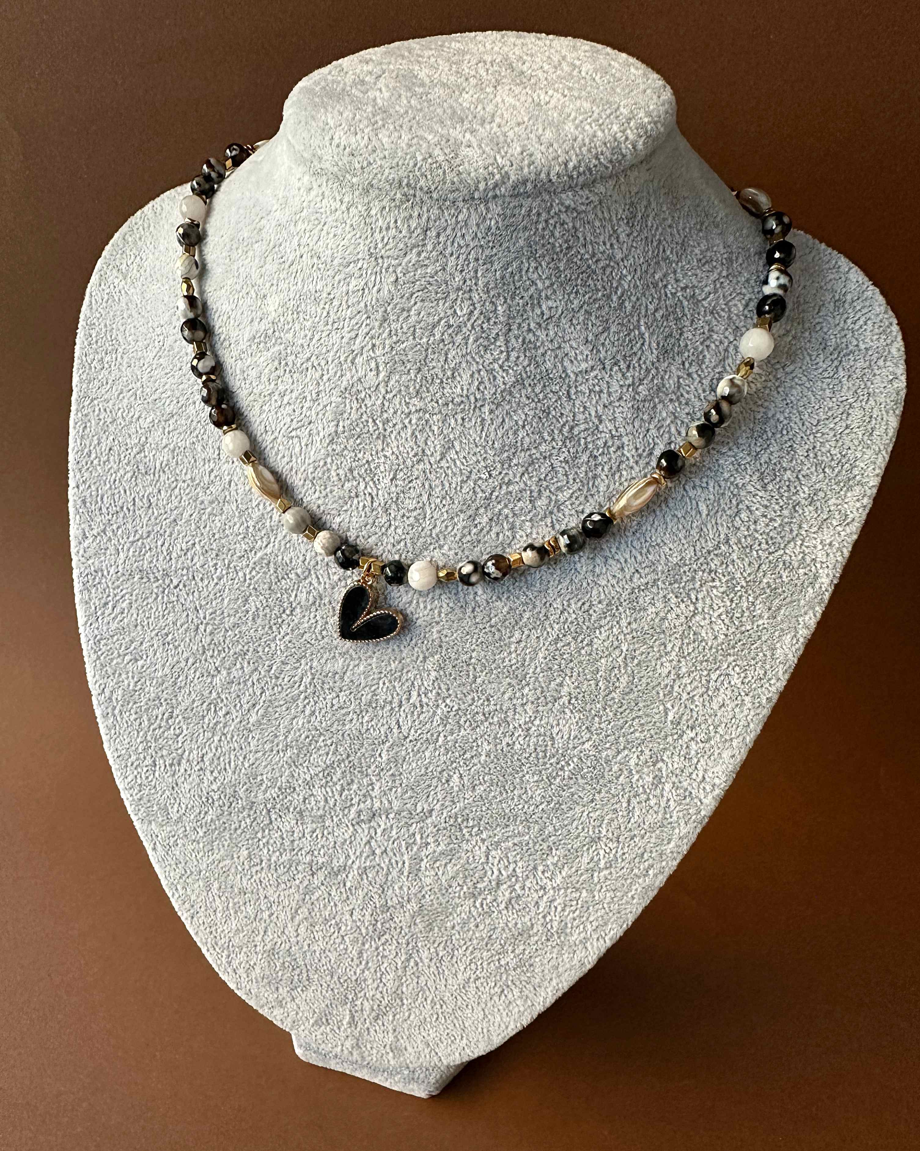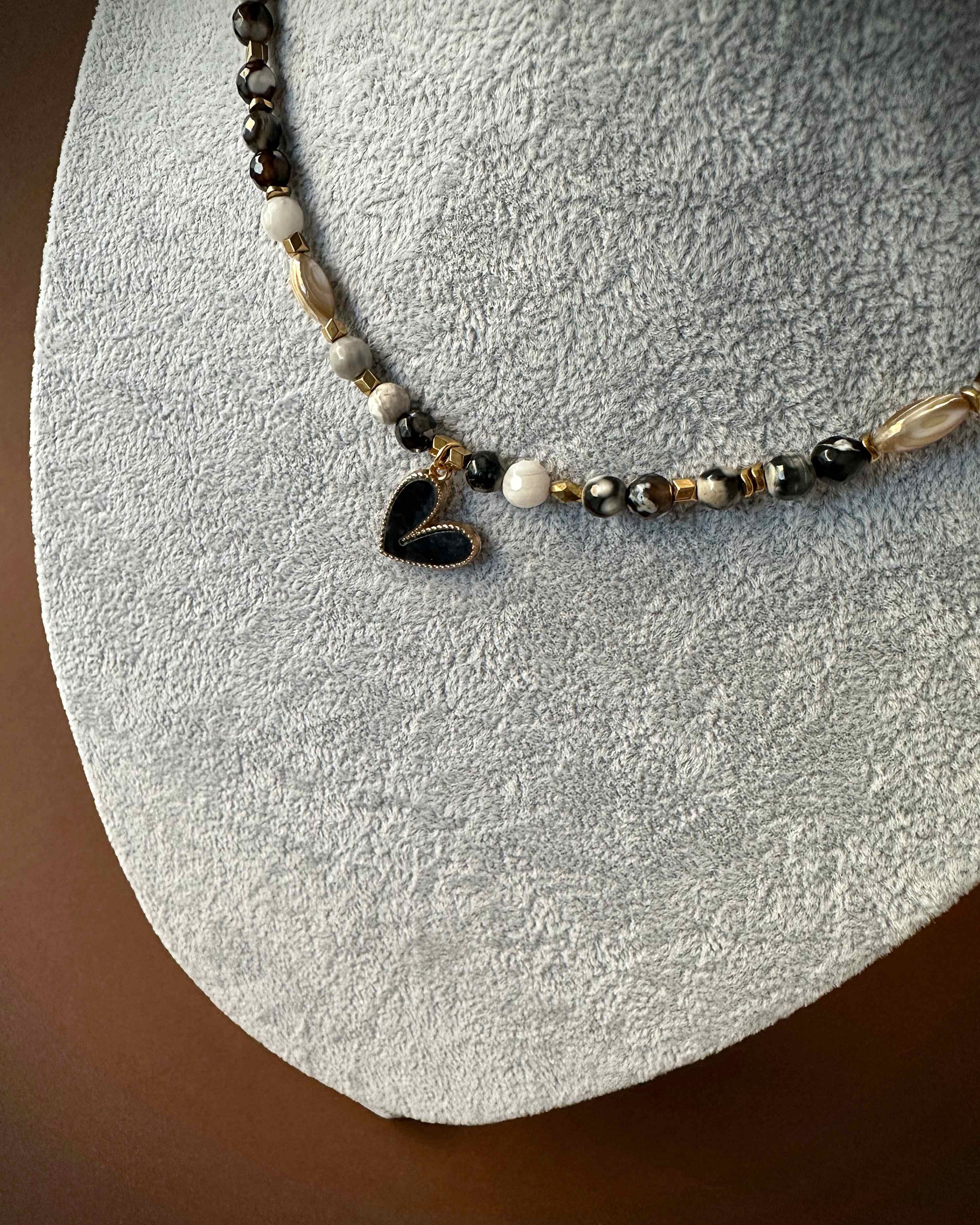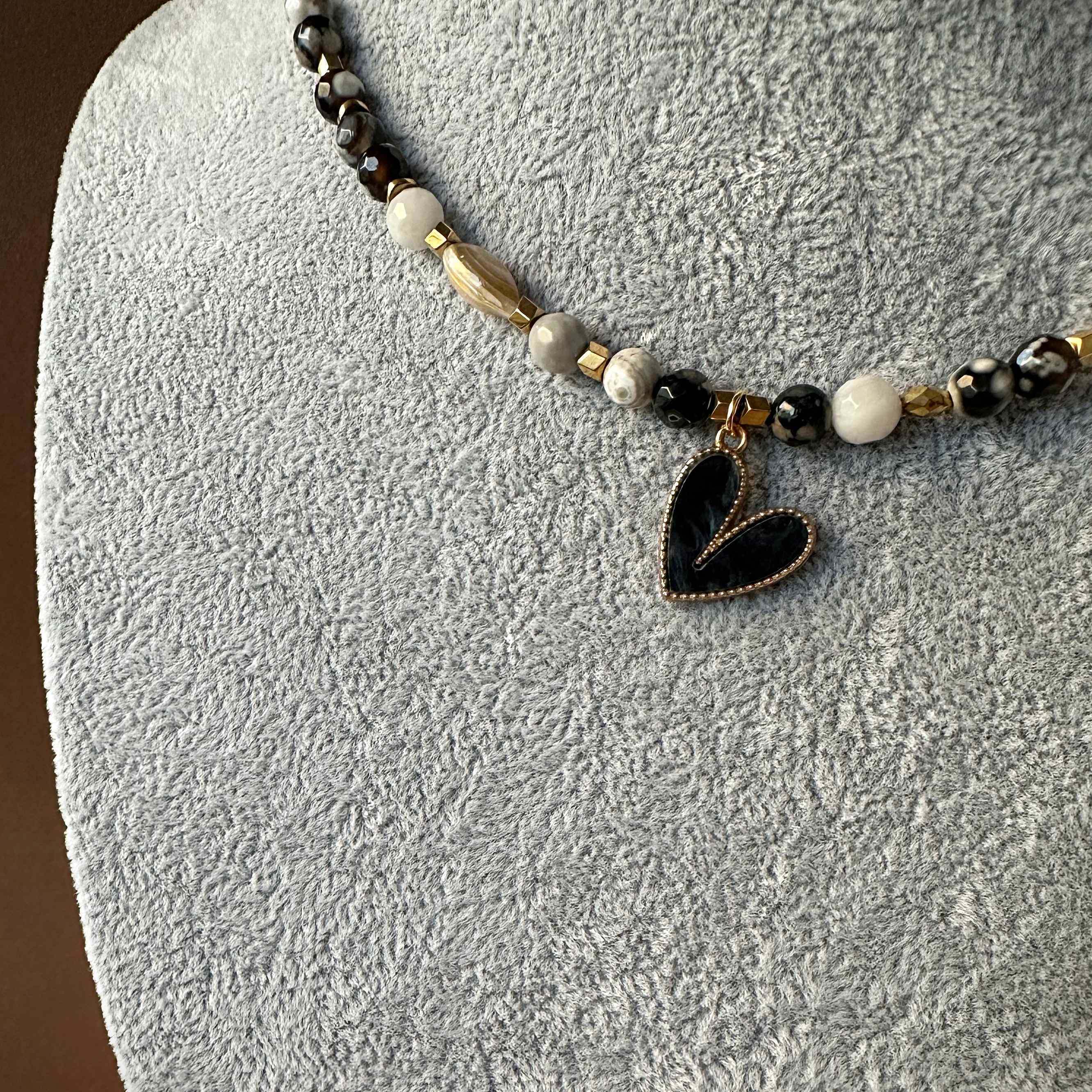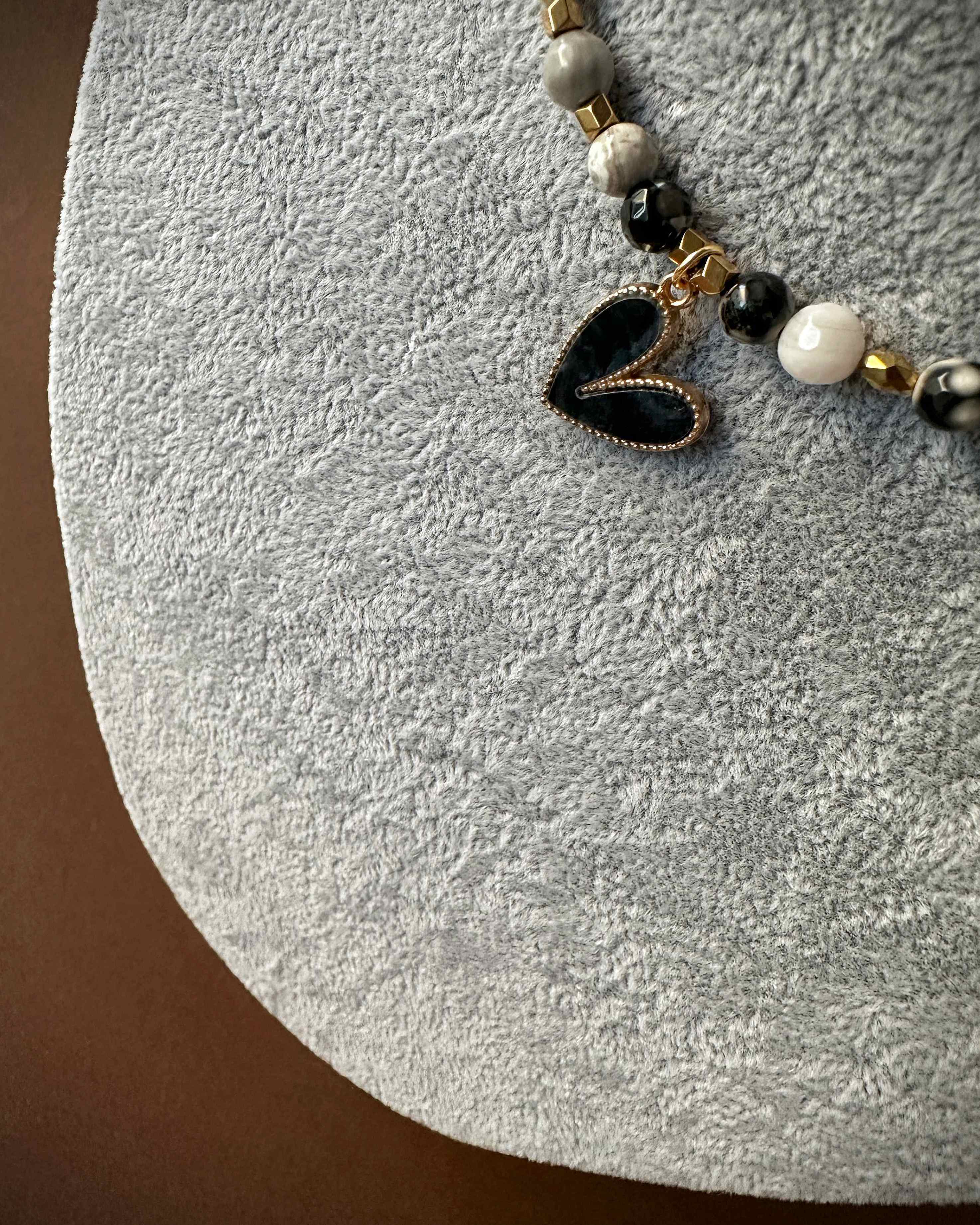 Centralnym punktem jest aksamitne czarno - granatowe serce otoczone złotą linią, z drugiej strony wykończone ryflowaną, złotą stalą, dzięki temu zawieszka może być noszona dwustronnie zależnie od potrzeby. Całość dopełniają liczne akcenty złotego hematytu w różnych formach, które dodają biżuterii eleganckiego, nowoczesnego charakteru.
