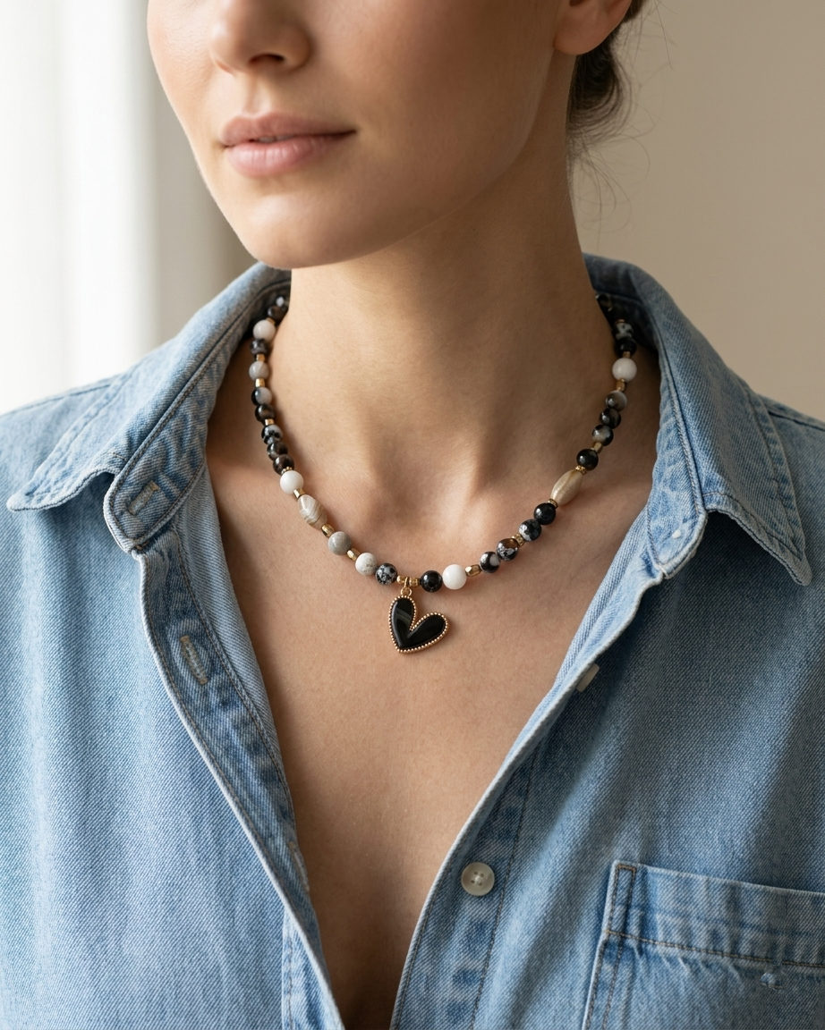 3. Aksamitne serce z podwójnym wykończeniem (mat + ryflowana złota stal) sprawia, że naszyjnik zmienia charakter w zależności od światła i stylizacji.
