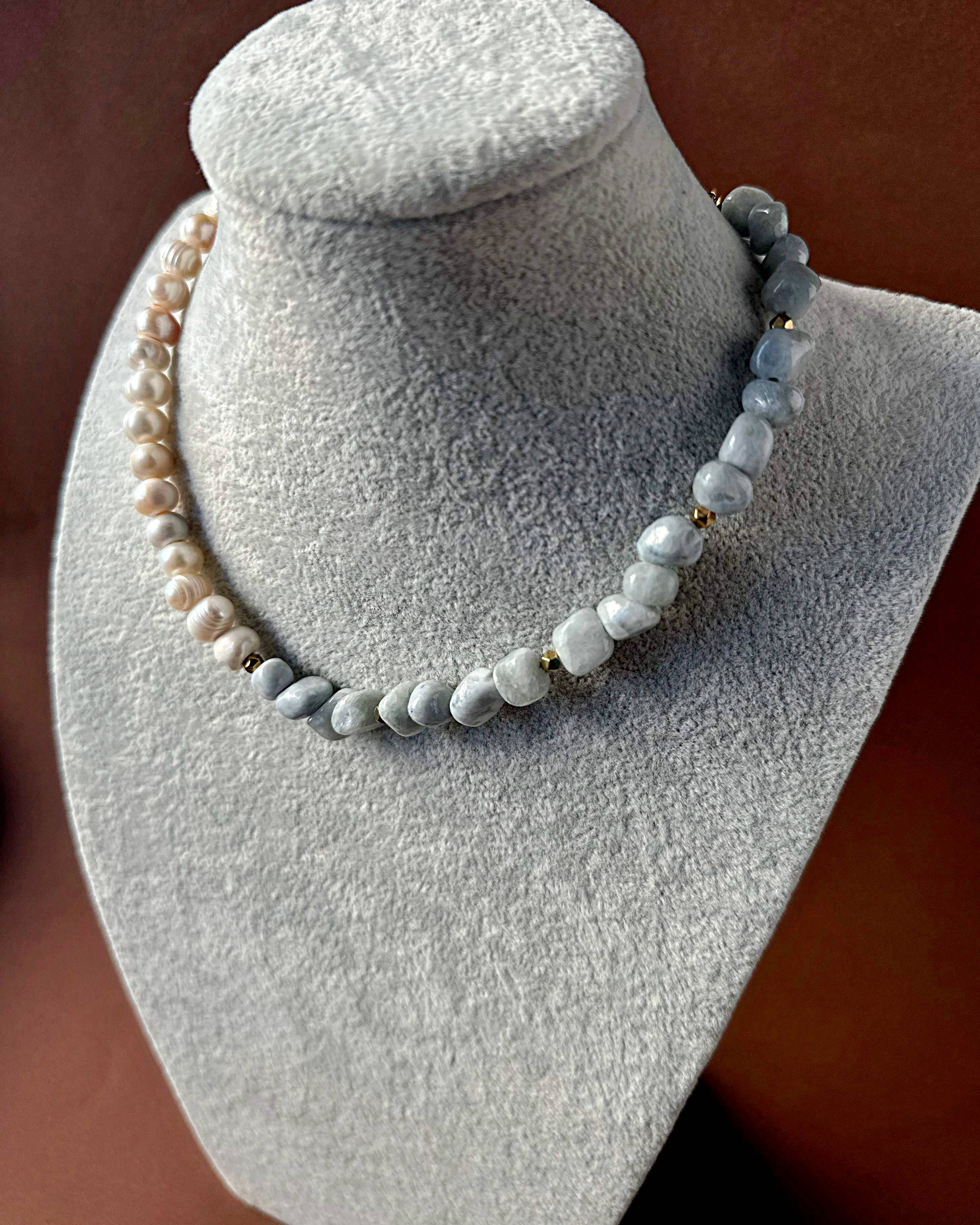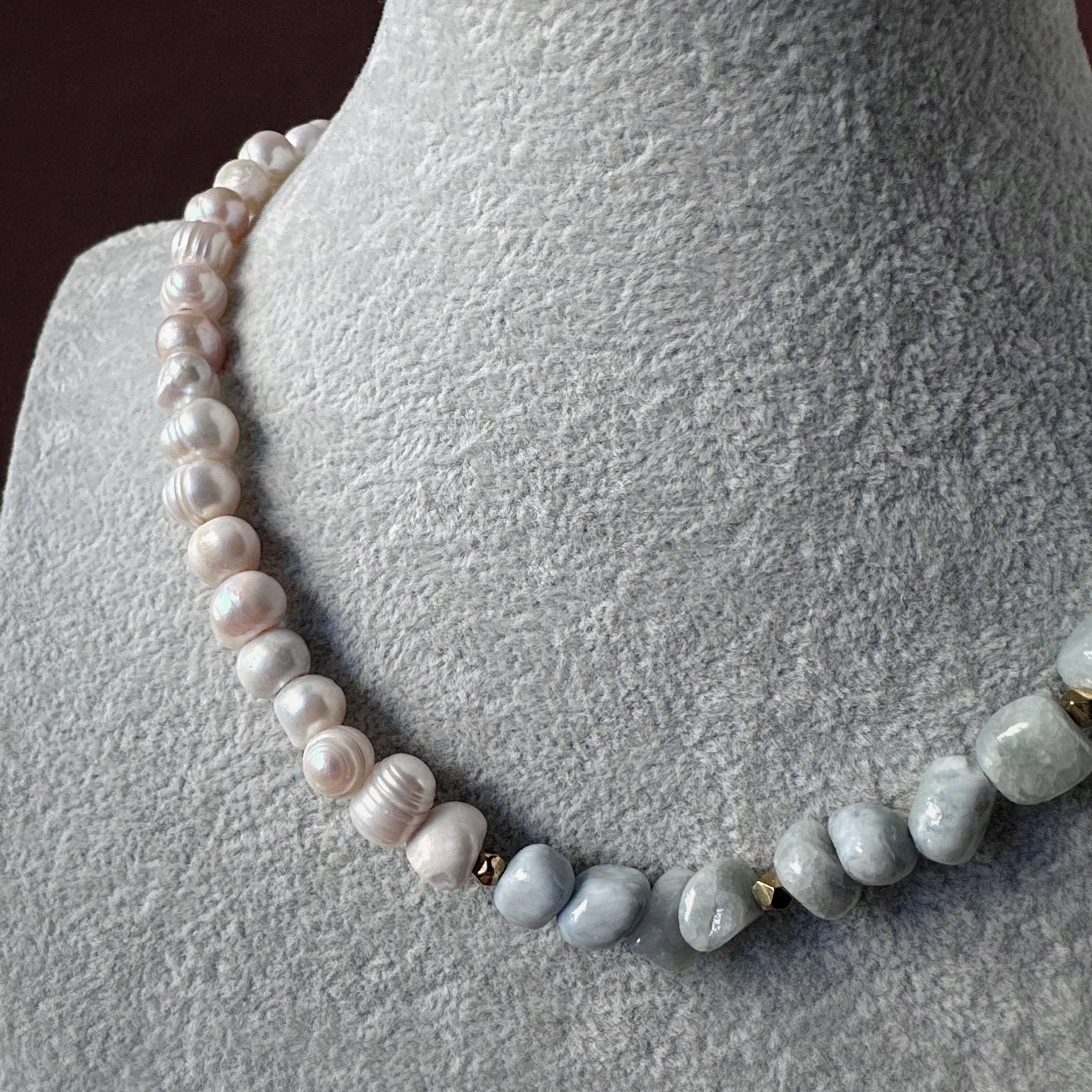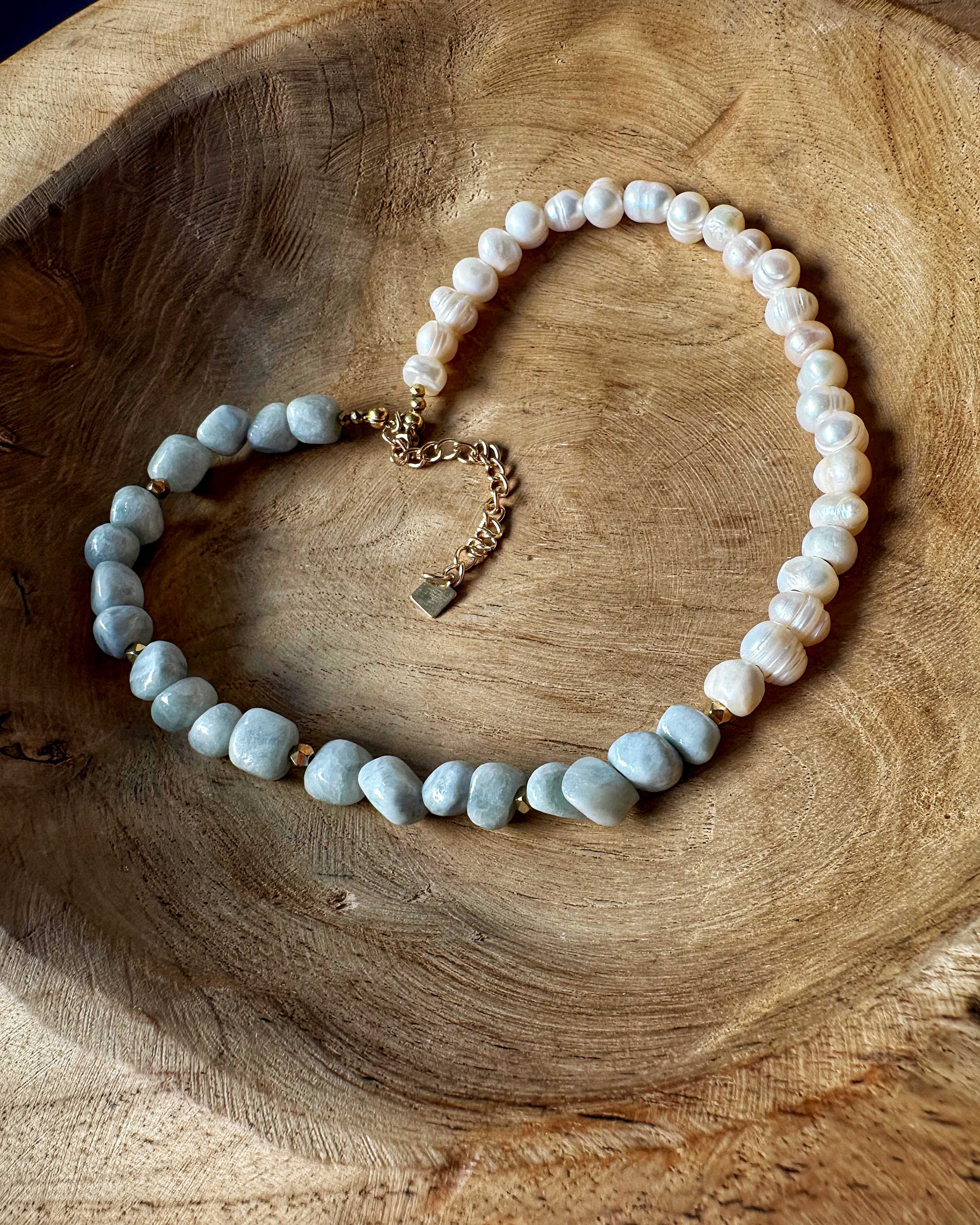 Pearl Dream Balance to naszyjnik, w którym, naturalna perła o średnicy 8 mm symbolizuje delikatność i równowagę emocjonalną. Nieregularne bryłki awenturynu w pastelowym odcieniu niebiesko-zielonym wprowadzają lekkość i świeżość, a subtelny akcent złotego hematytu dodaje całości elegancji oraz energetycznego „uziemienia”.
