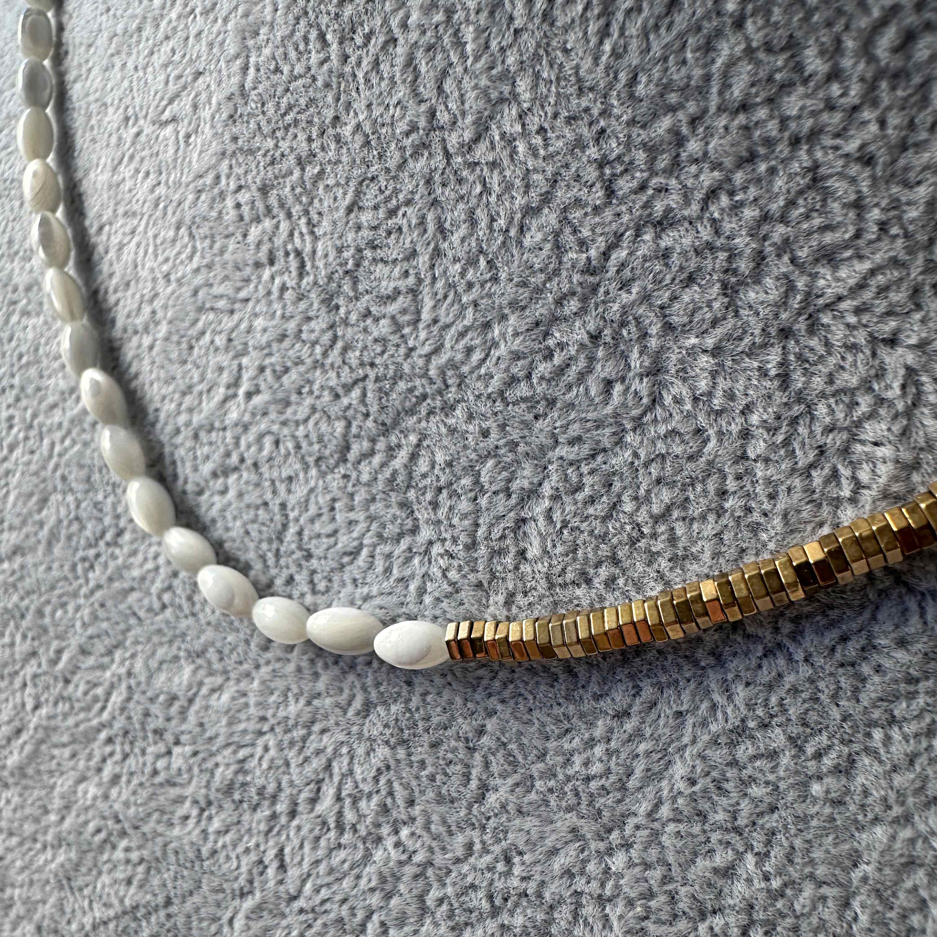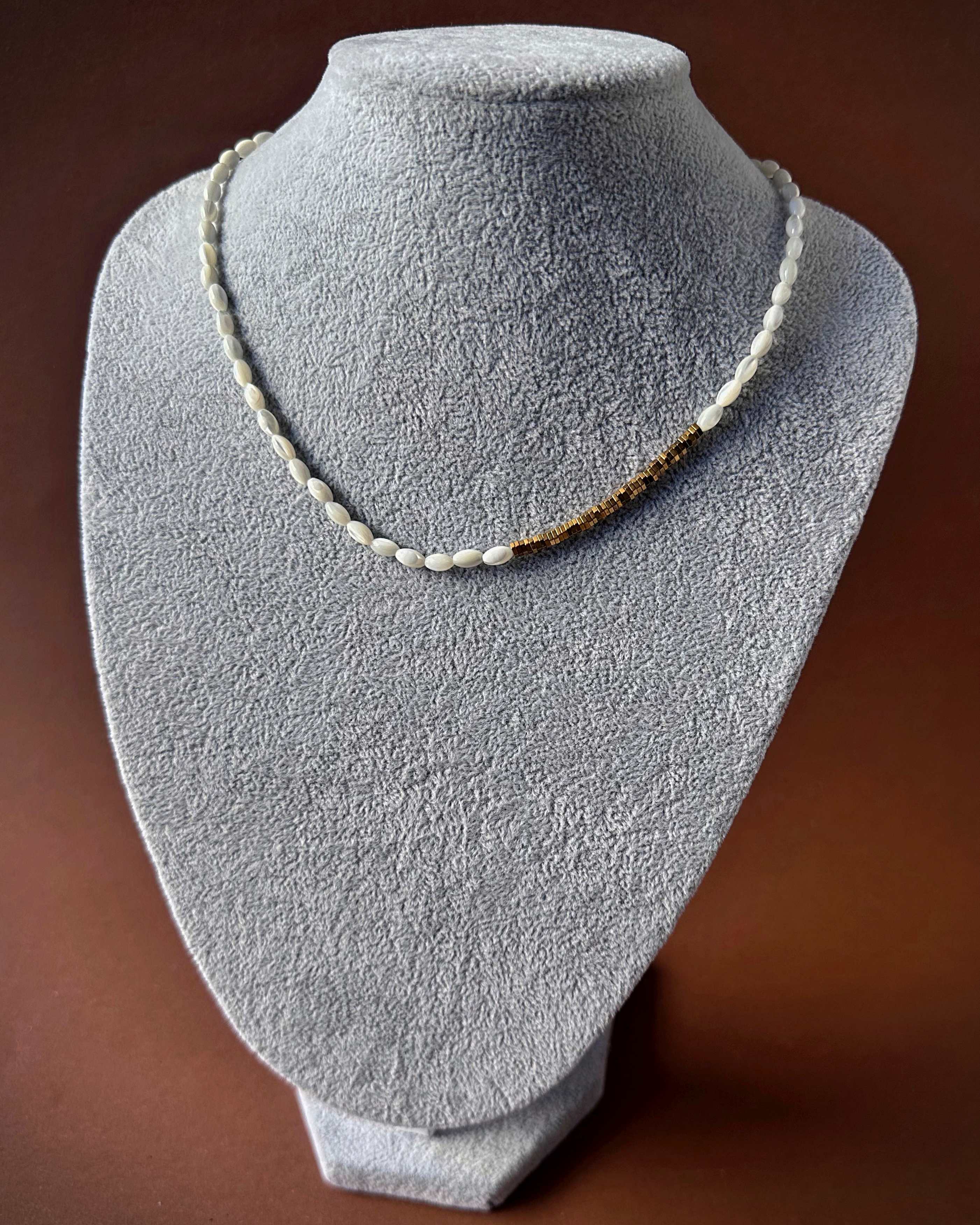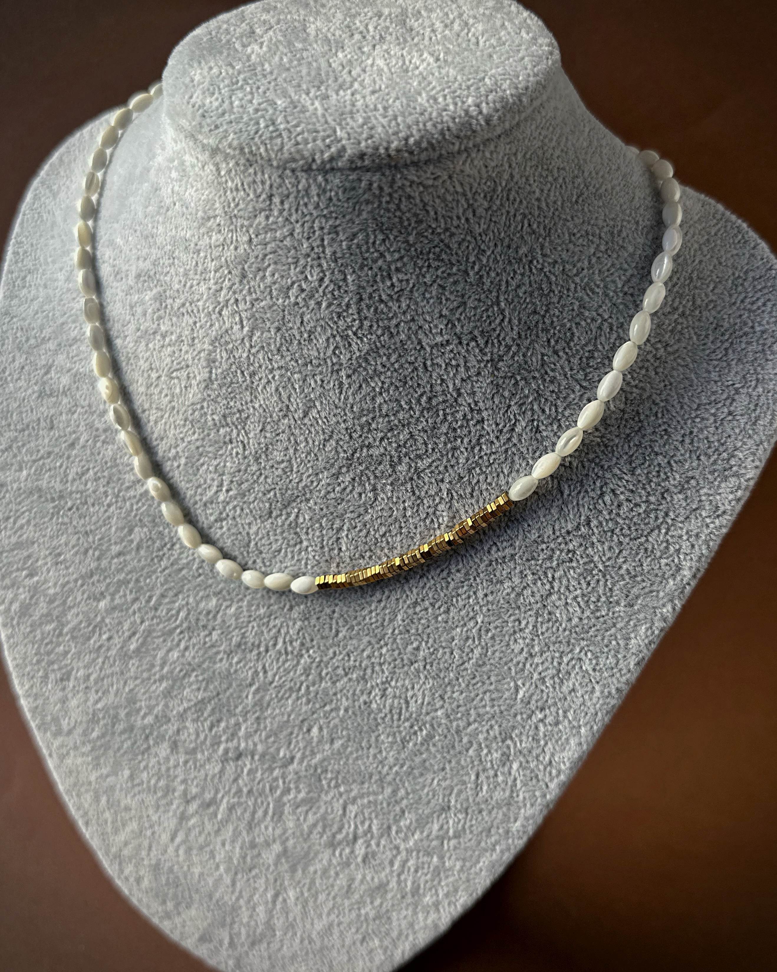 kamienie: masa perłowa (biała, kształt ziarenek ryżu), hematyt w kolorze złotym,