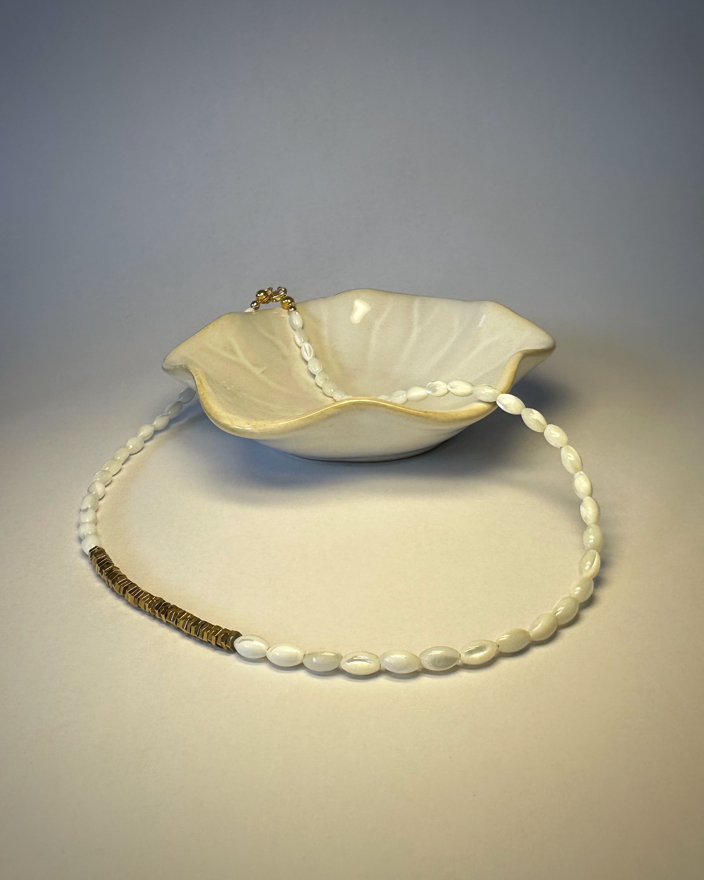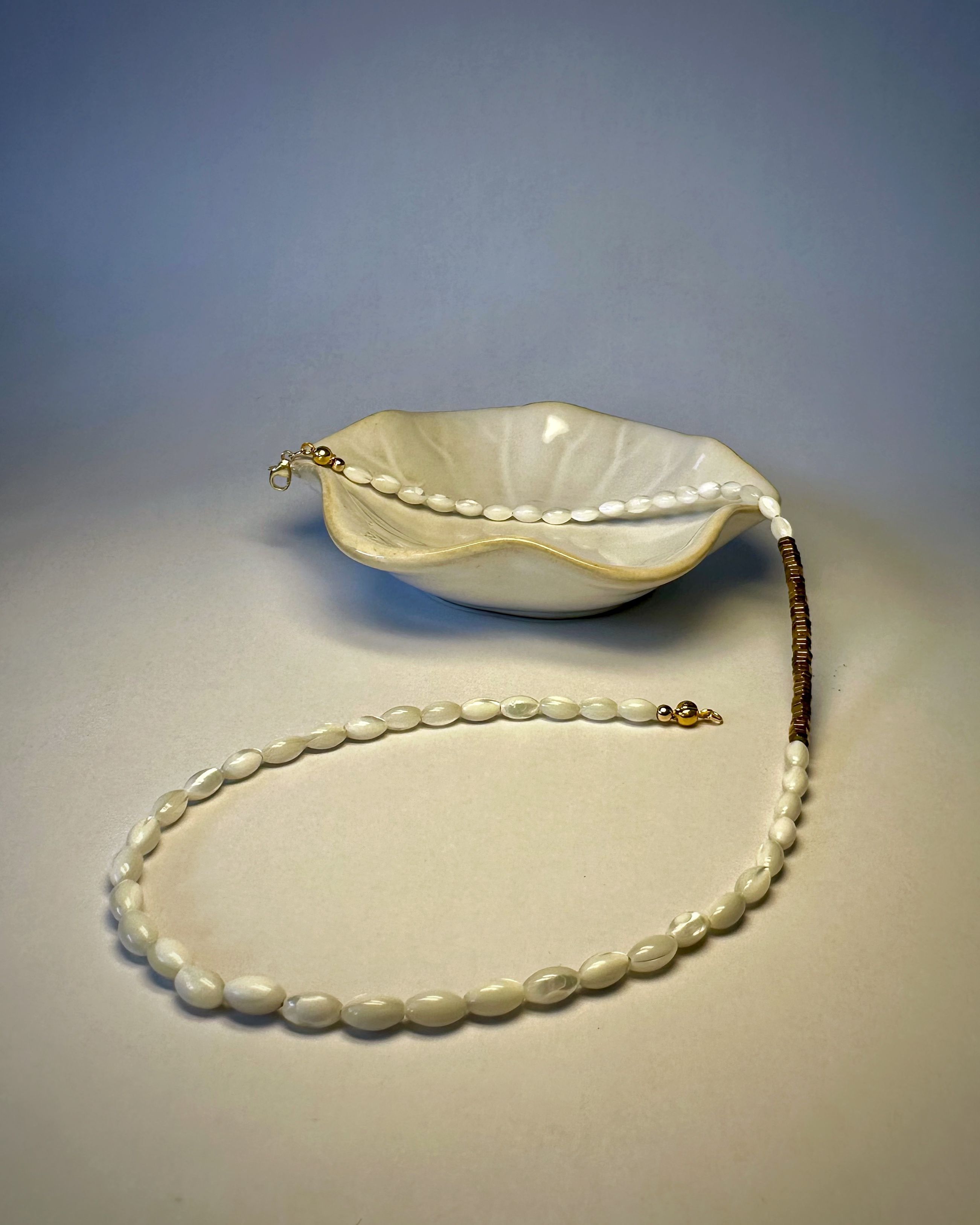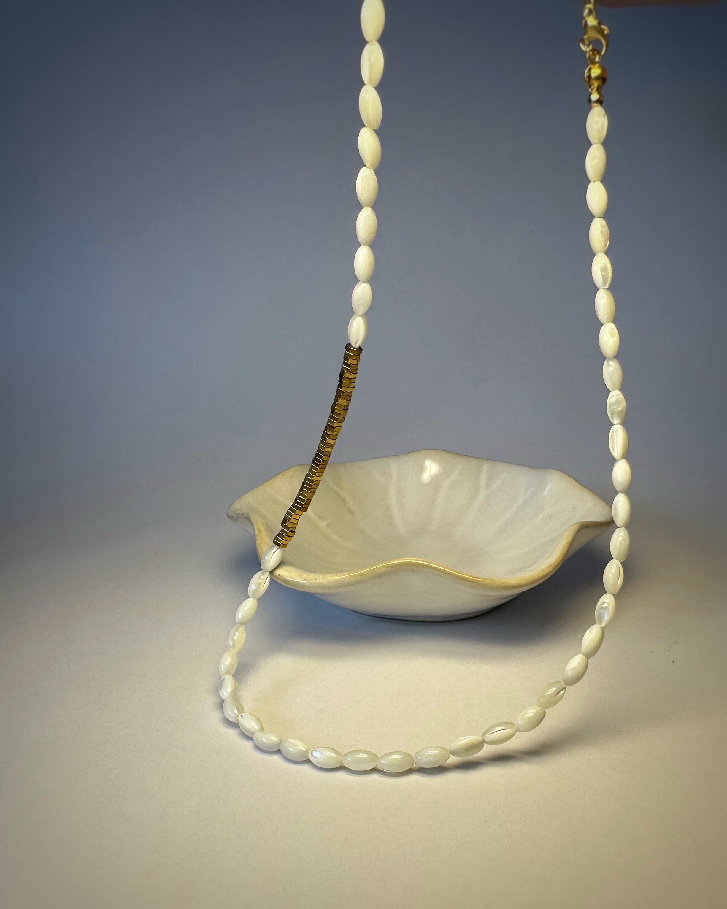 kamienie: masa perłowa (biała, kształt ziarenek ryżu), hematyt w kolorze złotym,
