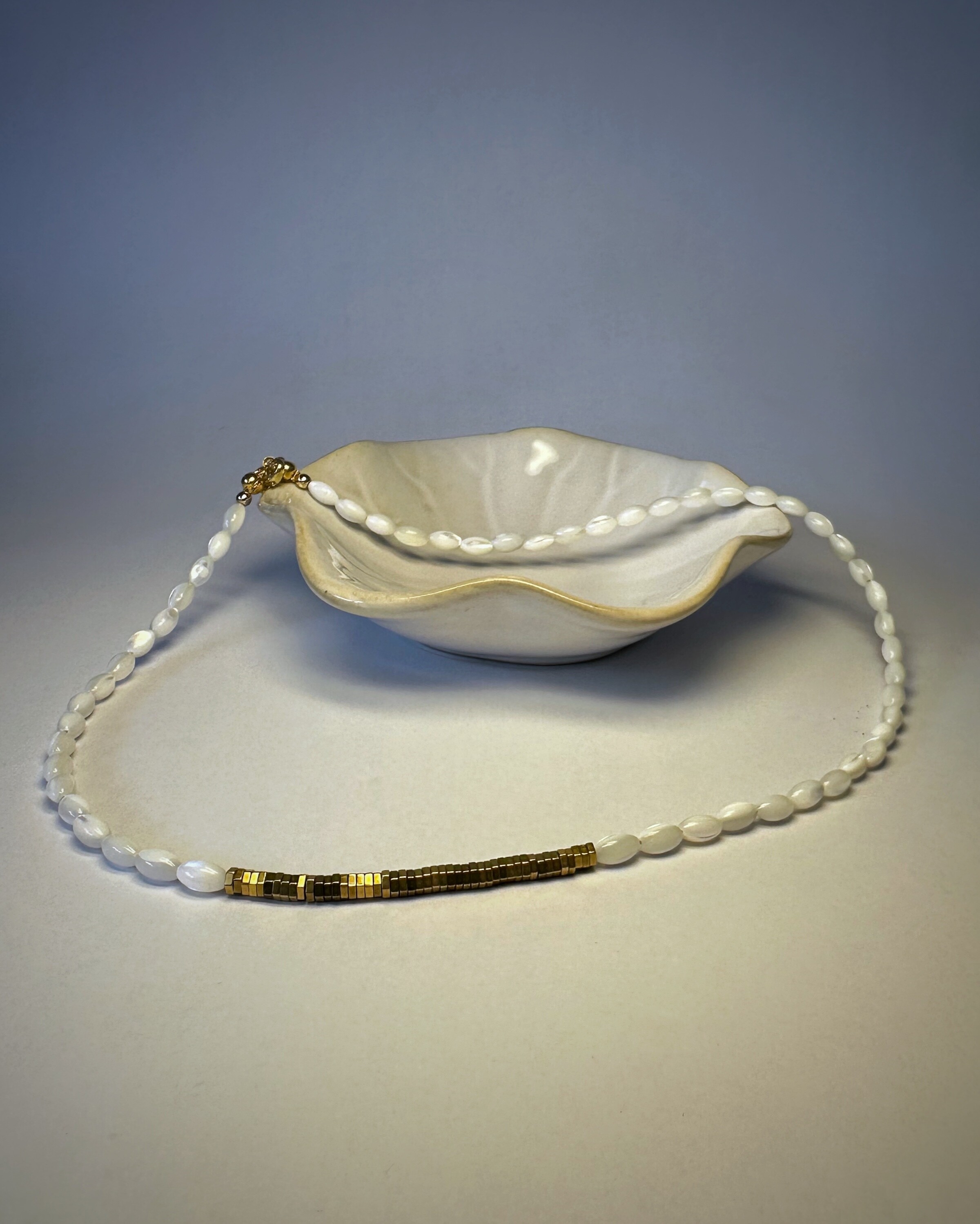 Pearl Drive to naszyjnik, który łączy ponadczasowy urok masy perłowej z geometrycznym akcentem złotego hematytu. Koraliki przypominające drobne ziarenka ryżu tworzą lekki, delikatny splot, który pięknie układa się na szyi. Długi detal z hematytu w złotym odcieniu dodaje całości wyrazistości i nowoczesnego charakteru, tworząc kontrast między miękkim blaskiem perły a mocą metalu. To biżuteria, która sprawdzi się zarówno w eleganckich, jak i codziennych stylizacjach. Idealna dla znaków zodiaku związanych z wodą (Rak, Ryby, Skorpion), ale też jako uzupełnienie kamieni o ziemistej energii – np. z lawą czy jaspisem.
