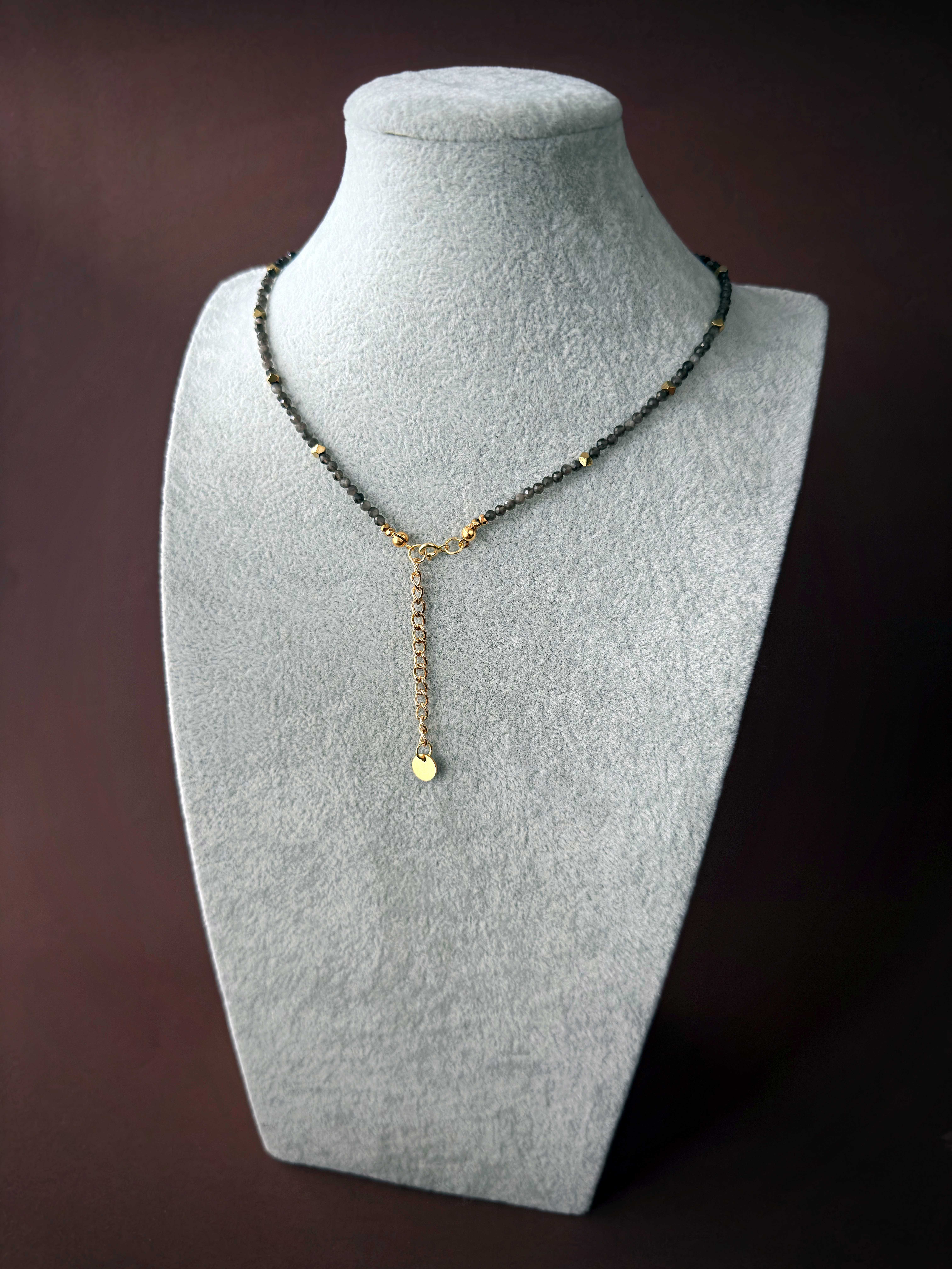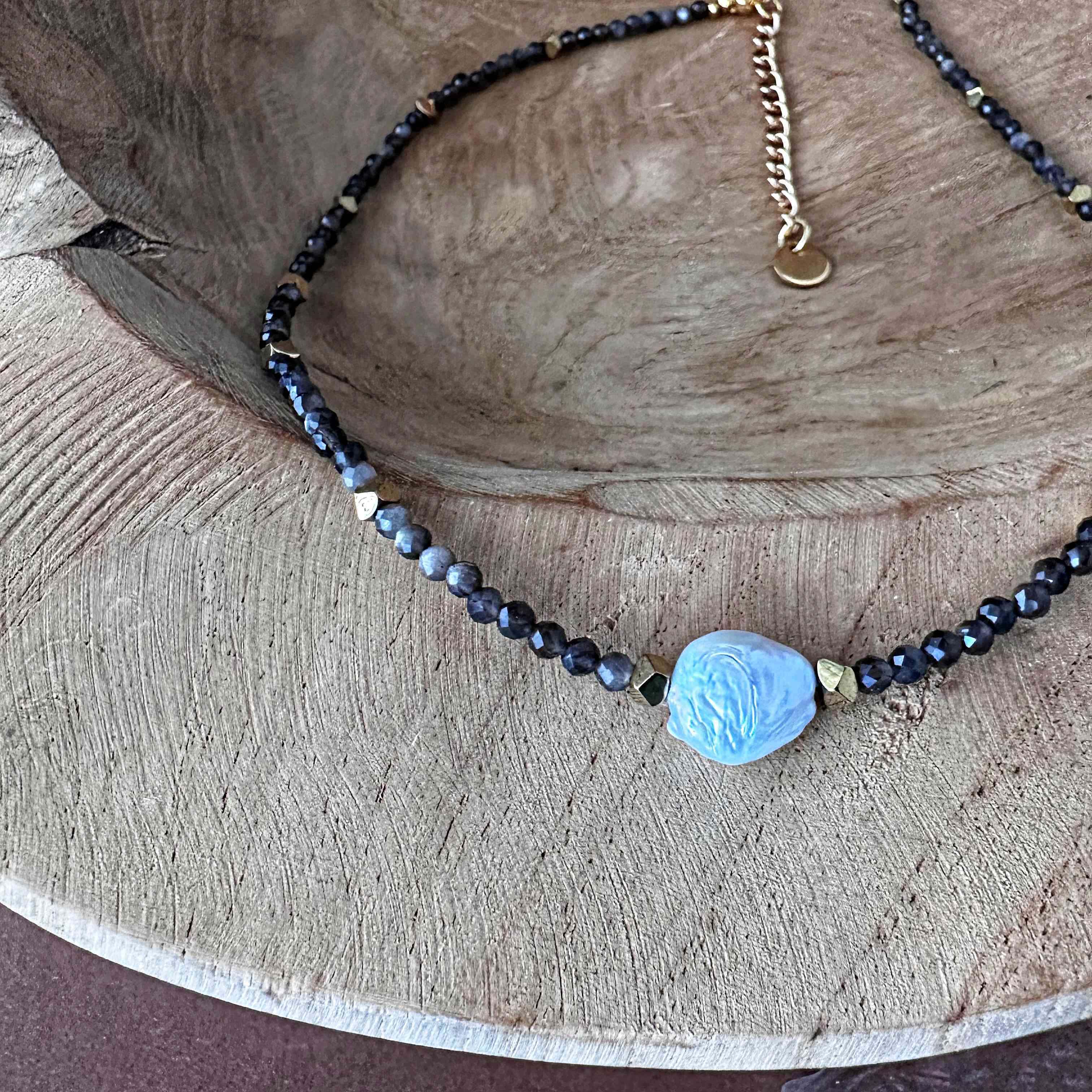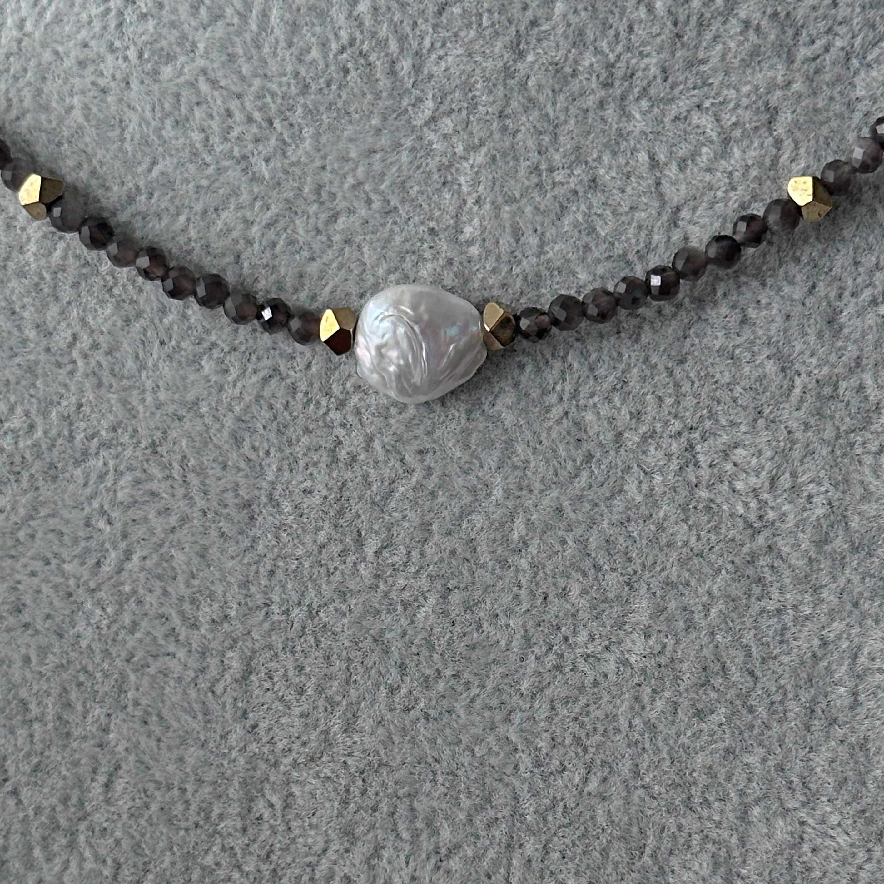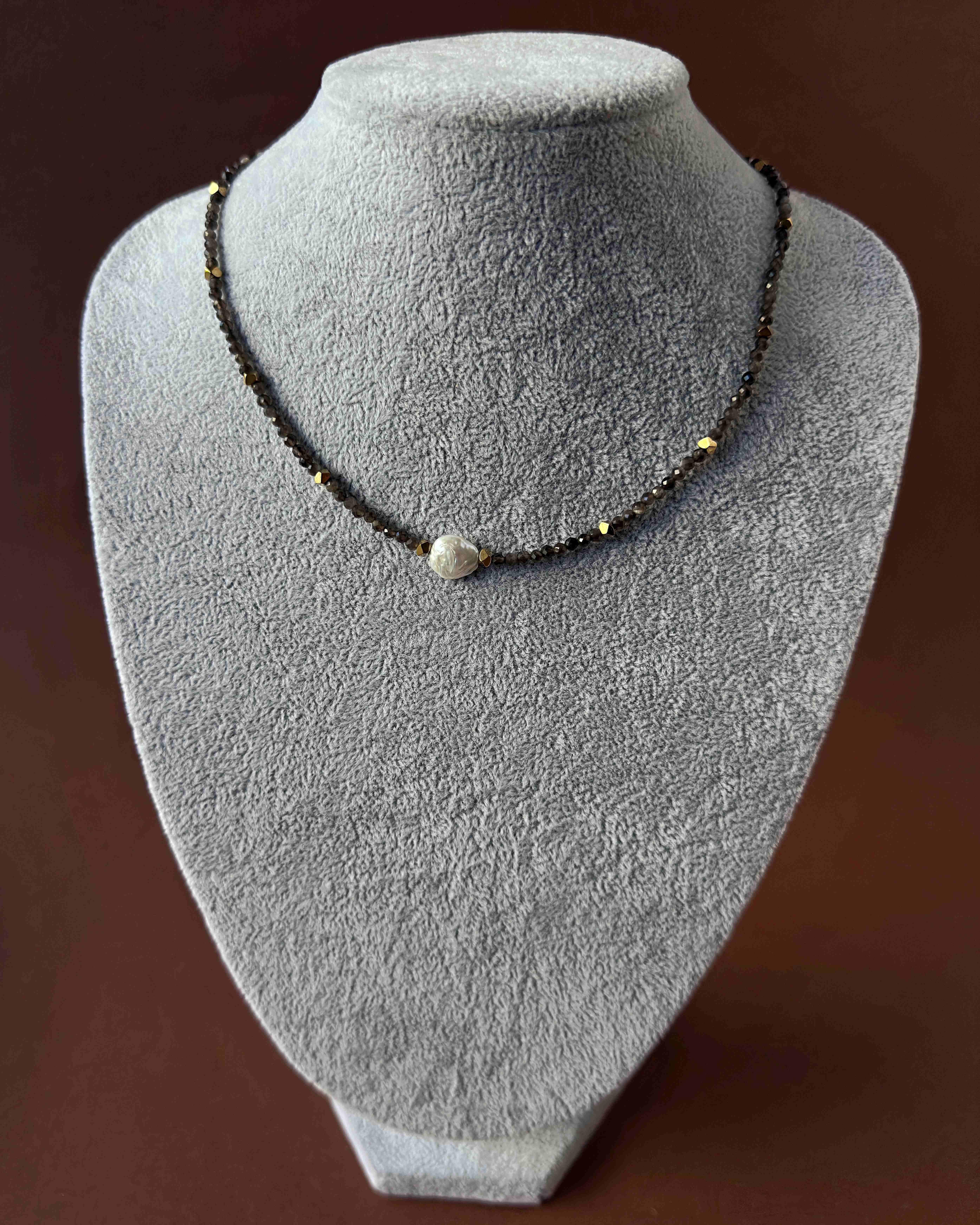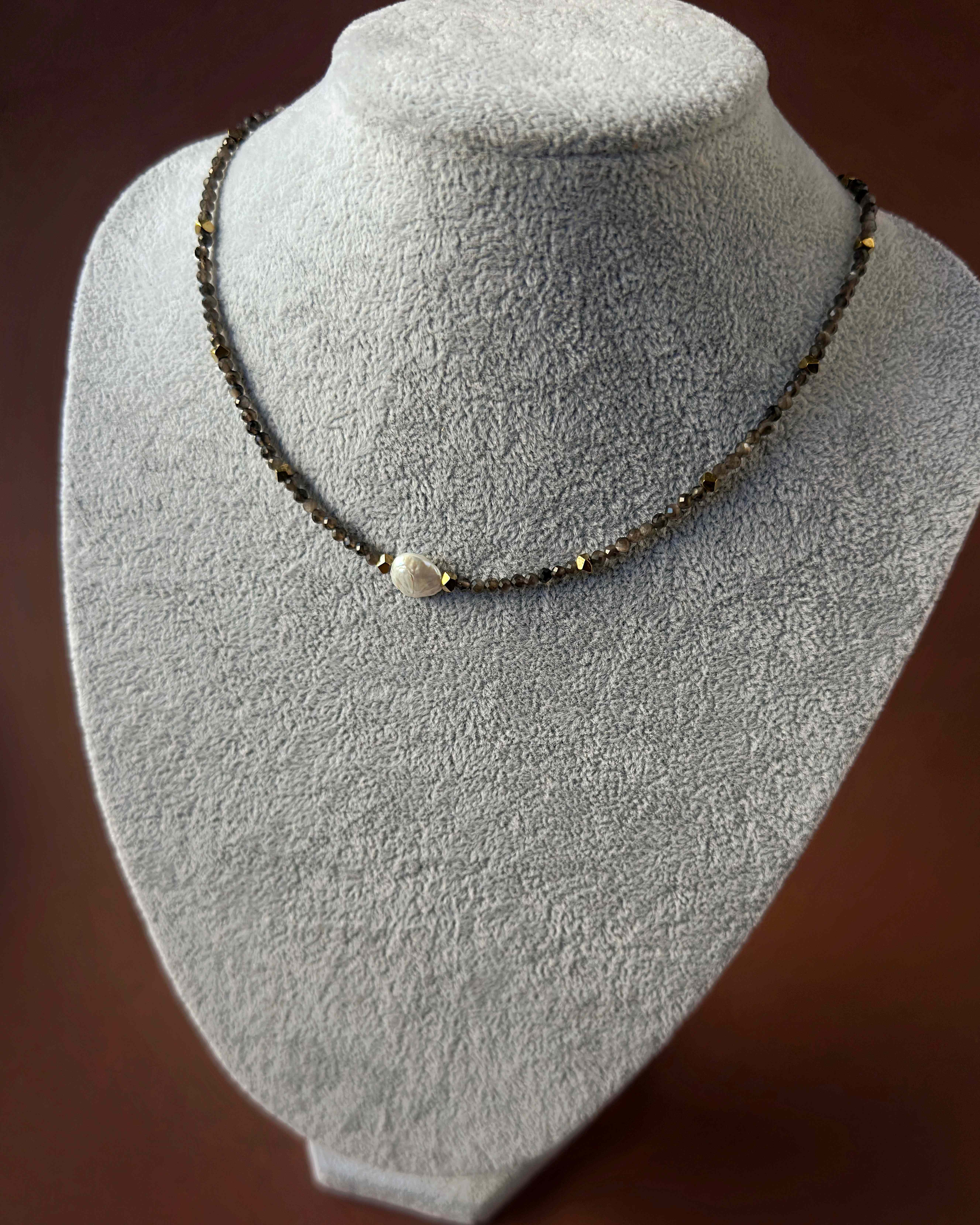 Ten naszyjnik przyciąga spokojem i klasą. Szkliste, fasetowane bryłki kwarcu dymnego w chłodnym, szarym odcieniu pięknie odbijają światło, tworząc elegancką, lekko mglistą aurę. Złote, fasetowane bryłki hematytu dodają całości ciepła i biżuteryjnego blasku, a centralny detal z masy perłowej nadaje kompozycji miękkości i subtelnej szlachetności.