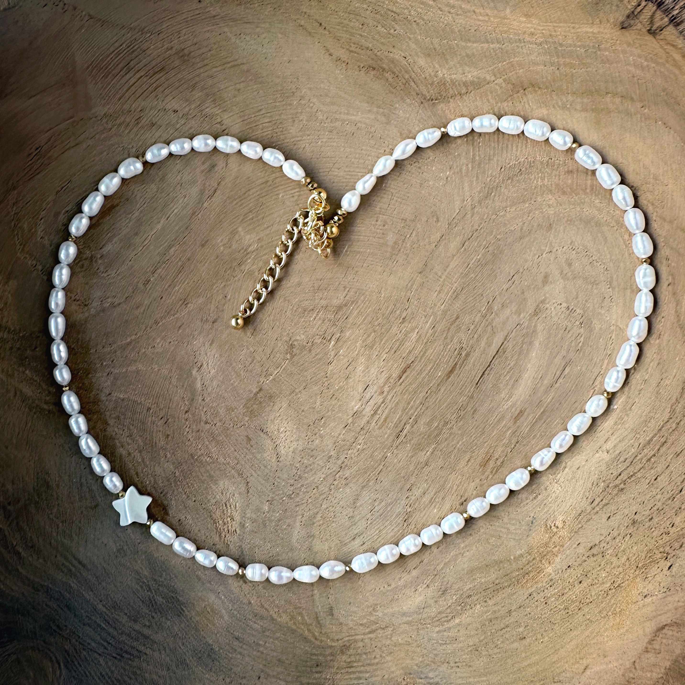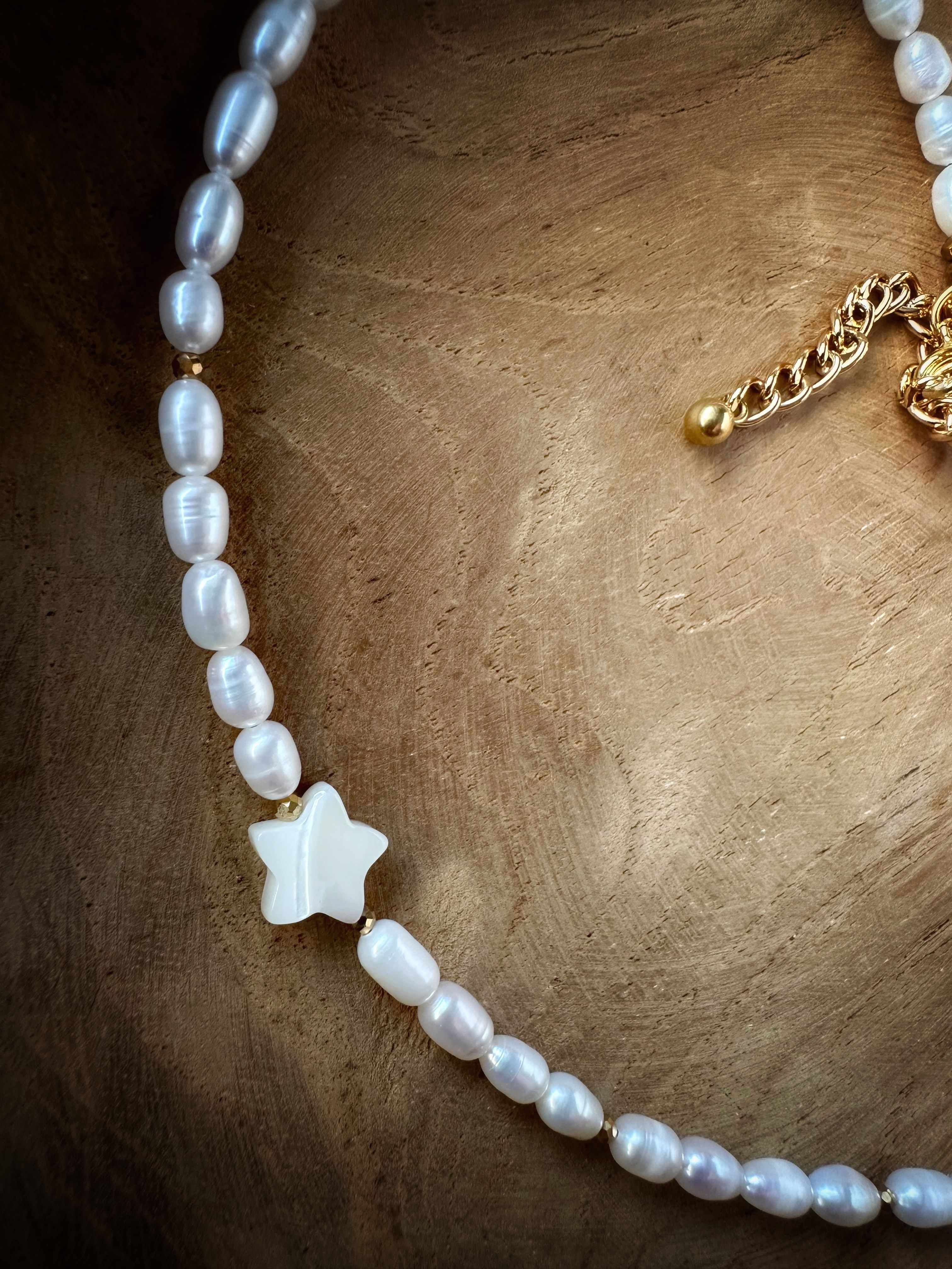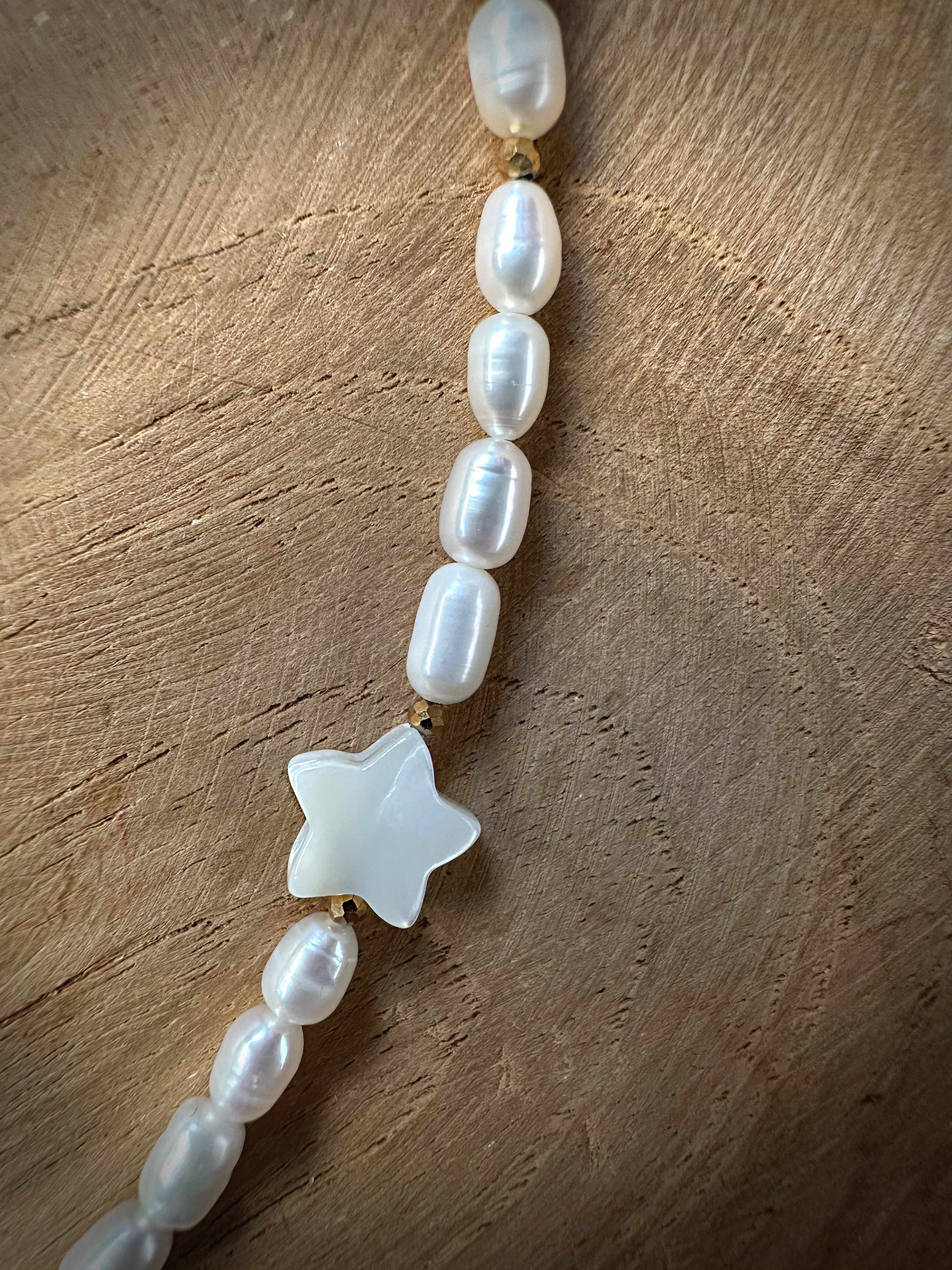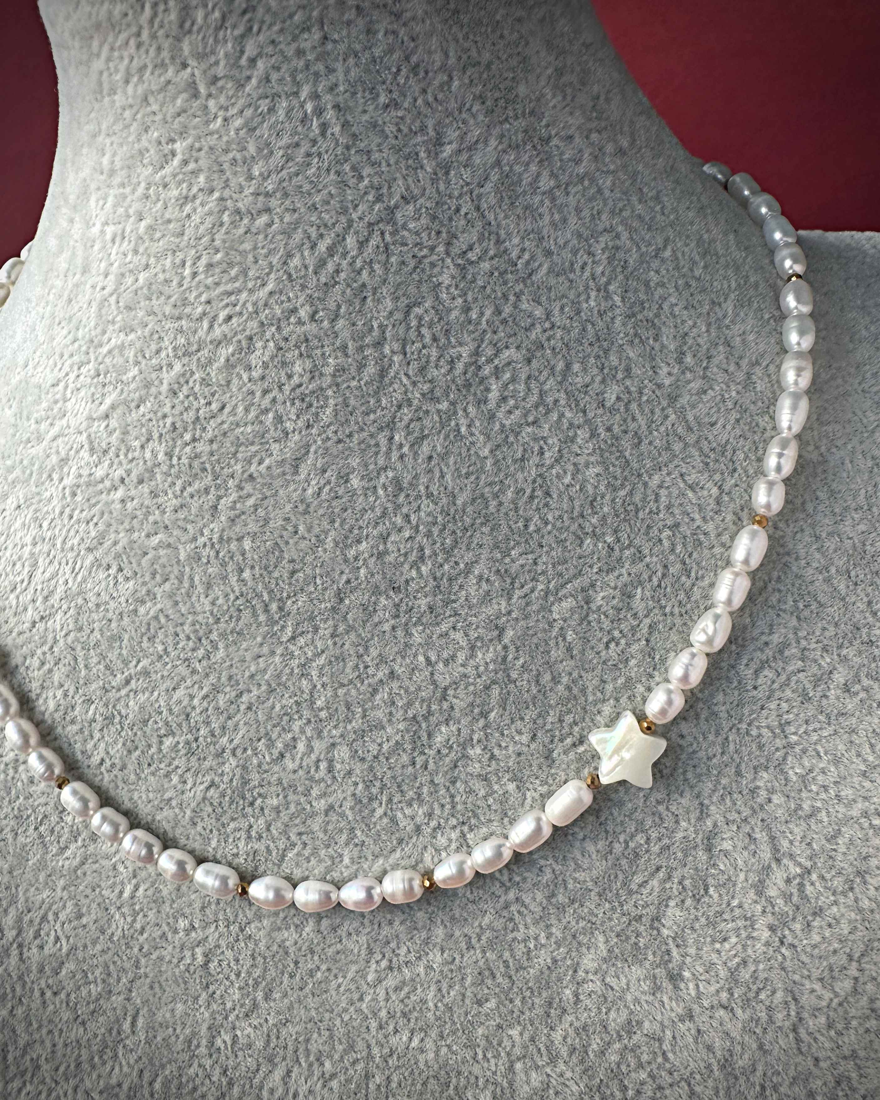 Ten model to esencja spokojnej elegancji. Perły hodowlane o organicznej formie i wyczuwalnej wyrazistej strukturze. Złoty hematyt dodaje nowoczesnego kontrastu, a delikatna gwiazda z masy perłowej subtelnie odbija światło.