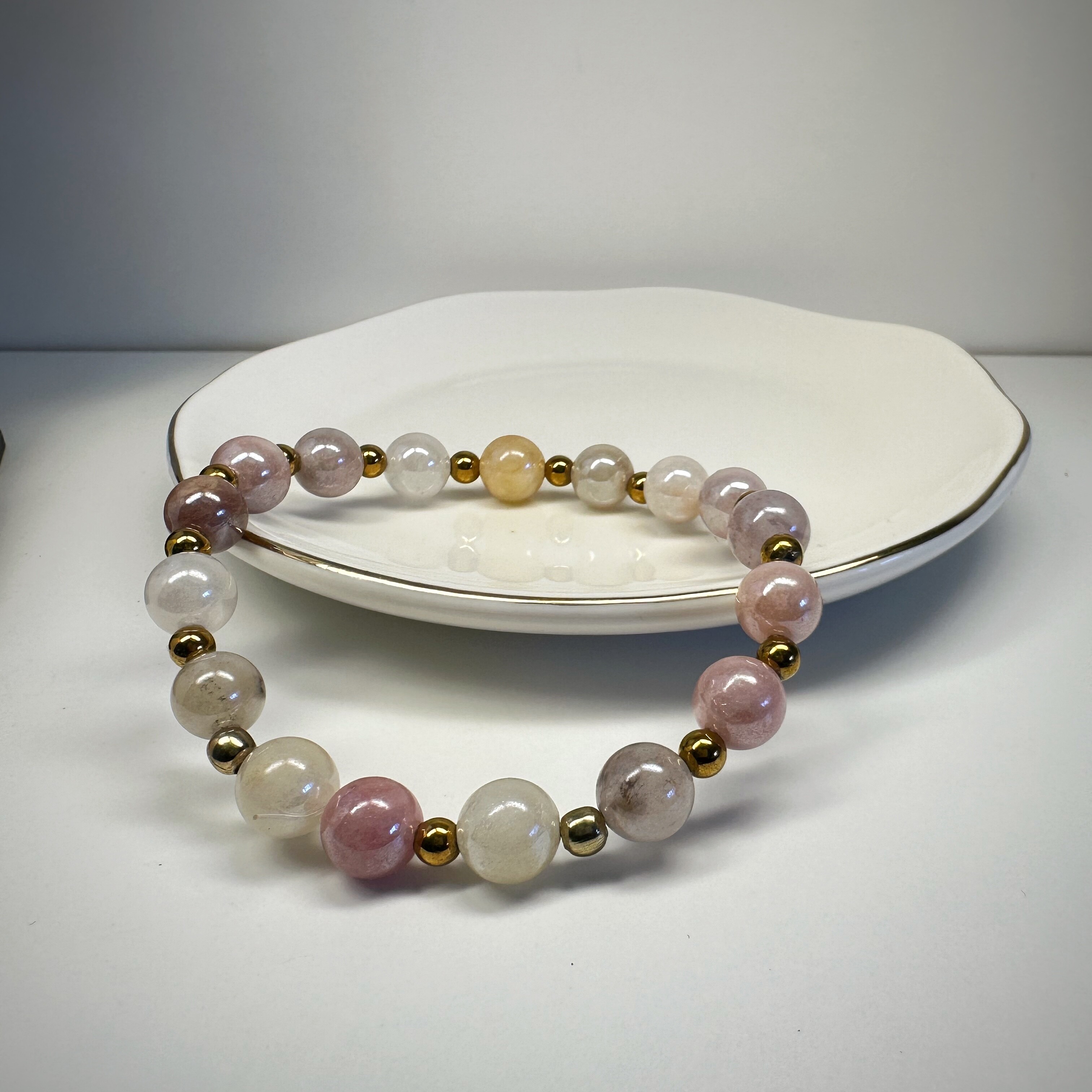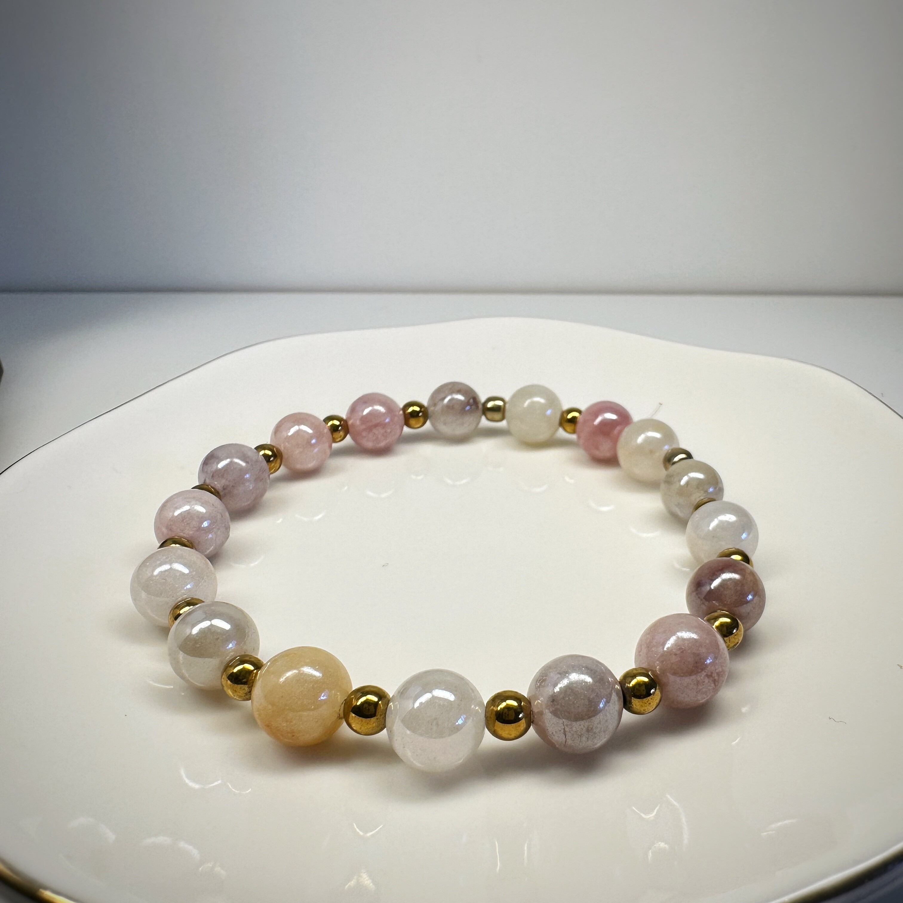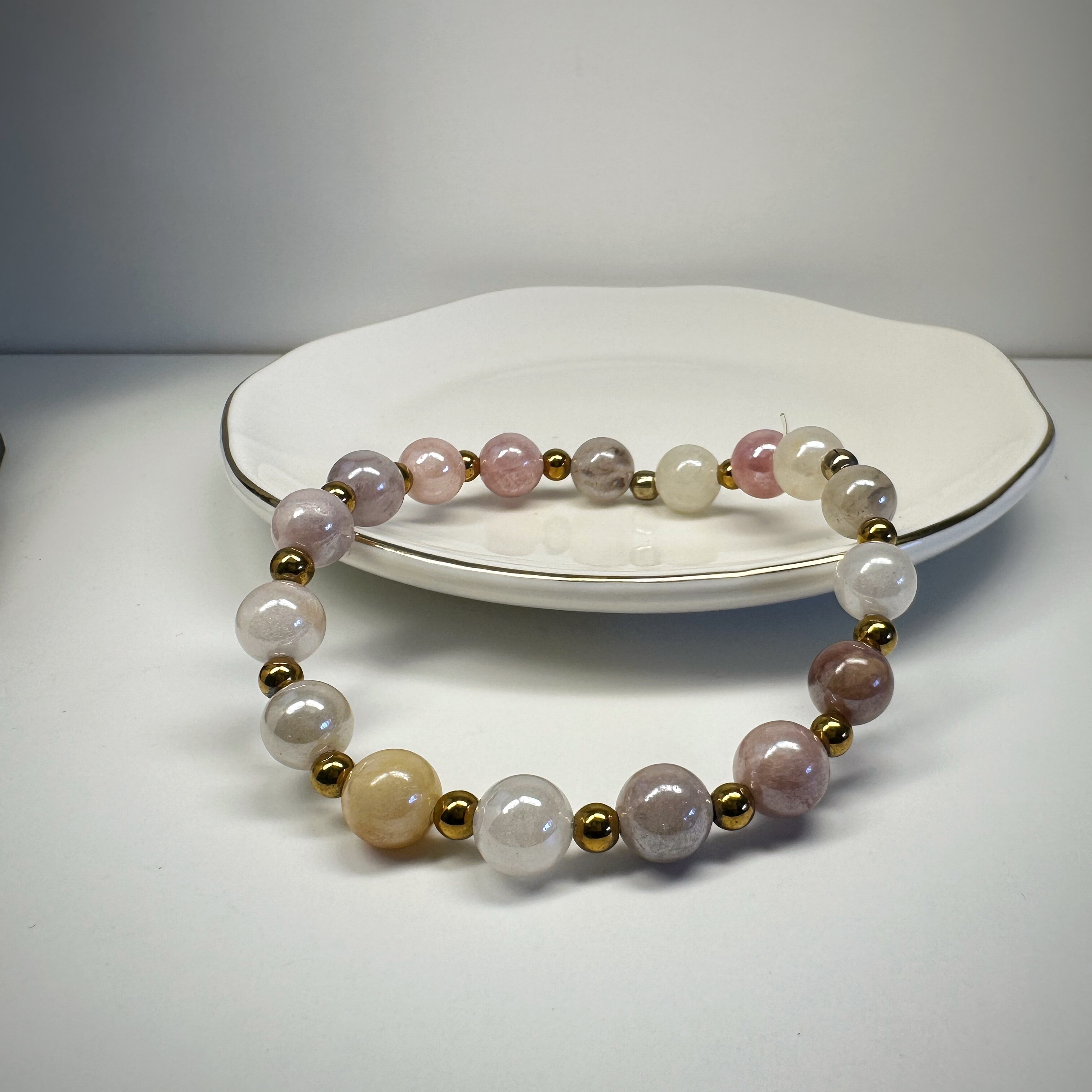 Porcelanka to miękkość zaklęta w kamieniu. Różowy jadeit, jasny kwarc mleczny i opalizujące elementy układają się w harmonijną, aksamitną całość. Kolorystycznie przywołuje porcelanową filiżankę w porannej poświacie.
