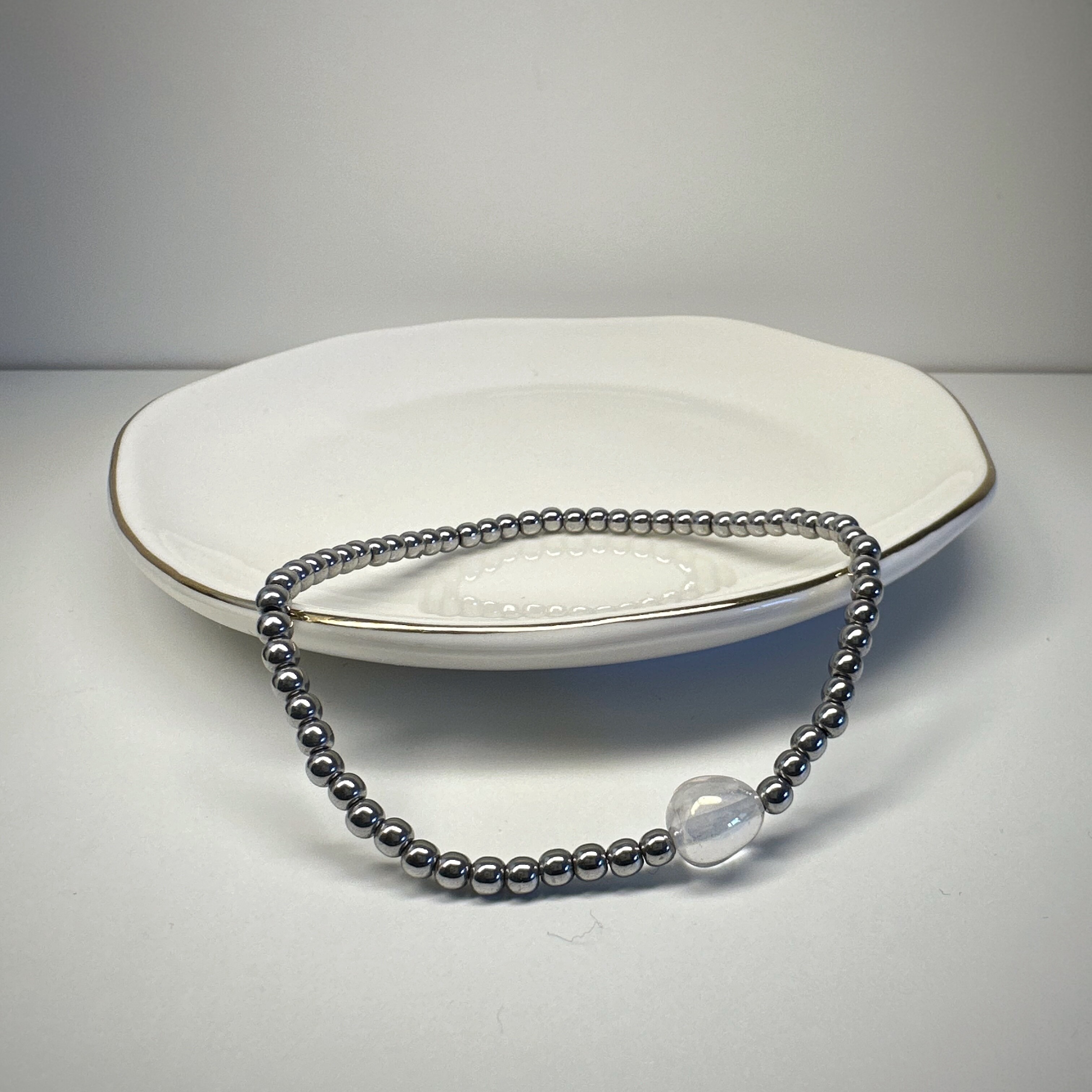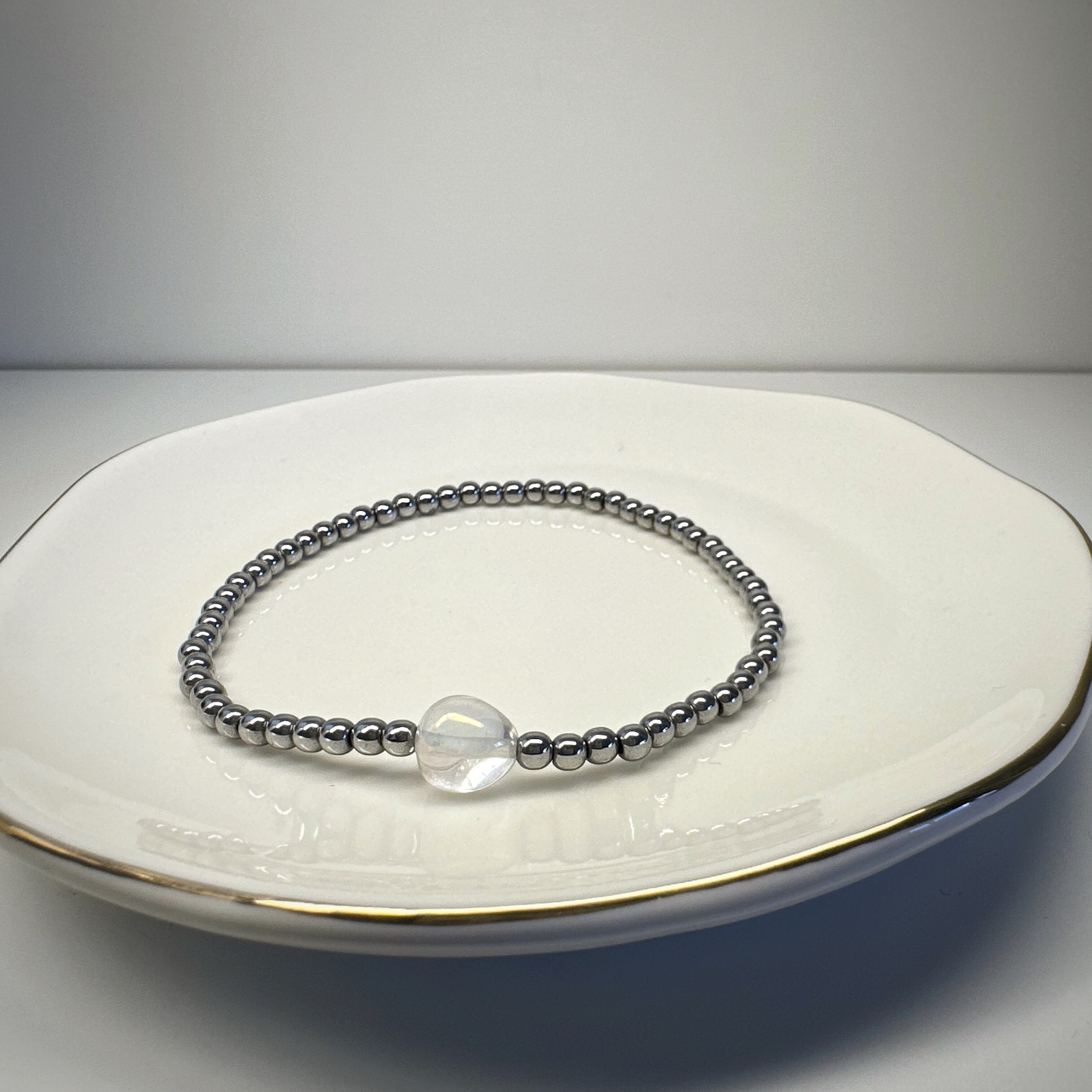Jak tafla lodu w porannym słońcu – „Przejrzystość Myśli” oczyszcza energetycznie i wspiera mentalną przejrzystość. Kryształ górski to kamień wzmacniający i harmonizujący, który odbija niechciane energie. Hematyt daje mu ramy, siłę i przyziemienie. Razem tworzą kompozycję dla osób, które chcą działać z jasnością, spokojem i skutecznością.