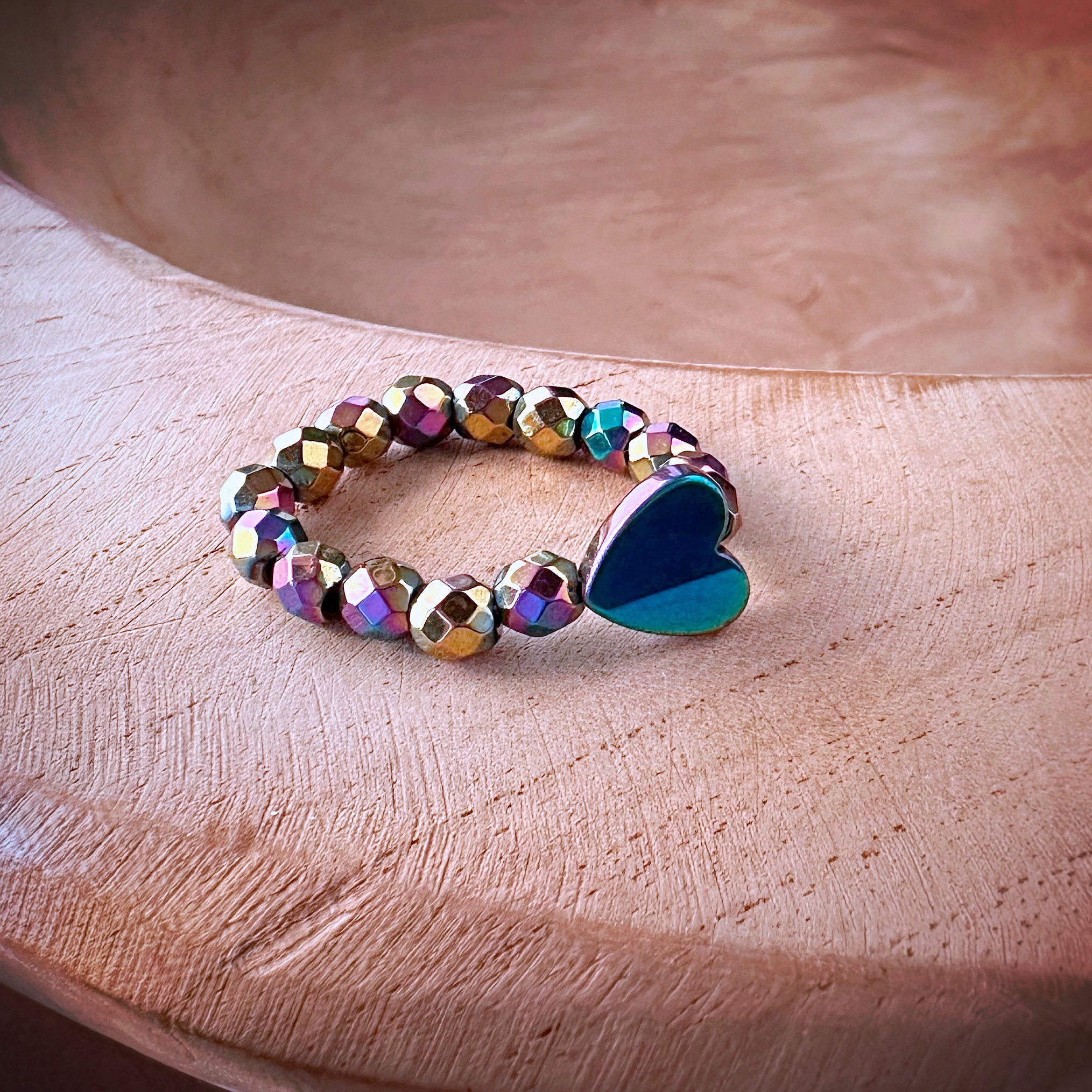 Ring of Aurora to pierścionek, któray wygląda jak uchwycone światło zorzy.Wykonany z fasetowanych bryłek hematytu o tęczowym, wielobarwnym połysku, układa się wokół palca niczym delikatna smuga światła. W centrum - serce w tym samym odcieniu, które zmienia barwy w zależności od kąta padania światła.