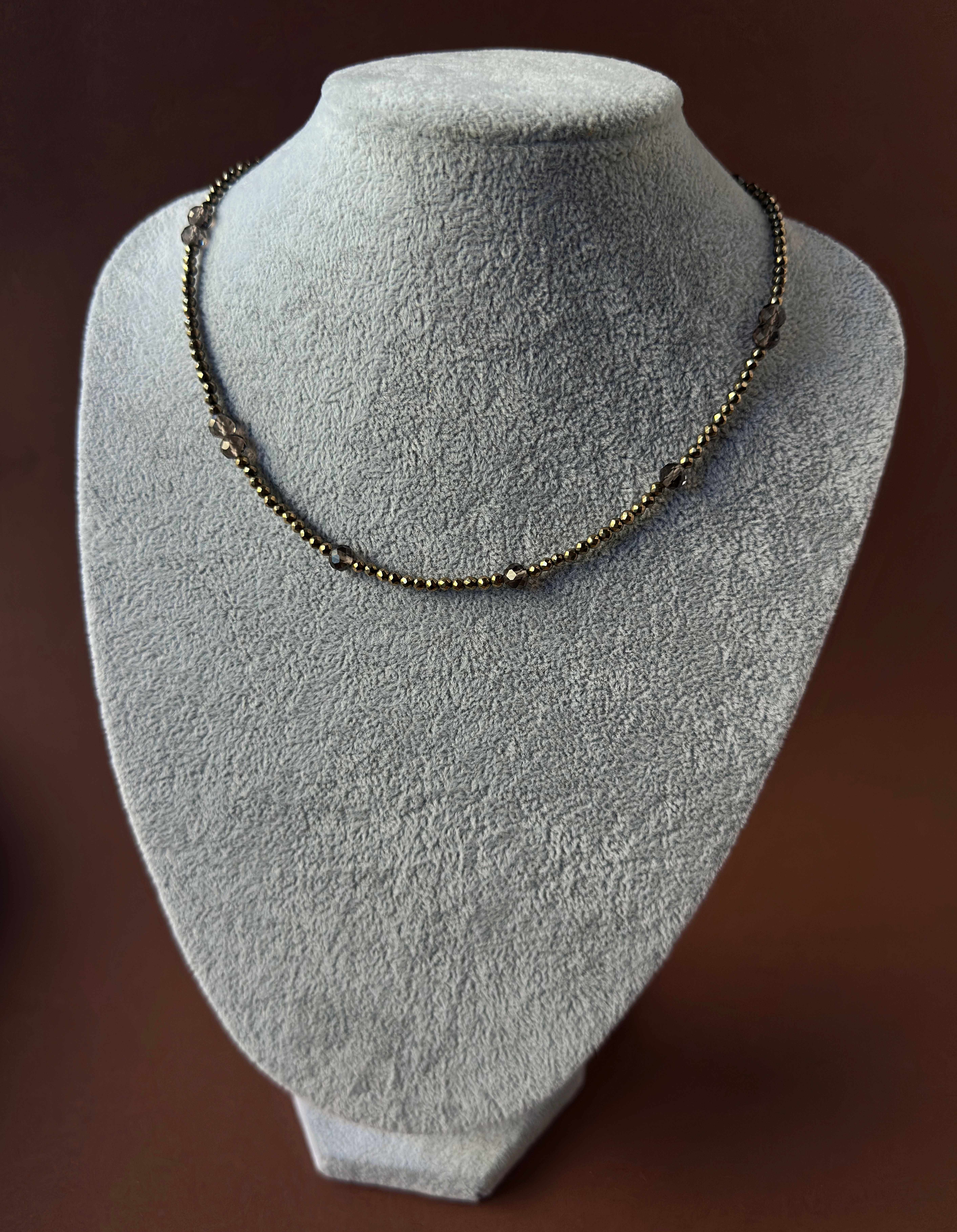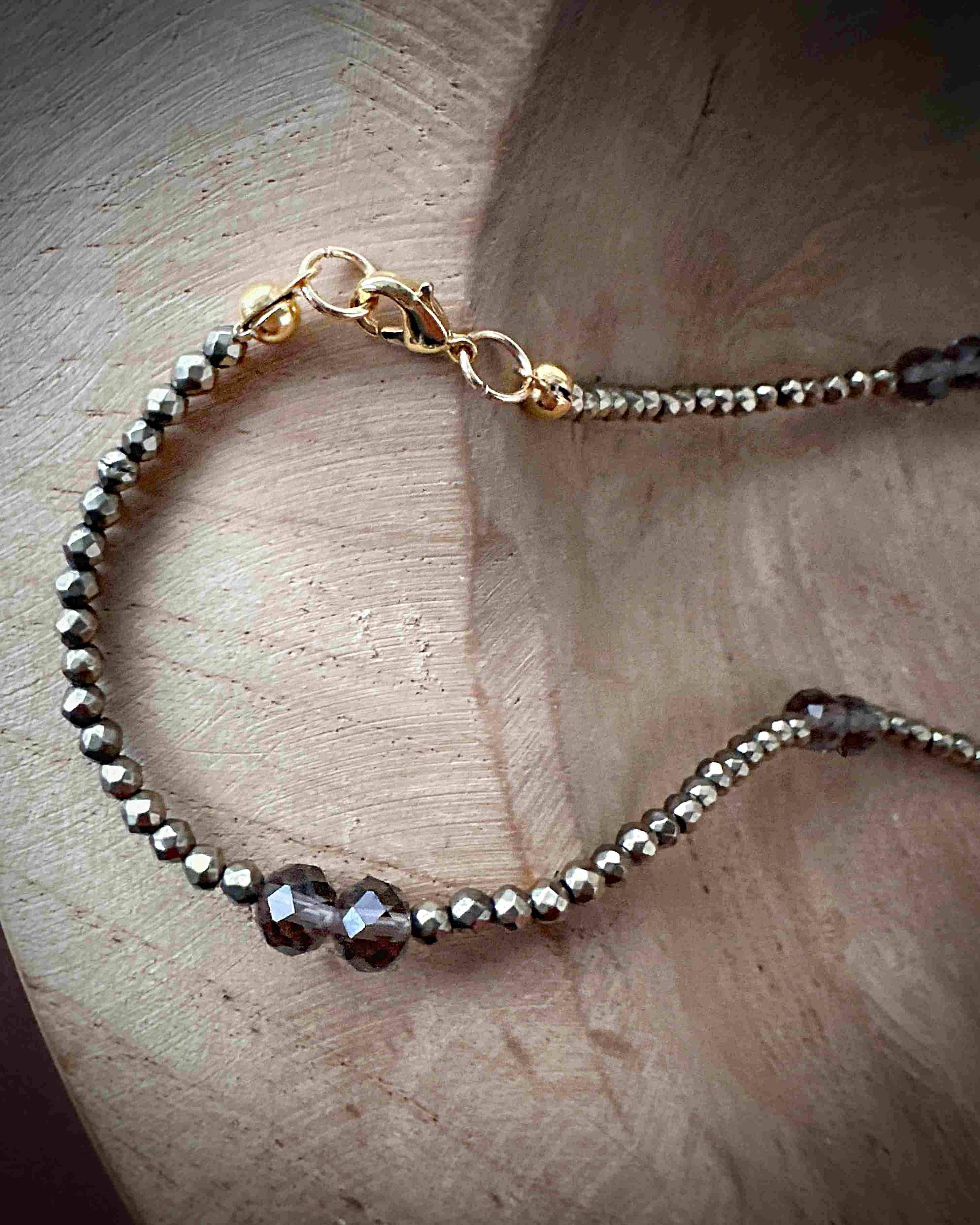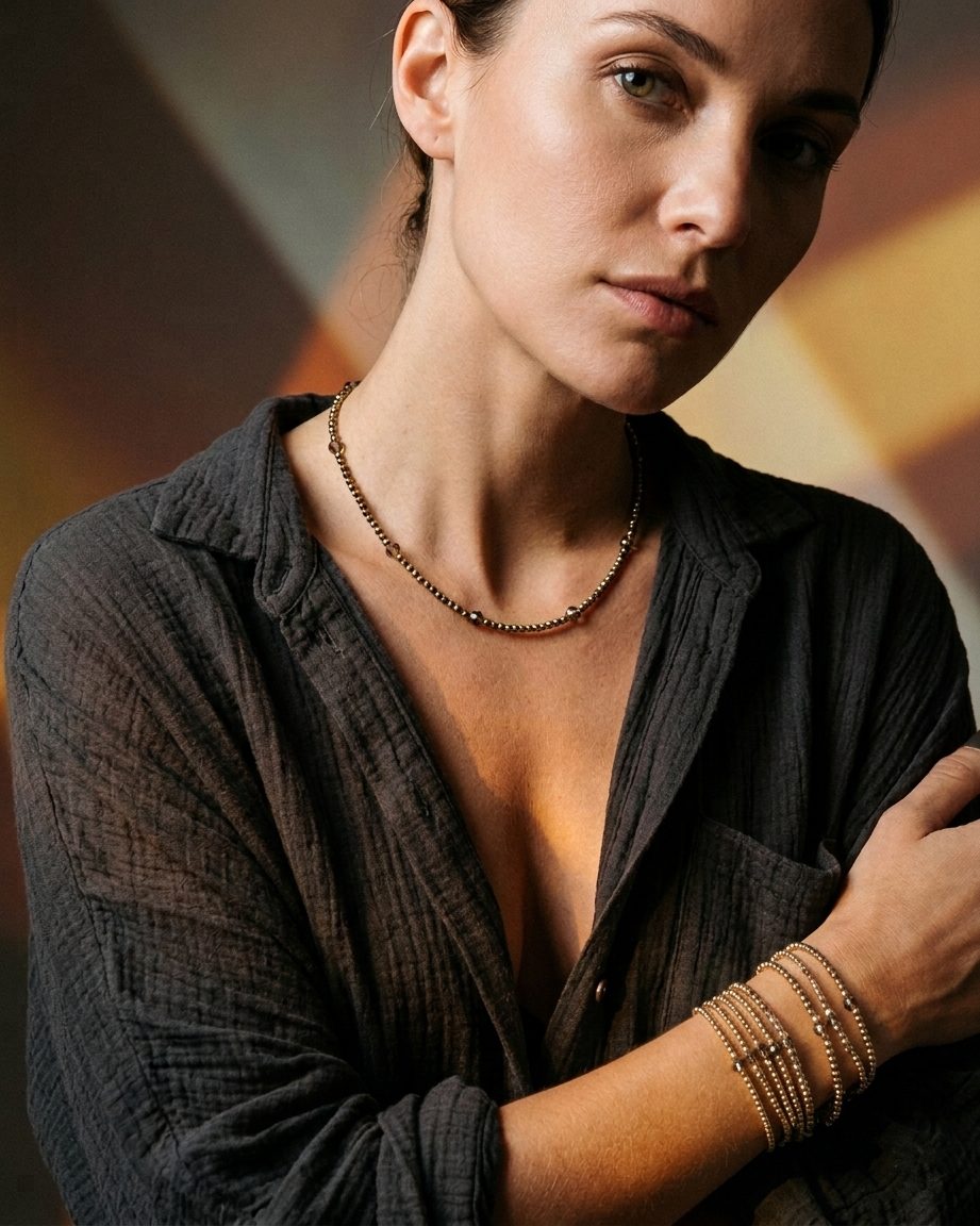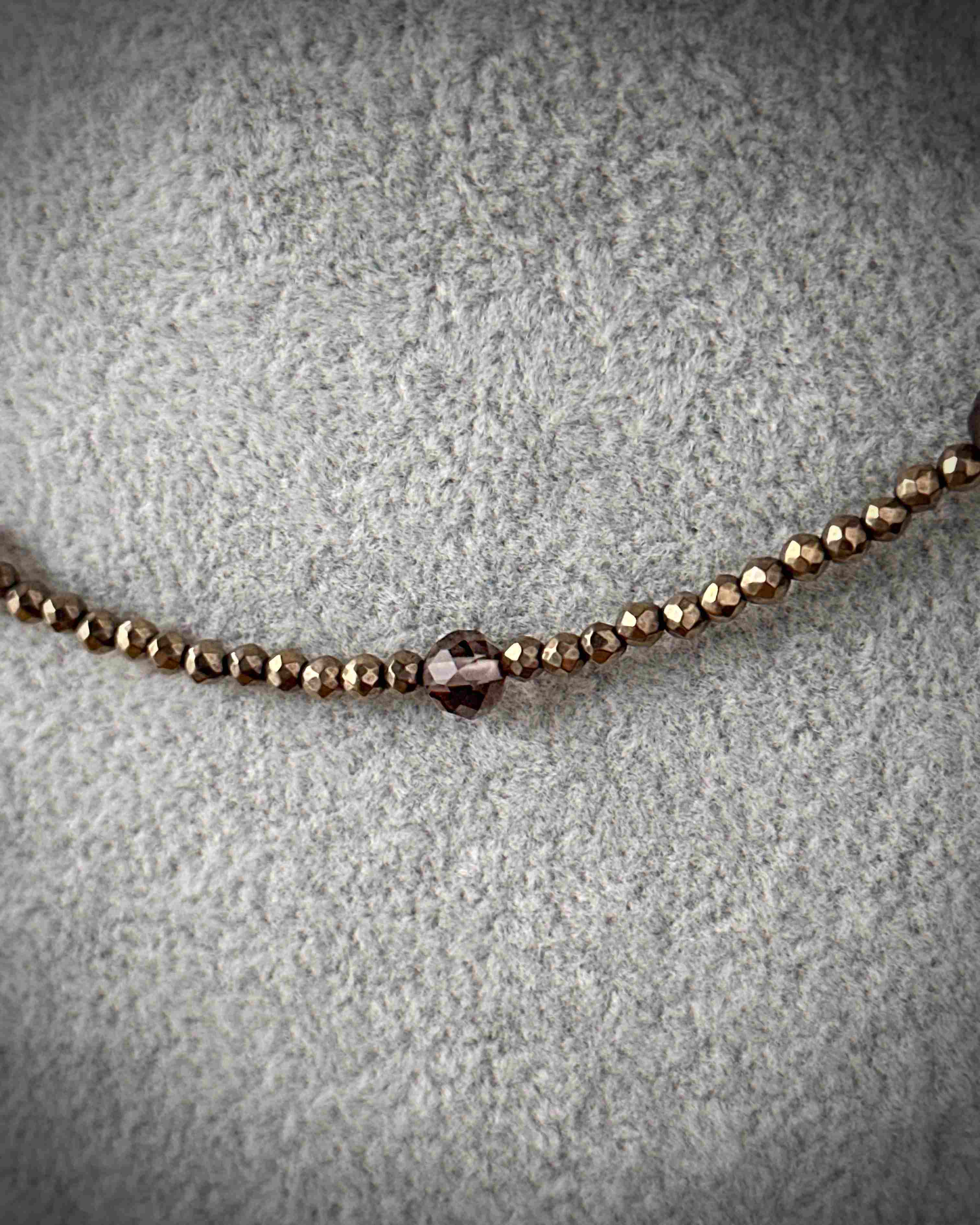 Zainspirowany mgłą o poranku i zapachem chłodnego powietrza po deszczu - Smoky Harmony, to naszyjnik, który łączy w sobie elegancję i lekkość. Fasetowane bryłki hematytu w złotym odcieniu przeplatają się z półprzezroczystym kwarcem dymnym, tworząc efekt głębi i spokoju.Każdy element mieni się inaczej, gdy pada na niego światło, jakby nosił w sobie fragment ciszy. To biżuteria, która nie wymaga okazji – pasuje do codziennych rytuałów i wieczornej uważności.Nosząc go, poczujesz, że spokój nie musi być odległy. Jest blisko – w dotyku, w geście, w każdej chwili, którą wybierasz świadomie. .Smoky Harmony, to Twój oddech między dniem a nocą - dyskretny znak, że wszystko, czego potrzebujesz, już masz w sobie.