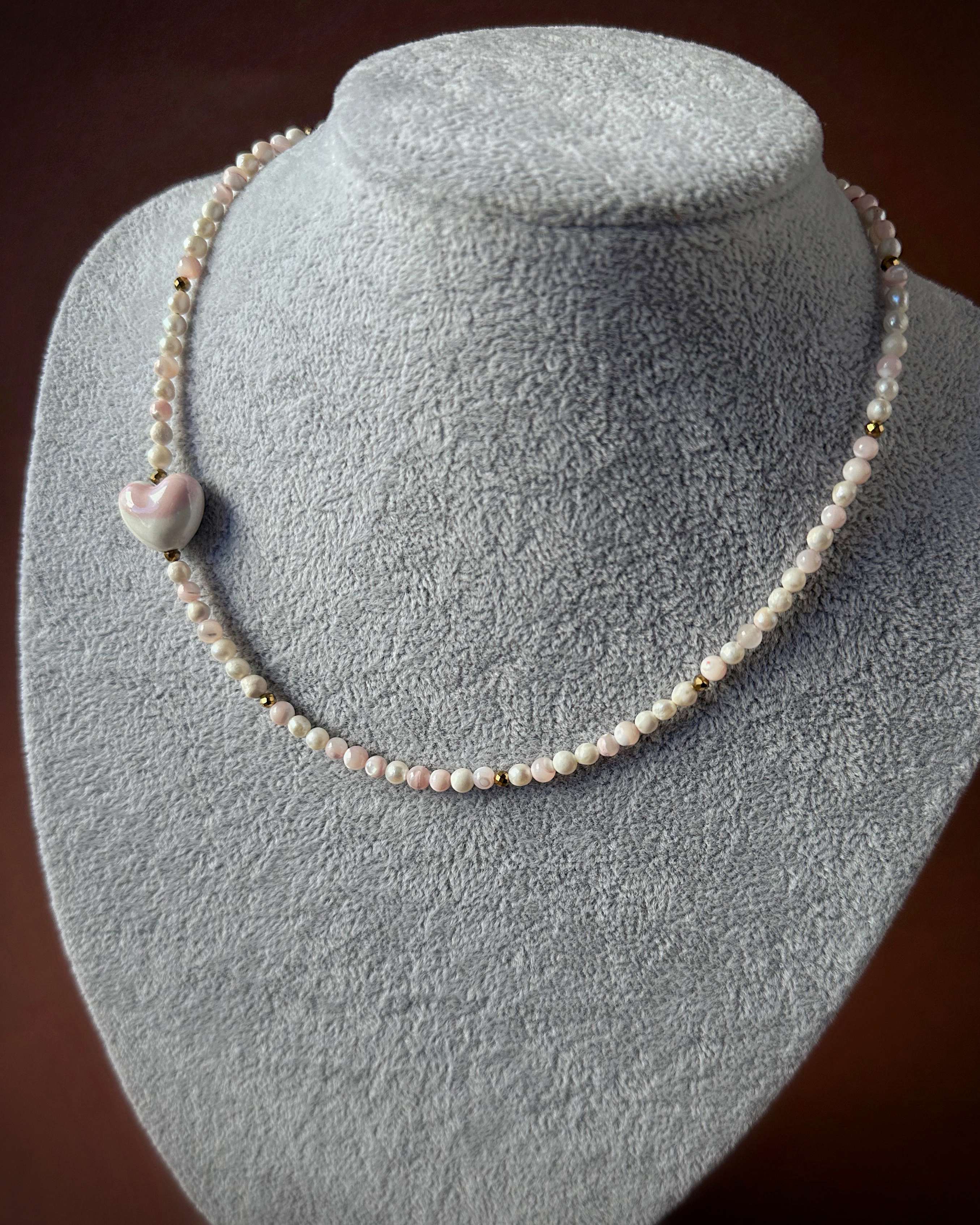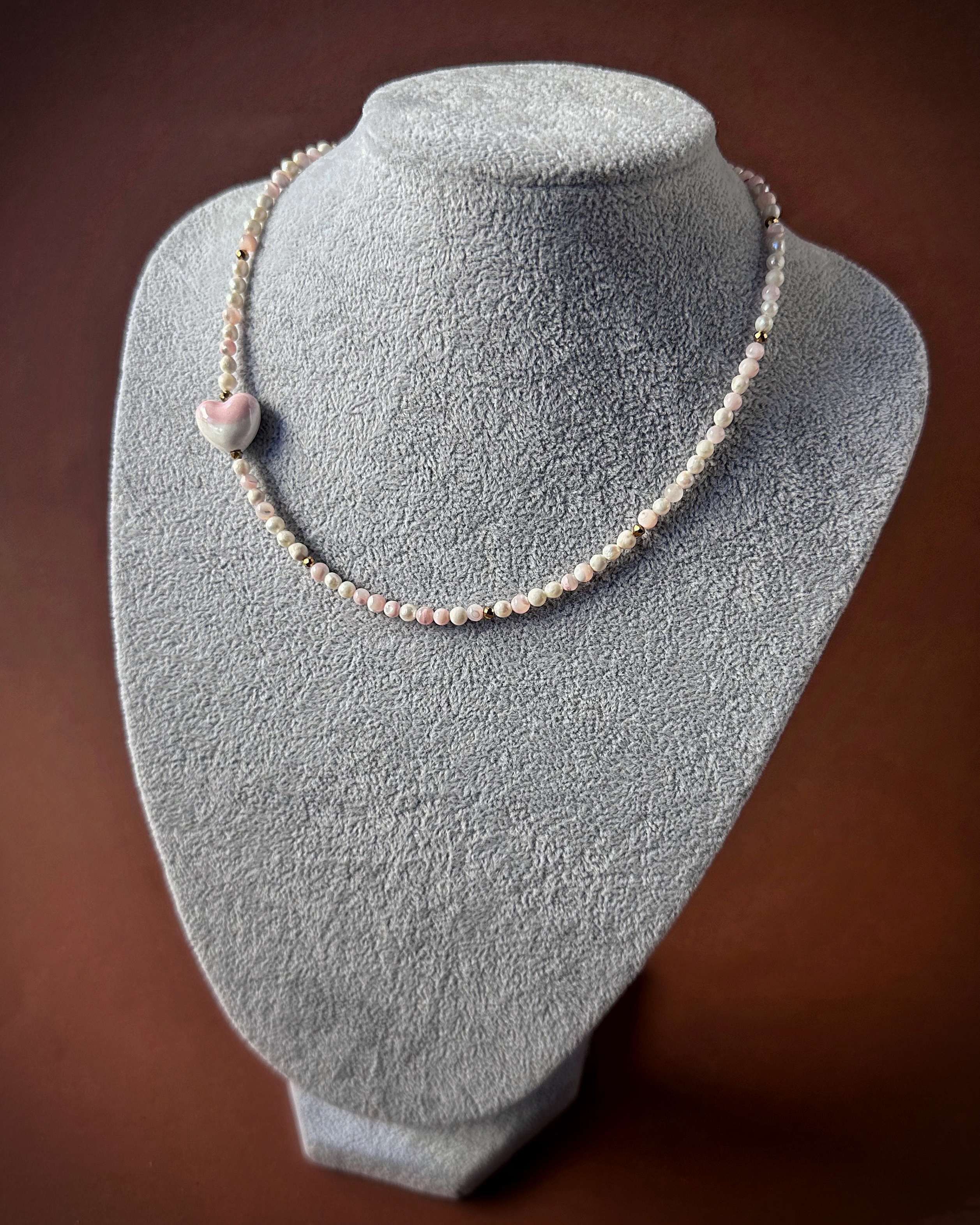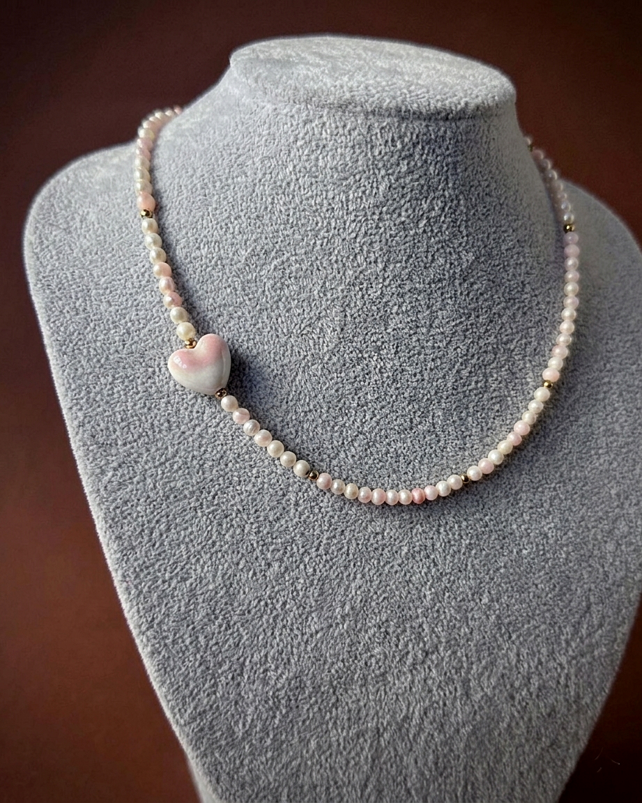Naszyjnik z lekkich, naturalnych pereł hodowlanych o średnicy 4 mm, które tworzą jasną, świetlistą linię. Ich powierzchnia delikatnie odbija światło, odsłaniając subtelne różowe tony. Pomiędzy nimi pojawiają się nieregularne bryłki złotego hematytu, które dodają całości eleganckiego kontrastu. Asymetrycznie położone ceramiczne serce w odcieniu pereł, białe z miękkimi, różowymi refleksami, jest spójne, harmonijne i bardzo kobiece.