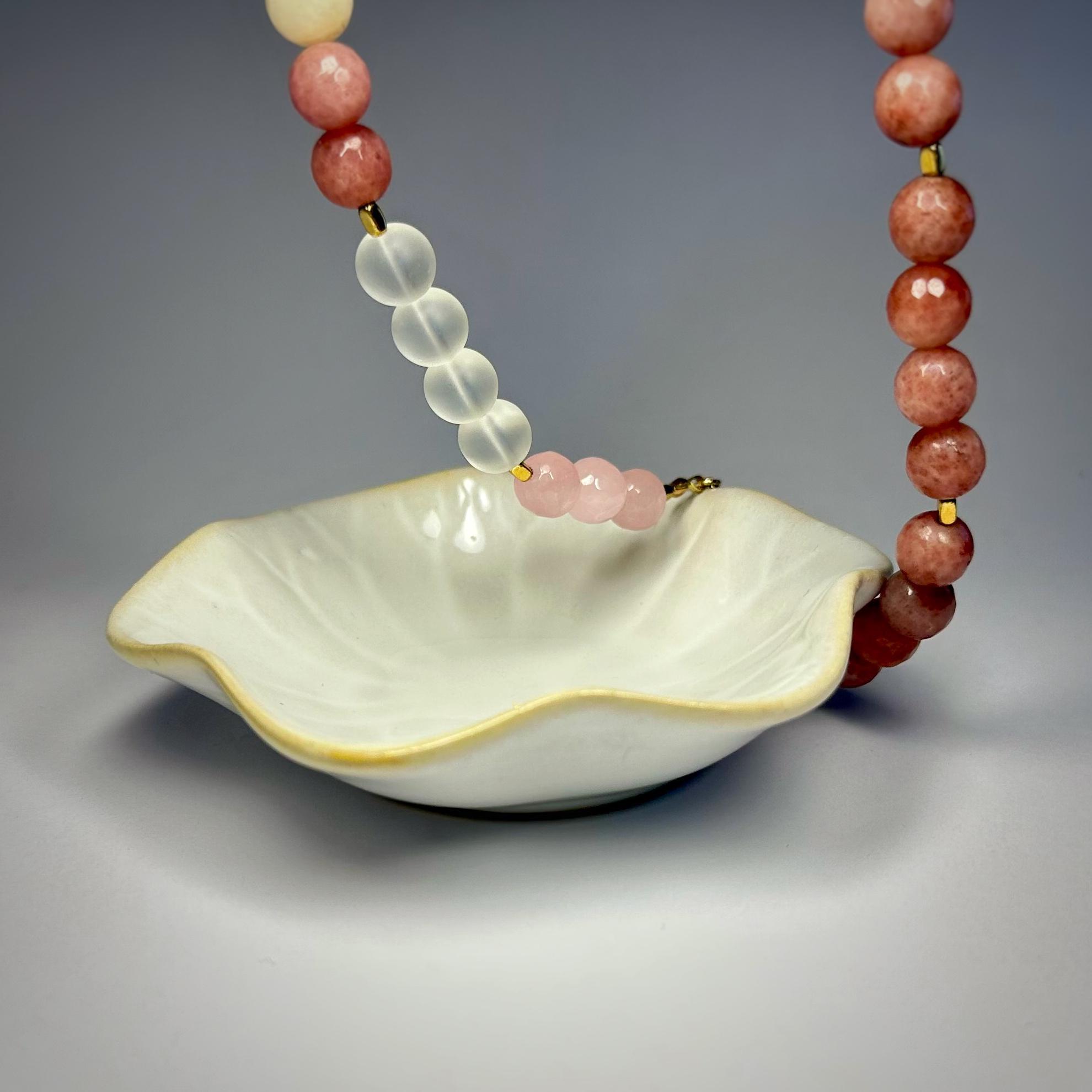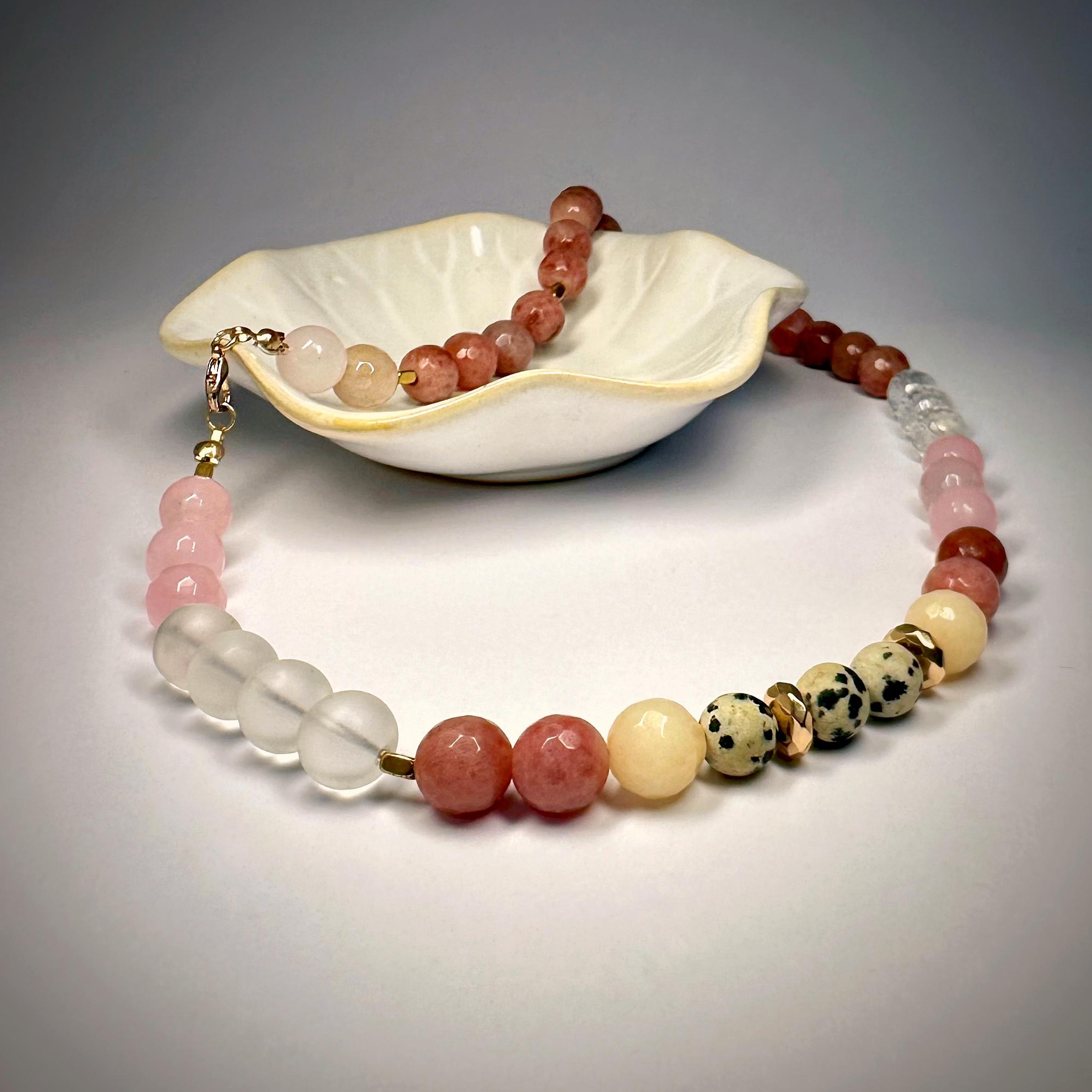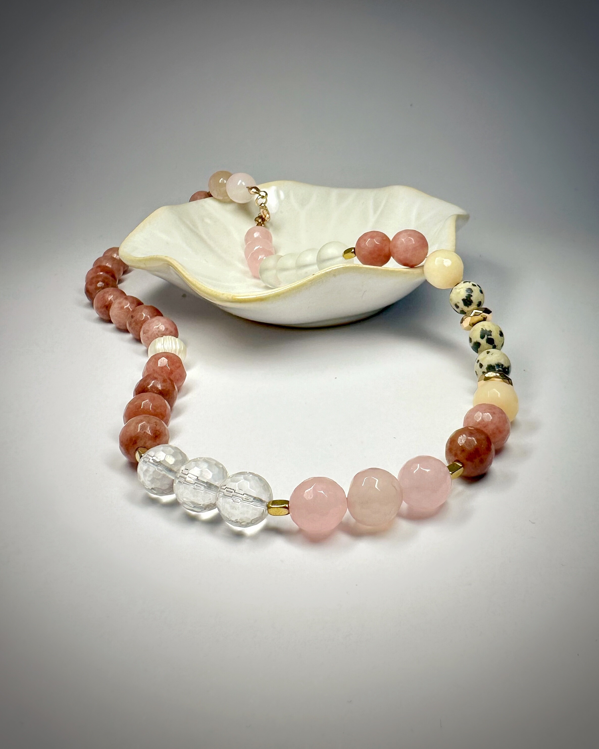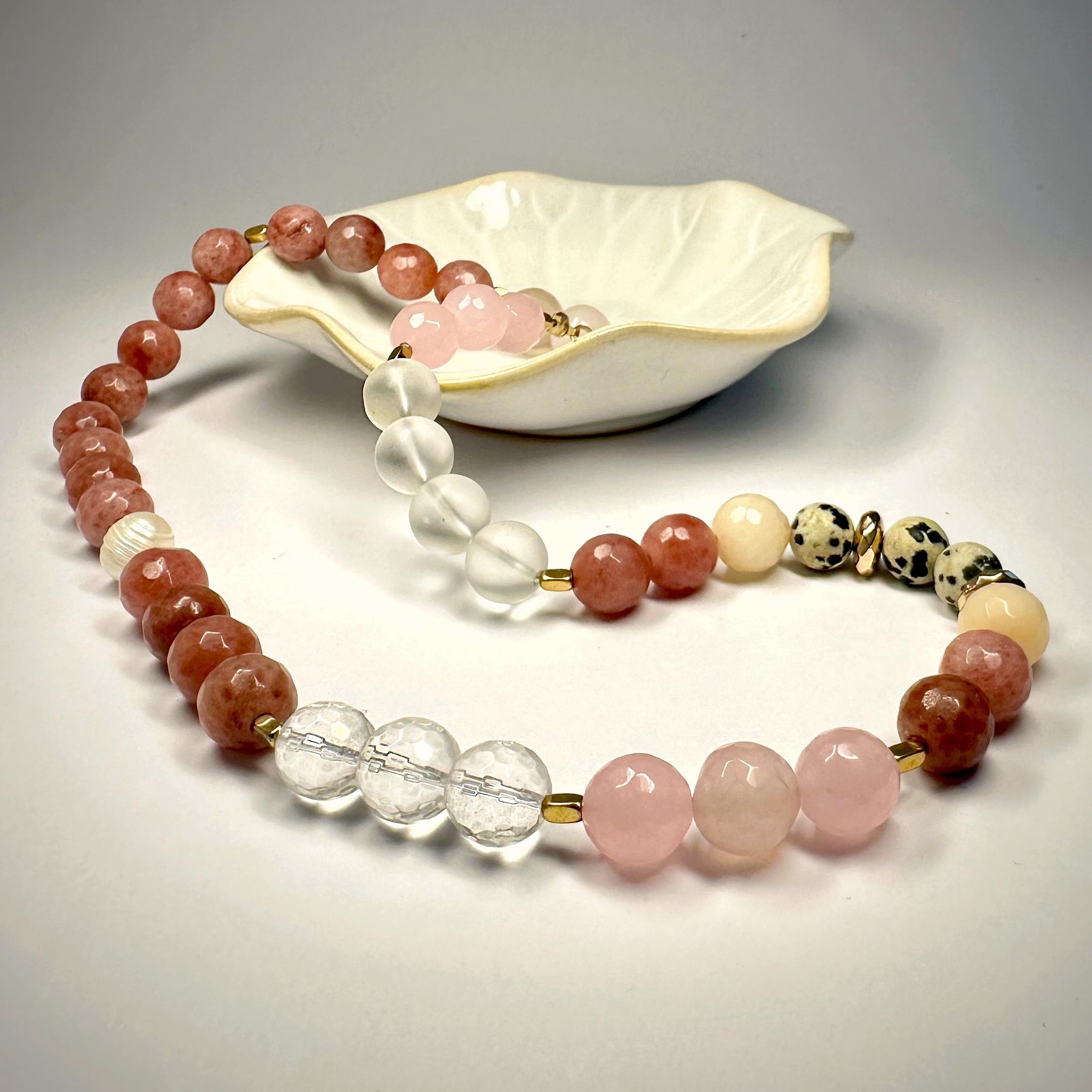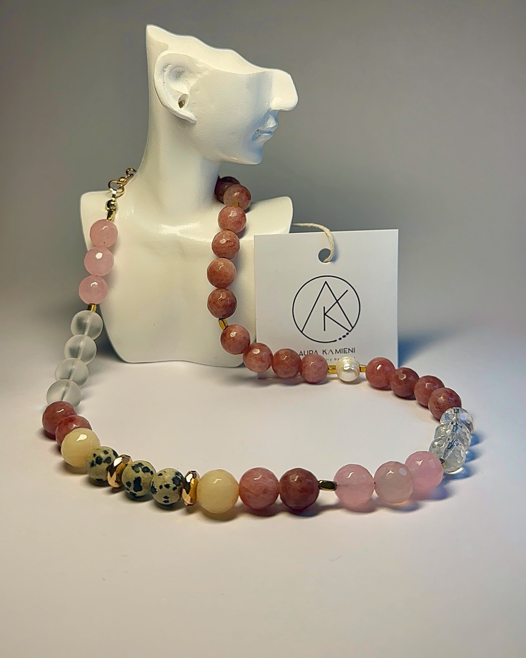 Ten naszyjnik to ukłon w stronę wszystkiego, co naturalne, spokojne i autentyczne. Ziemiste odcienie jadeitu, od beżu, przez oliwkową zieleń, aż po delikatny róż – tworzą harmonijną całość. Kryształ górski wprowadza czystość i klarowność, a słodkowodna perła dodaje lekkości i kobiecości. Zaskakujący akcent, kulistego jaspisu dalmatyńskiego o łaciatym wzorze, nadaje kompozycji wyjątkowego charakteru, niczym wyjątkowy element krajobrazu, który zapada w pamięć.