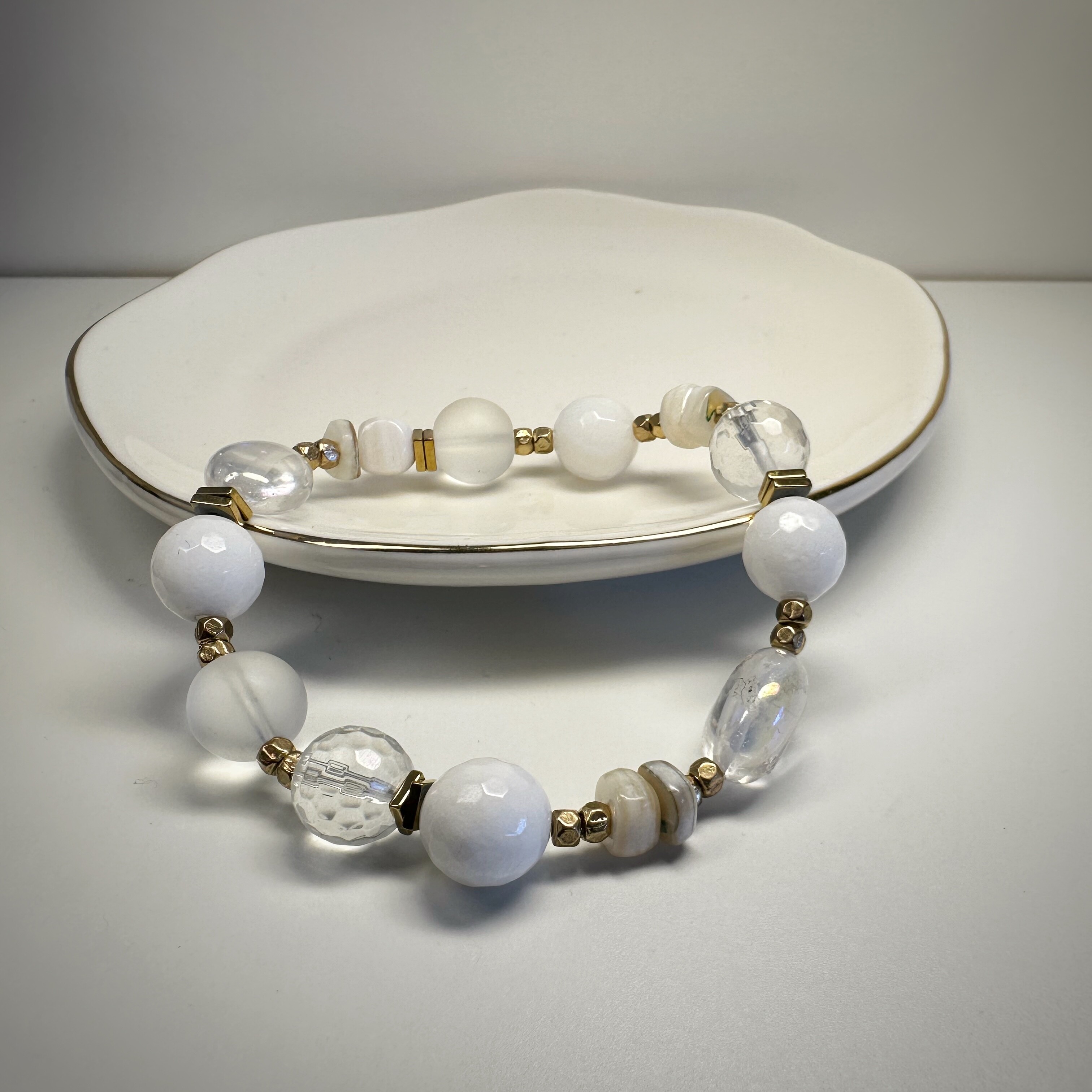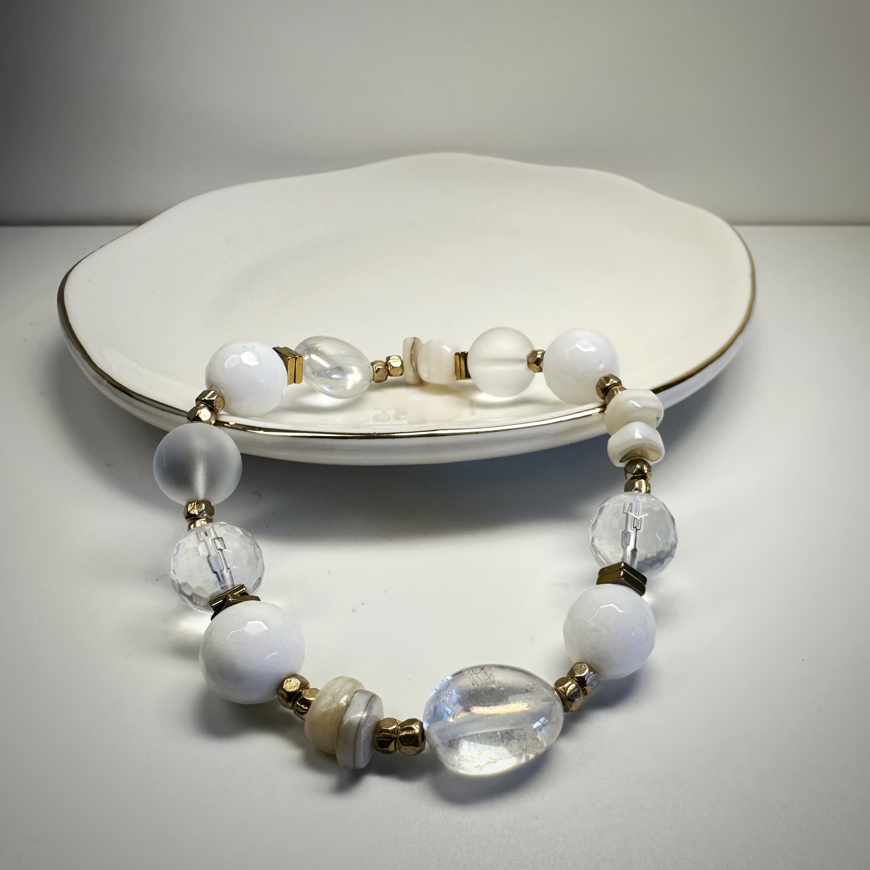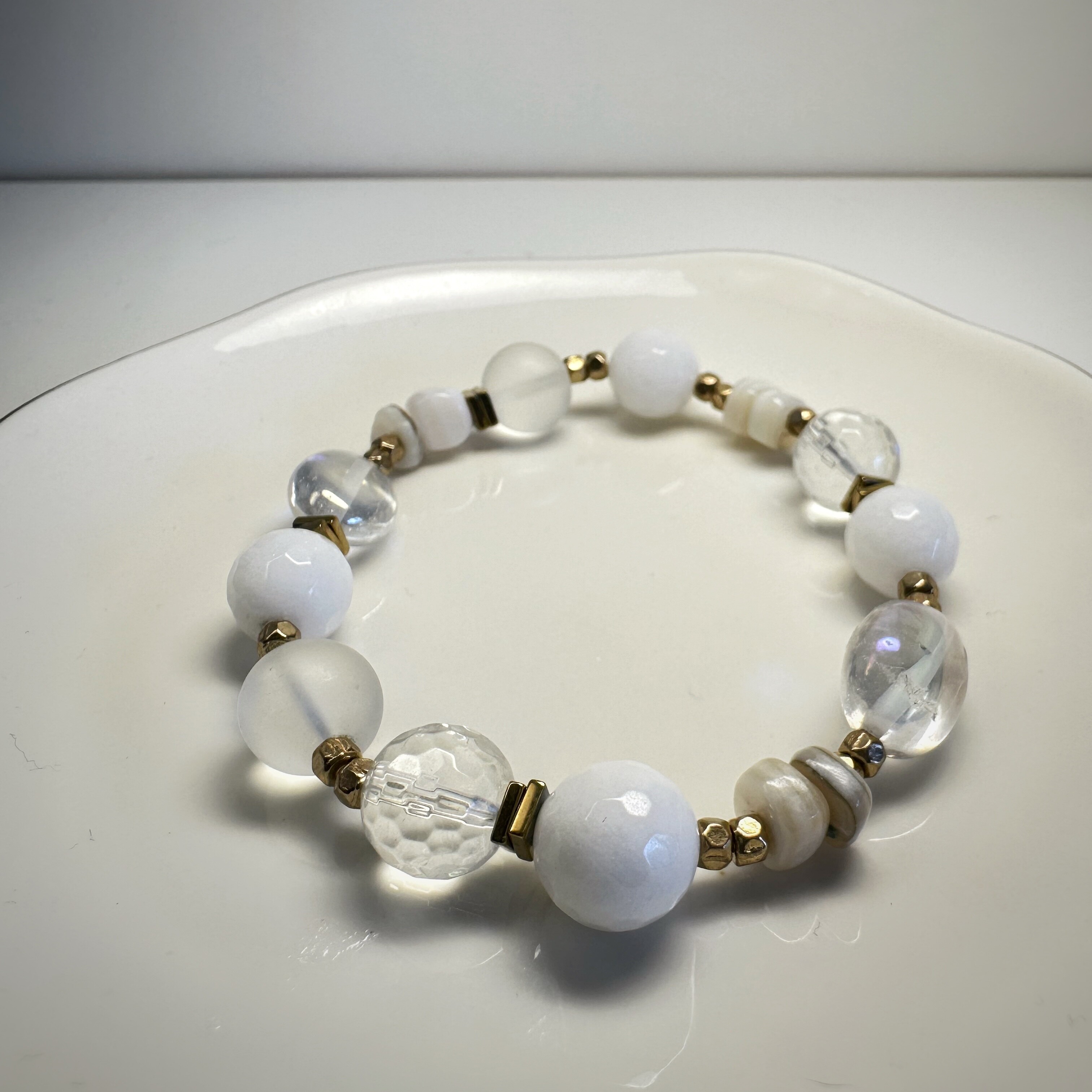 Zamknij oczy i wyobraź sobie świt – ten najczystszy, lekko zamglony, gdy świat budzi się bez hałasu. Właśnie taką aurę tworzy Spokojna Aura. Biały agat koi myśli, matowy mleczny kwarc oczyszcza przestrzeń serca, a złoty hematytsubtelnie uziemia, nie odbierając lekkości. Perłowy akcent – niczym dotyk intuicji – dodaje całości wyjątkowej delikatności.